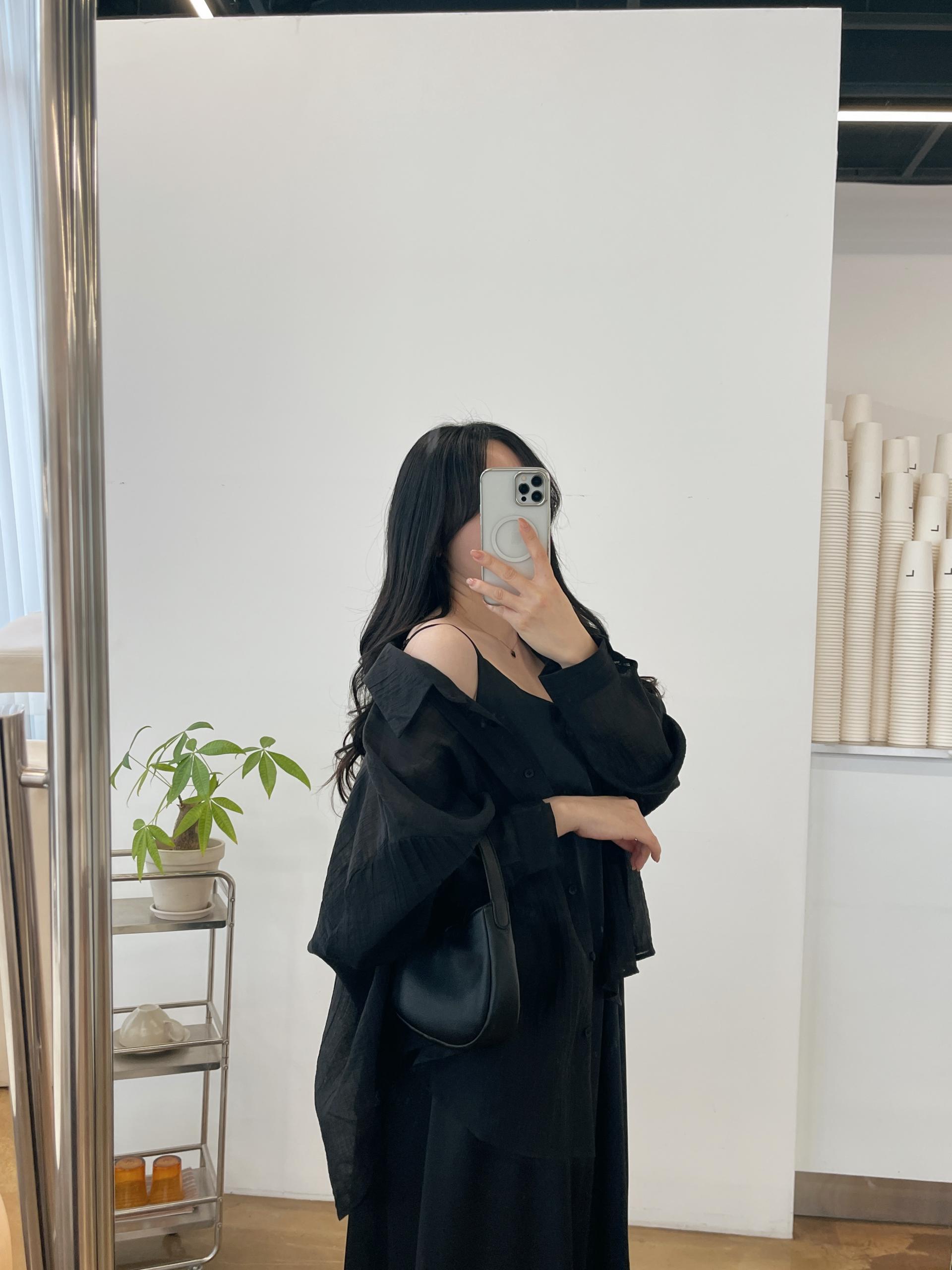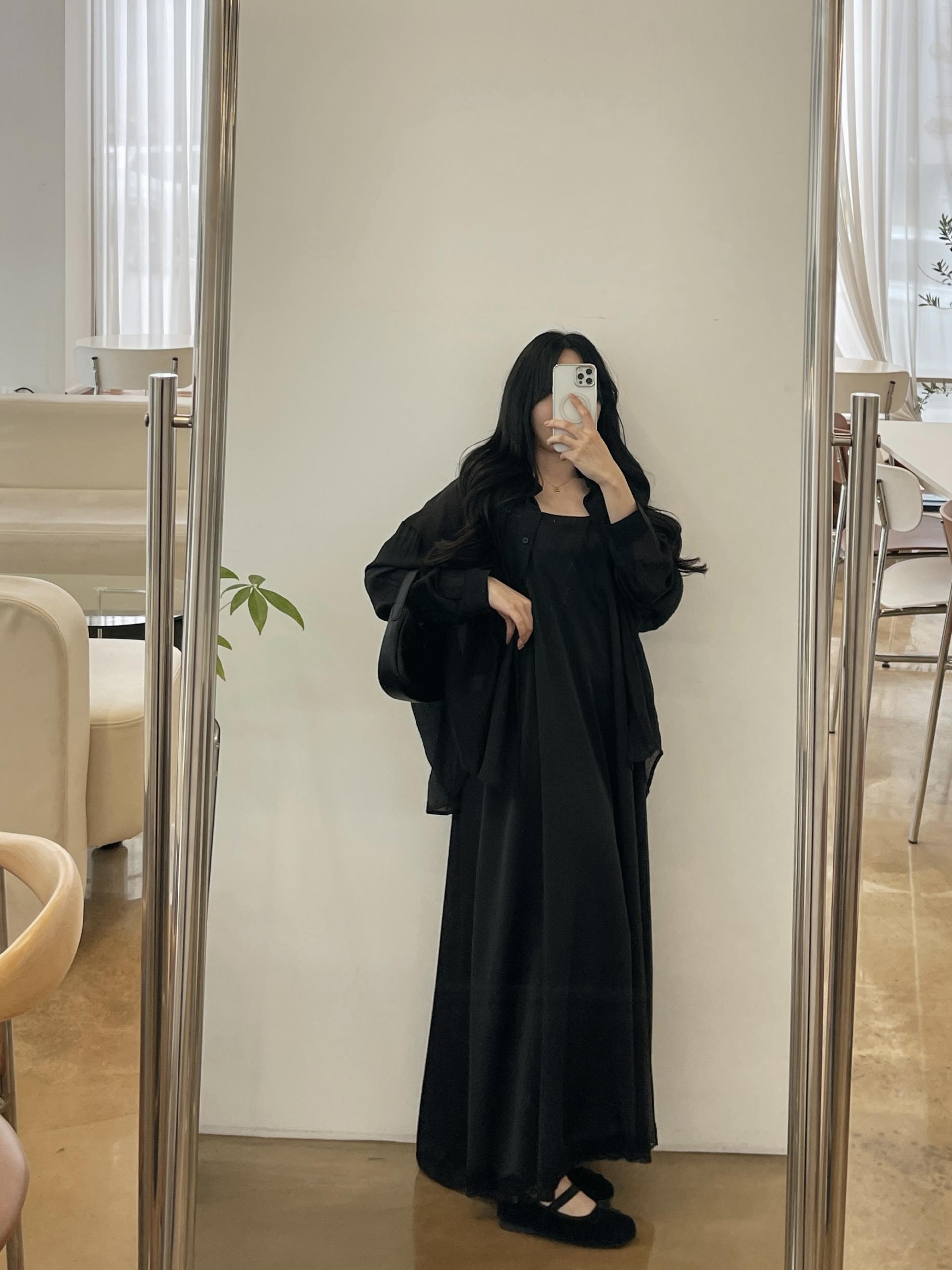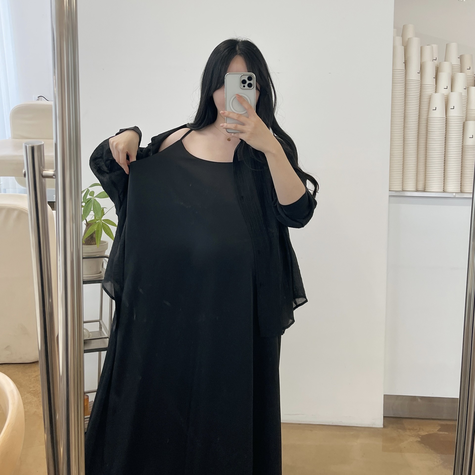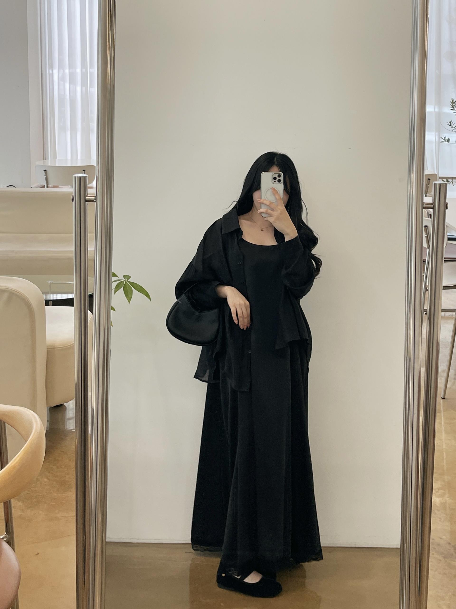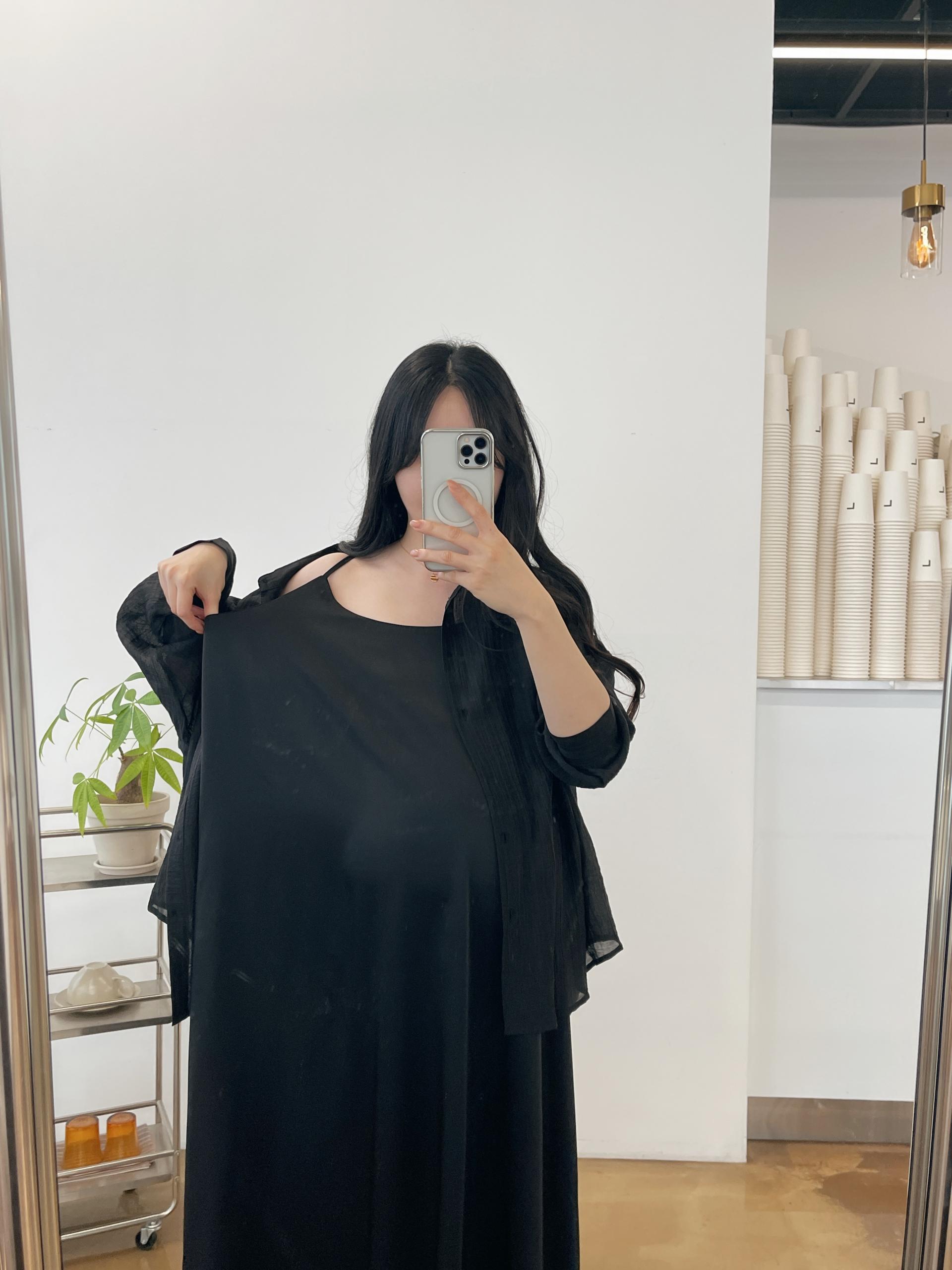 실키 끈 원피스(기장조절가능) + 뒷트임 거즈셔츠