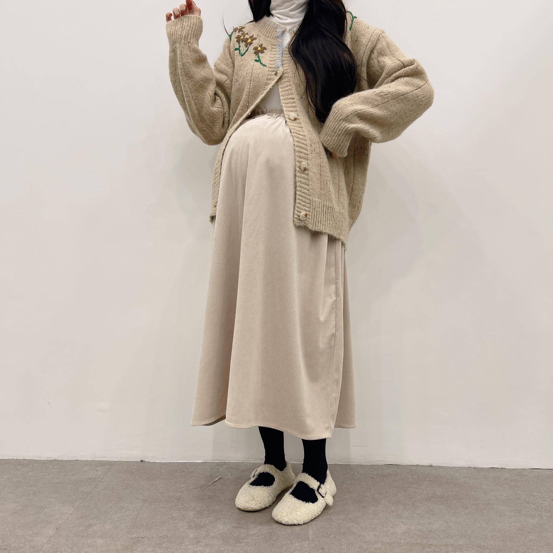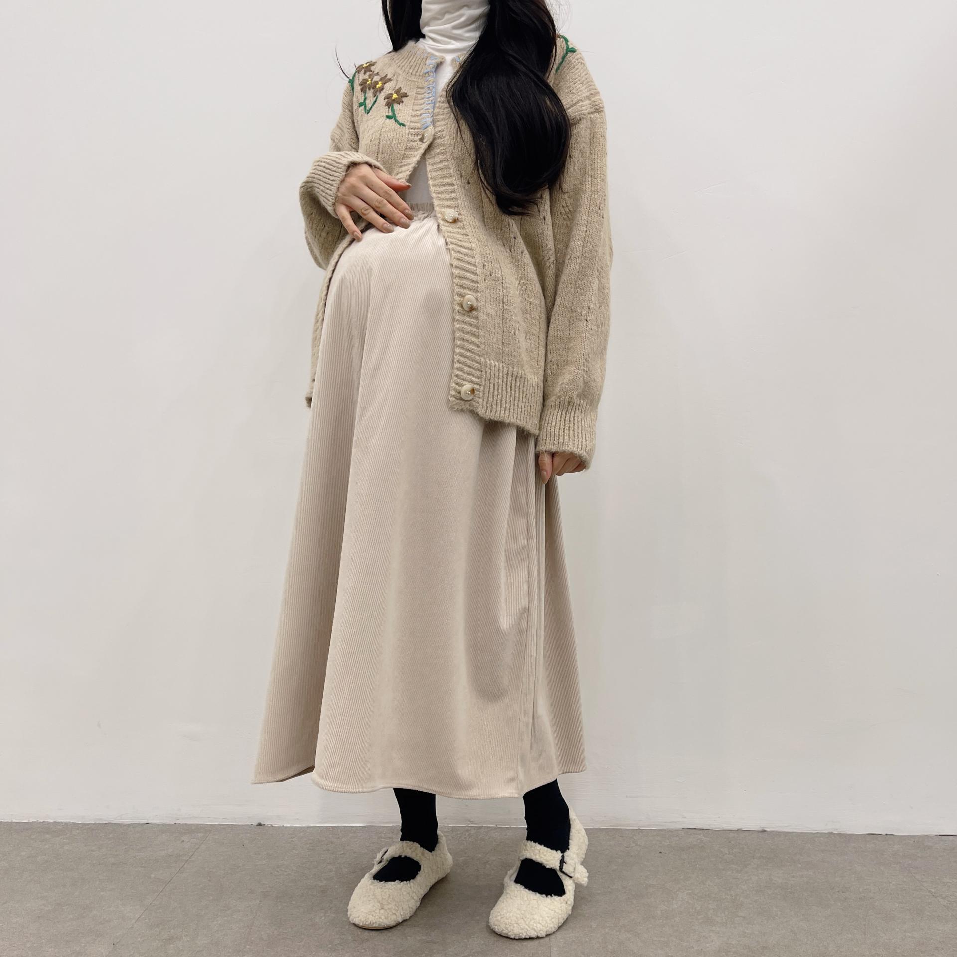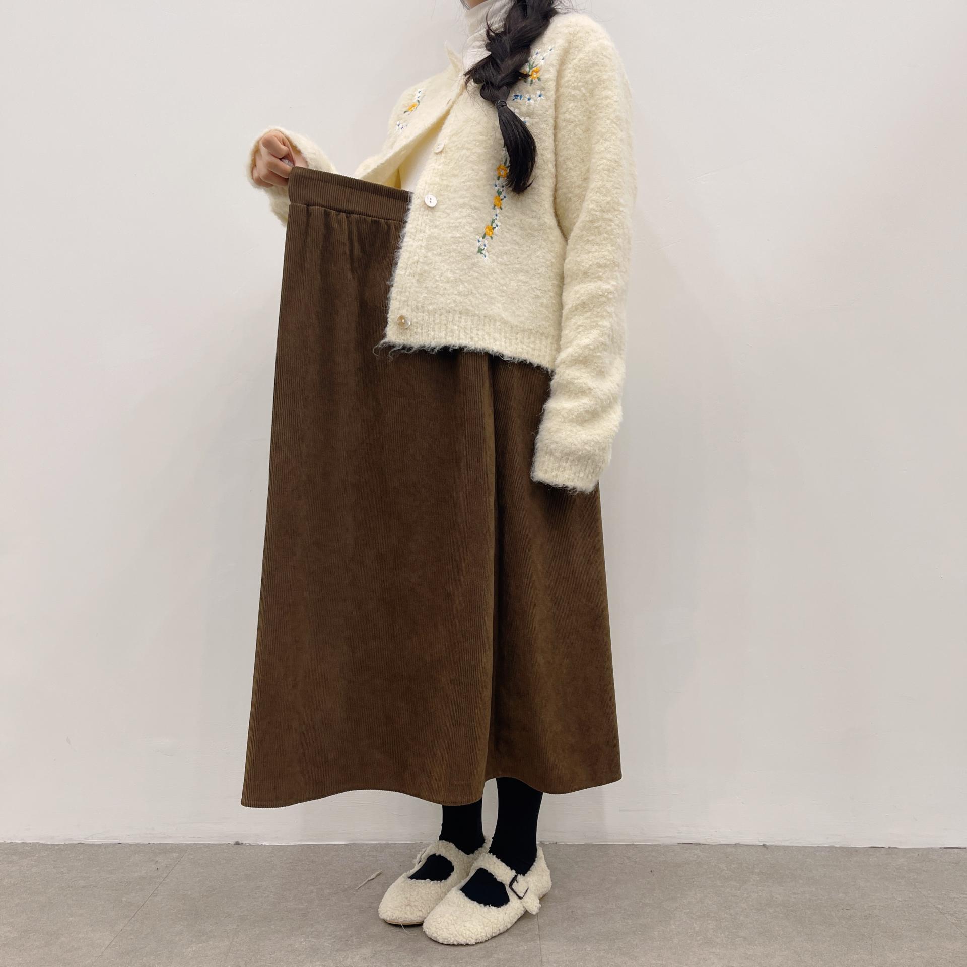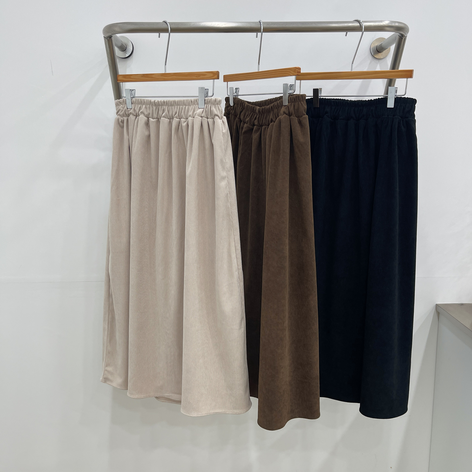 소프트한 골덴소재의 밴딩스커트! 밴딩편안함은 물론, 플레어핏으로 편하고 귀엽게 착용하기 좋고 롱~기장은 아니라 키작녀언니들에게도 안성맞춤!