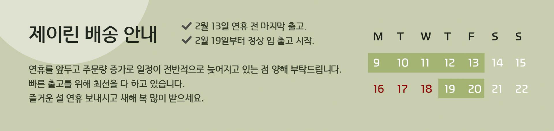 - 품절의 경우 따로 연락을 드리며, 간혹 7영업일(주말, 공휴일 제외) 이상 배송이 지연되는 경우 먼저 받아보실 수 있도록 부분배송 해드리고 있습니다.