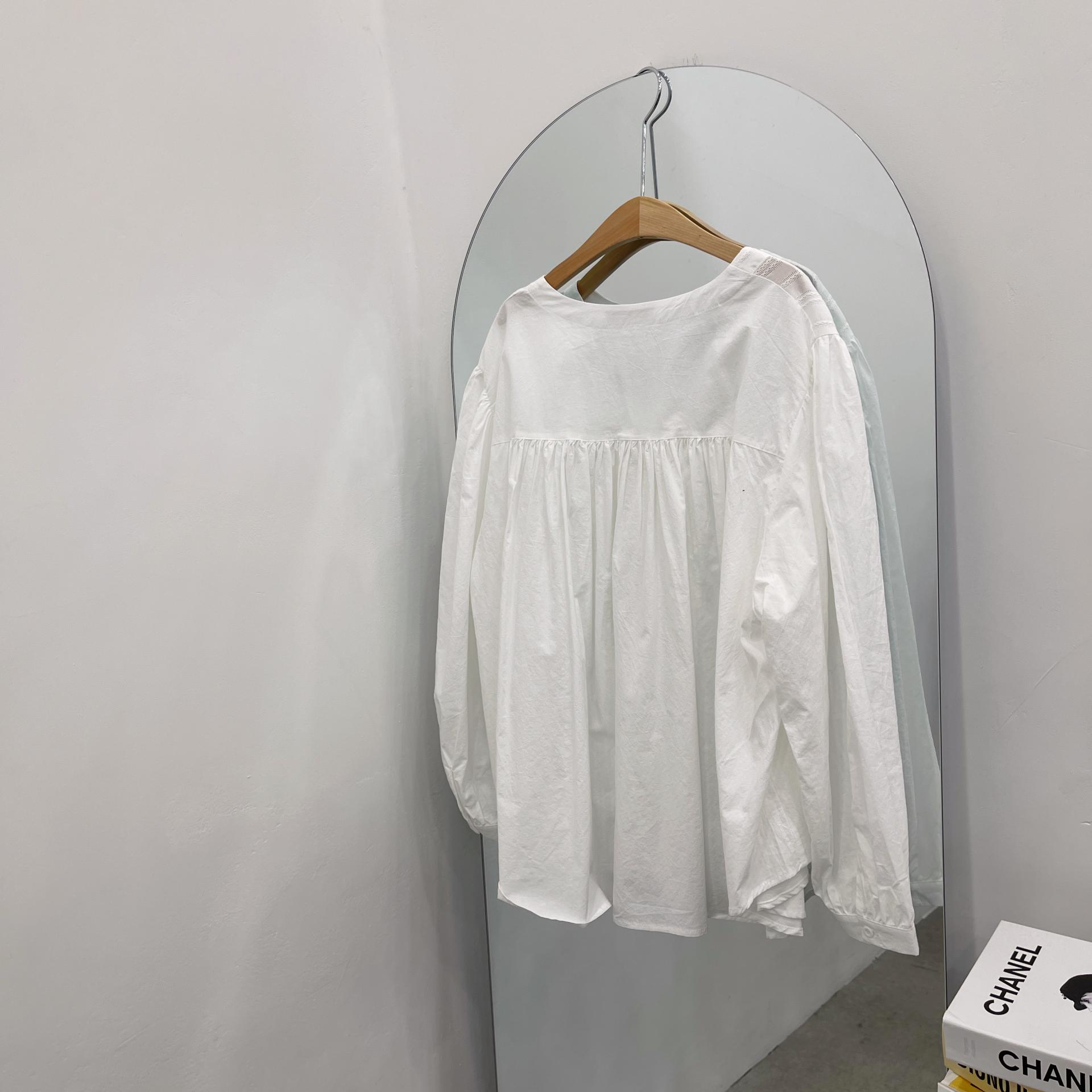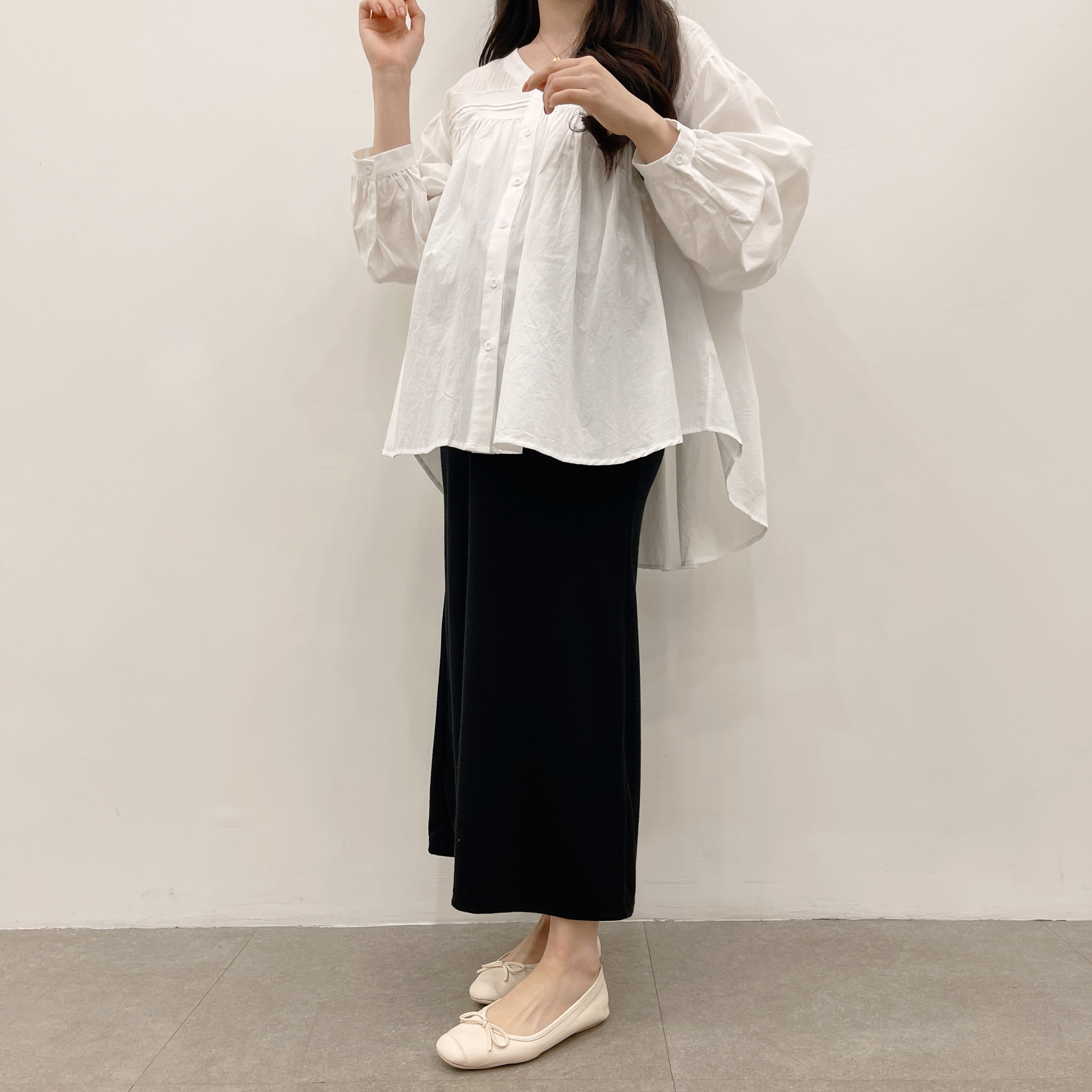 오버핏사이즈에 V넥블라우스, V넥으로는 쉽게 만날 수 없는 정말 예쁜핏입니다! 앞섶핀턱라인으로 밋밋함을 없애고 배/힙덮기장으로 다양하게 코디하기 좋은 블라우스에요