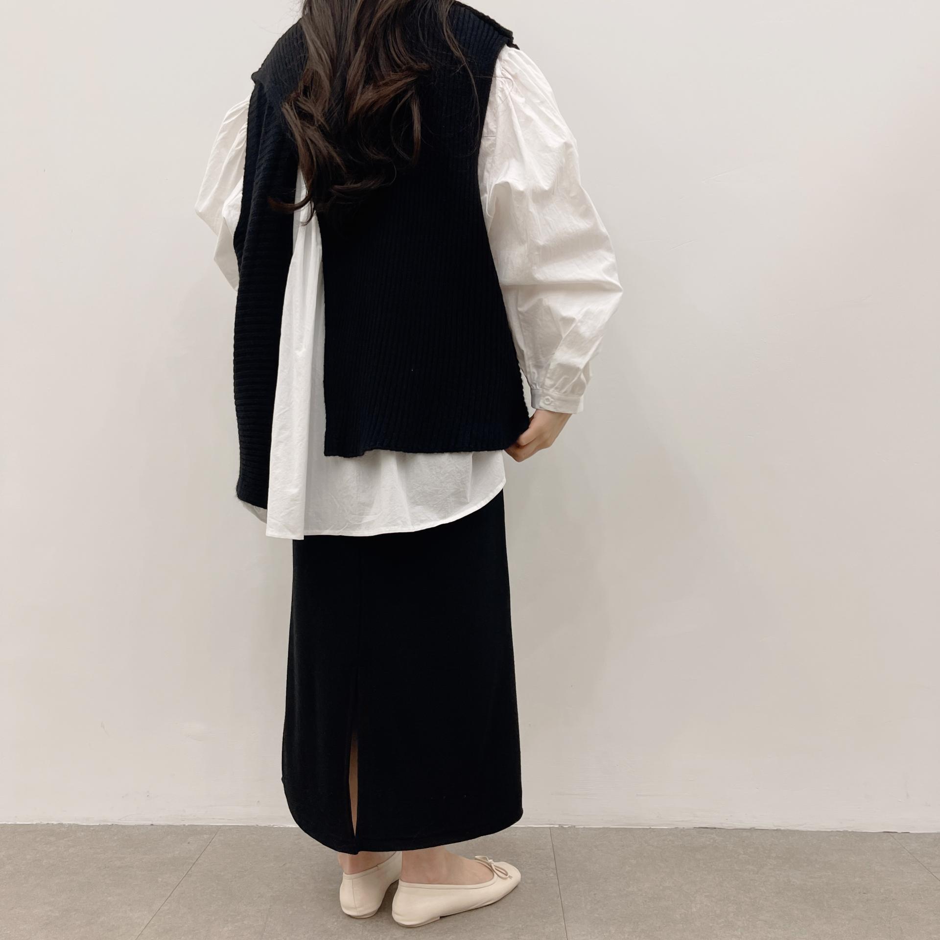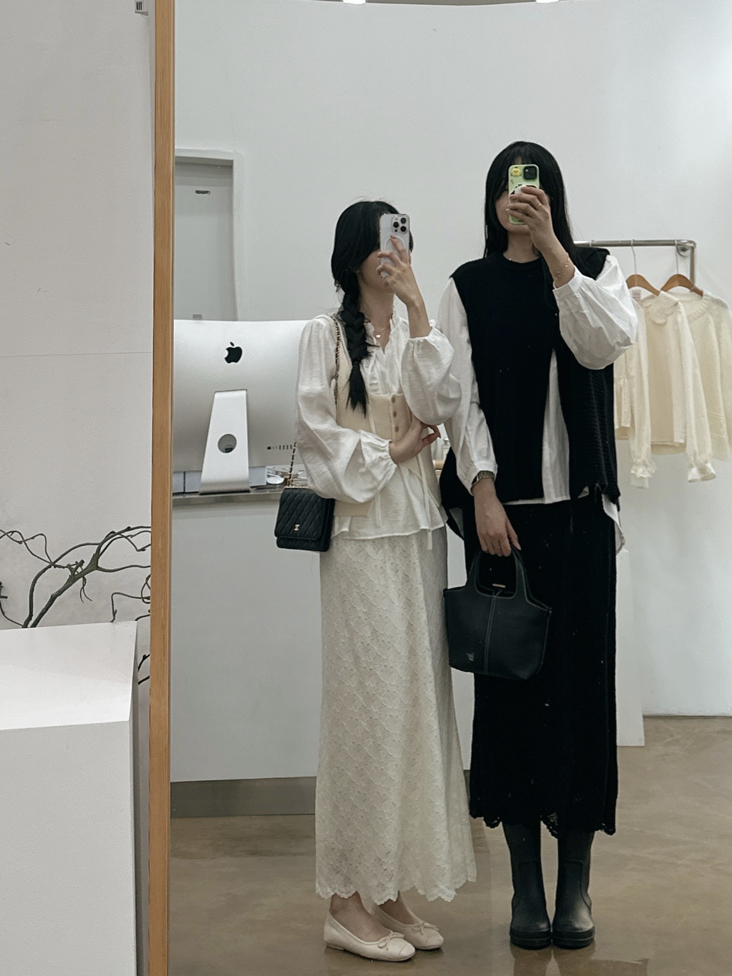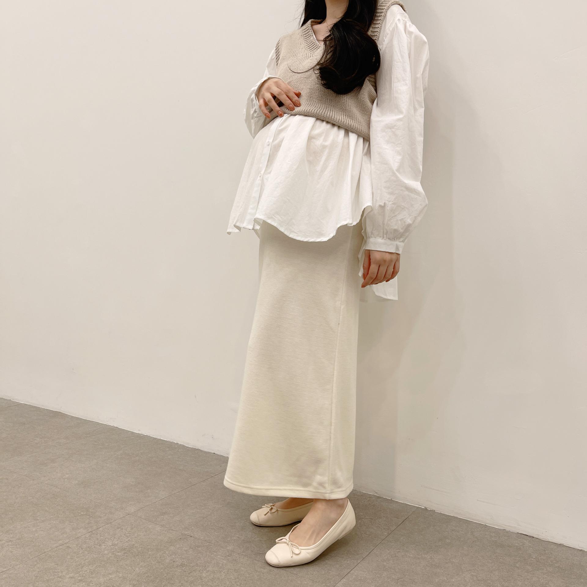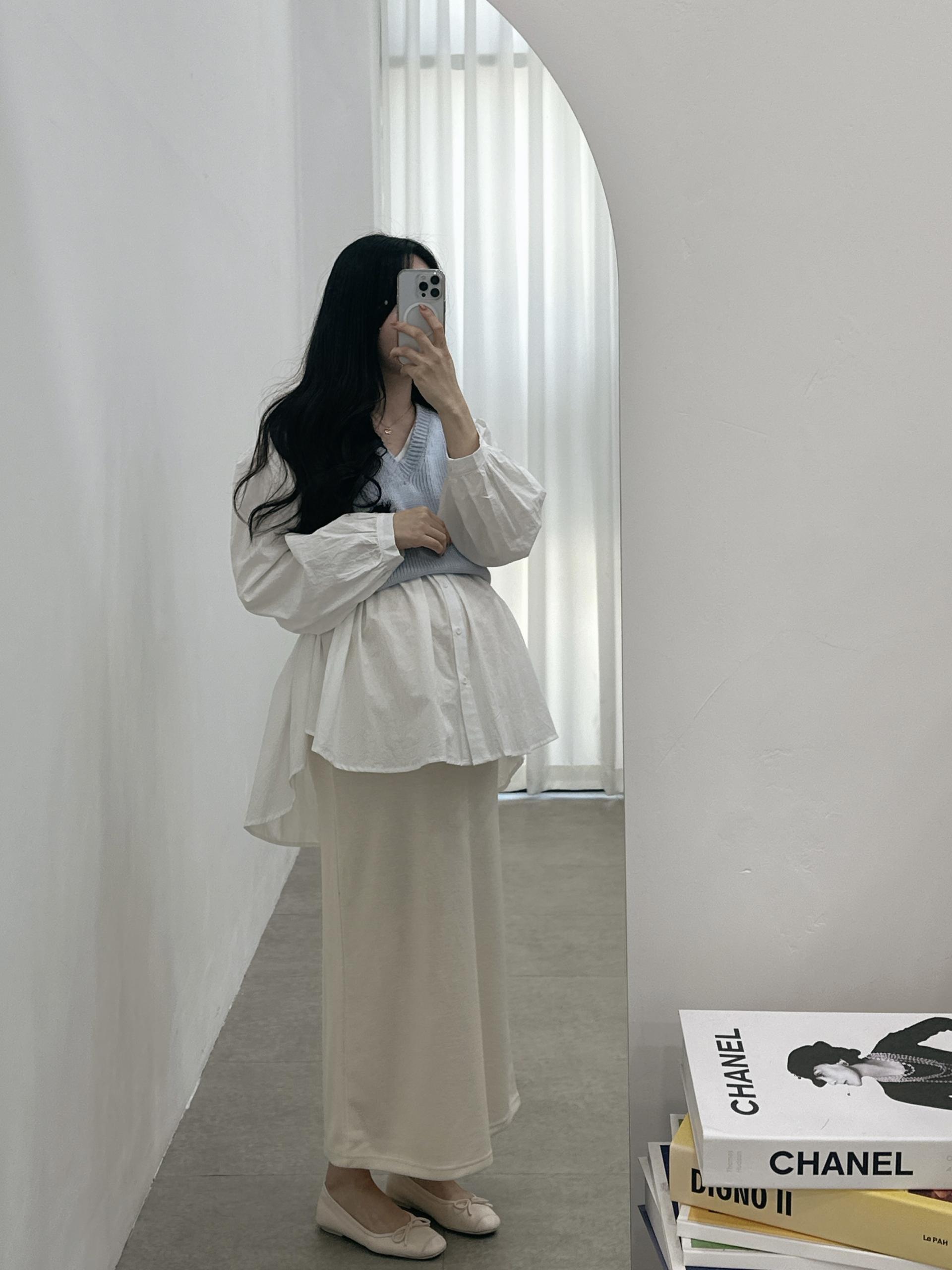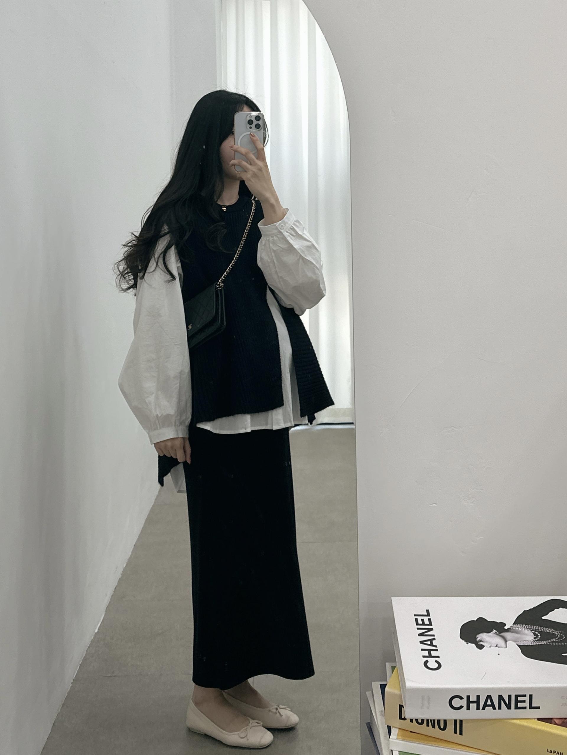 화이트 + 임부말랑스커트 + 사선트임니트조끼 (블랙)