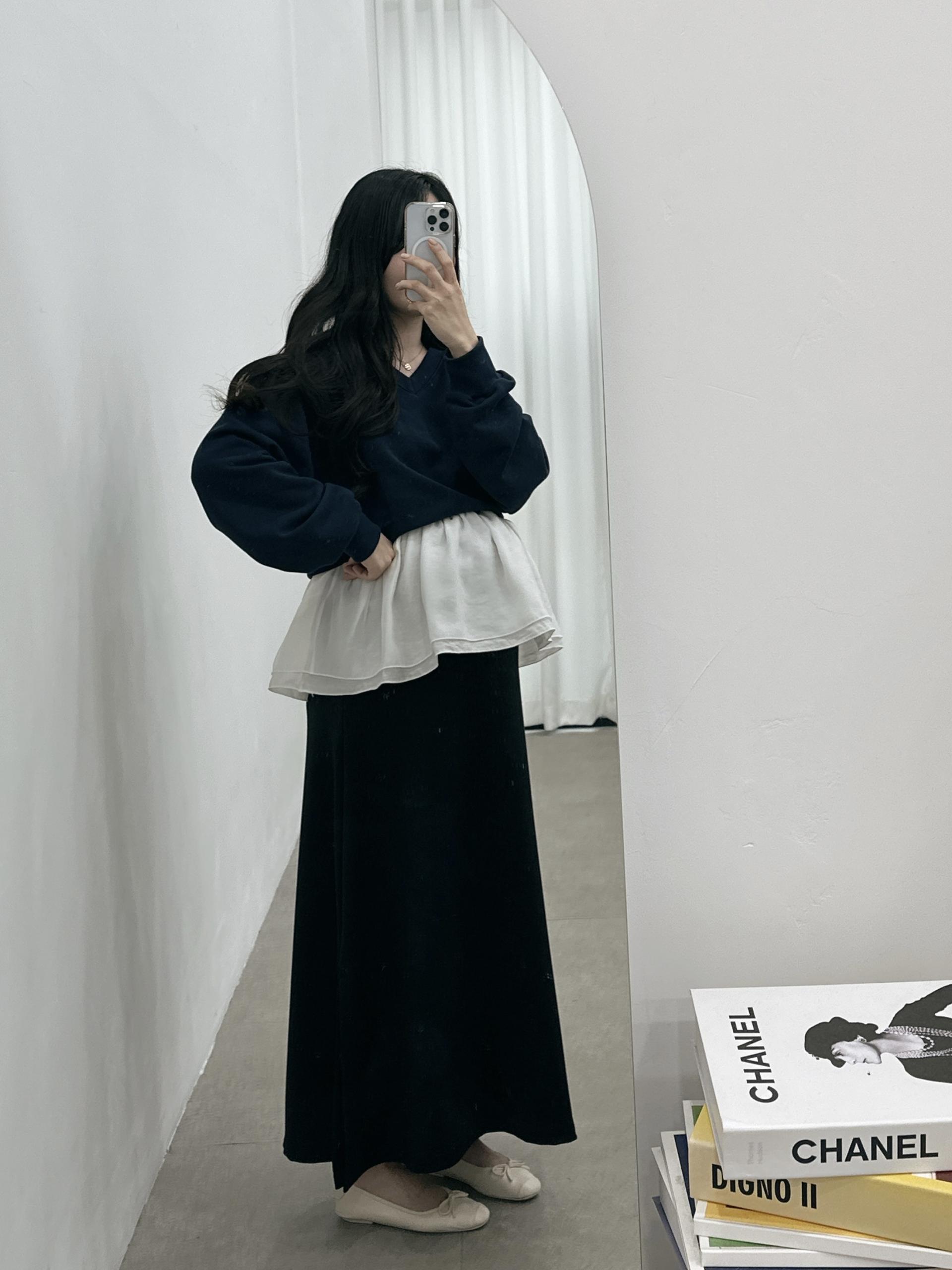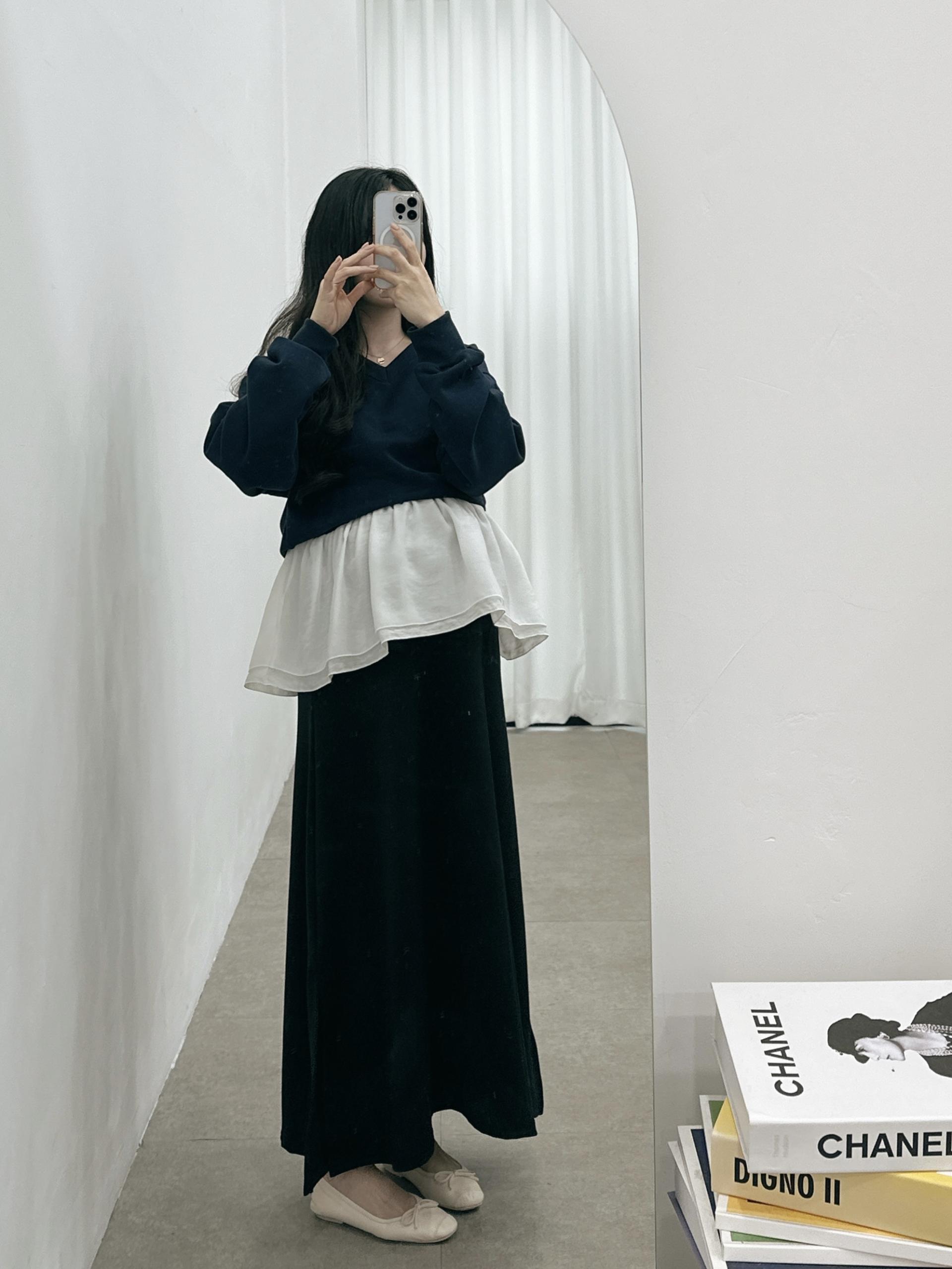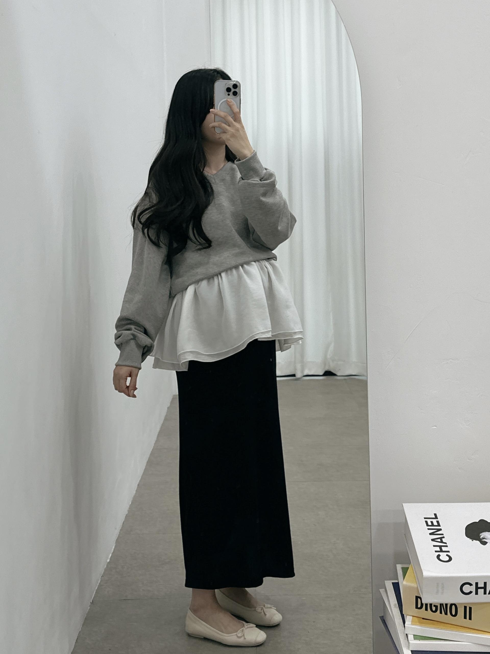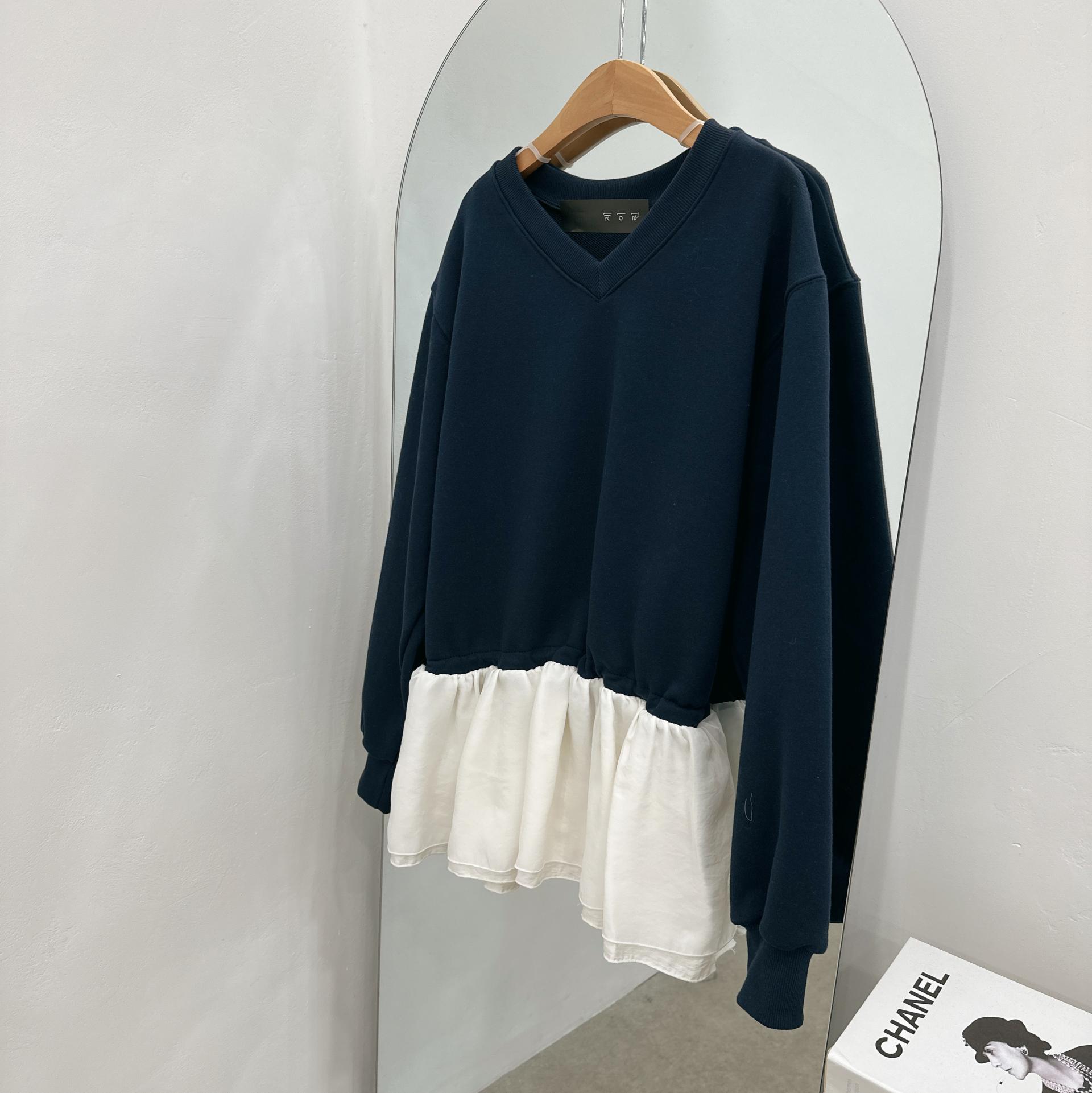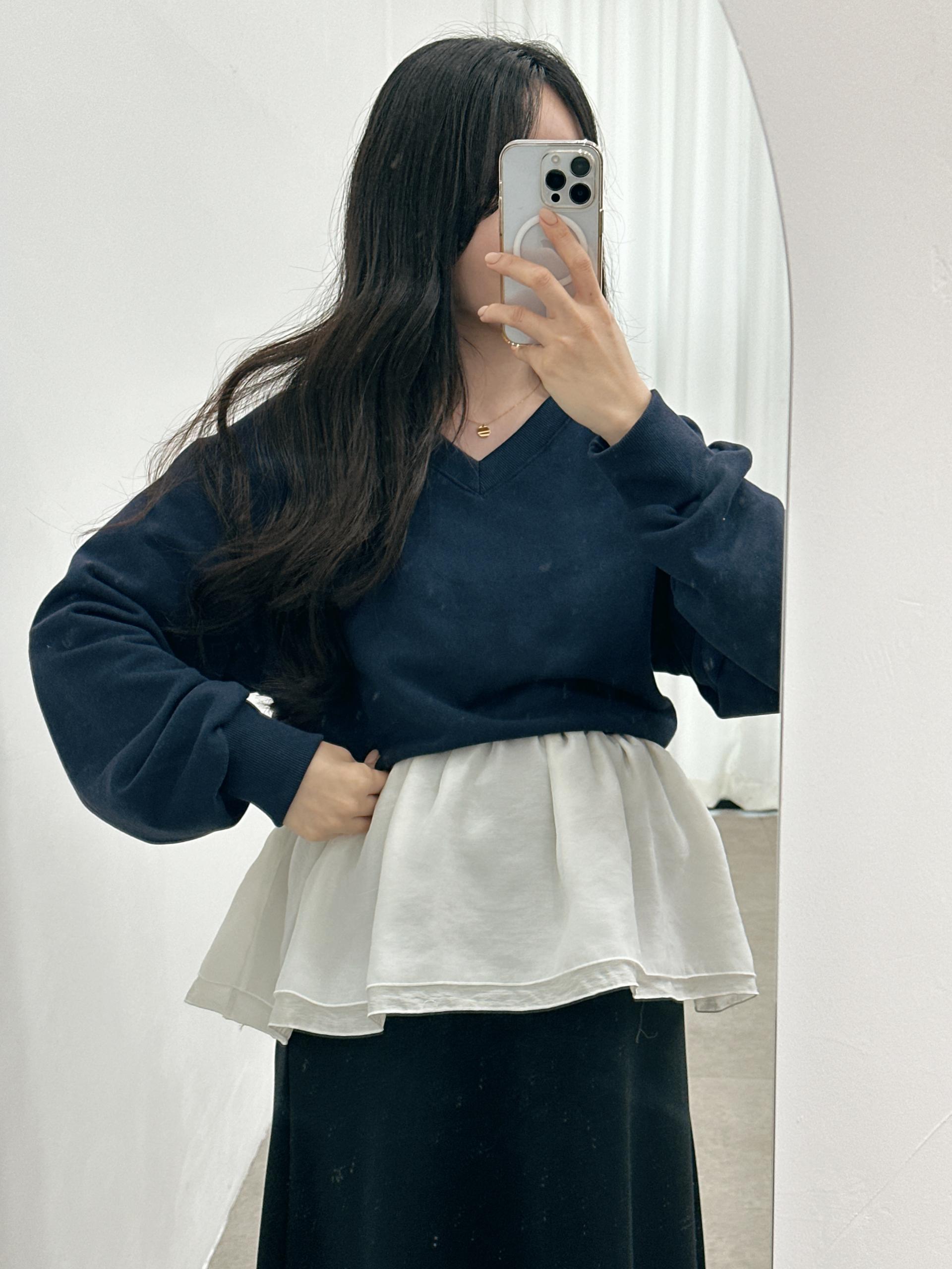 밑단 쉬폰레이어드가 일체형인 브이넥 맨투맨이에요 안쪽에 허리스트링이 있어서 핏이 너무예쁘게 잡힌답니다!!