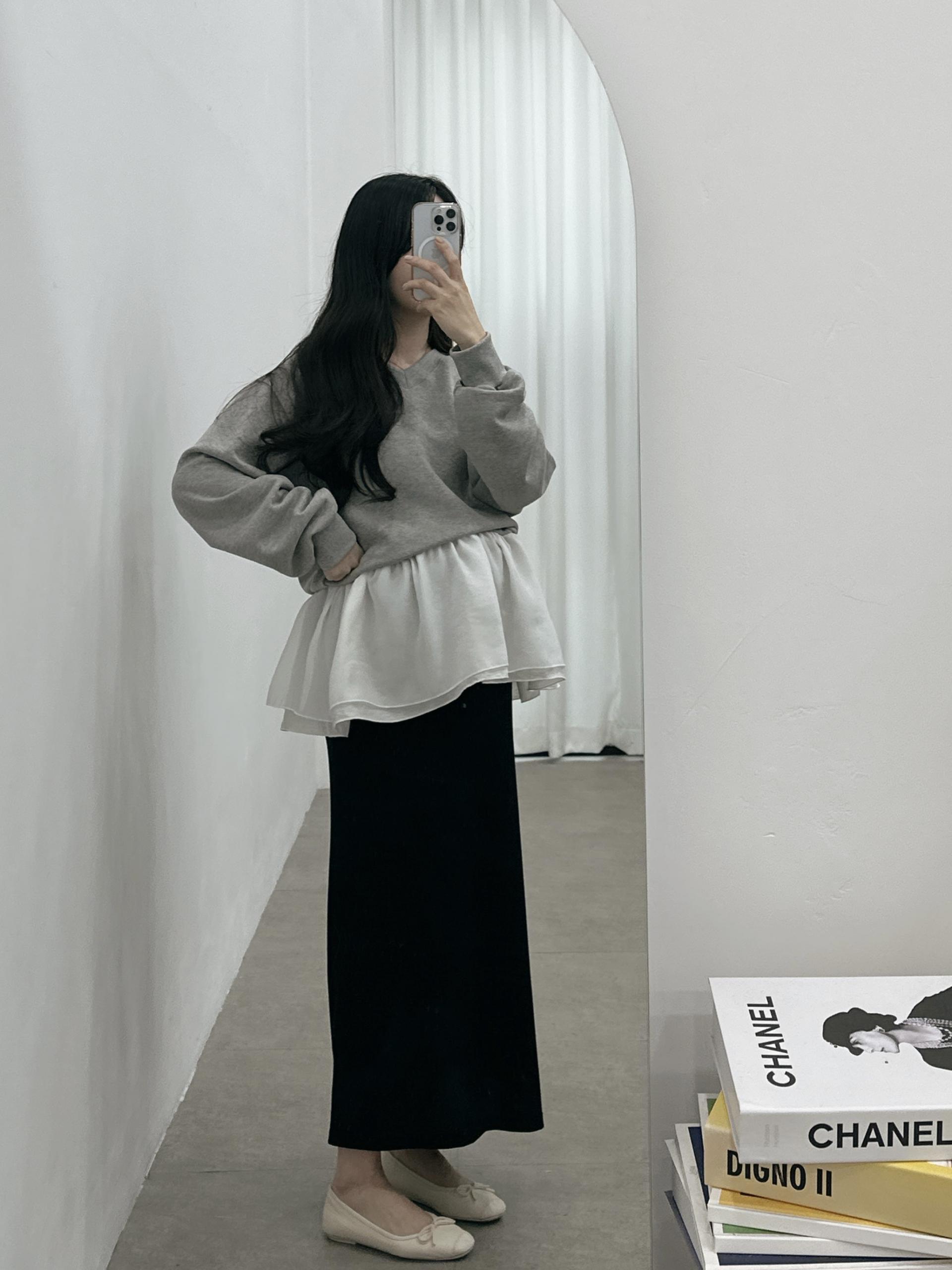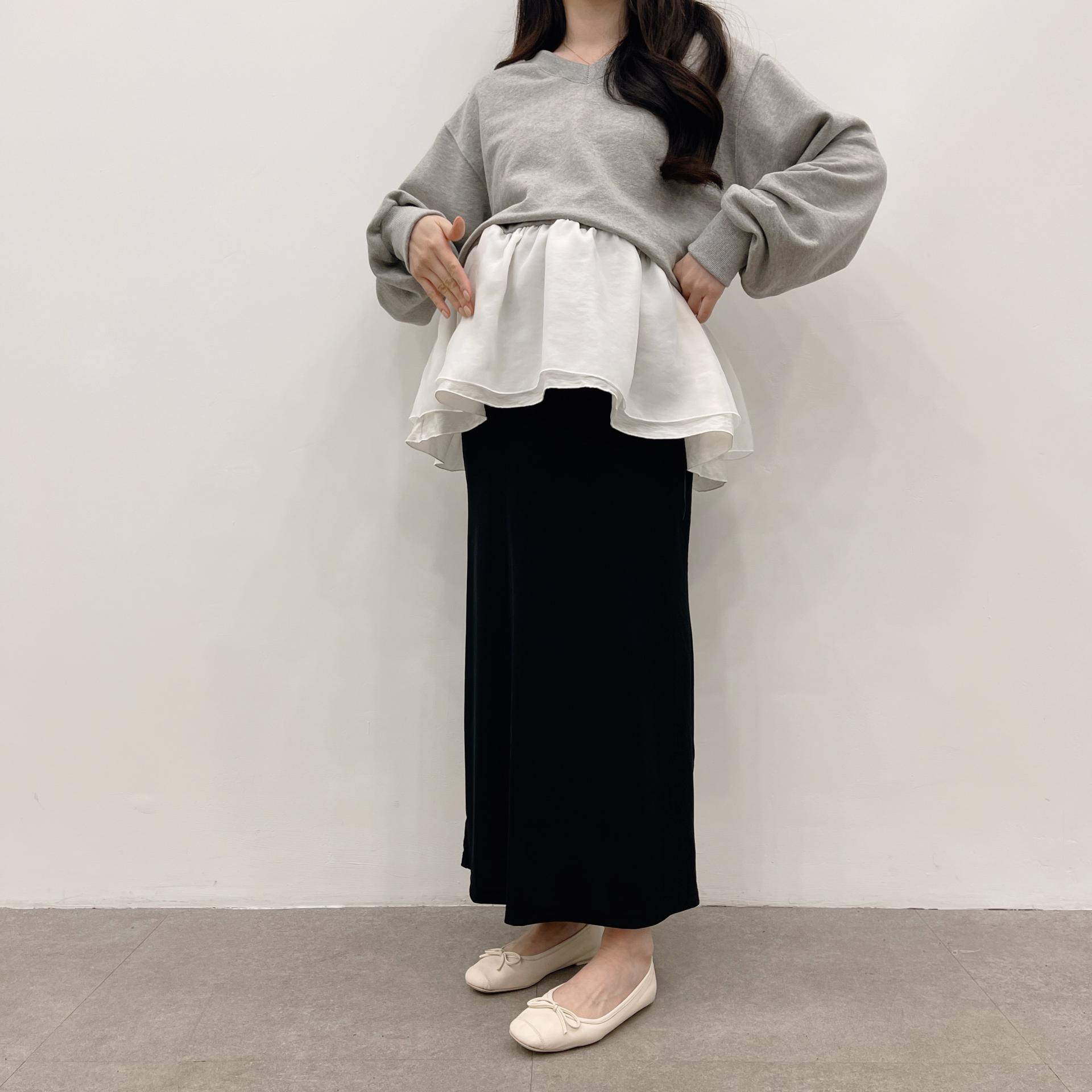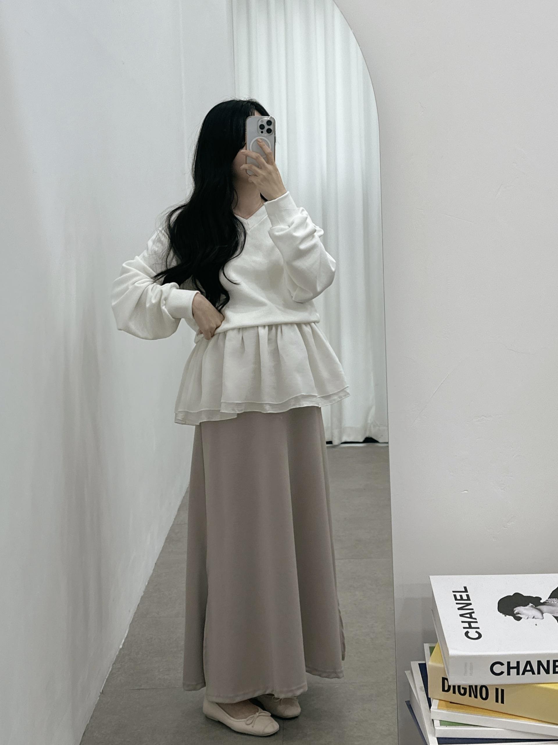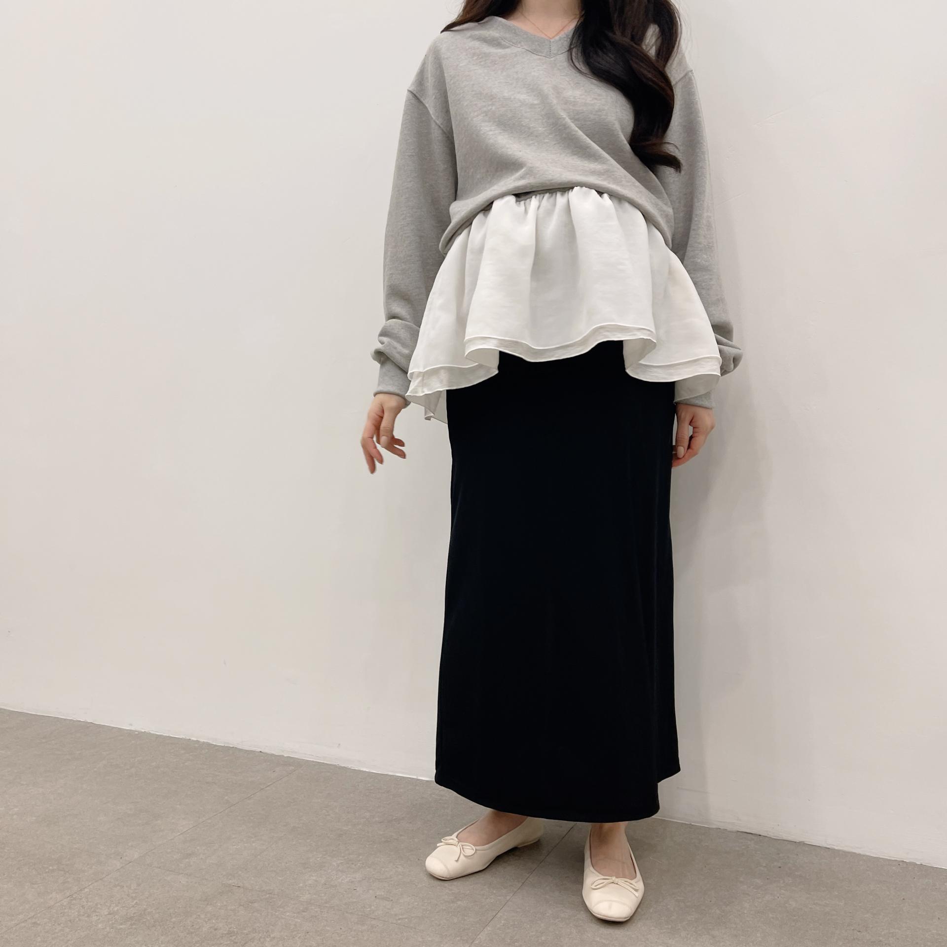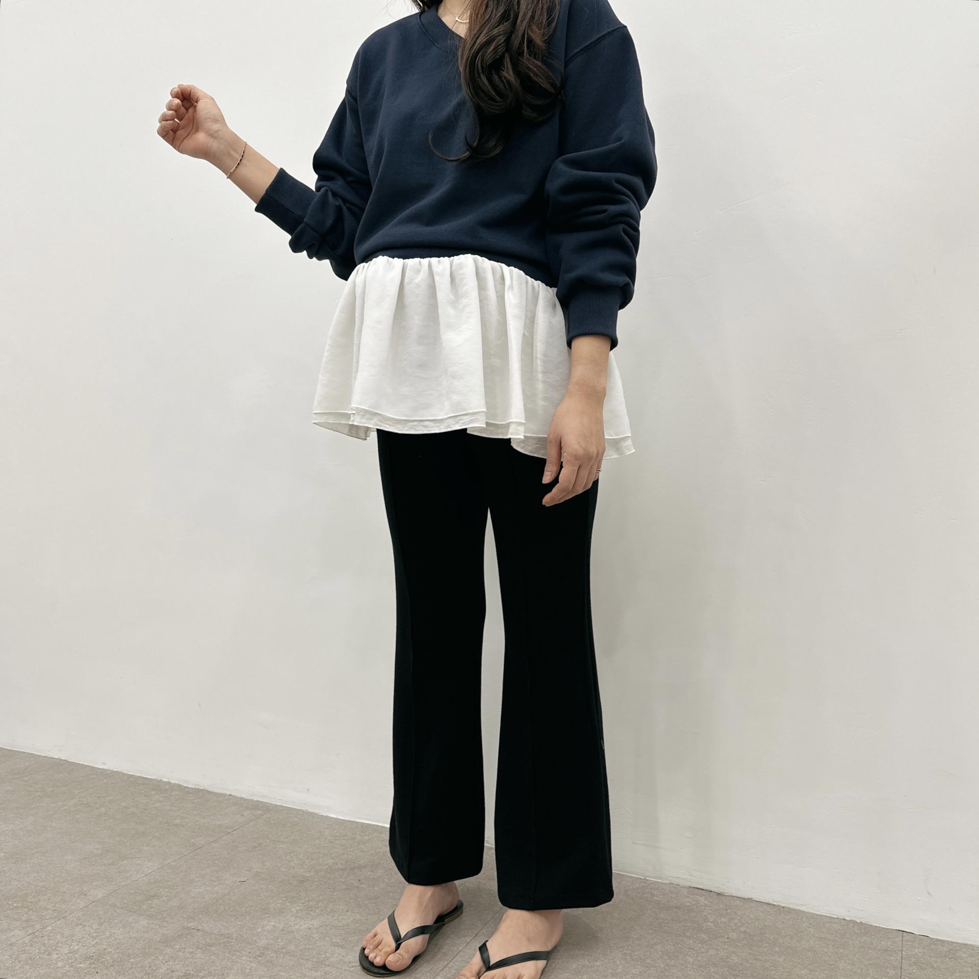 밑단 쉬폰레이어드가 일체형인 브이넥 맨투맨이에요 안쪽에 허리스트링이 있어서 핏이 너무예쁘게 잡힌답니다!!