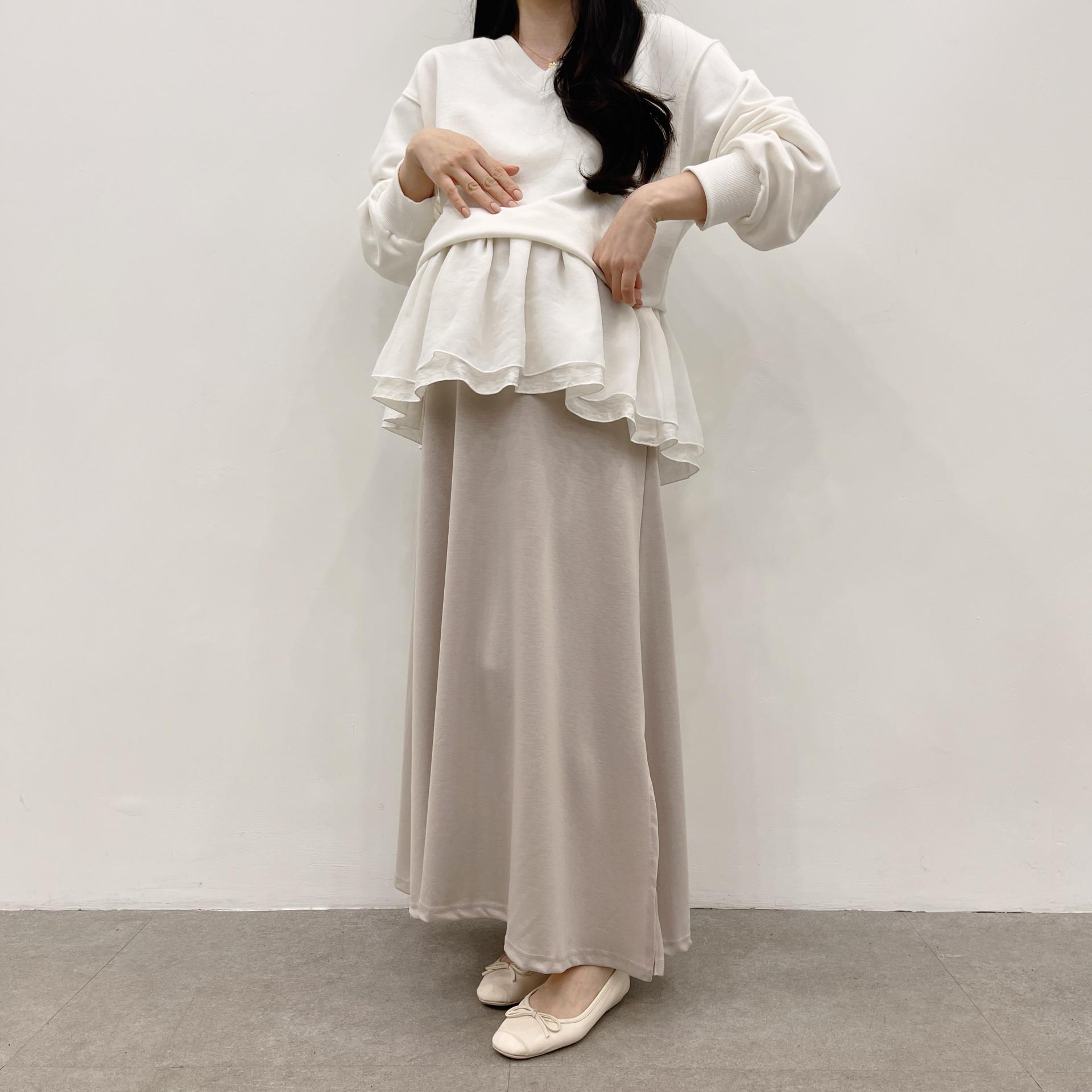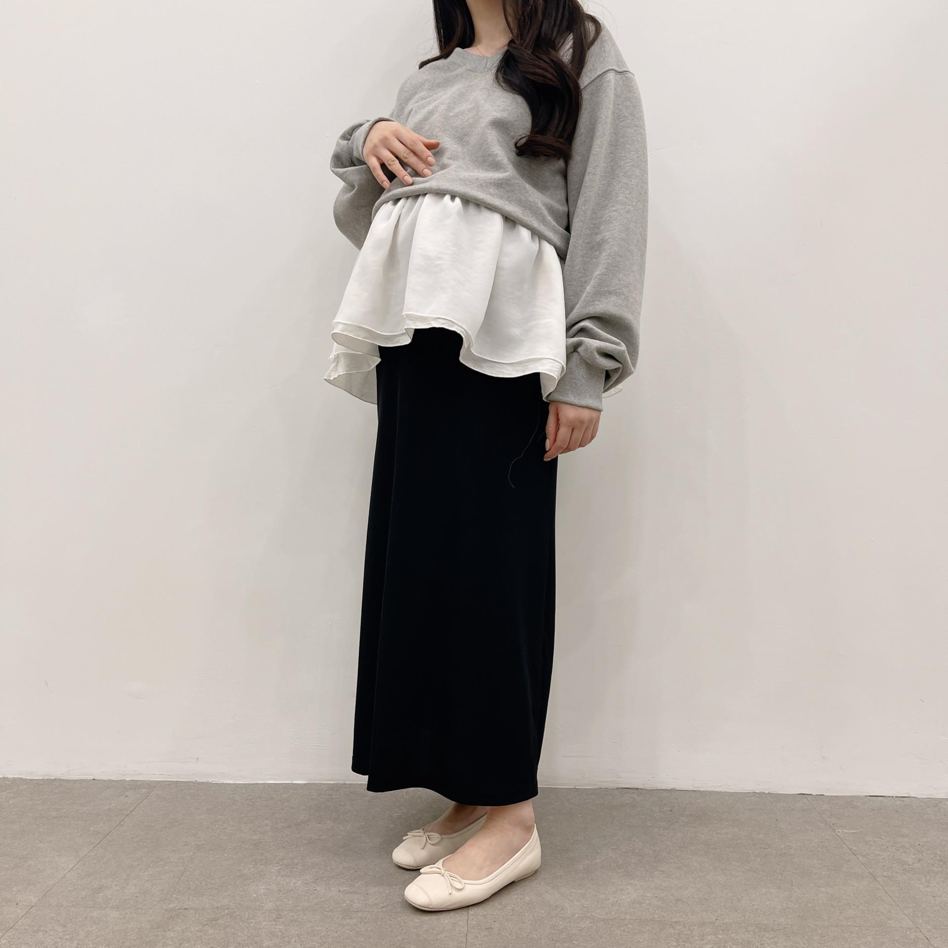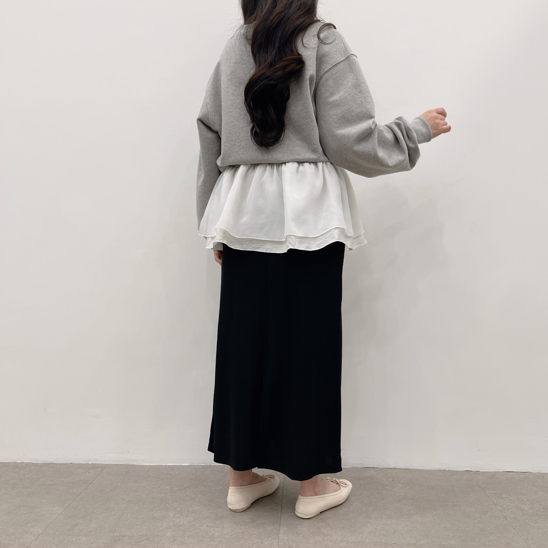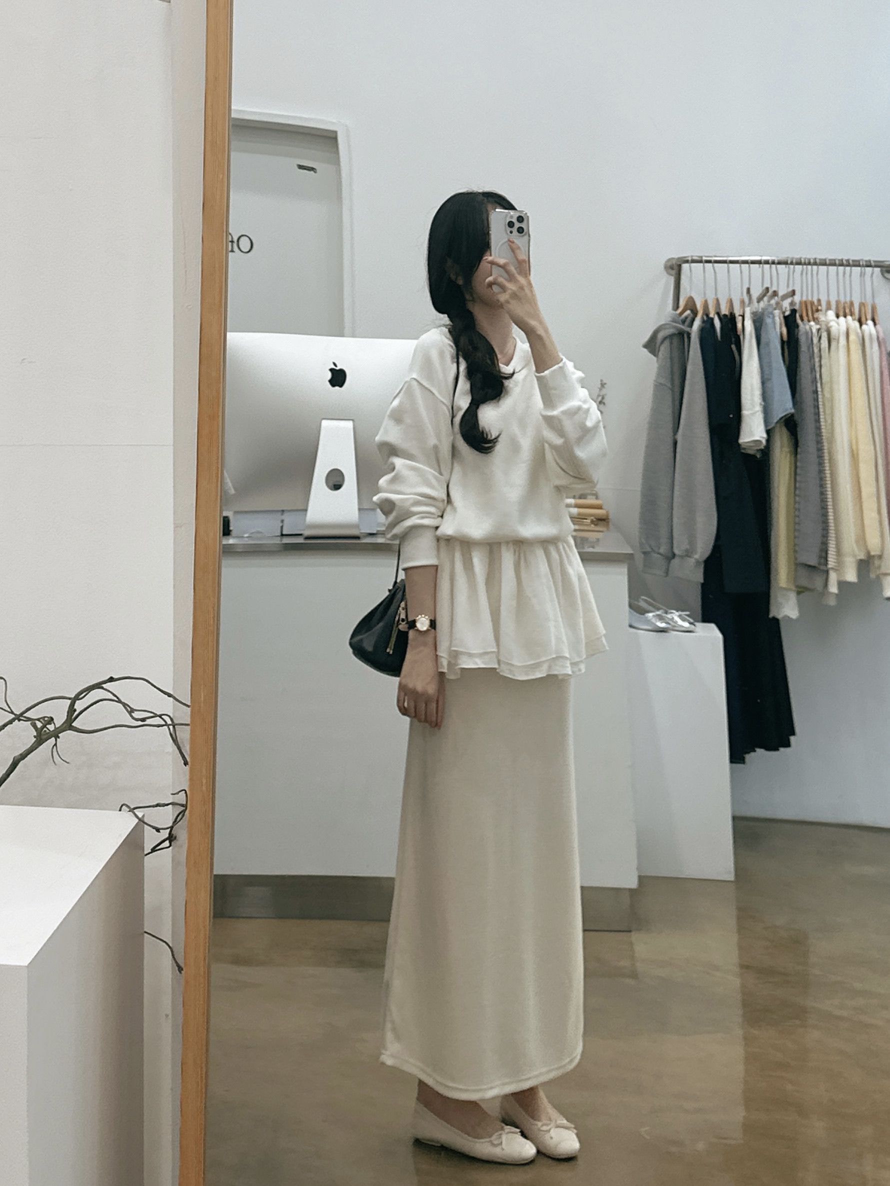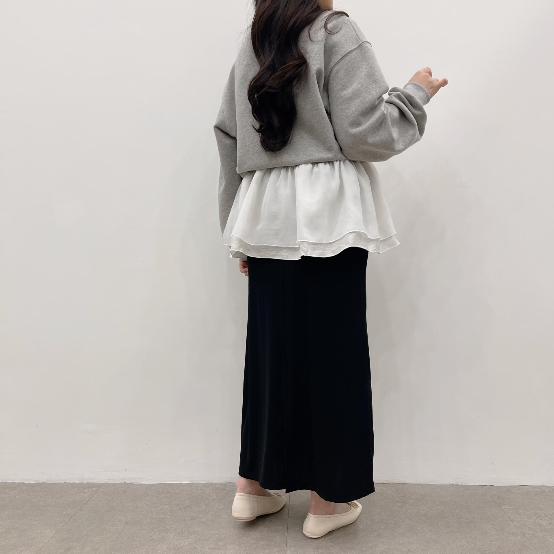 밑단 쉬폰레이어드가 일체형인 브이넥 맨투맨이에요 안쪽에 허리스트링이 있어서 핏이 너무예쁘게 잡힌답니다!!