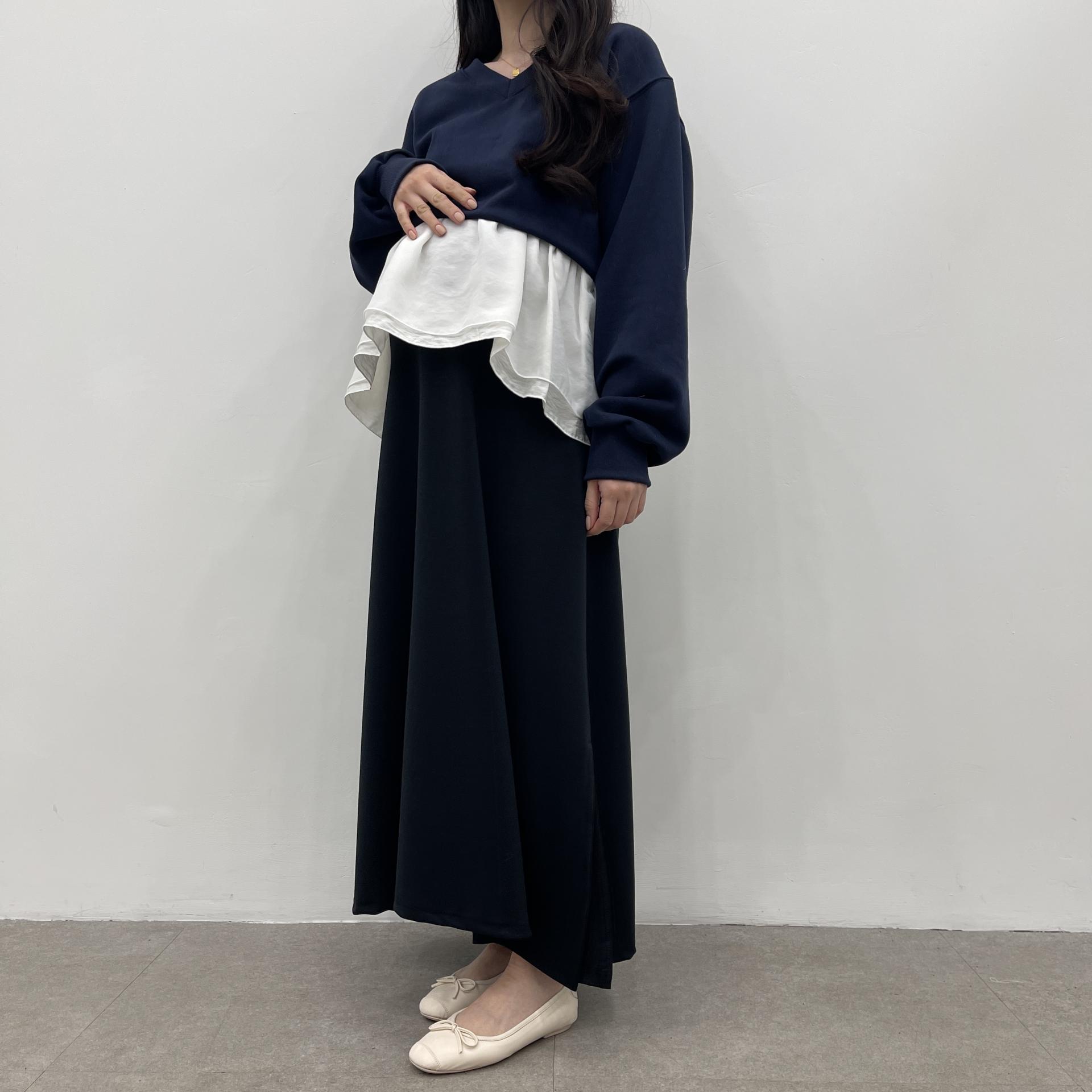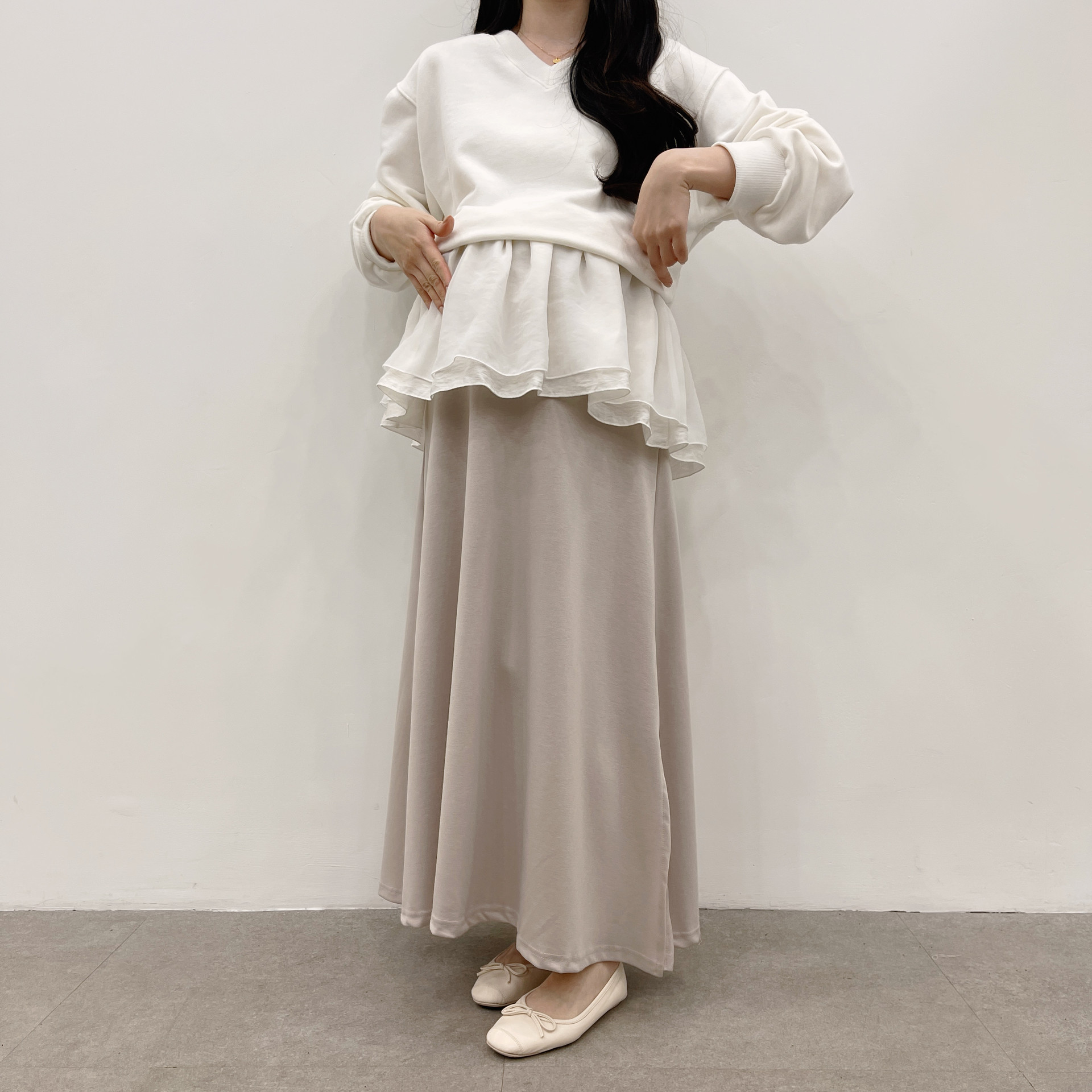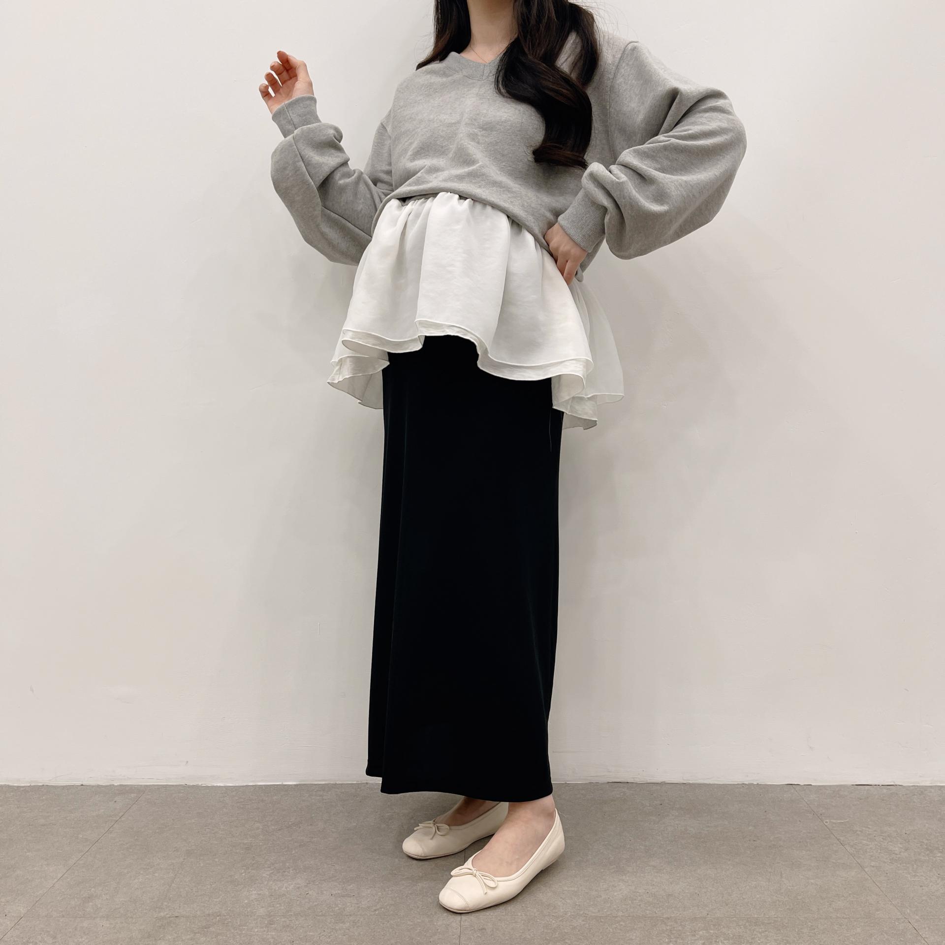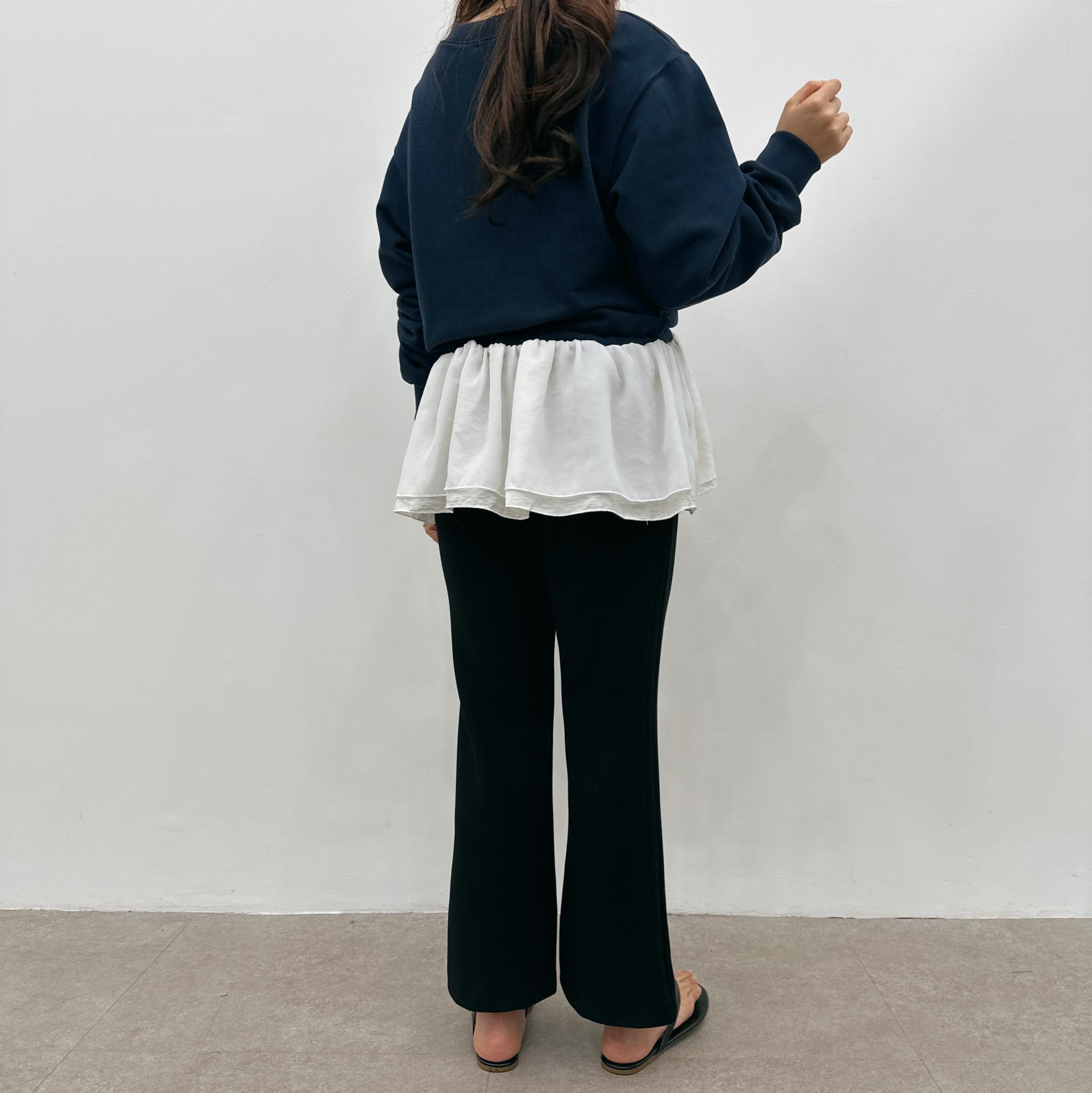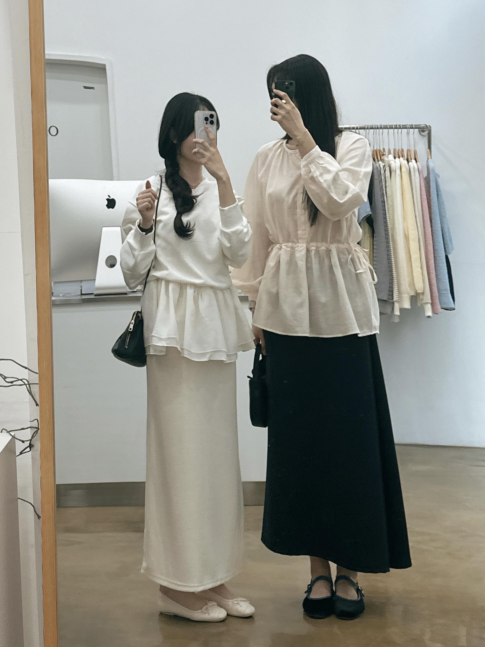밑단 쉬폰레이어드가 일체형인 브이넥 맨투맨이에요 안쪽에 허리스트링이 있어서 핏이 너무예쁘게 잡힌답니다!!