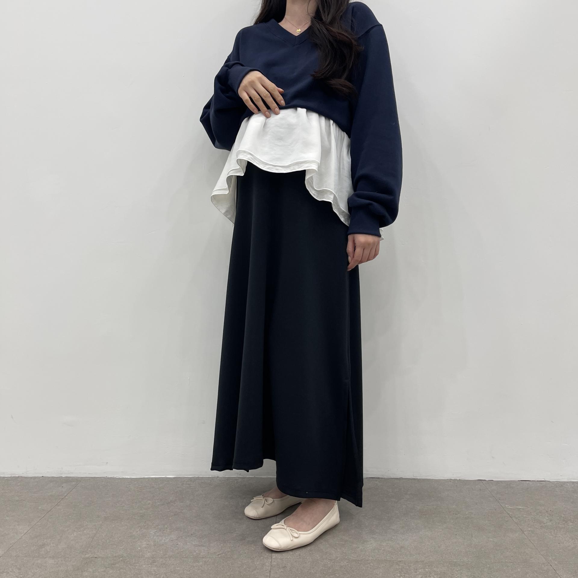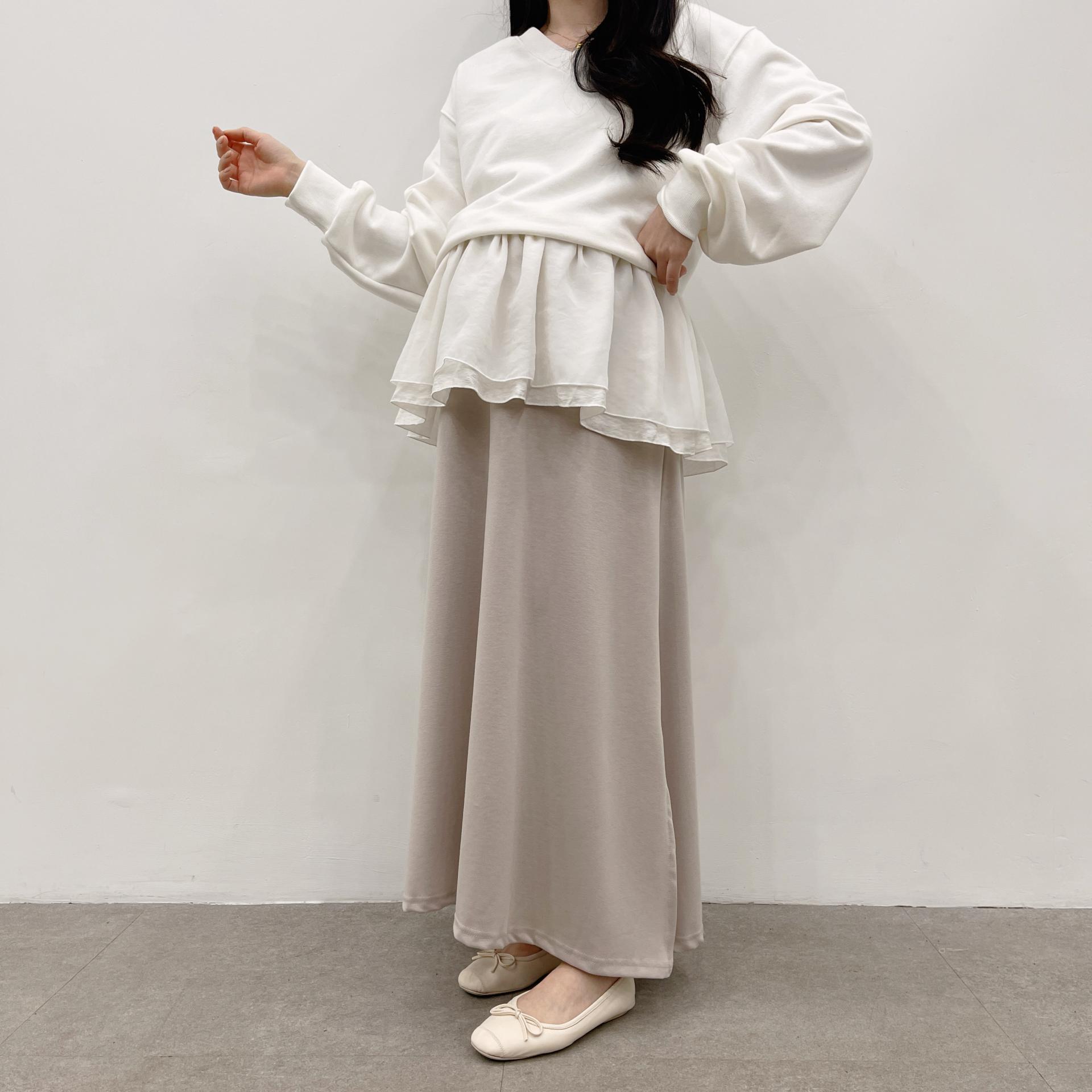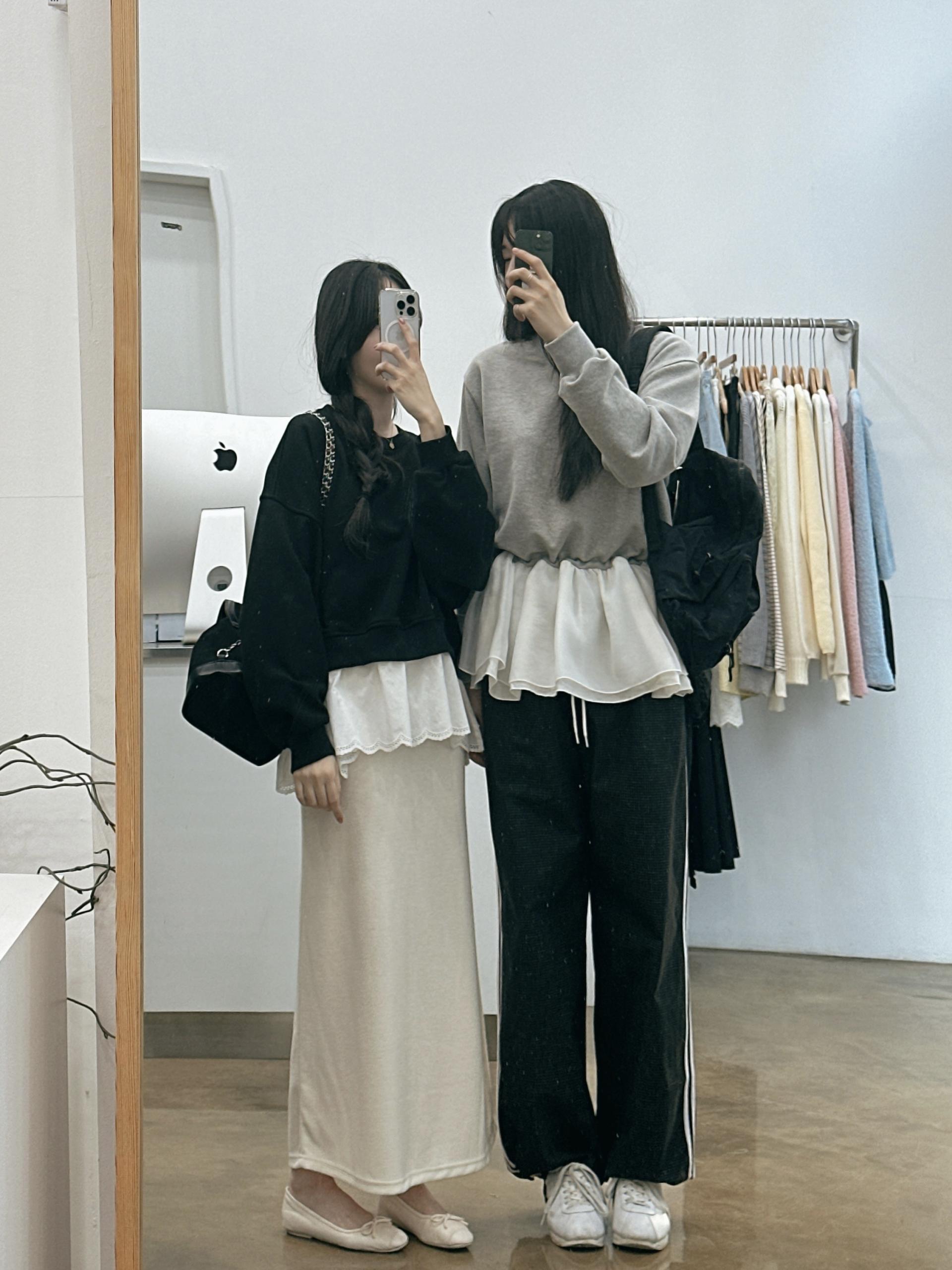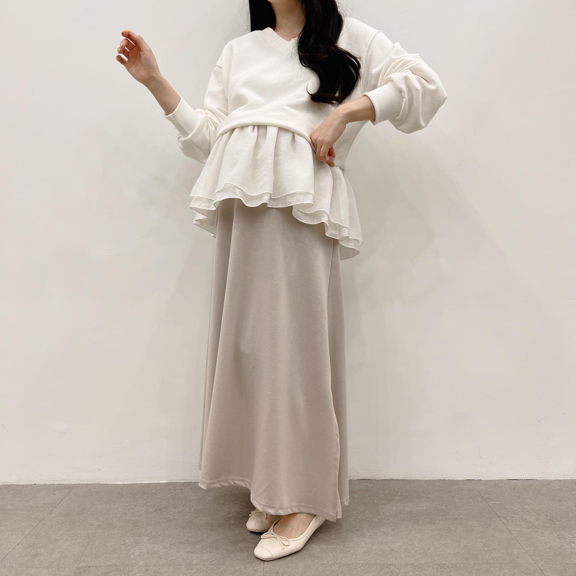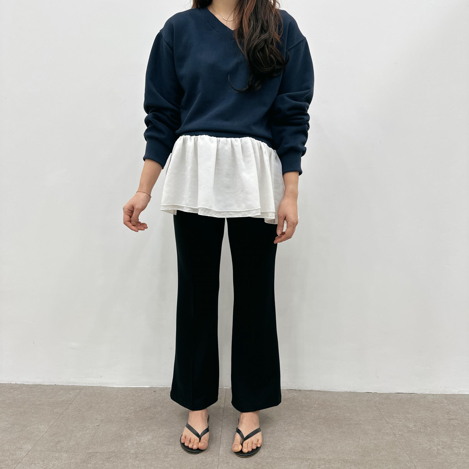 밑단 쉬폰레이어드가 일체형인 브이넥 맨투맨이에요 안쪽에 허리스트링이 있어서 핏이 너무예쁘게 잡힌답니다!!