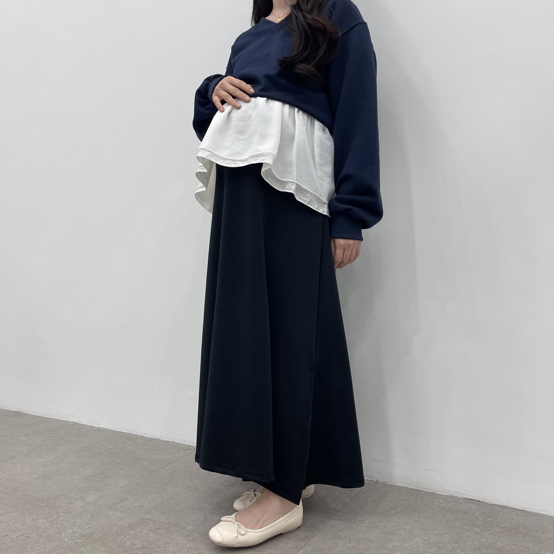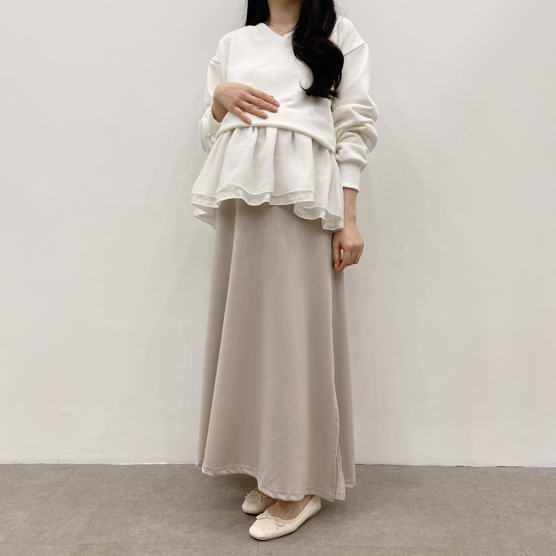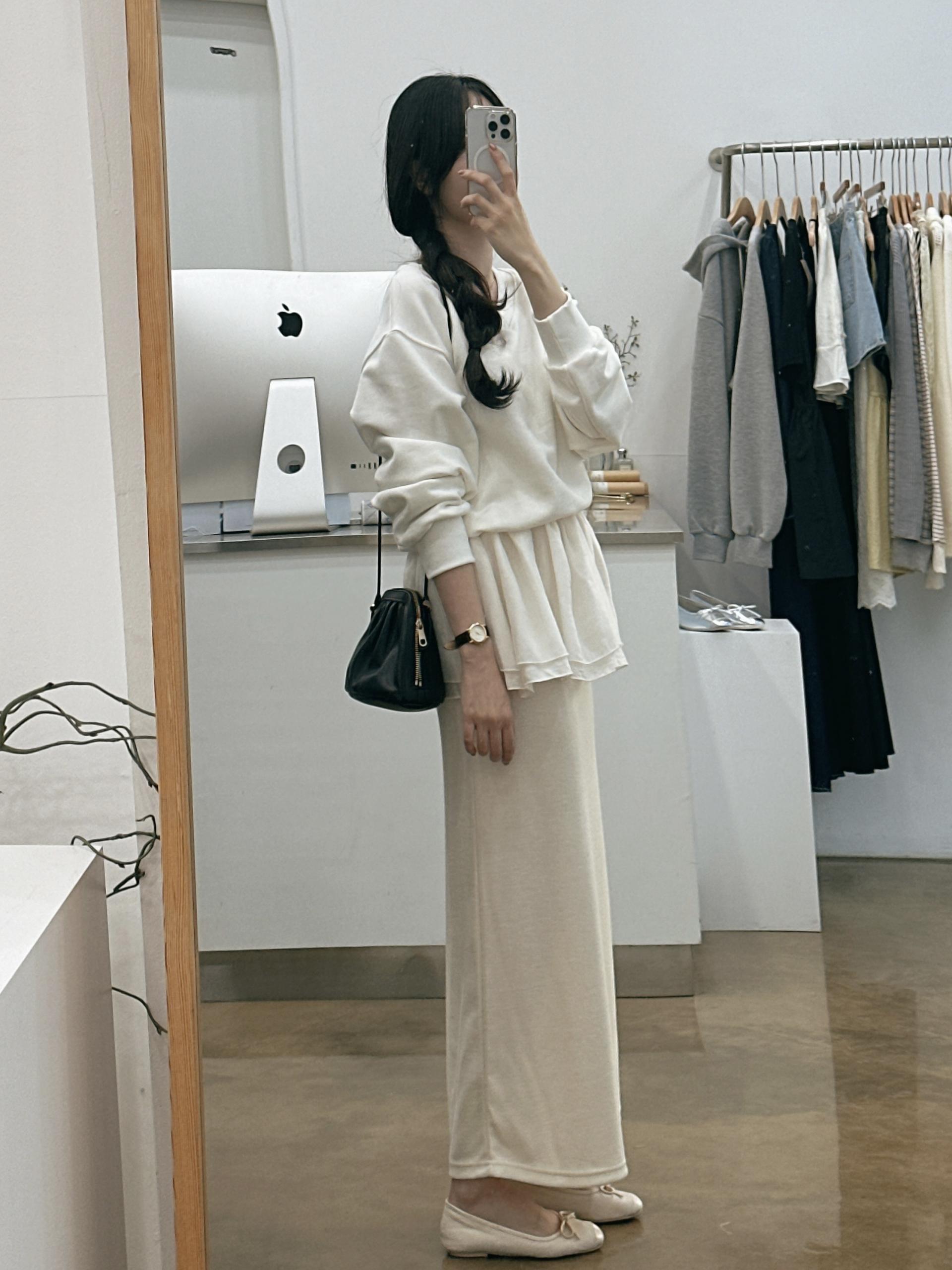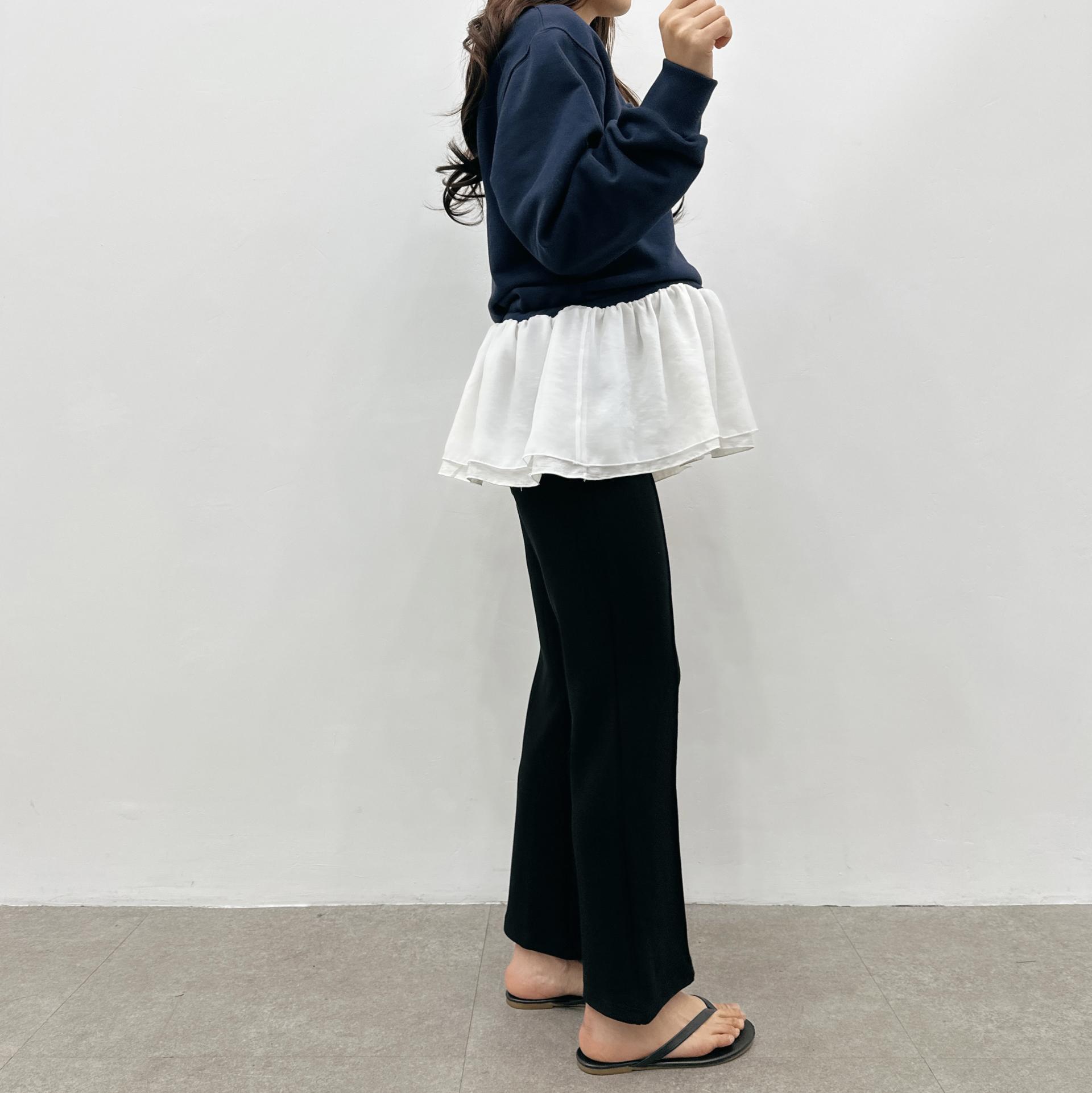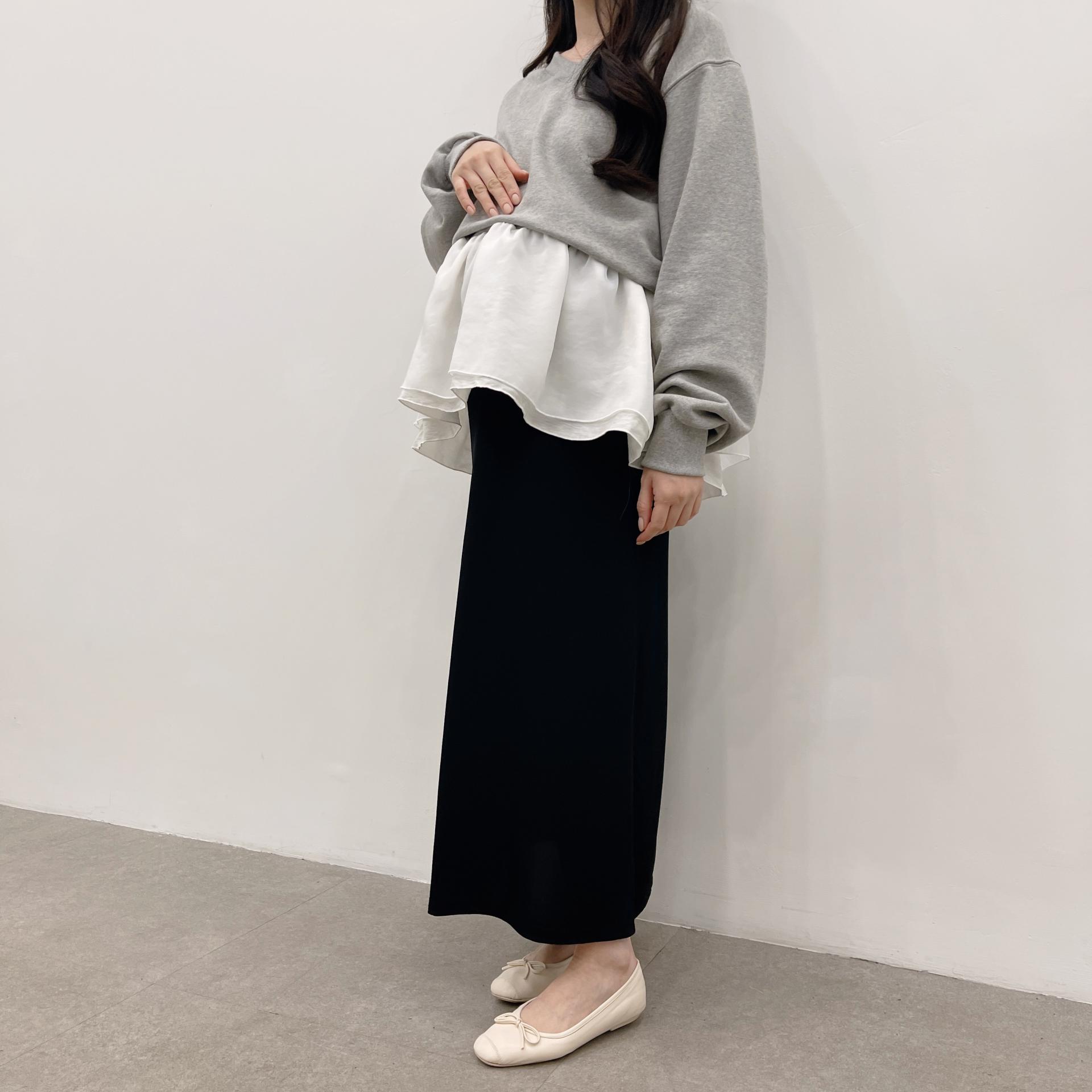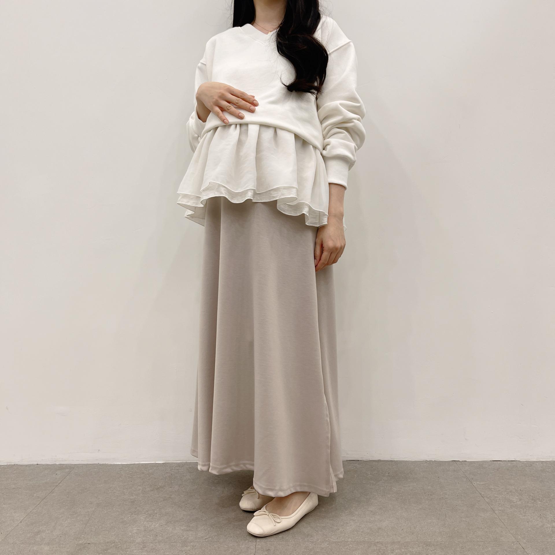 밑단 쉬폰레이어드가 일체형인 브이넥 맨투맨이에요 안쪽에 허리스트링이 있어서 핏이 너무예쁘게 잡힌답니다!!