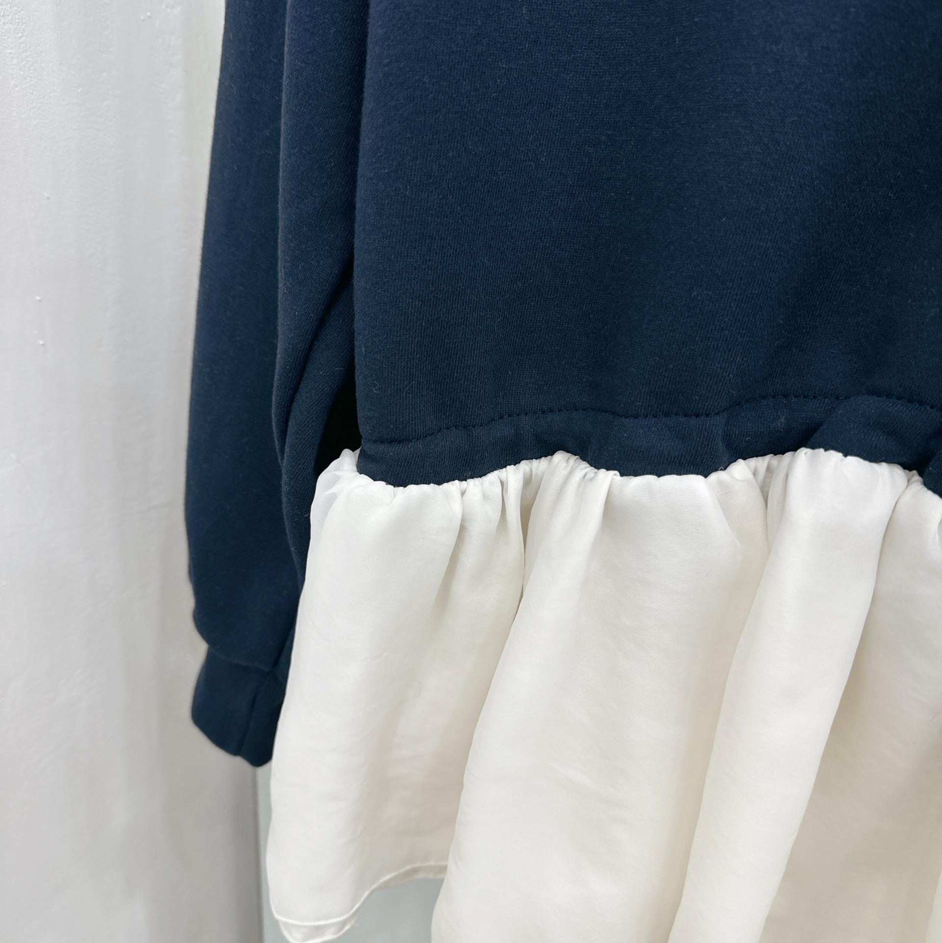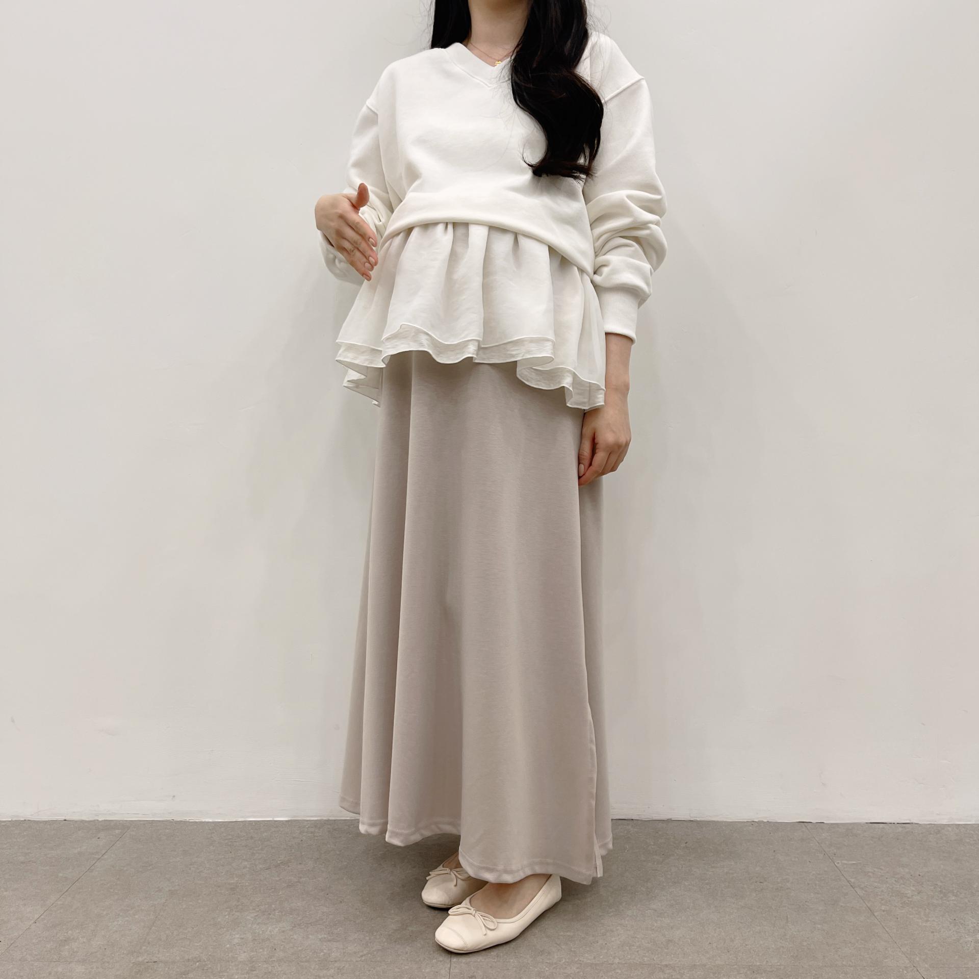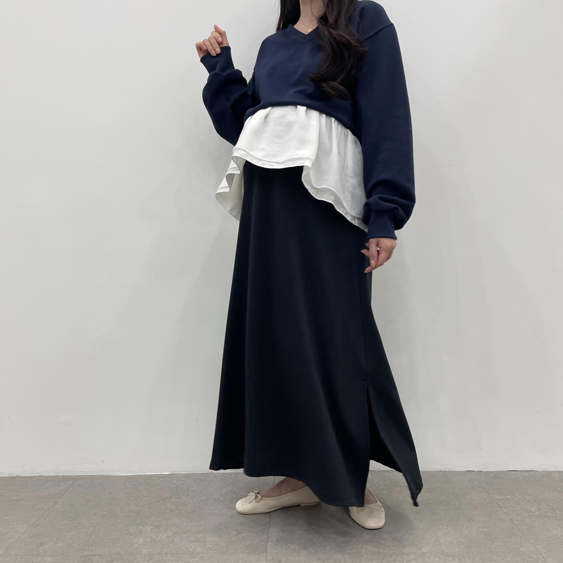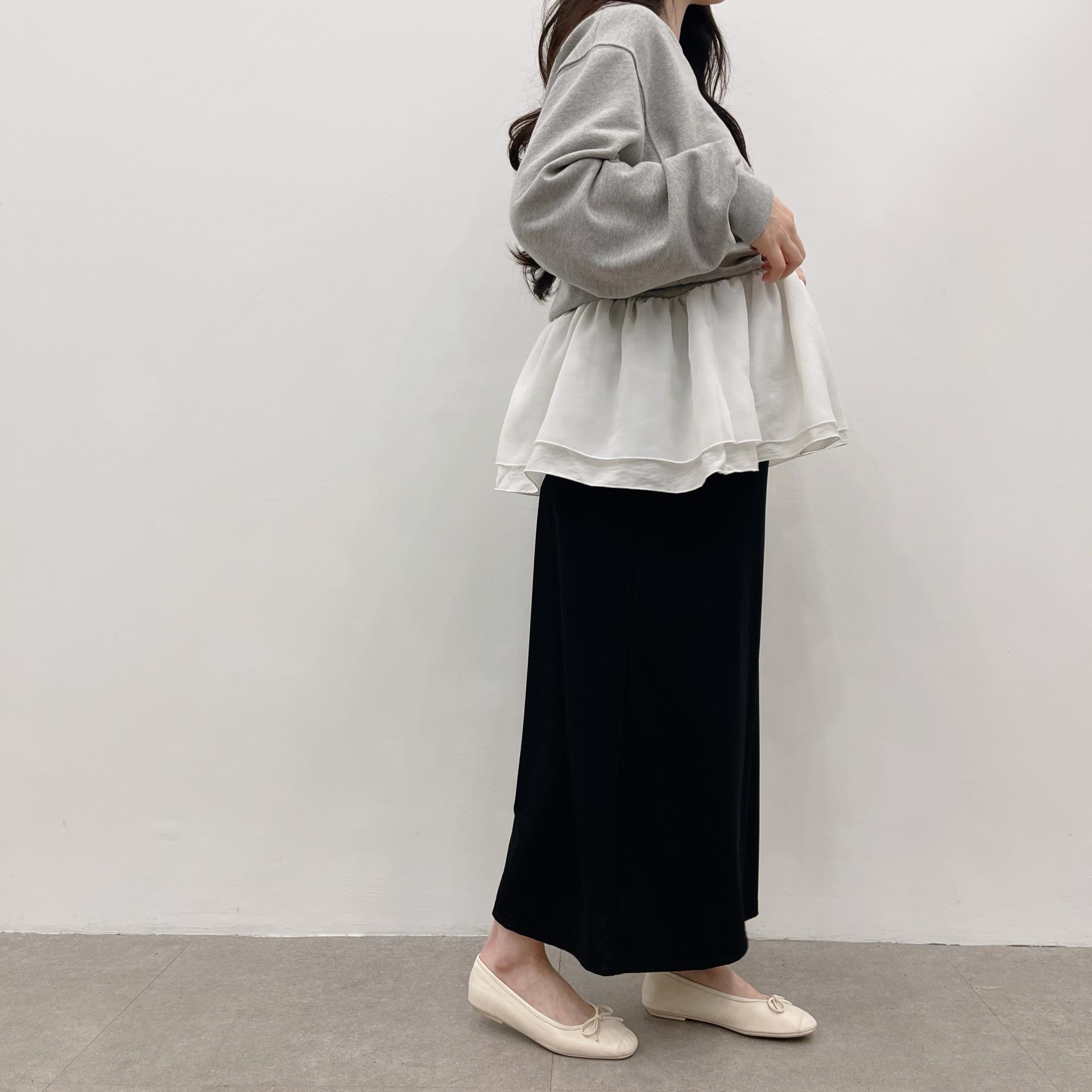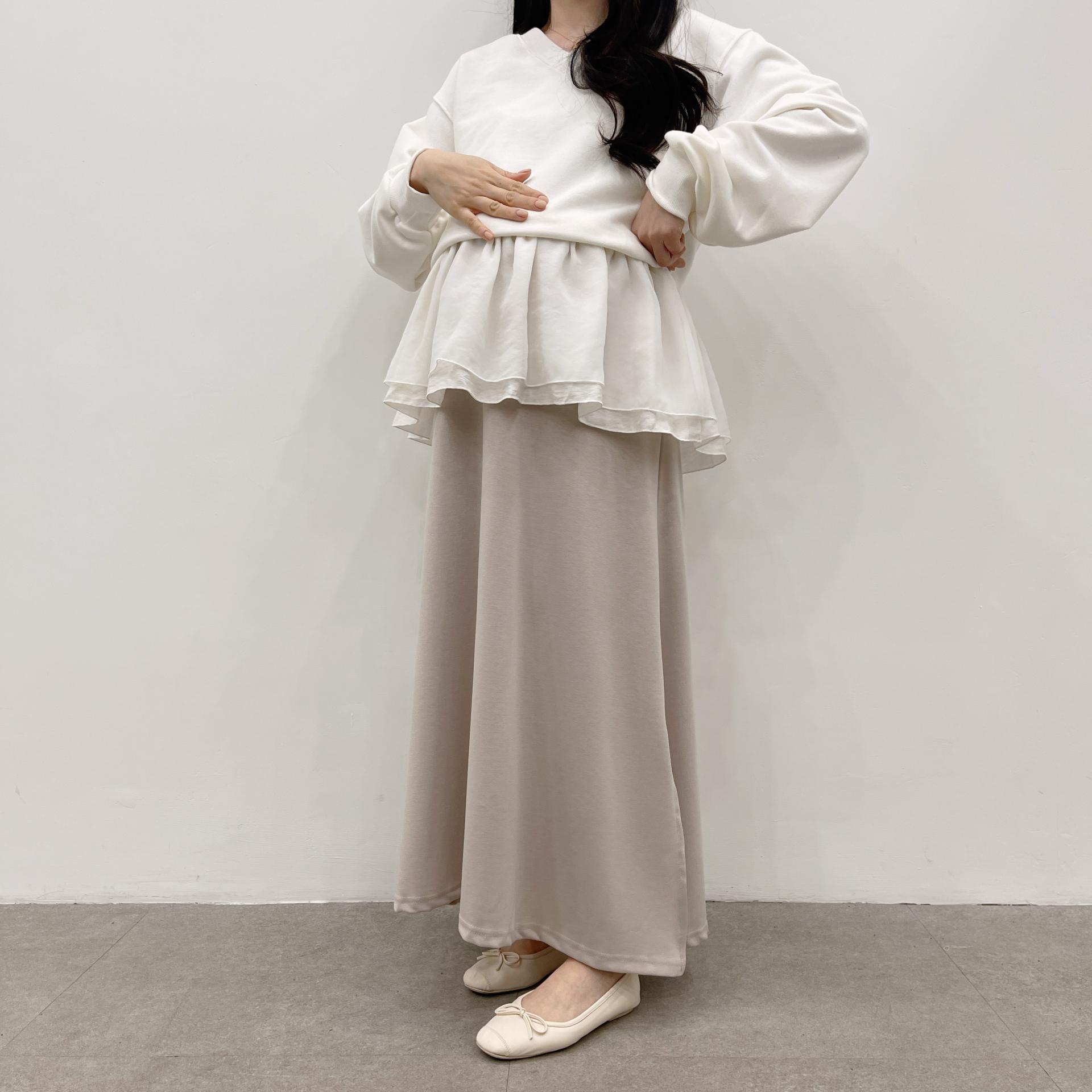 밑단 쉬폰레이어드가 일체형인 브이넥 맨투맨이에요 안쪽에 허리스트링이 있어서 핏이 너무예쁘게 잡힌답니다!!