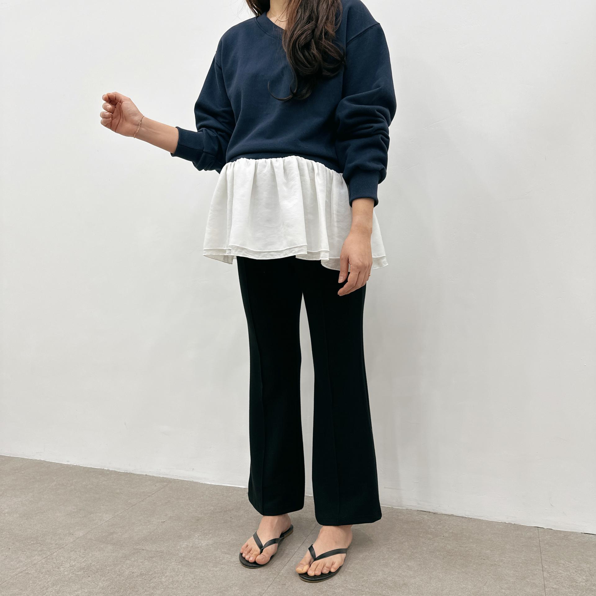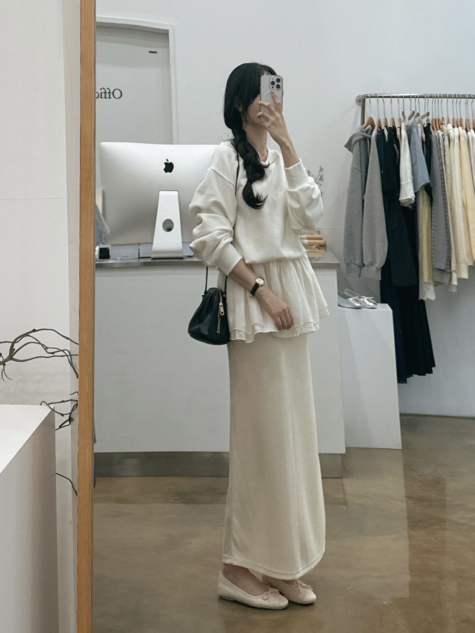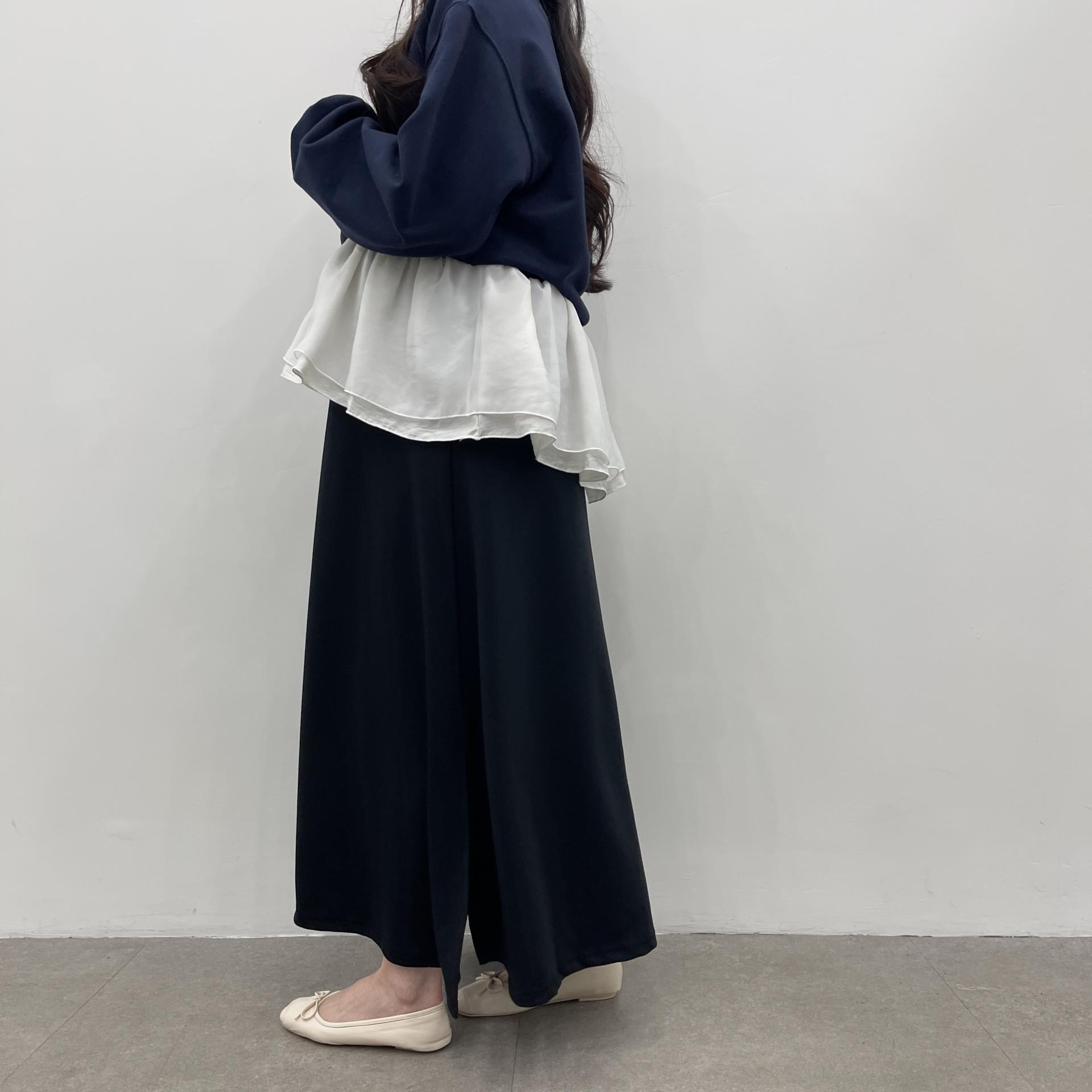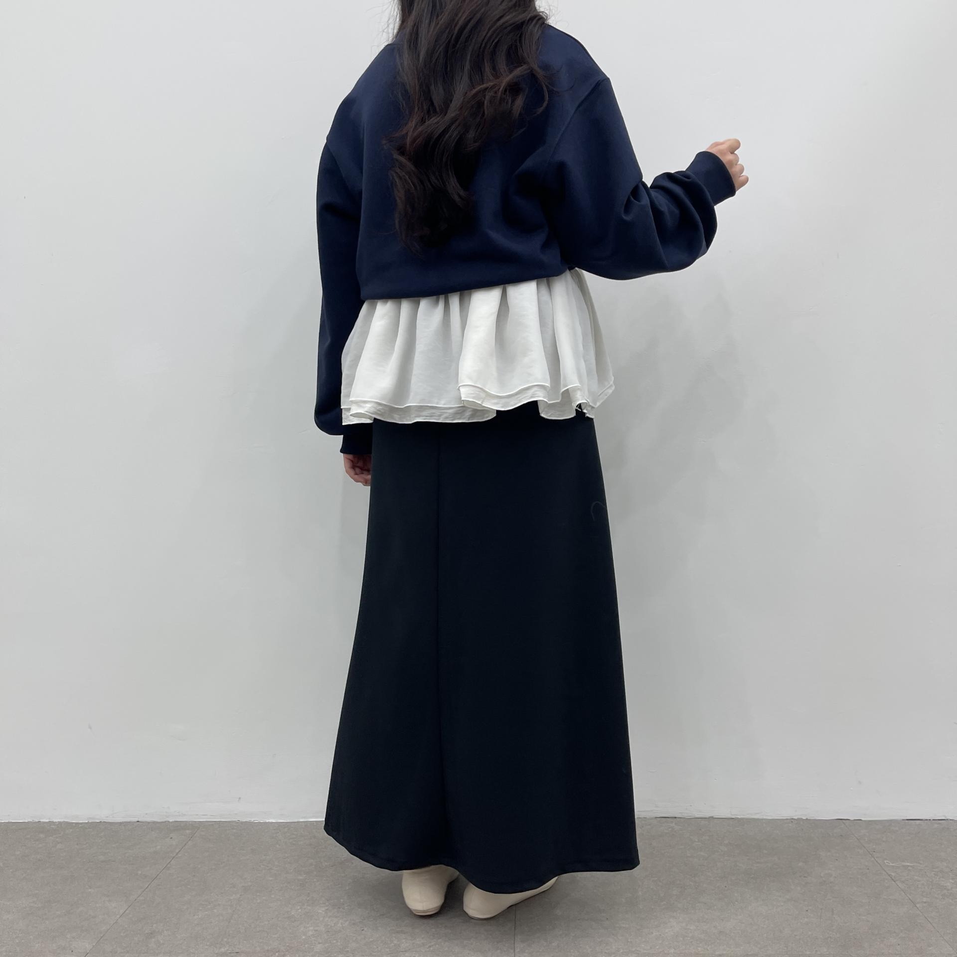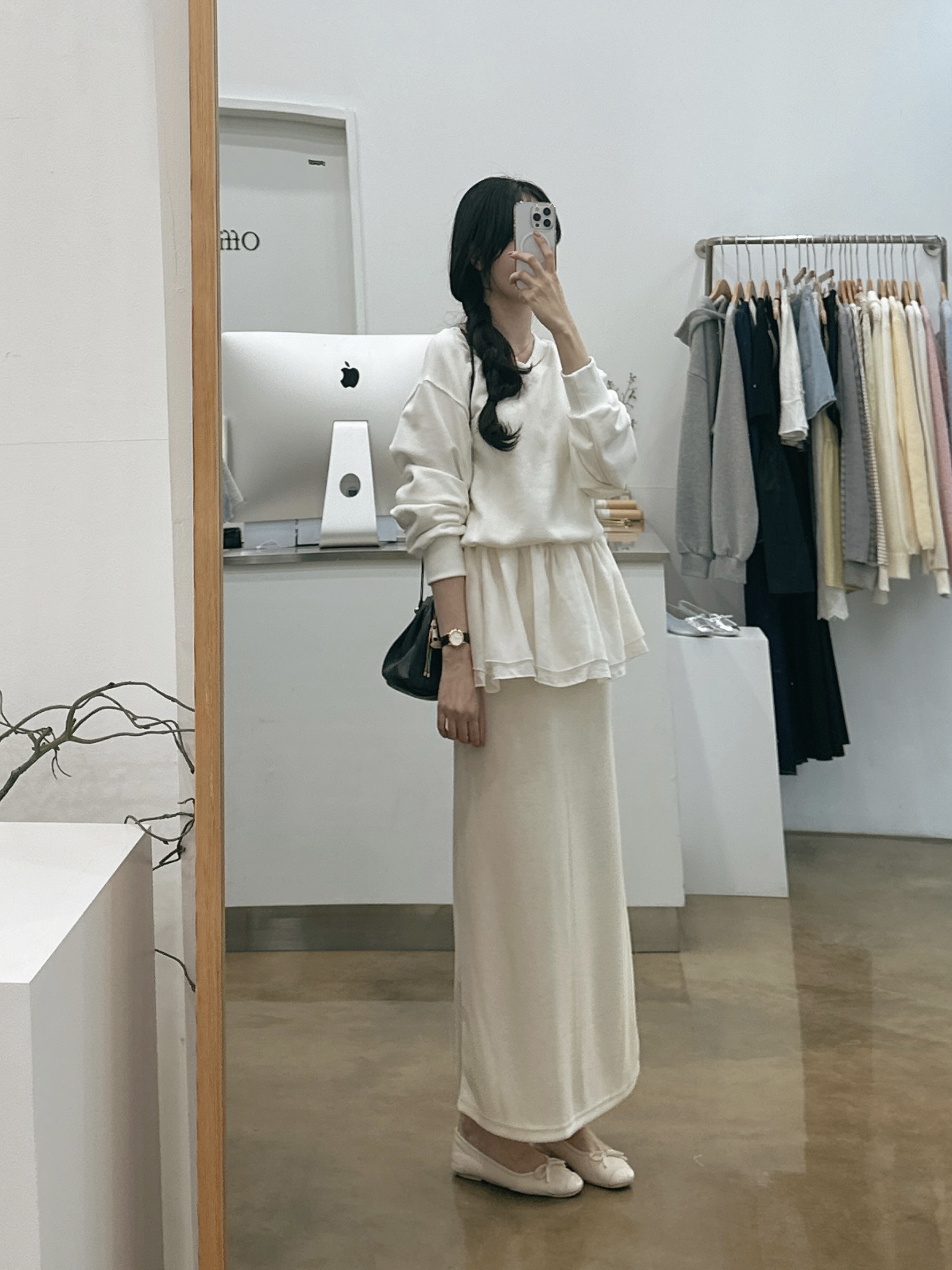 밑단 쉬폰레이어드가 일체형인 브이넥 맨투맨이에요 안쪽에 허리스트링이 있어서 핏이 너무예쁘게 잡힌답니다!!