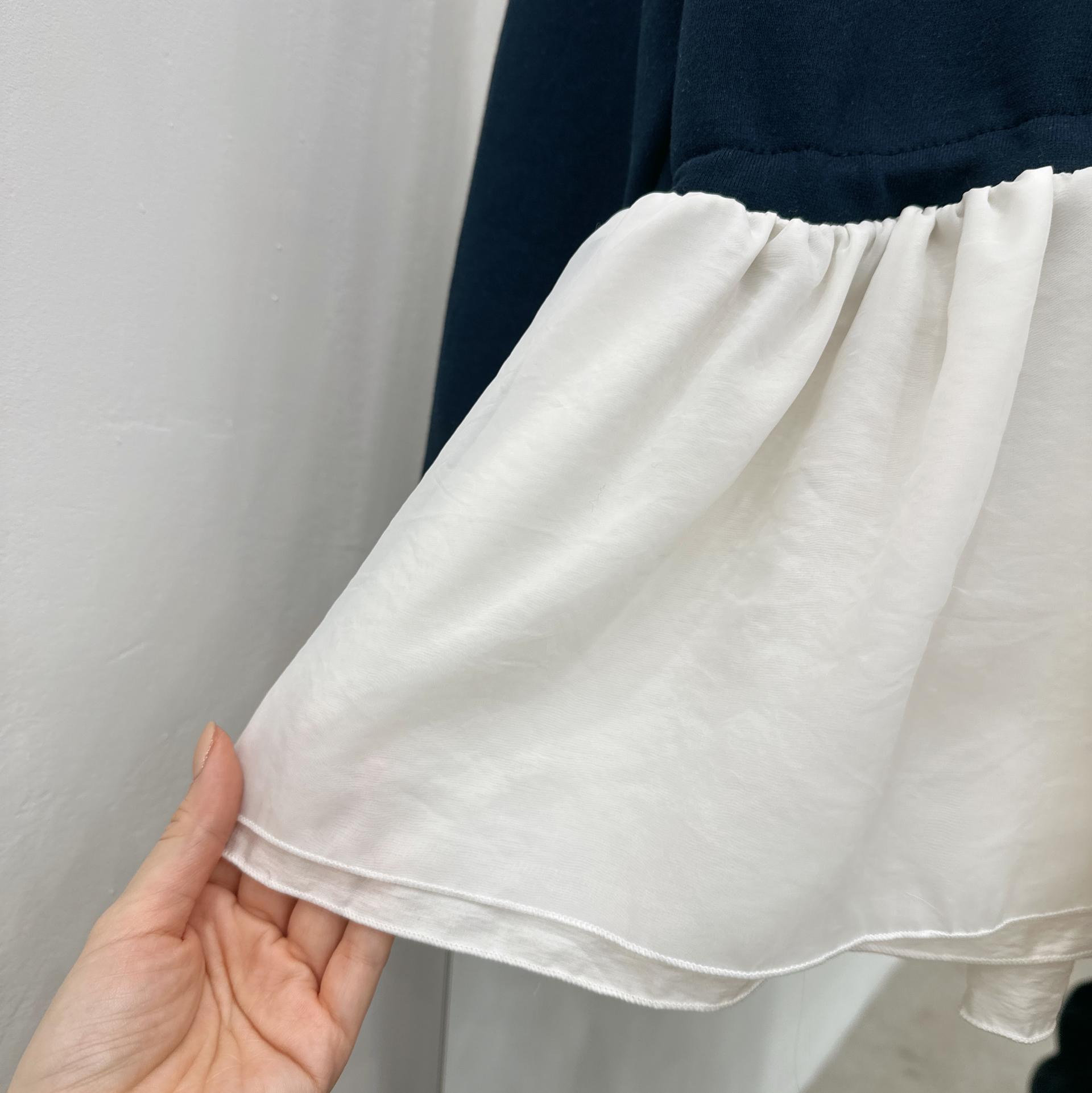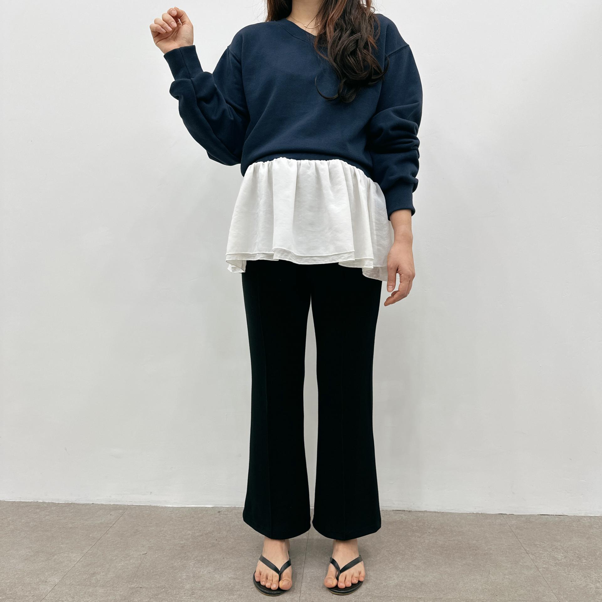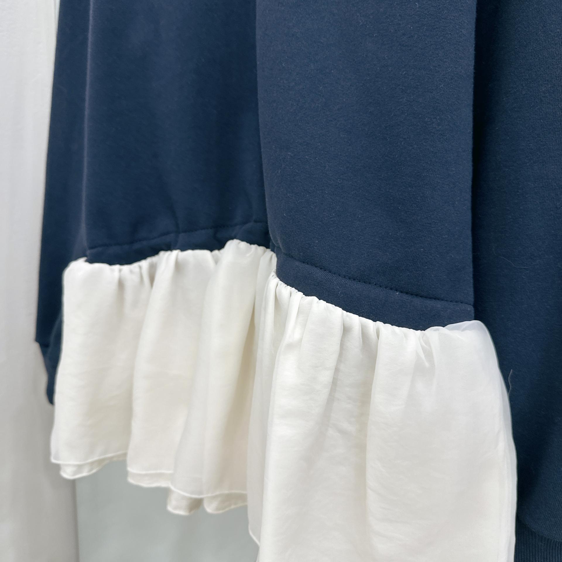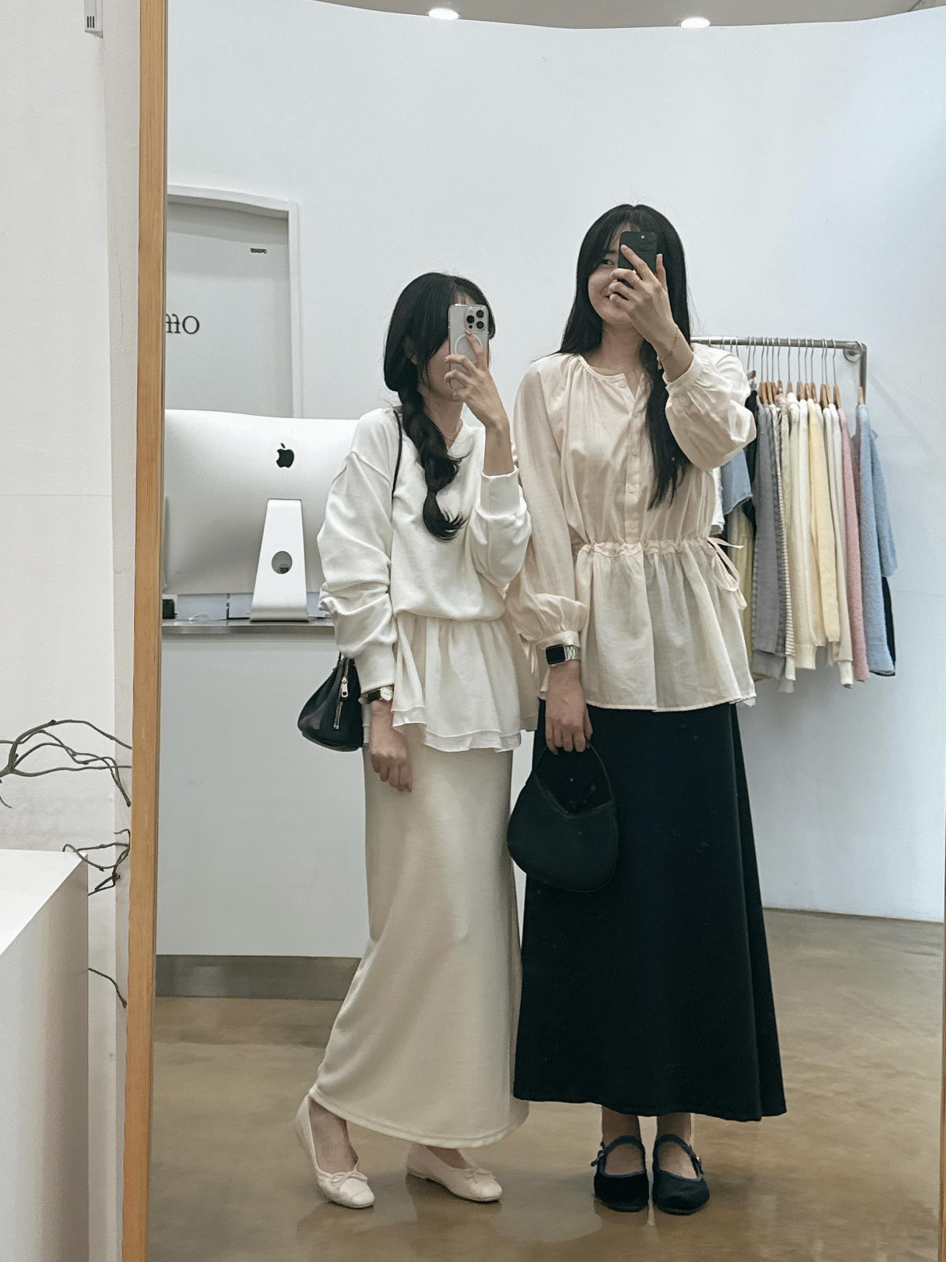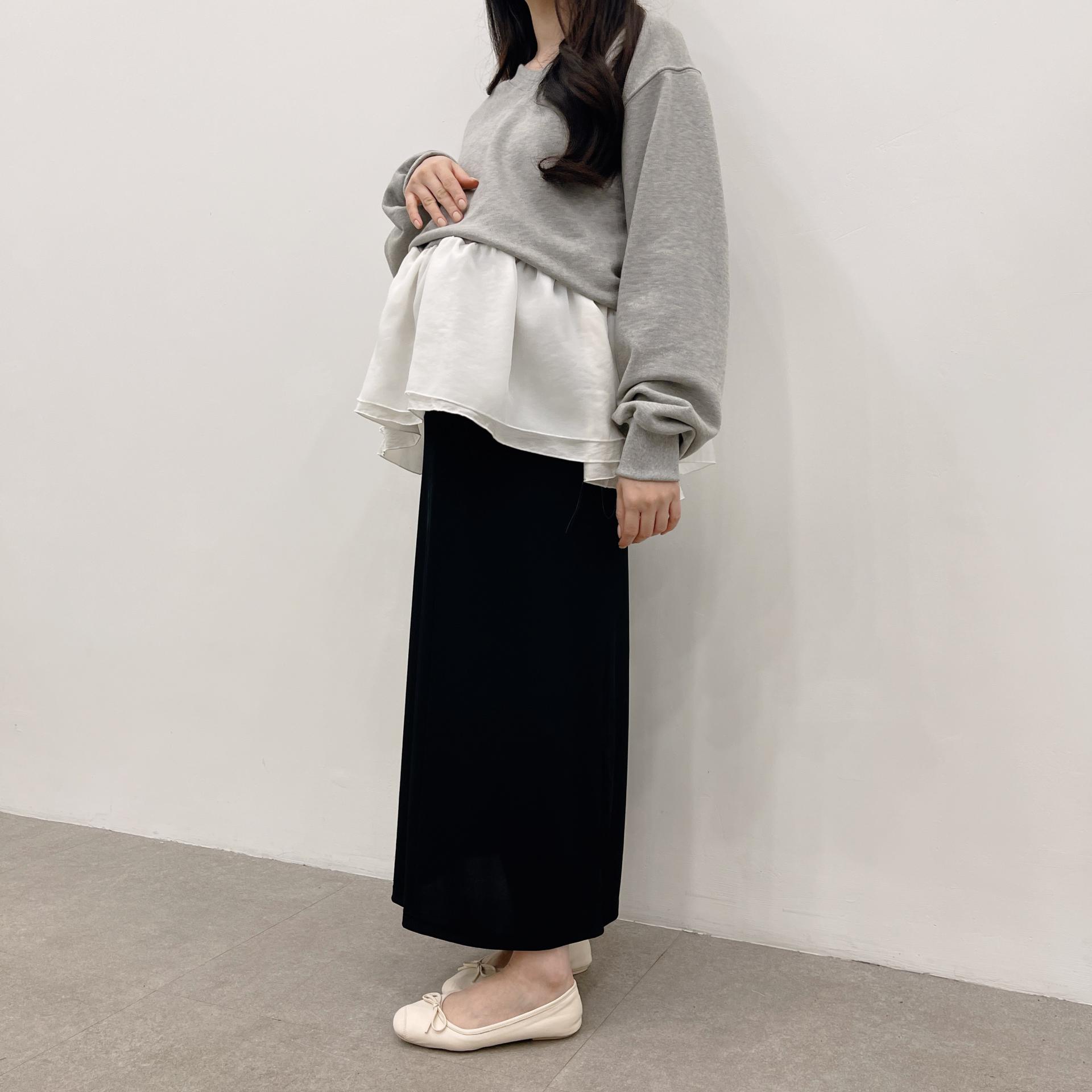 밑단 쉬폰레이어드가 일체형인 브이넥 맨투맨이에요 안쪽에 허리스트링이 있어서 핏이 너무예쁘게 잡힌답니다!!