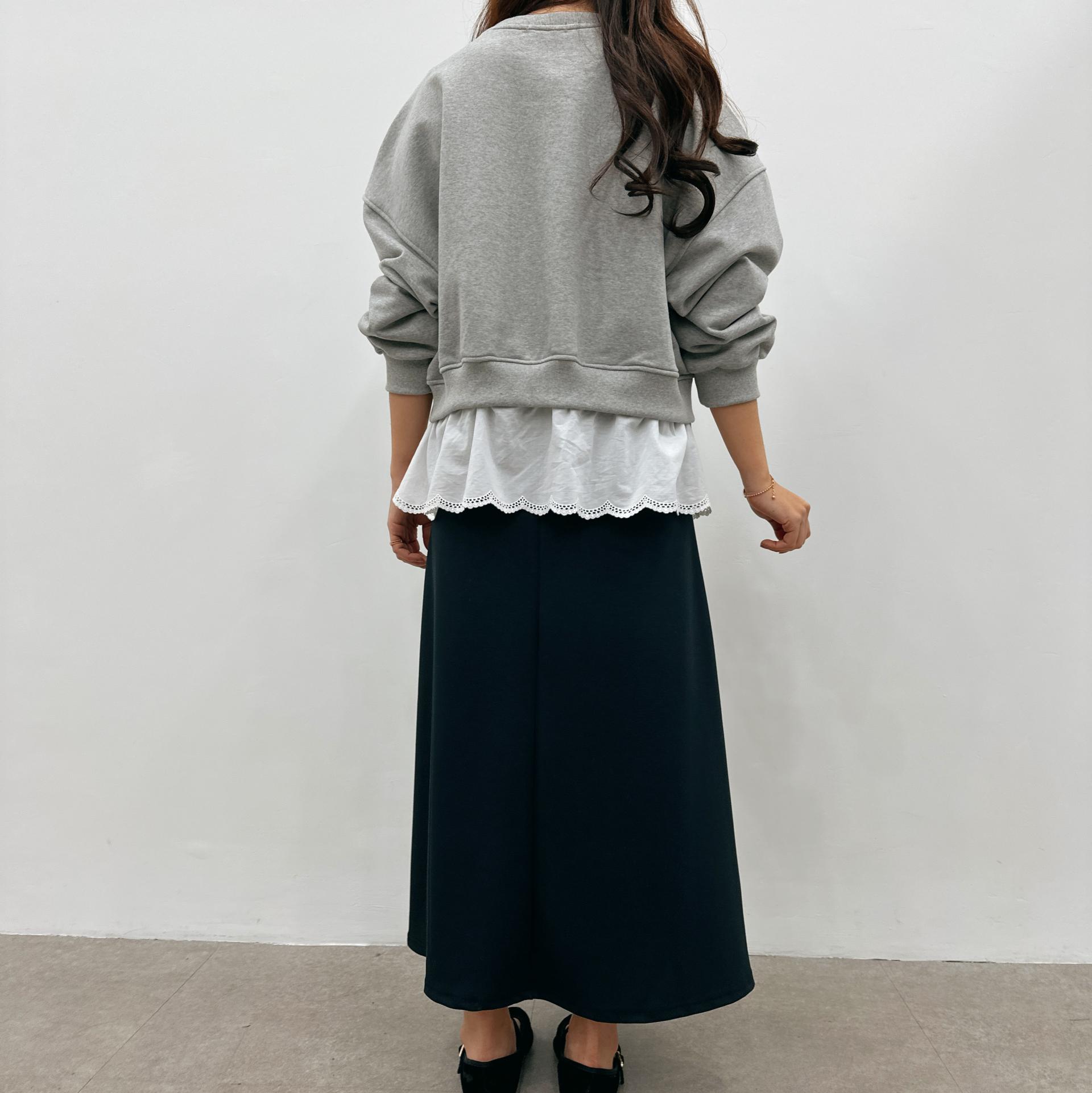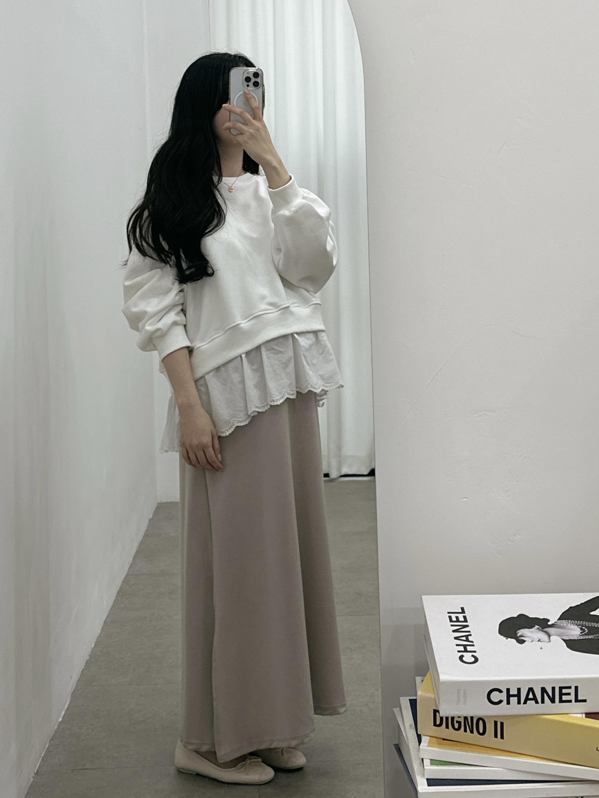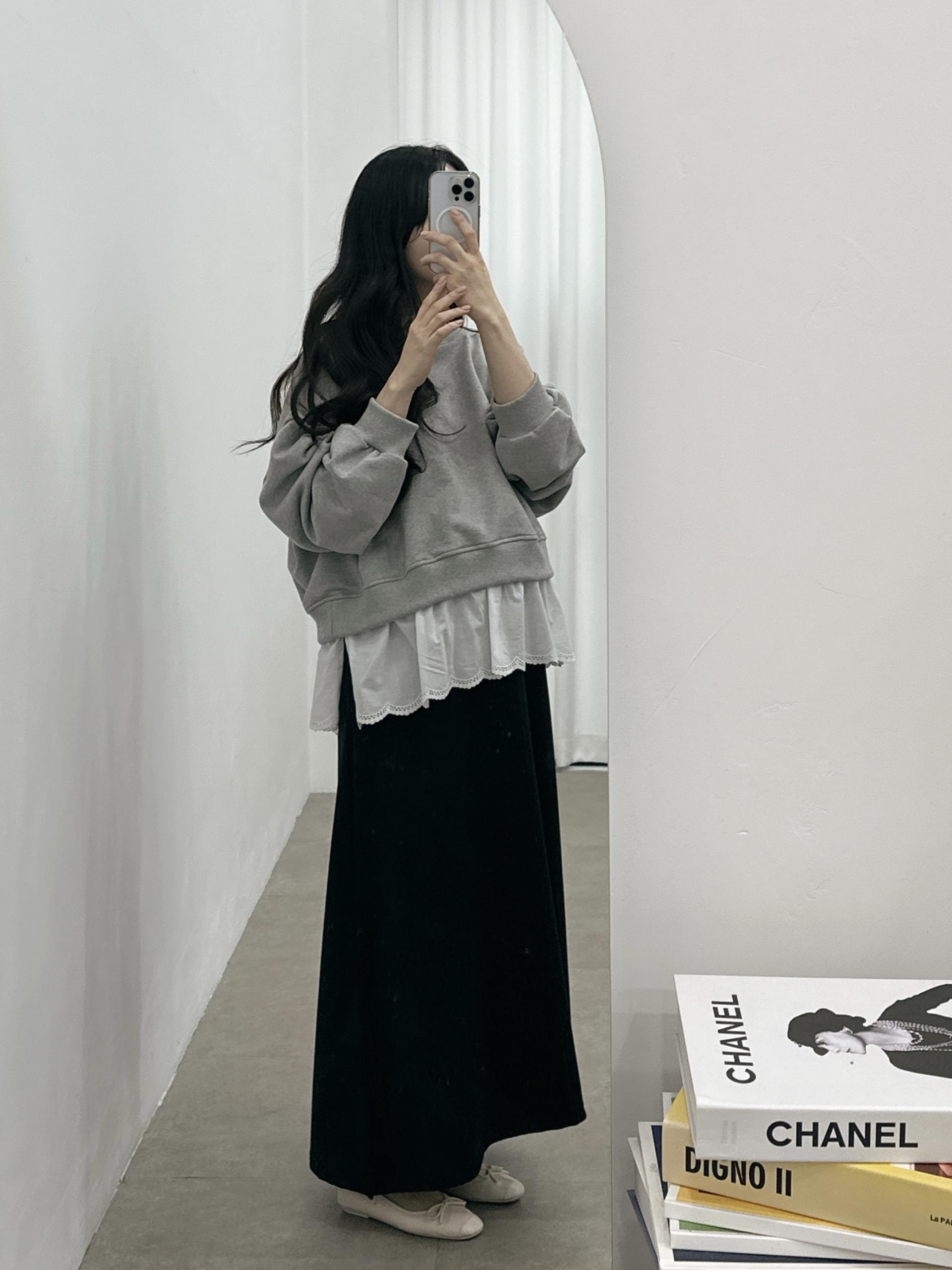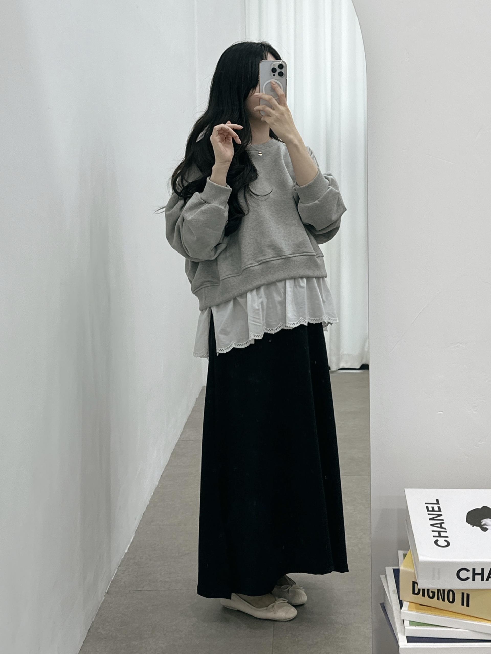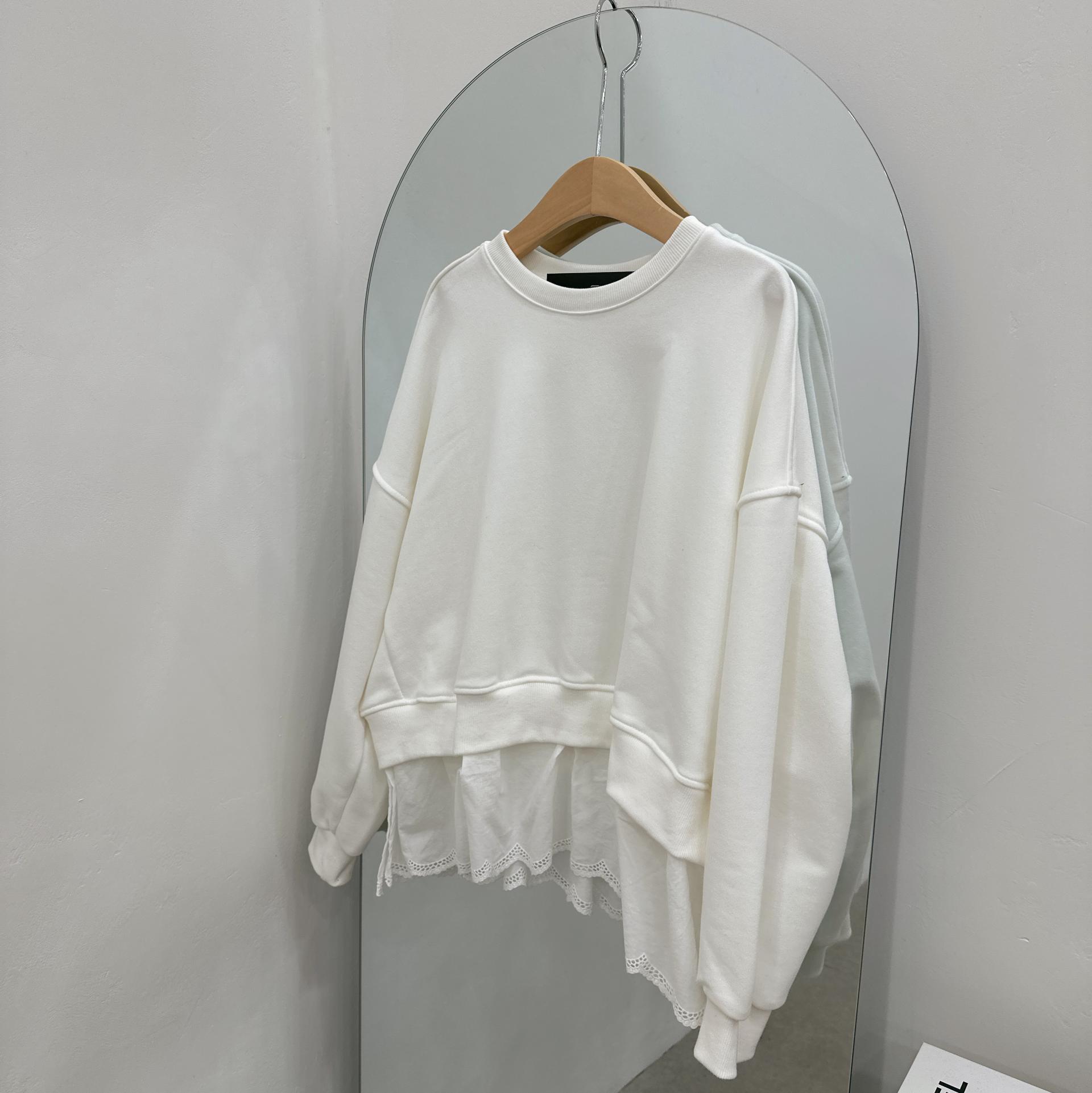 밑단 레이스레이어드가 붙어있는! 맨투맨입니다 러블리하면서 오버된 어꺠라인과 핏이 세련되고 편하게 만들어줘요:)
