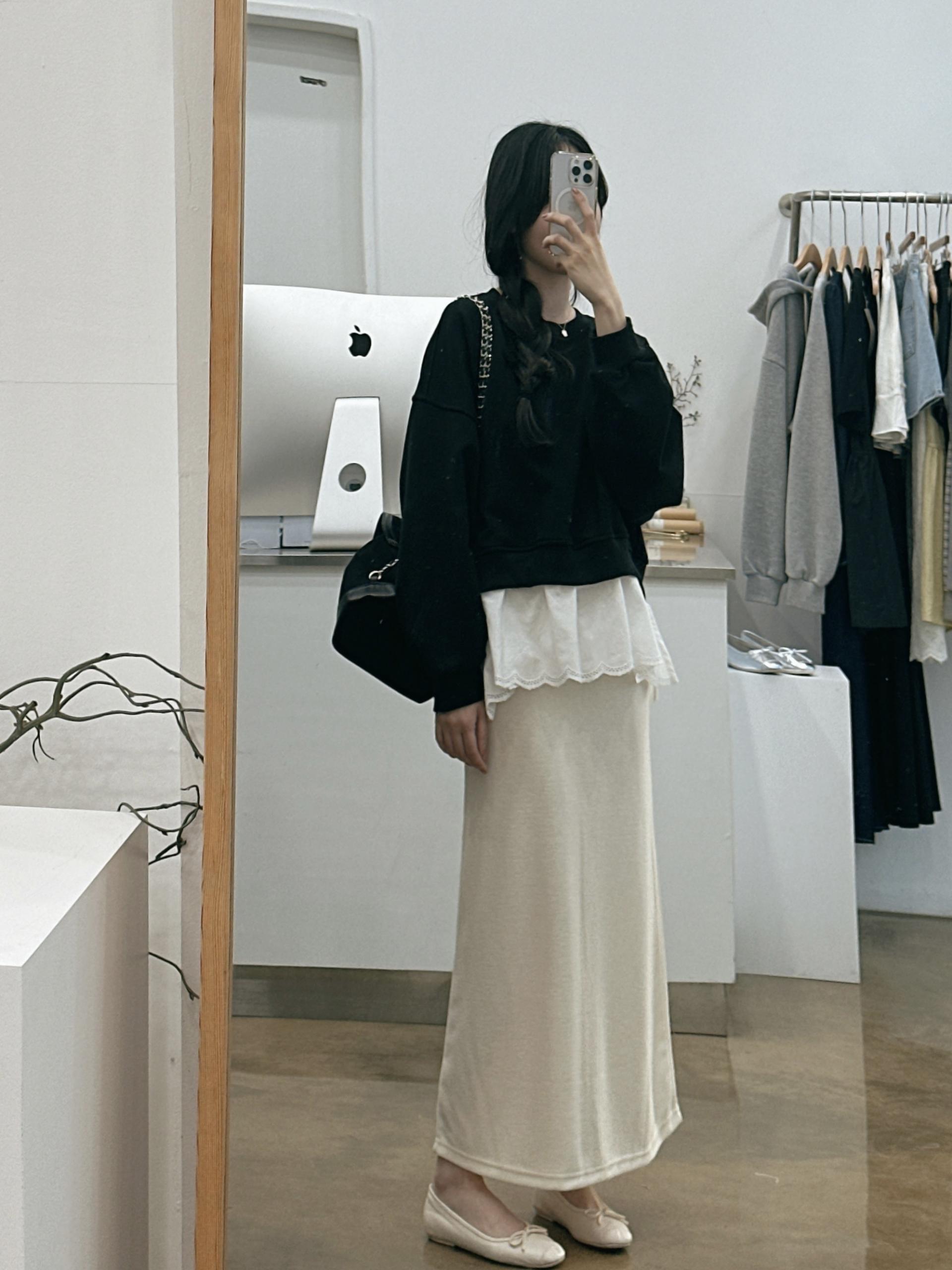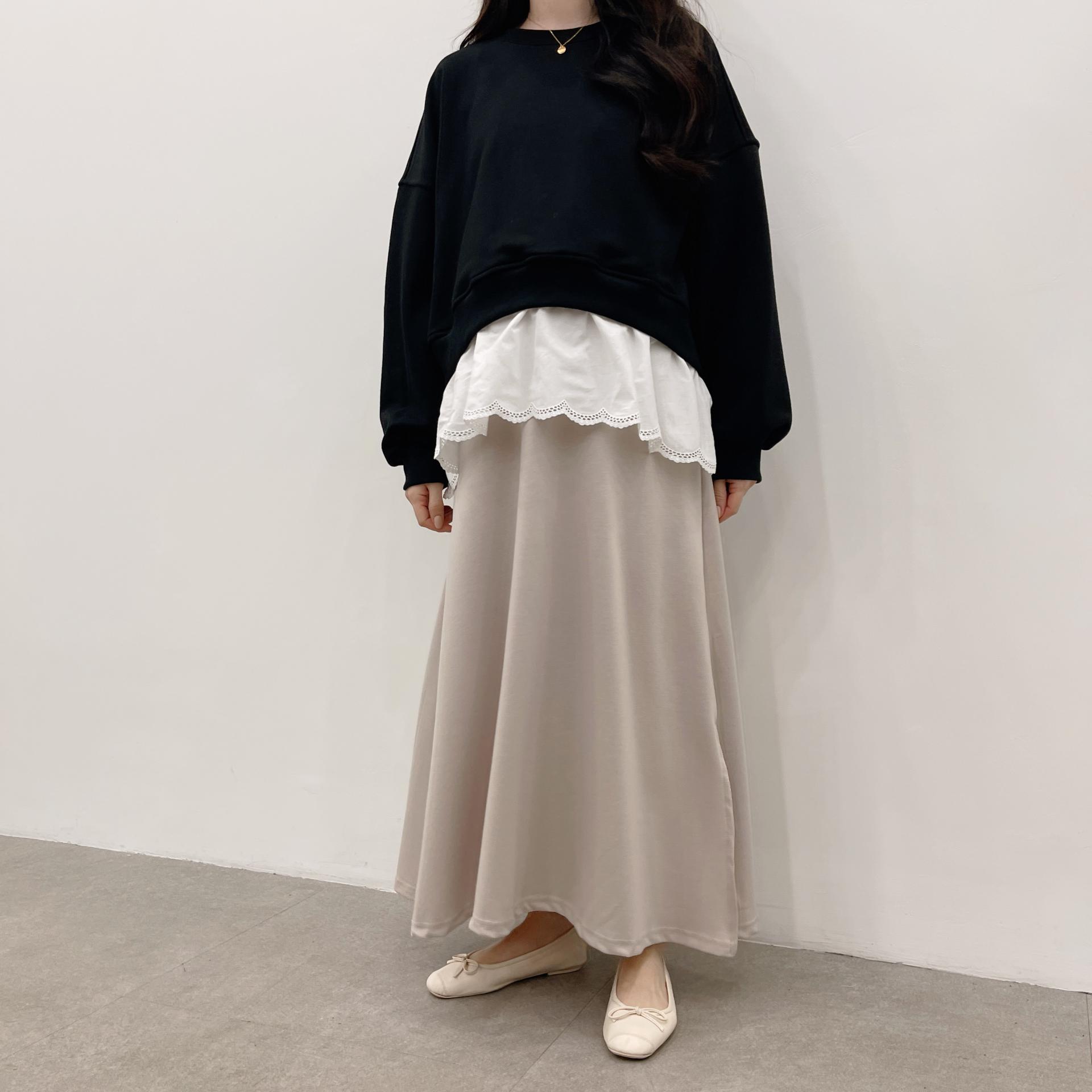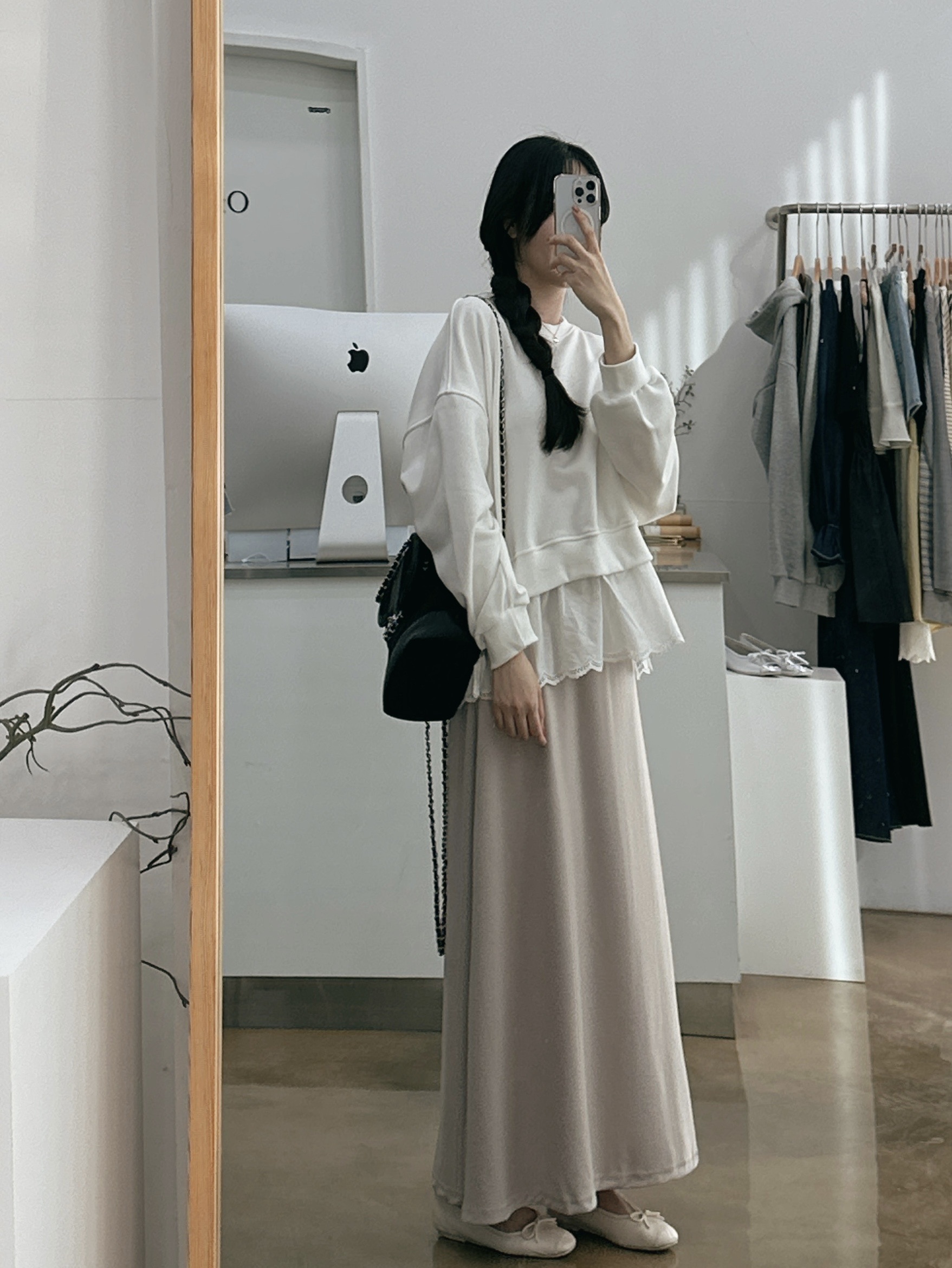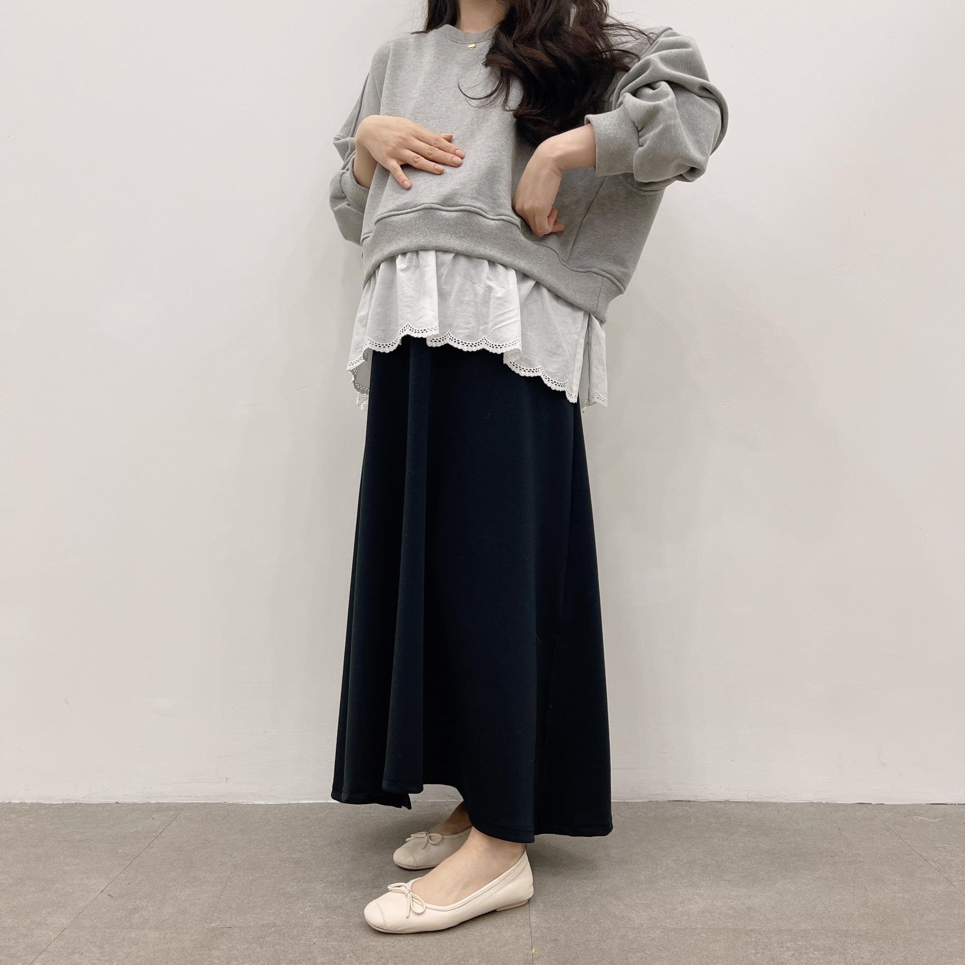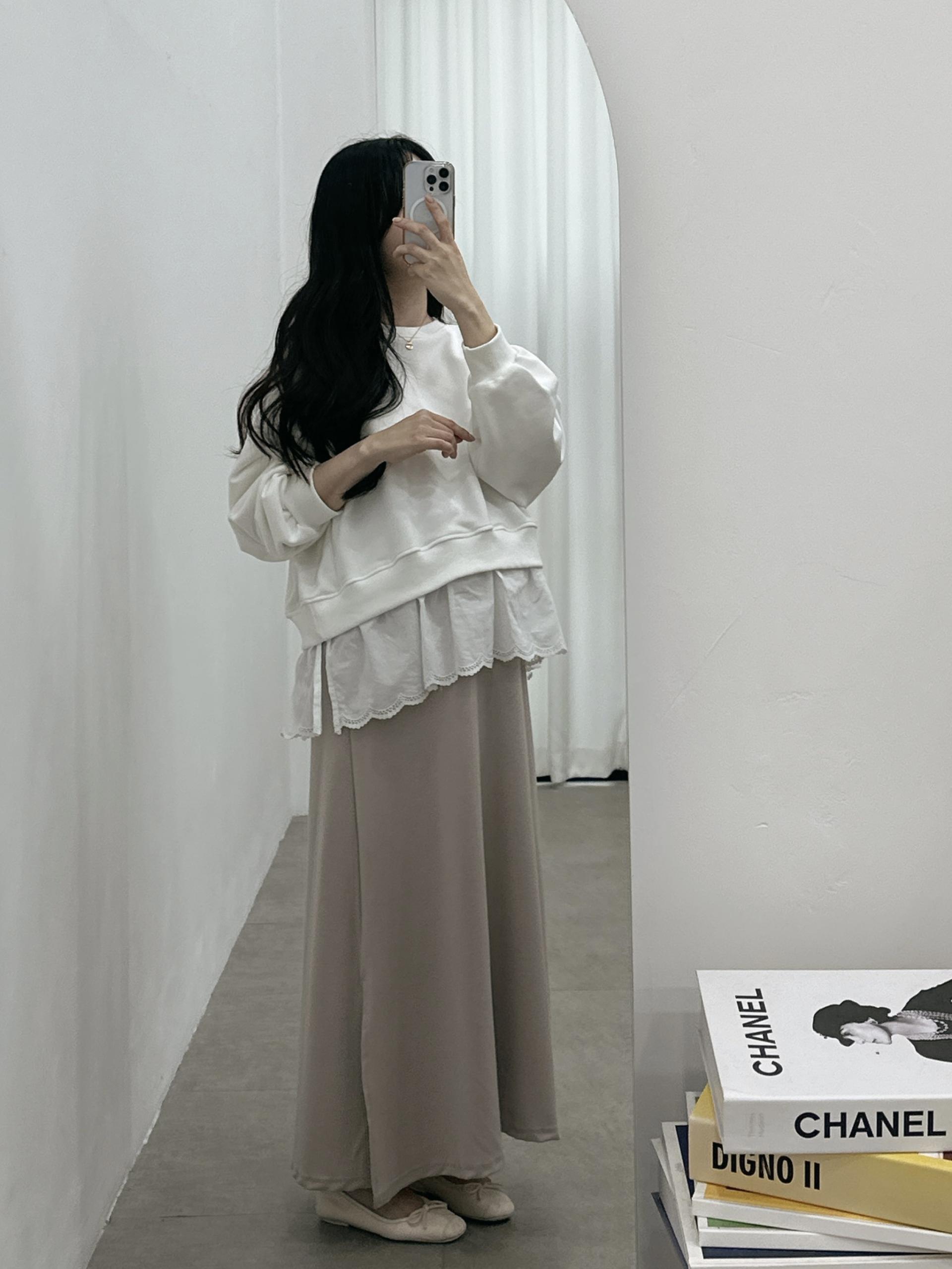 밑단 레이스레이어드가 붙어있는! 맨투맨입니다 러블리하면서 오버된 어꺠라인과 핏이 세련되고 편하게 만들어줘요:)