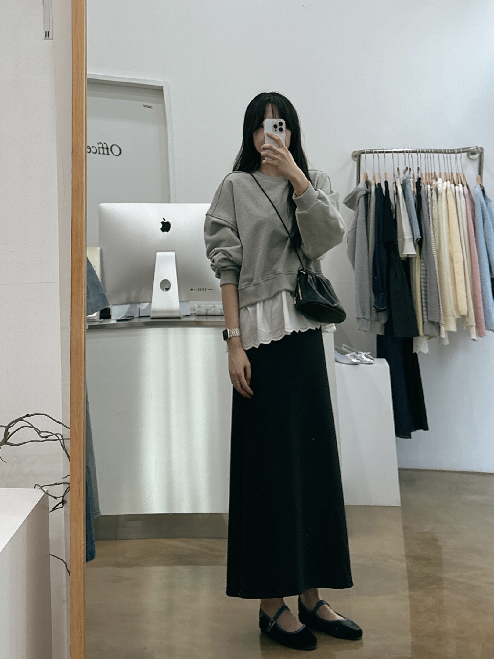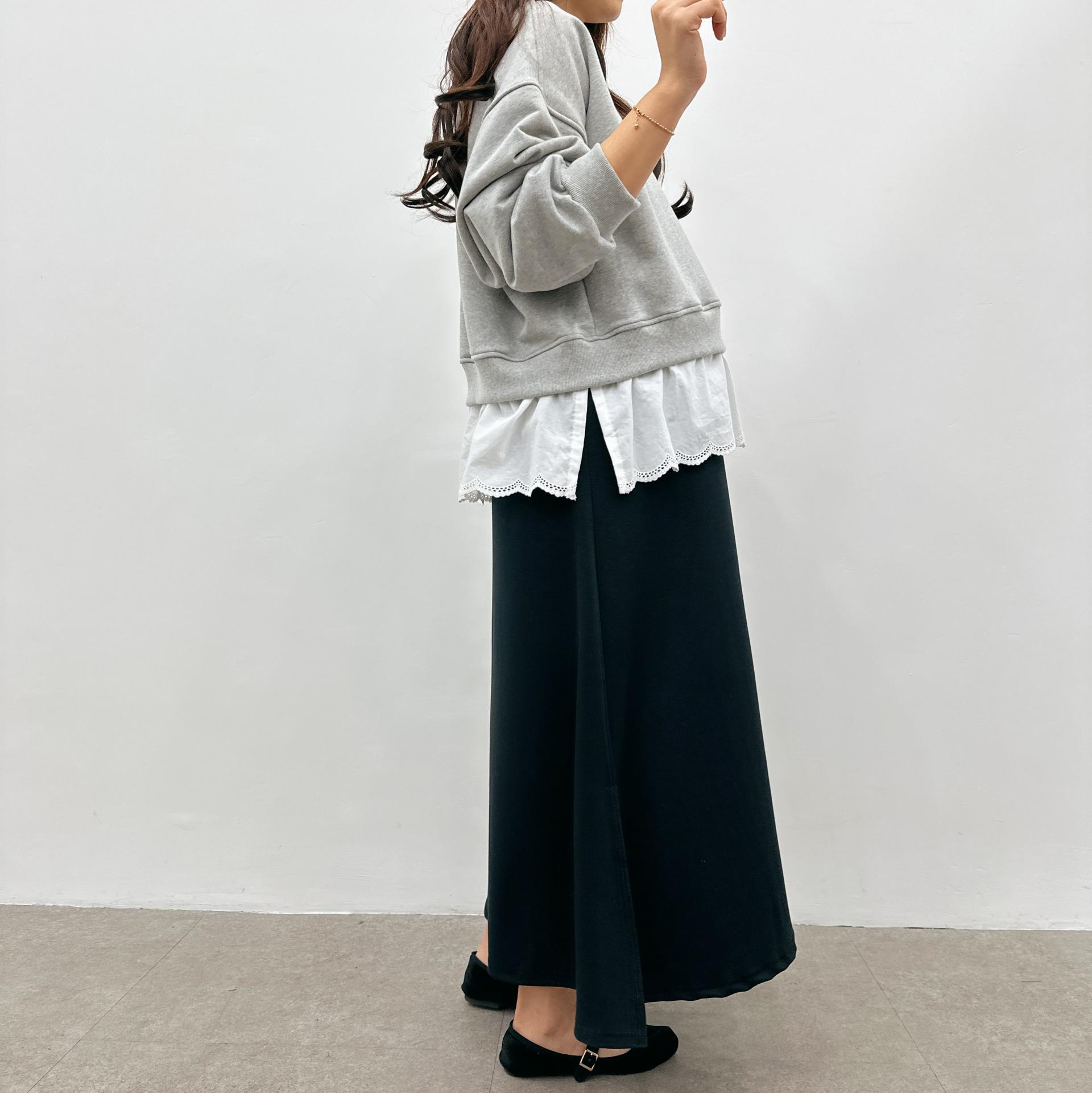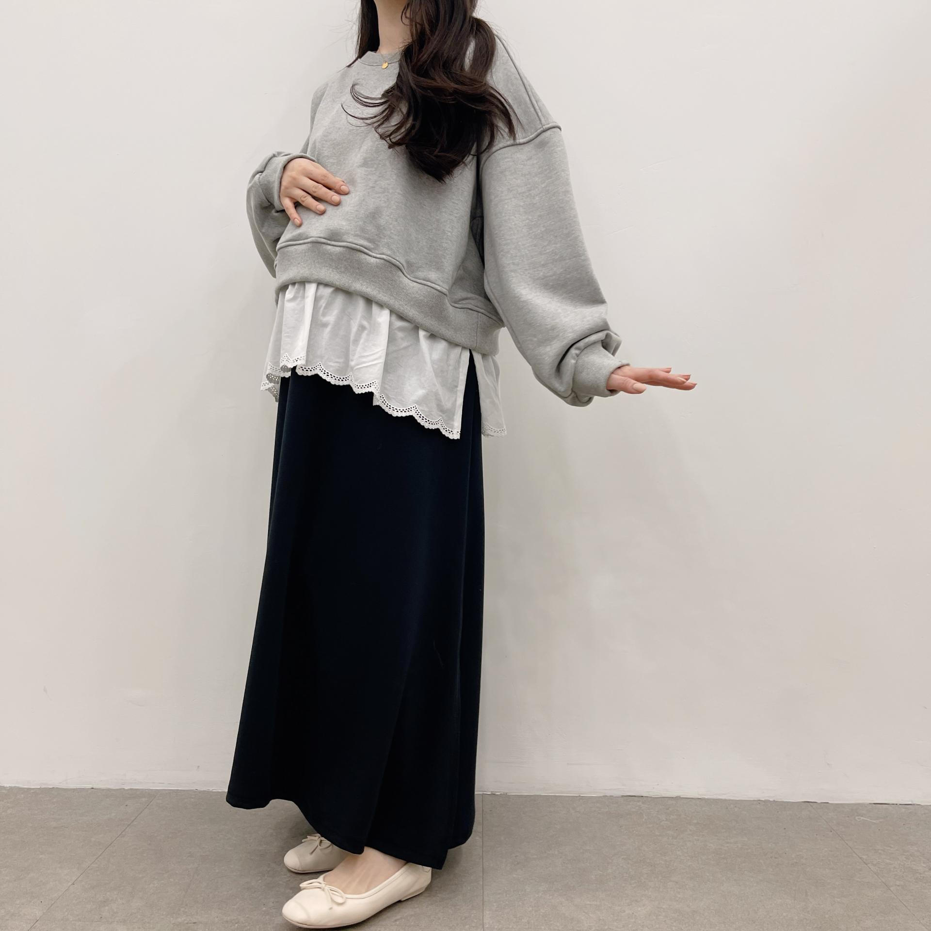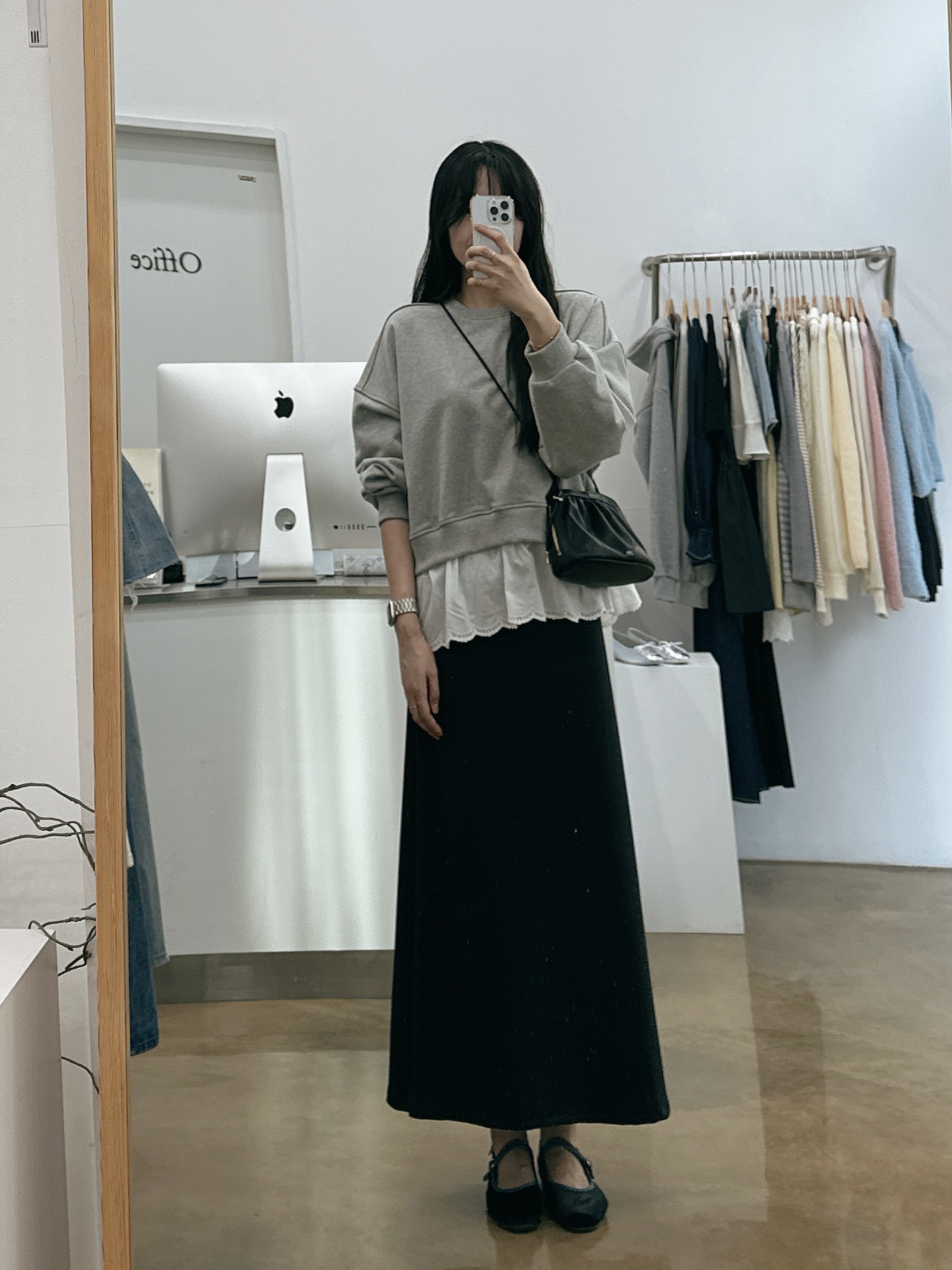 밑단 레이스레이어드가 붙어있는! 맨투맨입니다 러블리하면서 오버된 어꺠라인과 핏이 세련되고 편하게 만들어줘요:)