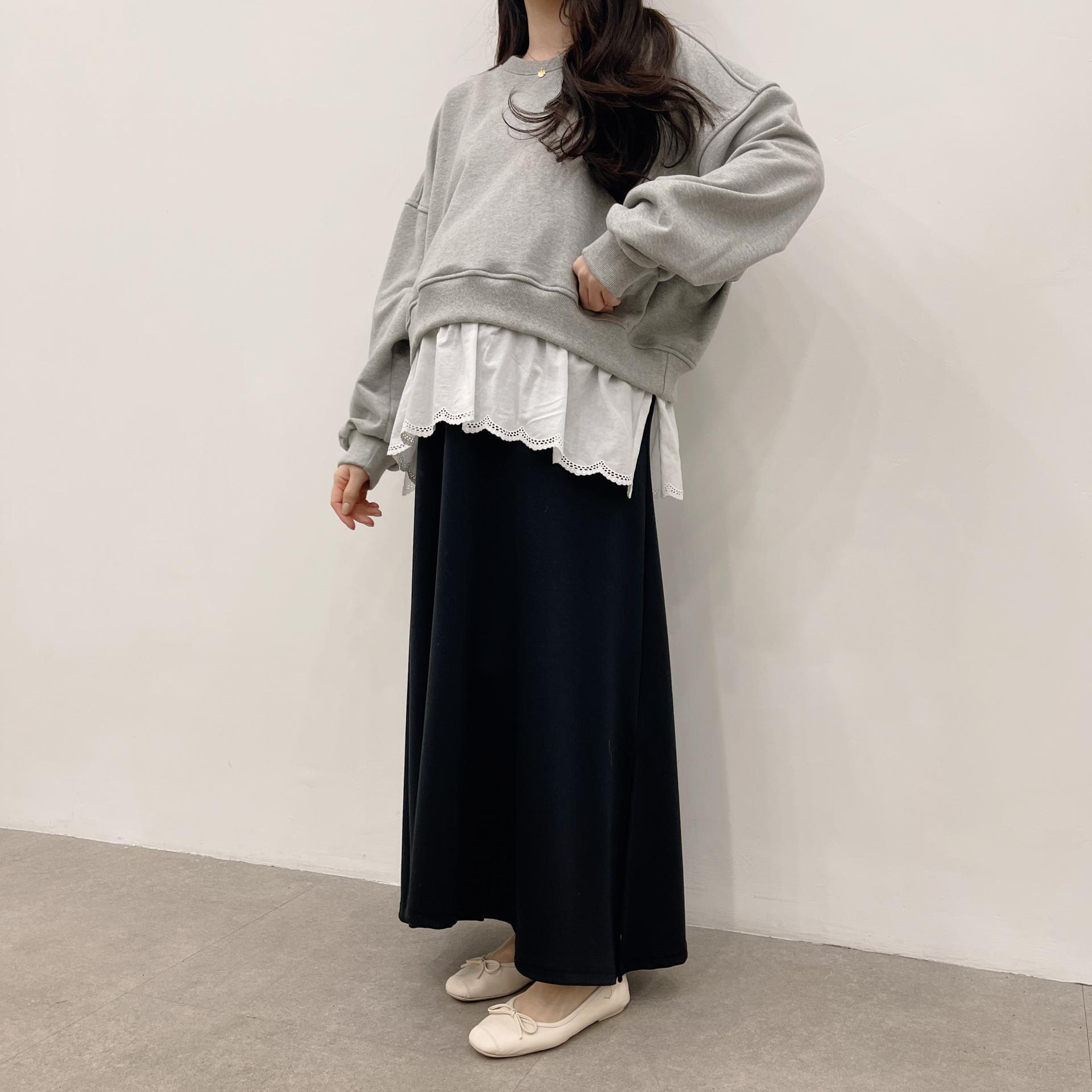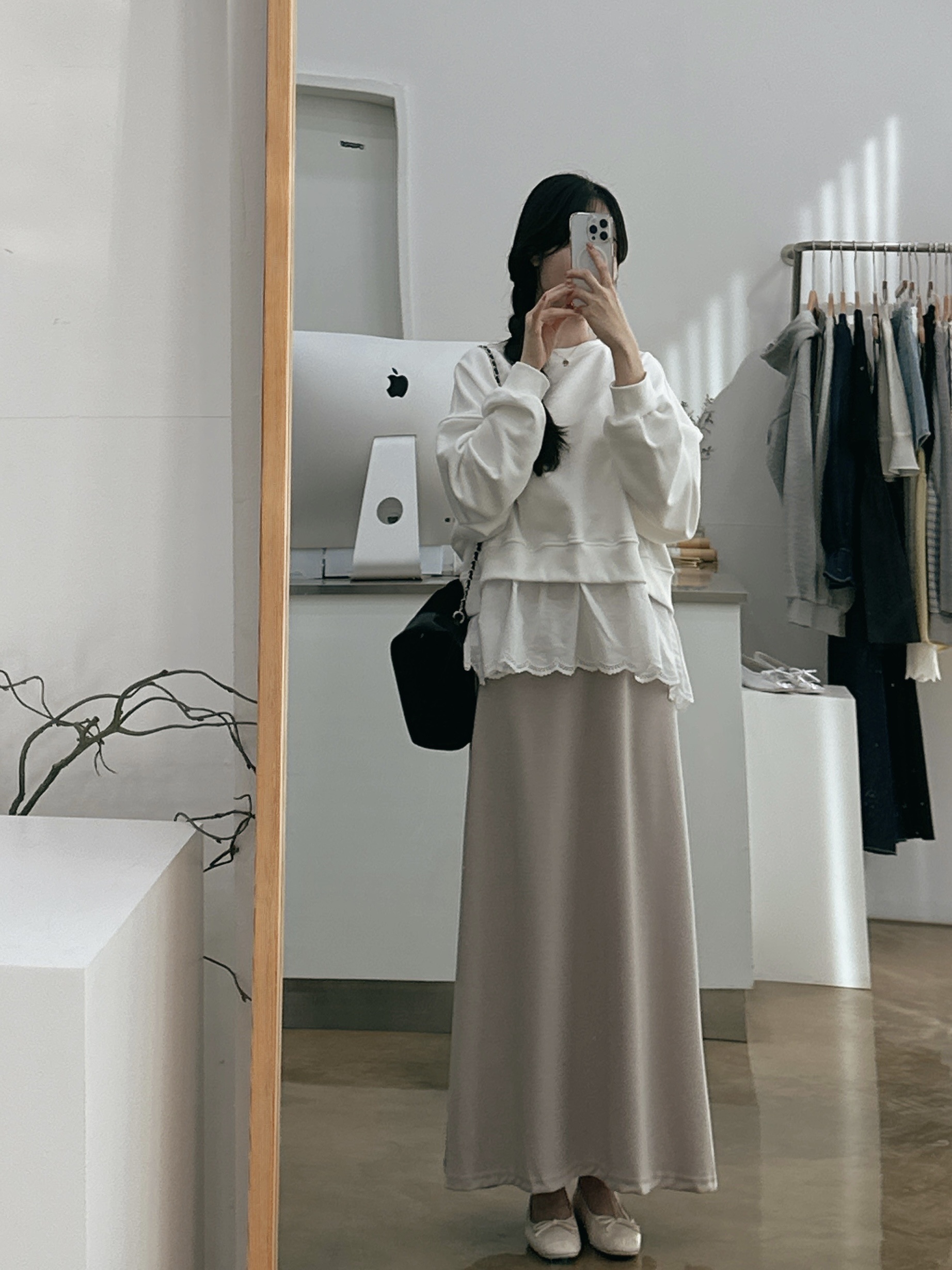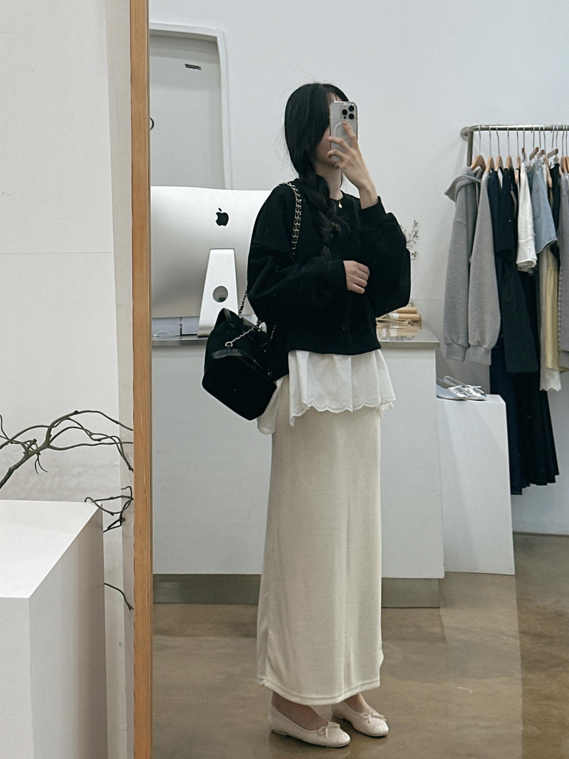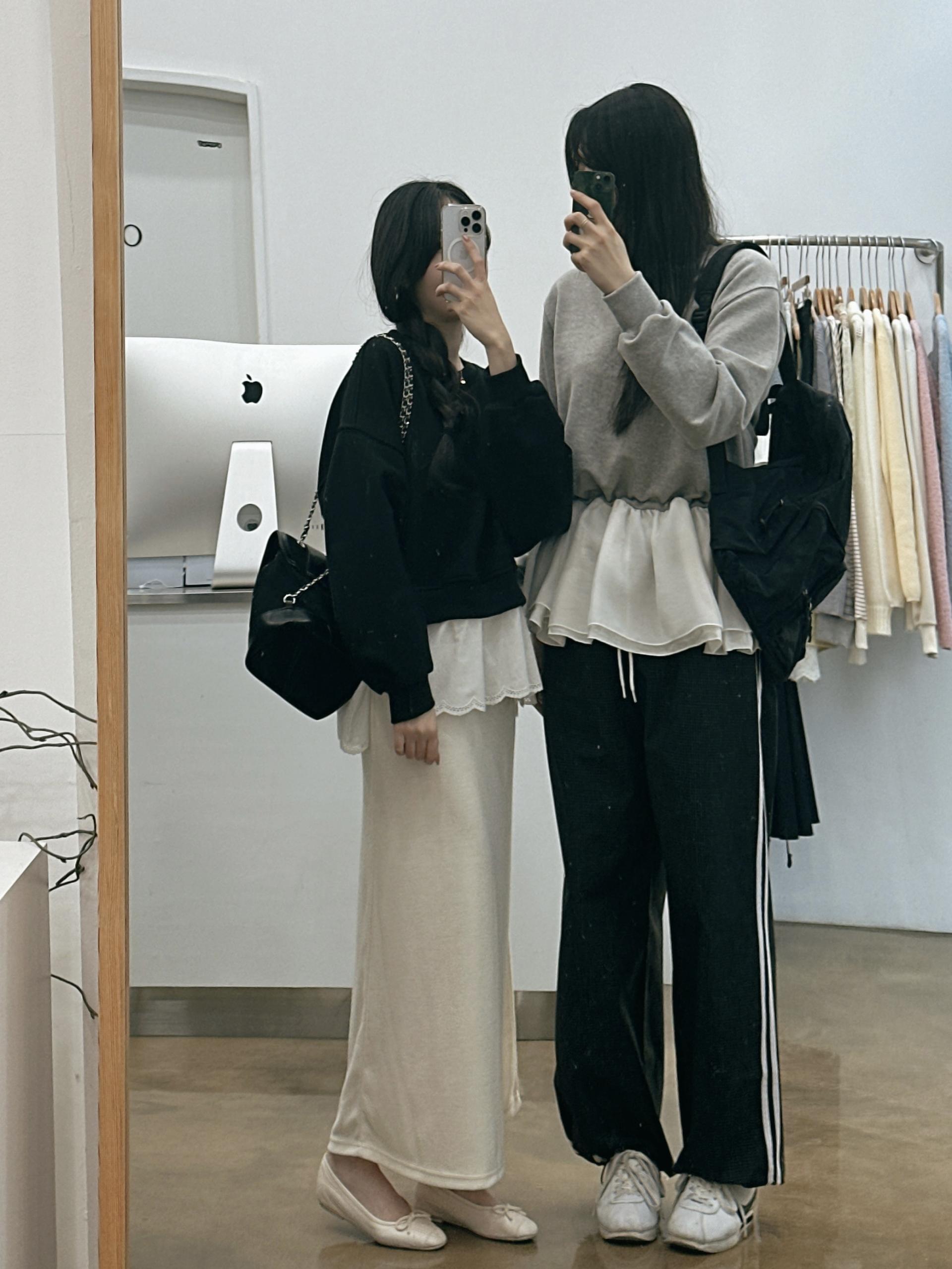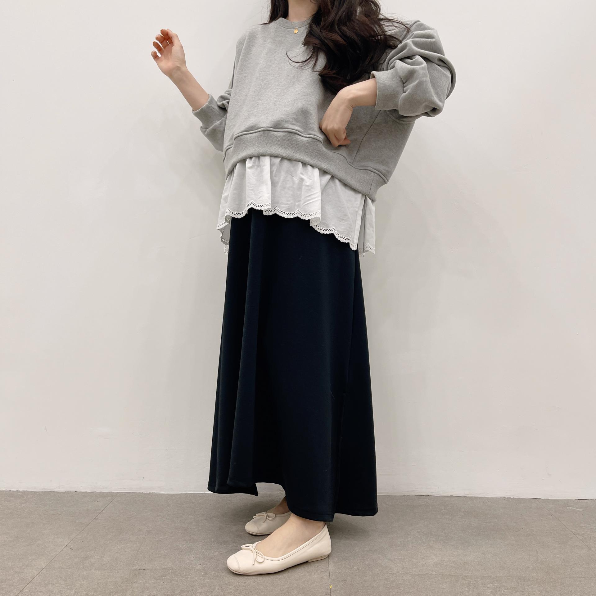 밑단 레이스레이어드가 붙어있는! 맨투맨입니다 러블리하면서 오버된 어꺠라인과 핏이 세련되고 편하게 만들어줘요:)