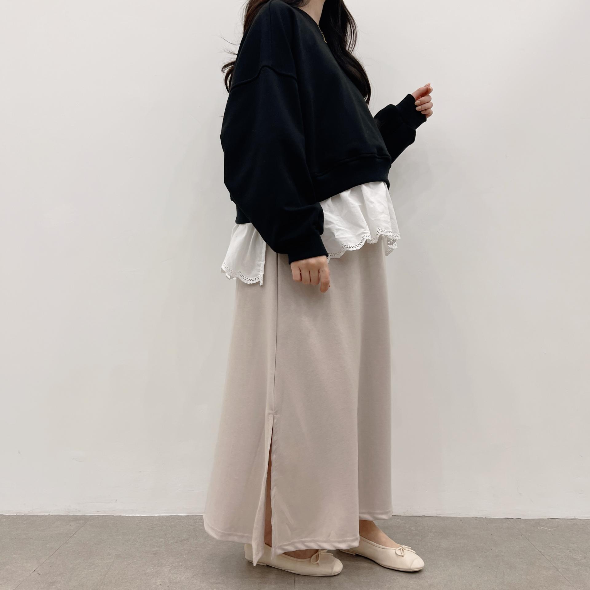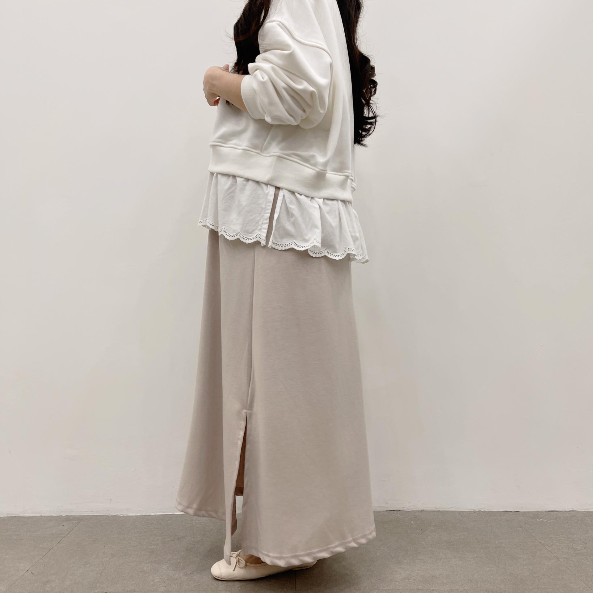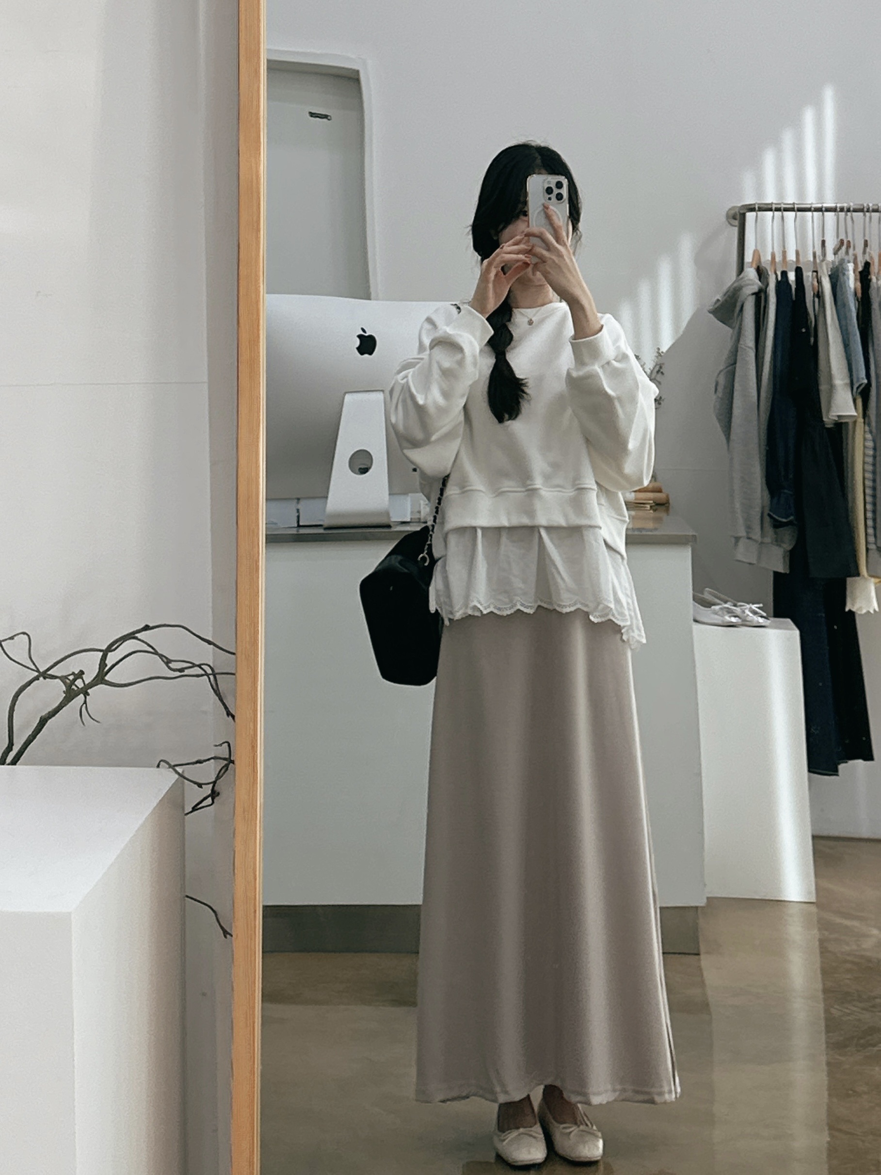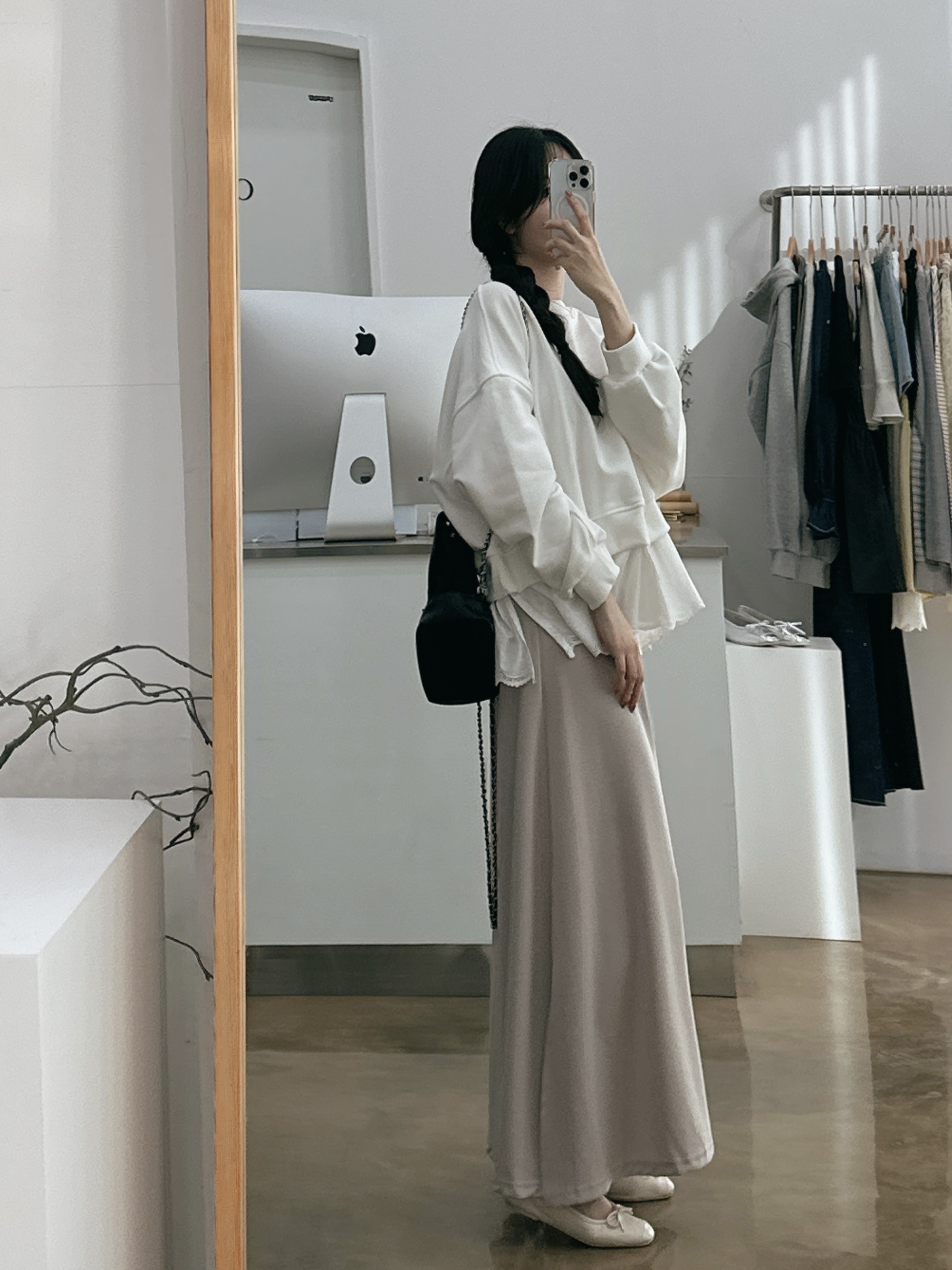 밑단 레이스레이어드가 붙어있는! 맨투맨입니다 러블리하면서 오버된 어꺠라인과 핏이 세련되고 편하게 만들어줘요:)