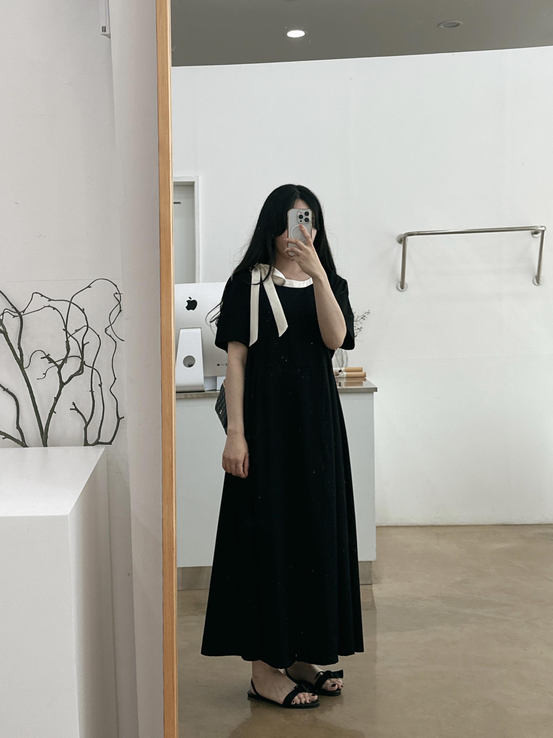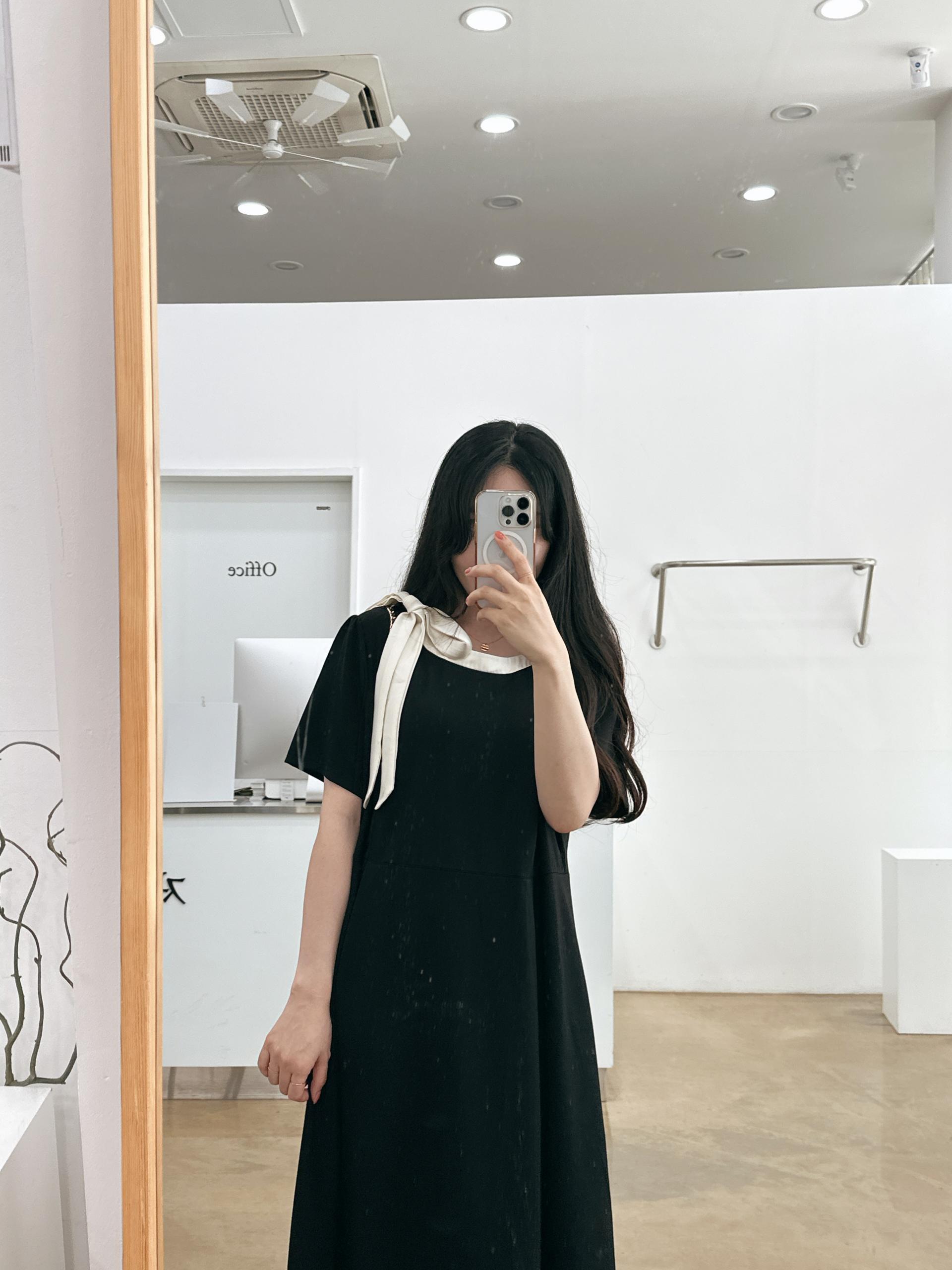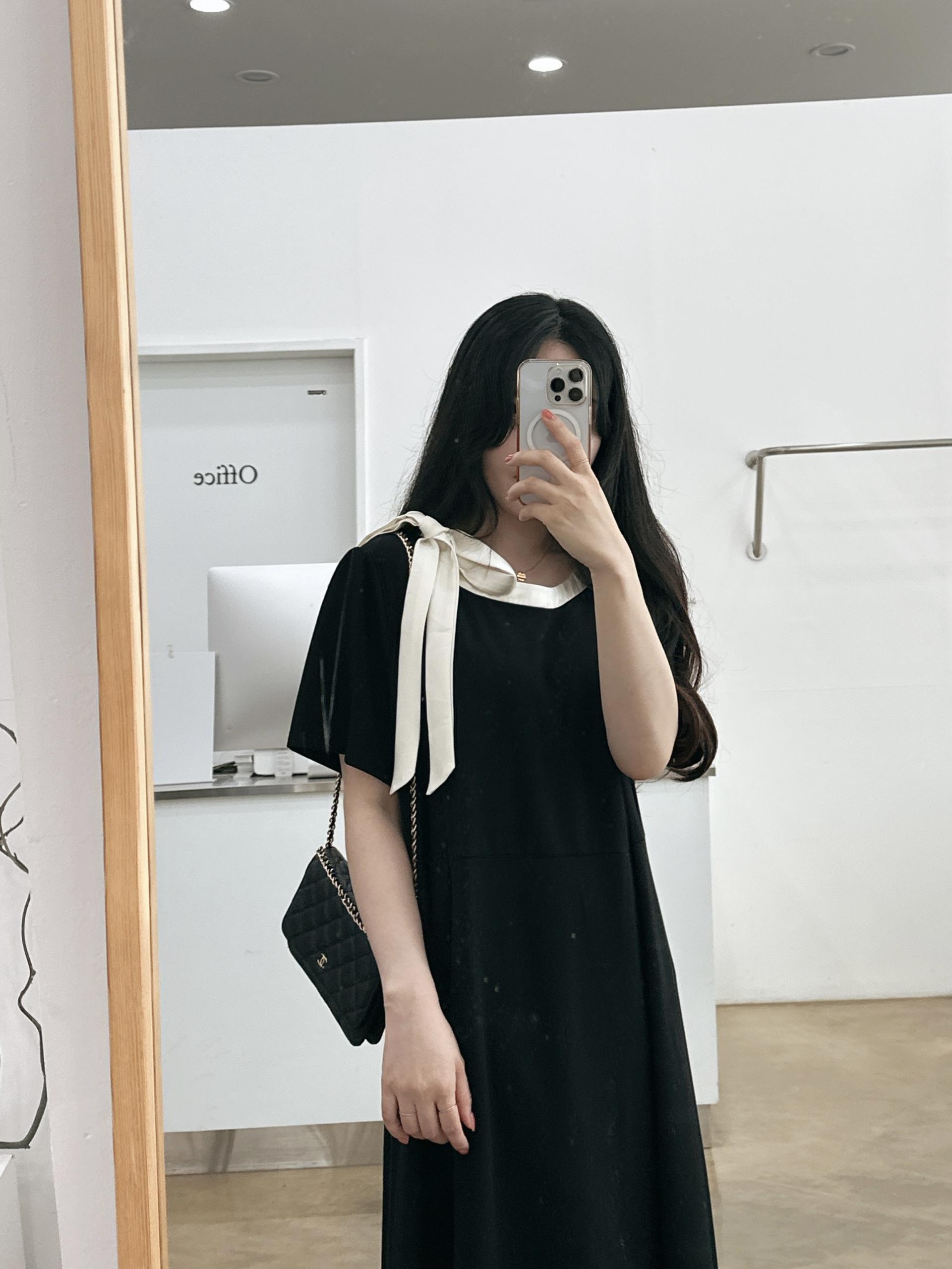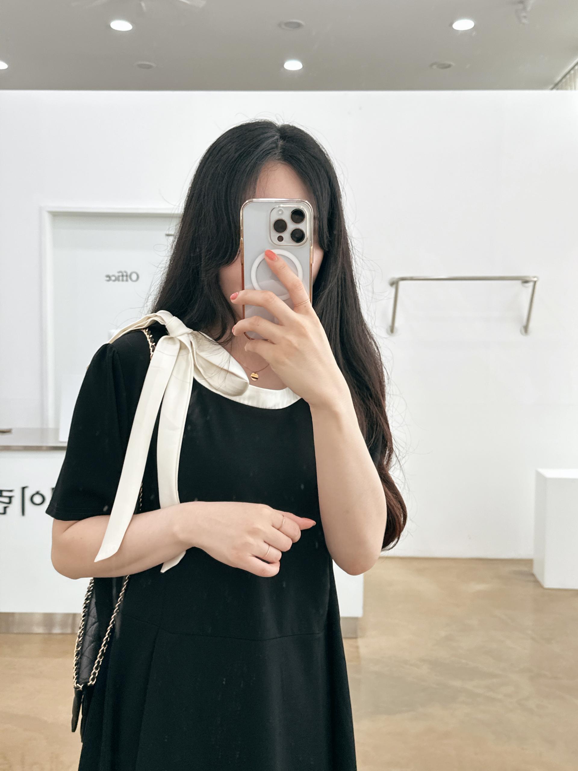 단정하고 고급스러운 핏, 구김없이 찰랑찰랑 원단 미쳤구요 옆 리본 간단하게 묶어주시면 세젤예핏완성입니다:)