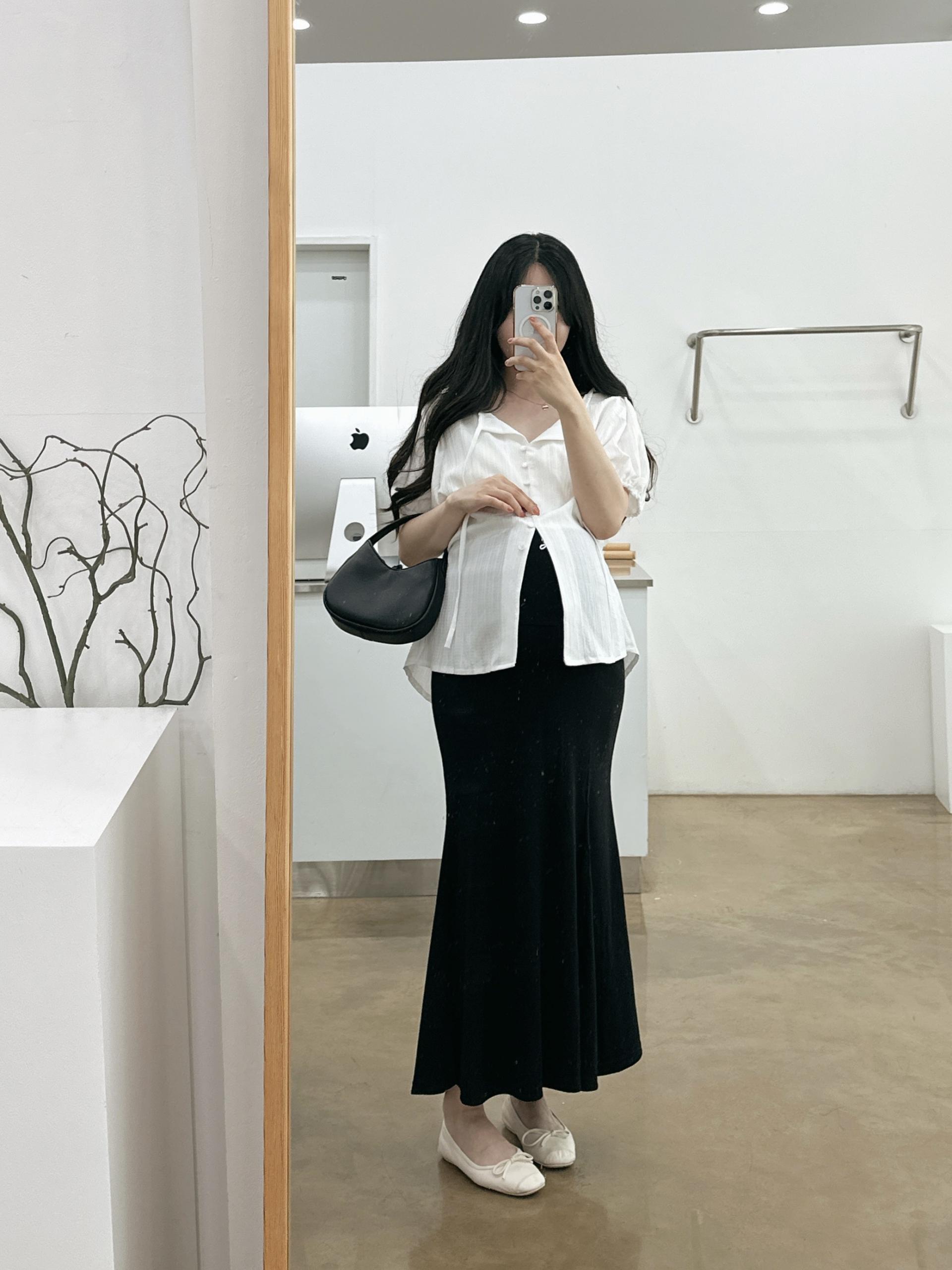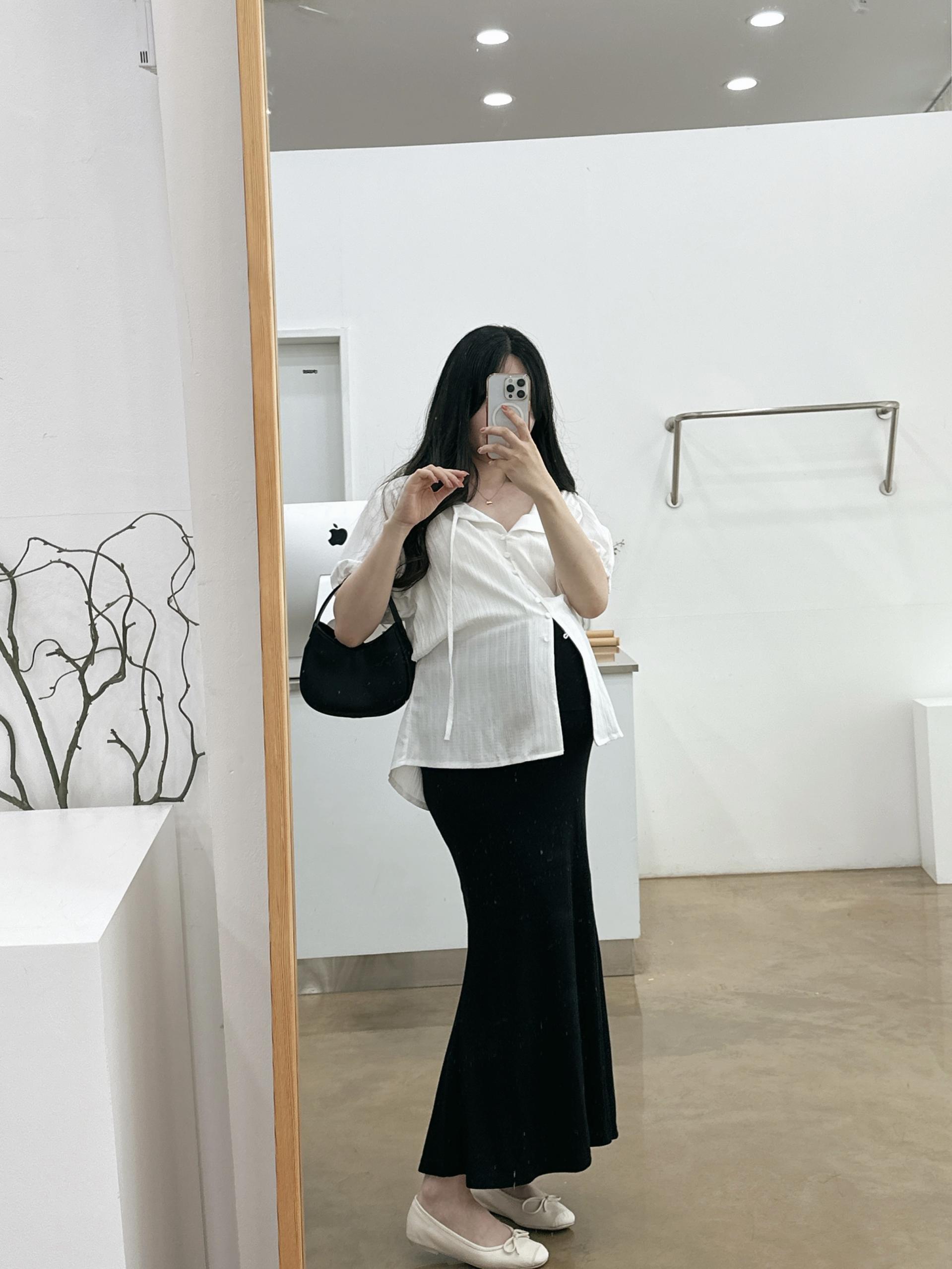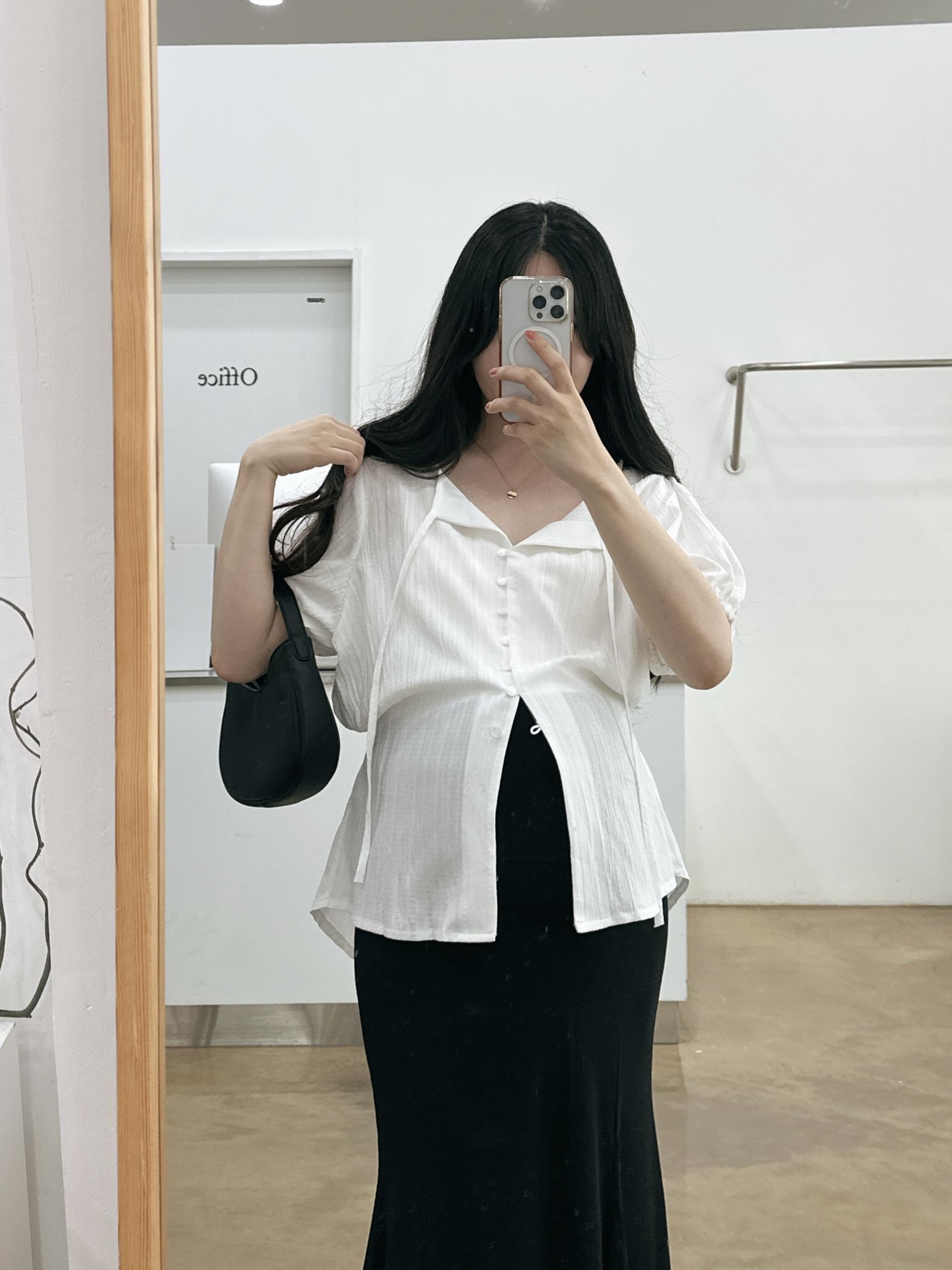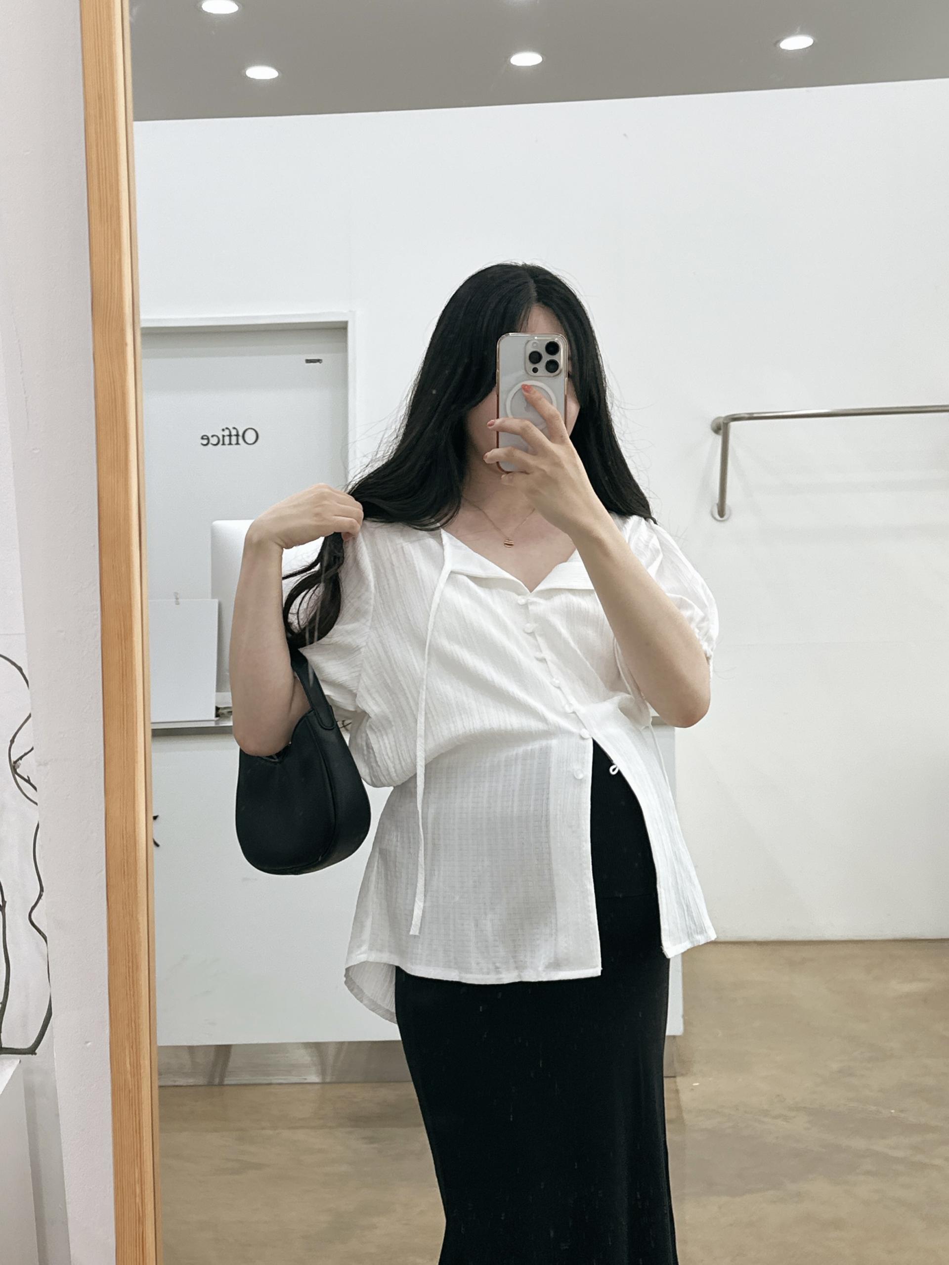 부드러운콩단추라 잠그고 풀고 편하답니다:) 옆 끈으로 뒤로 살짝 묶어주시면 세상날씬한예쁜핏 D라인부터 출산후까지 완벽하게 입으실 수 있는 블라우스입니다!