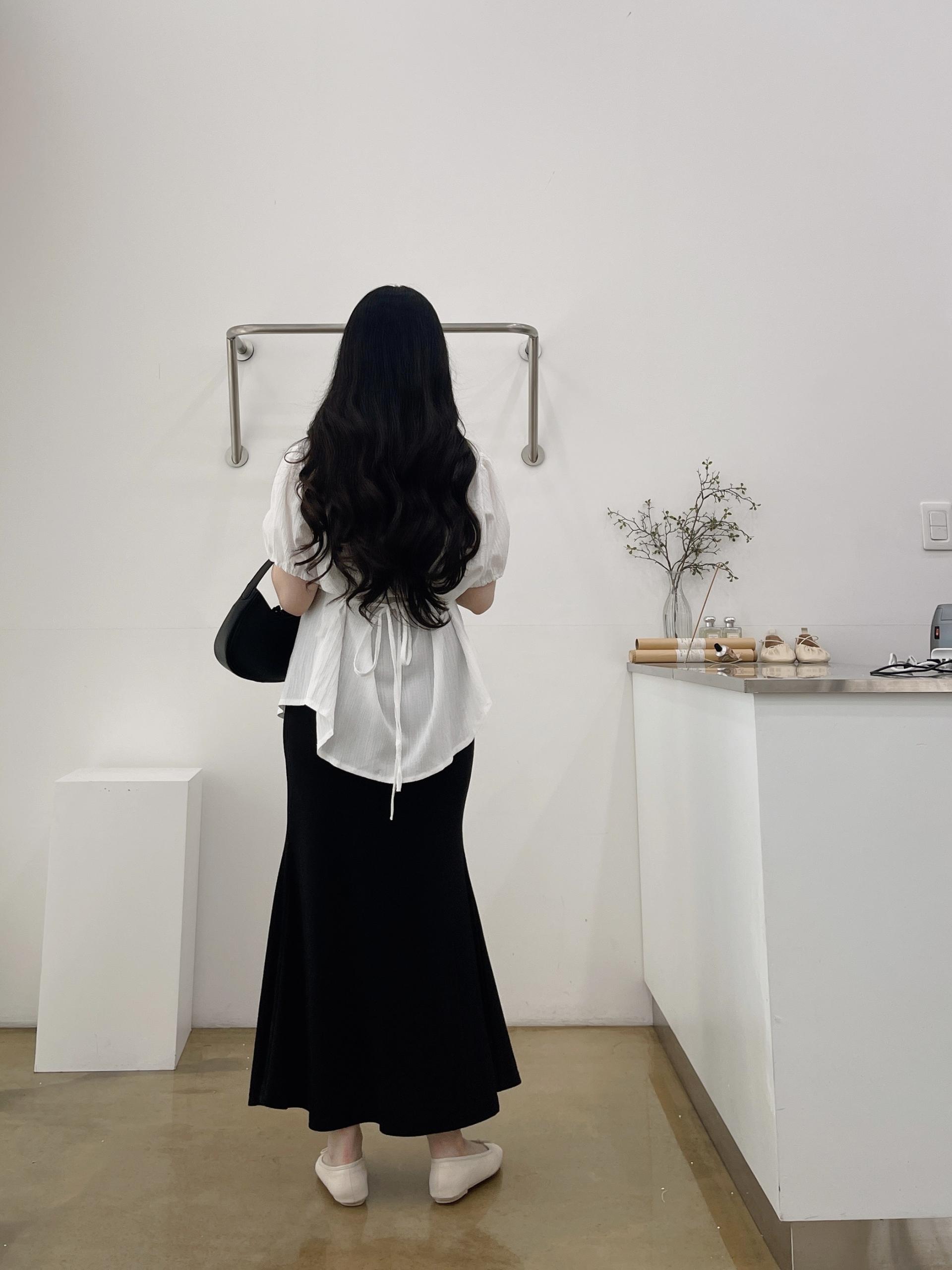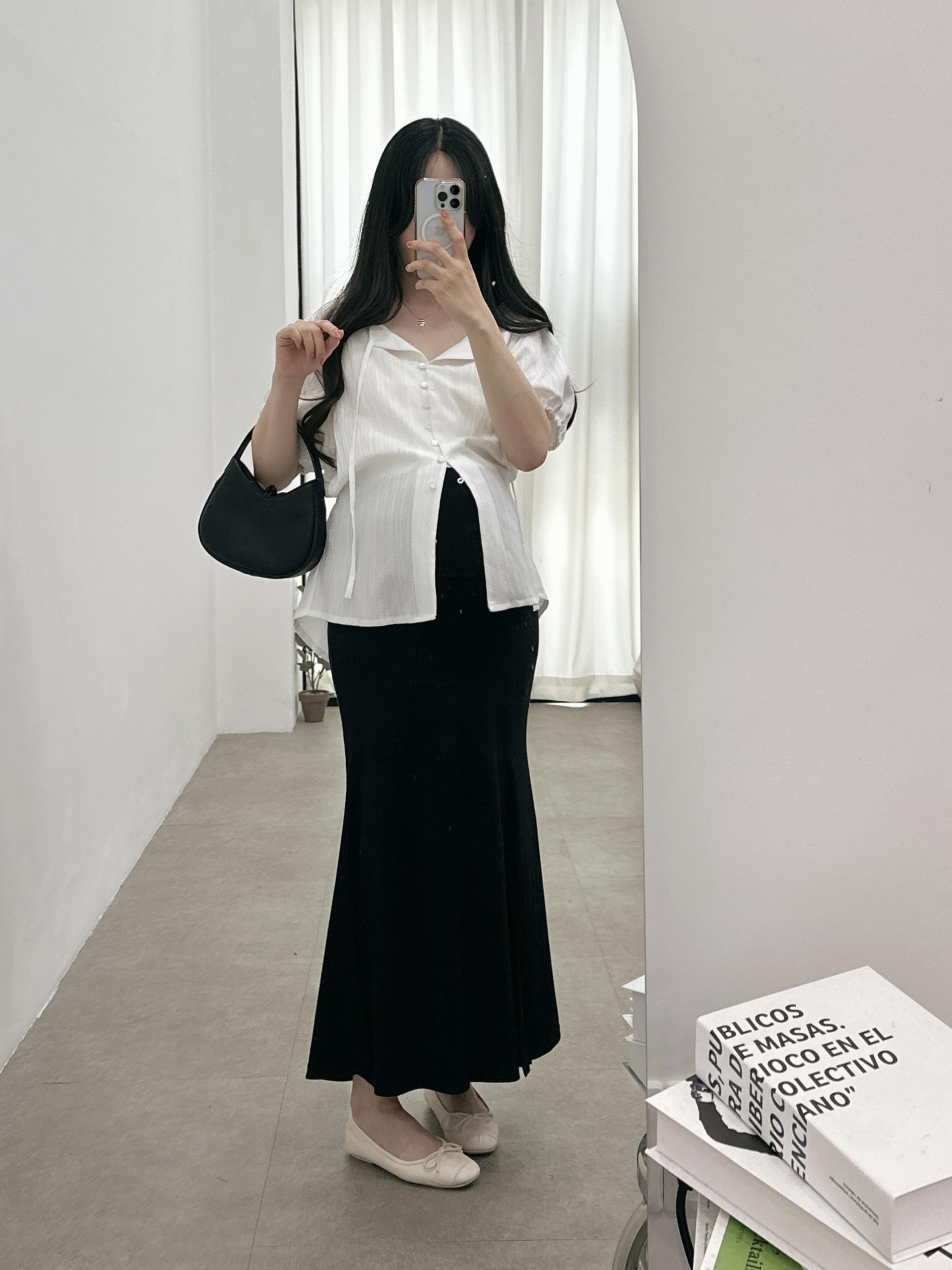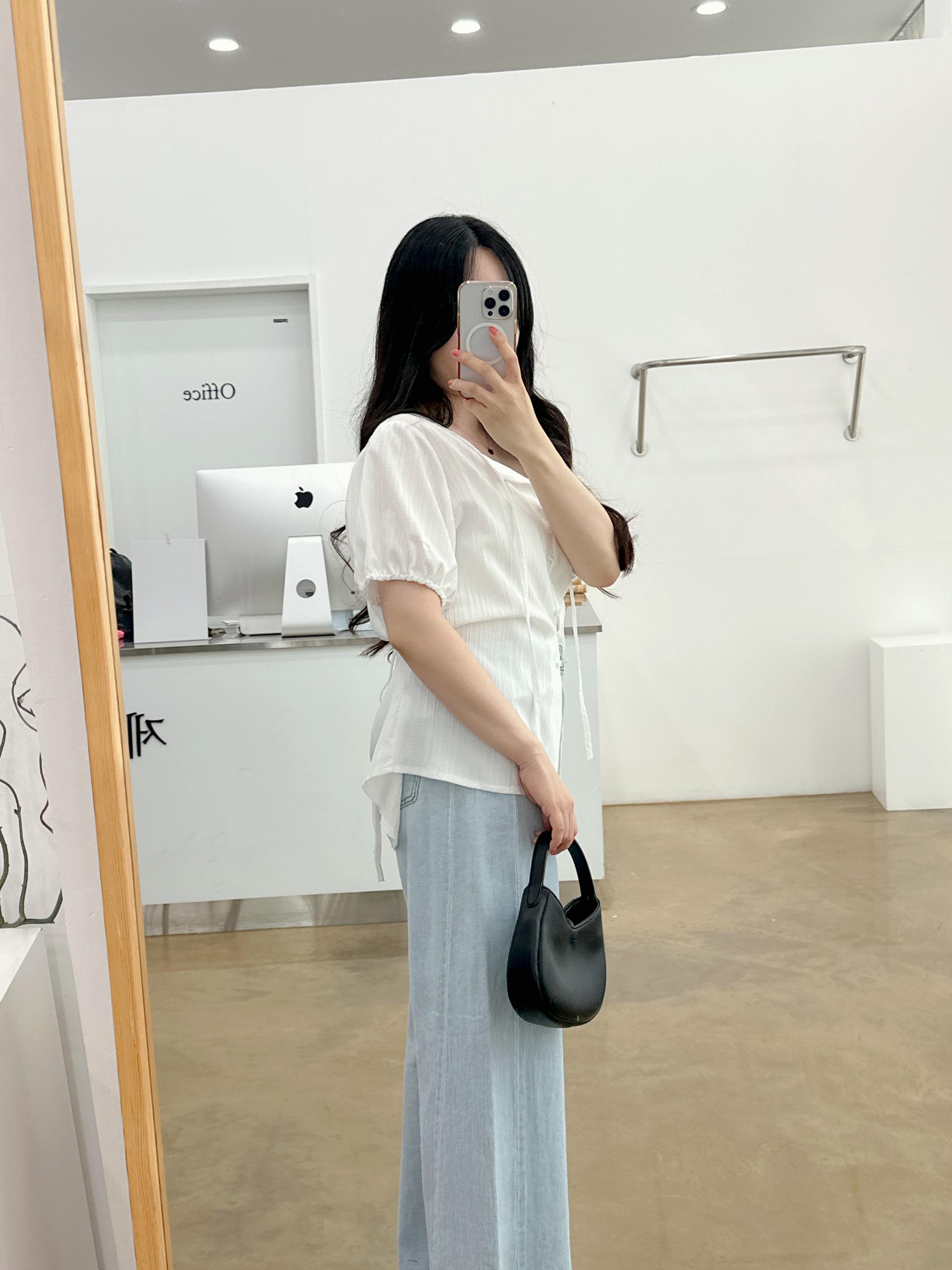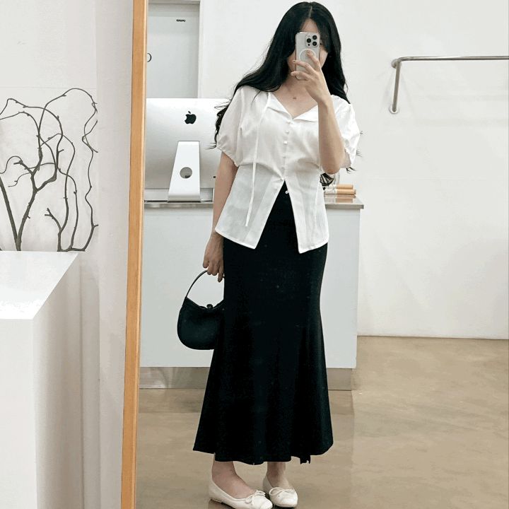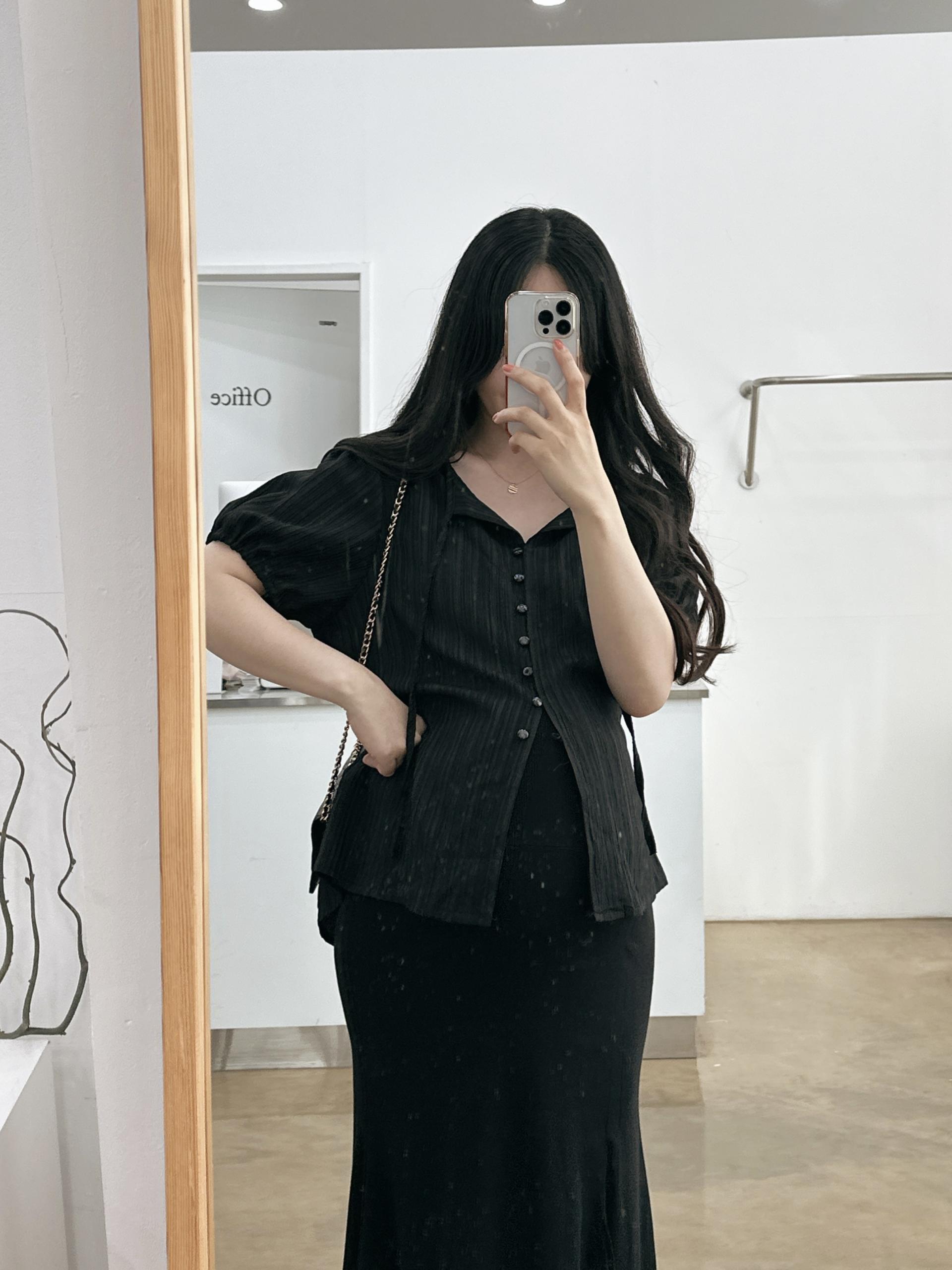 부드러운콩단추라 잠그고 풀고 편하답니다:) 옆 끈으로 뒤로 살짝 묶어주시면 세상날씬한예쁜핏 D라인부터 출산후까지 완벽하게 입으실 수 있는 블라우스입니다!