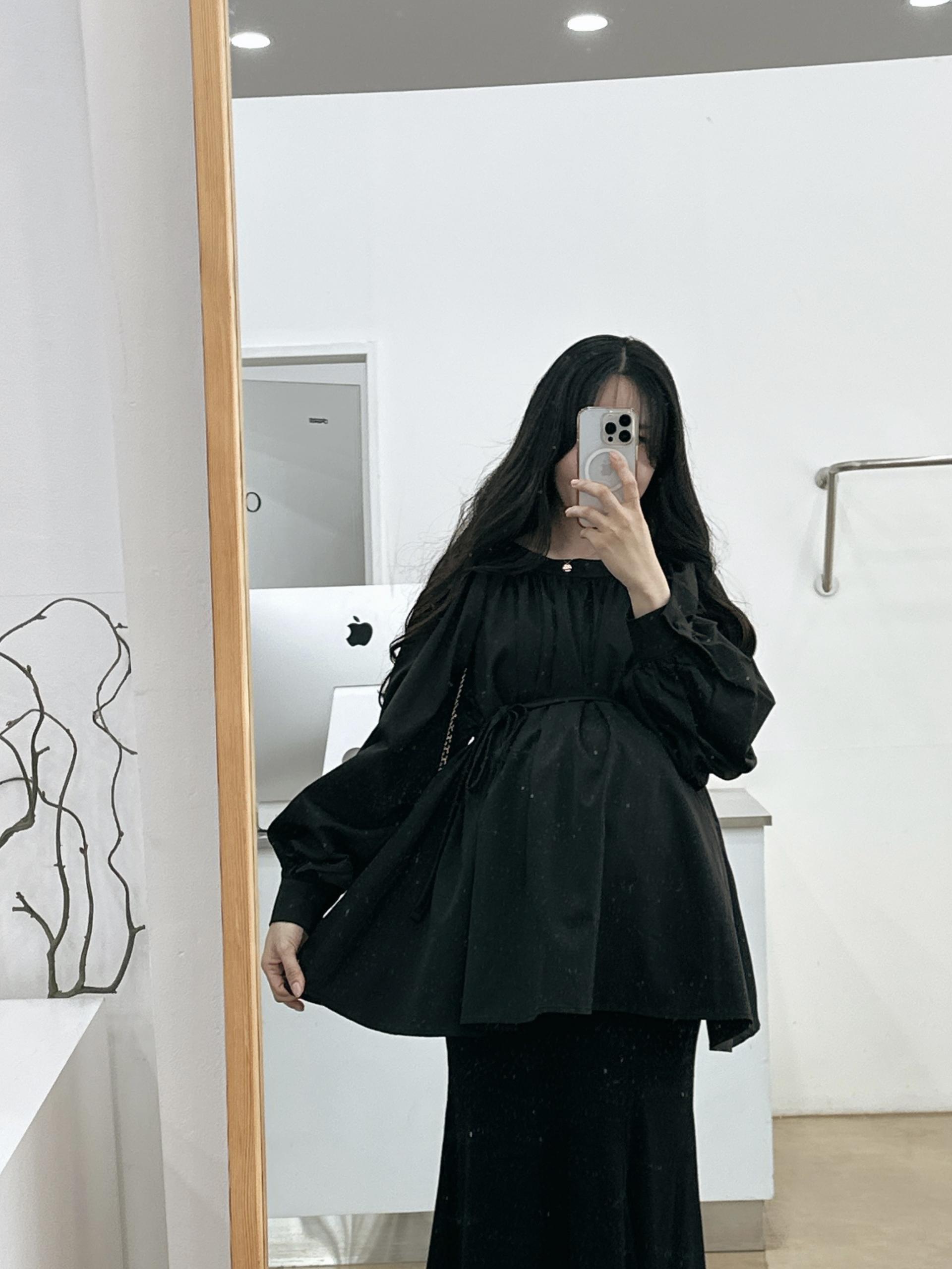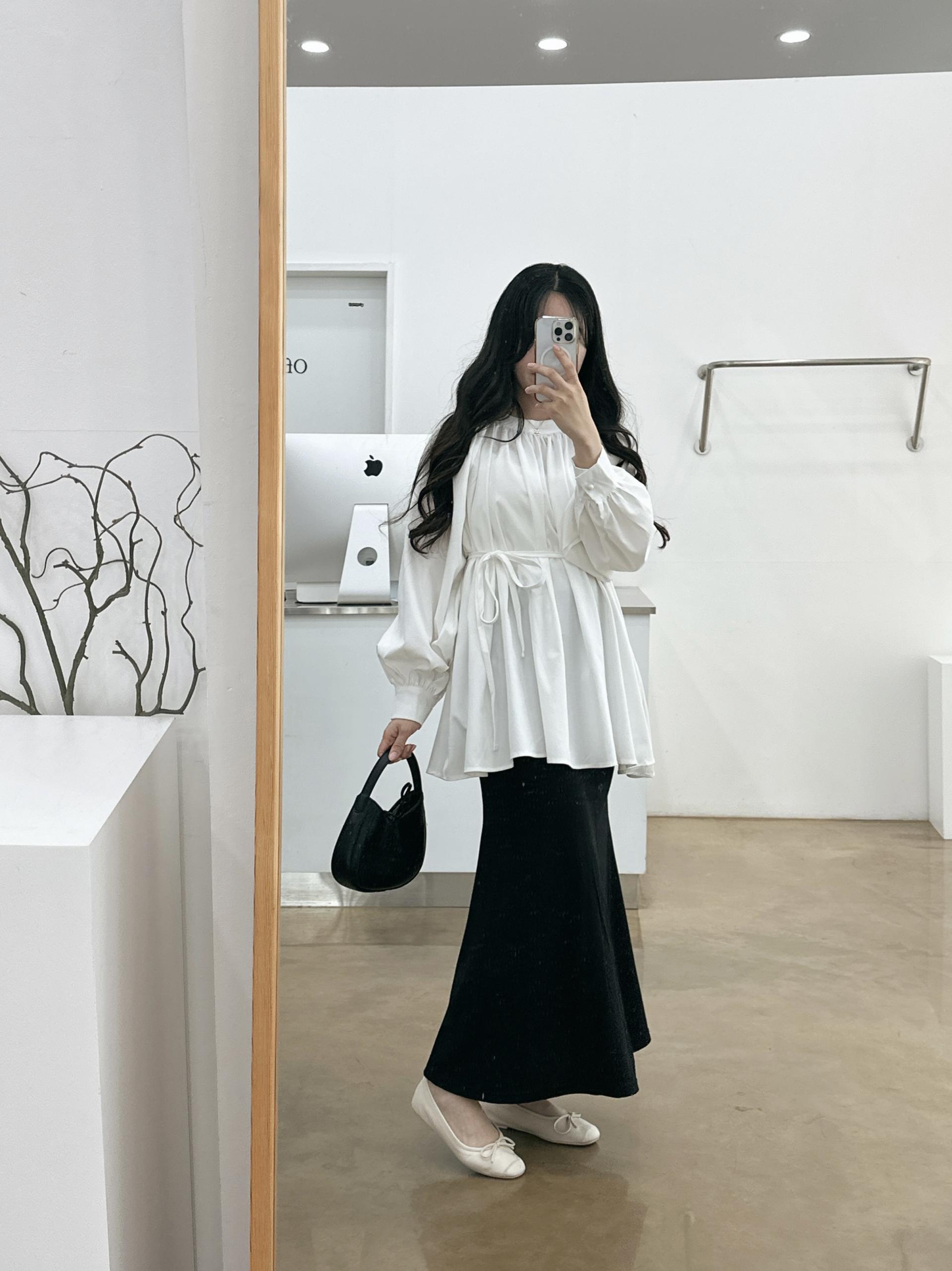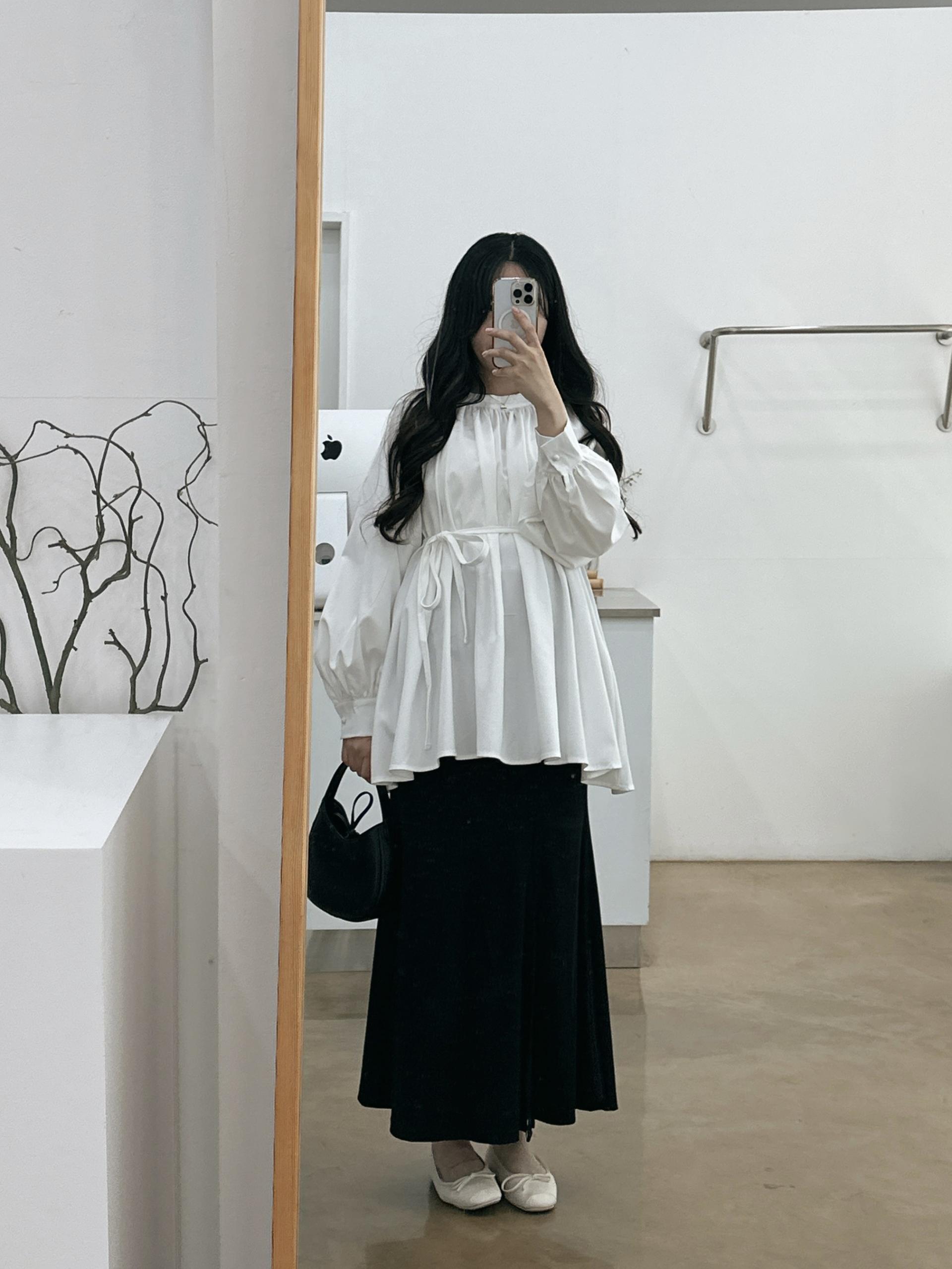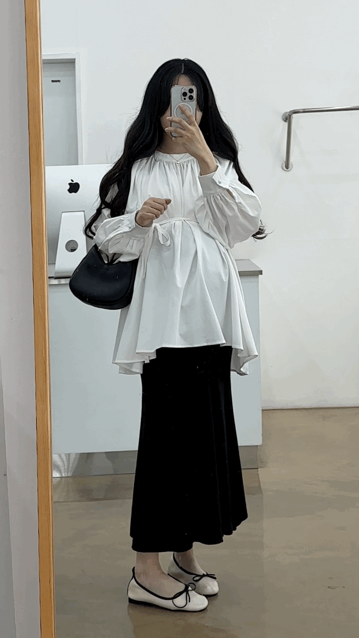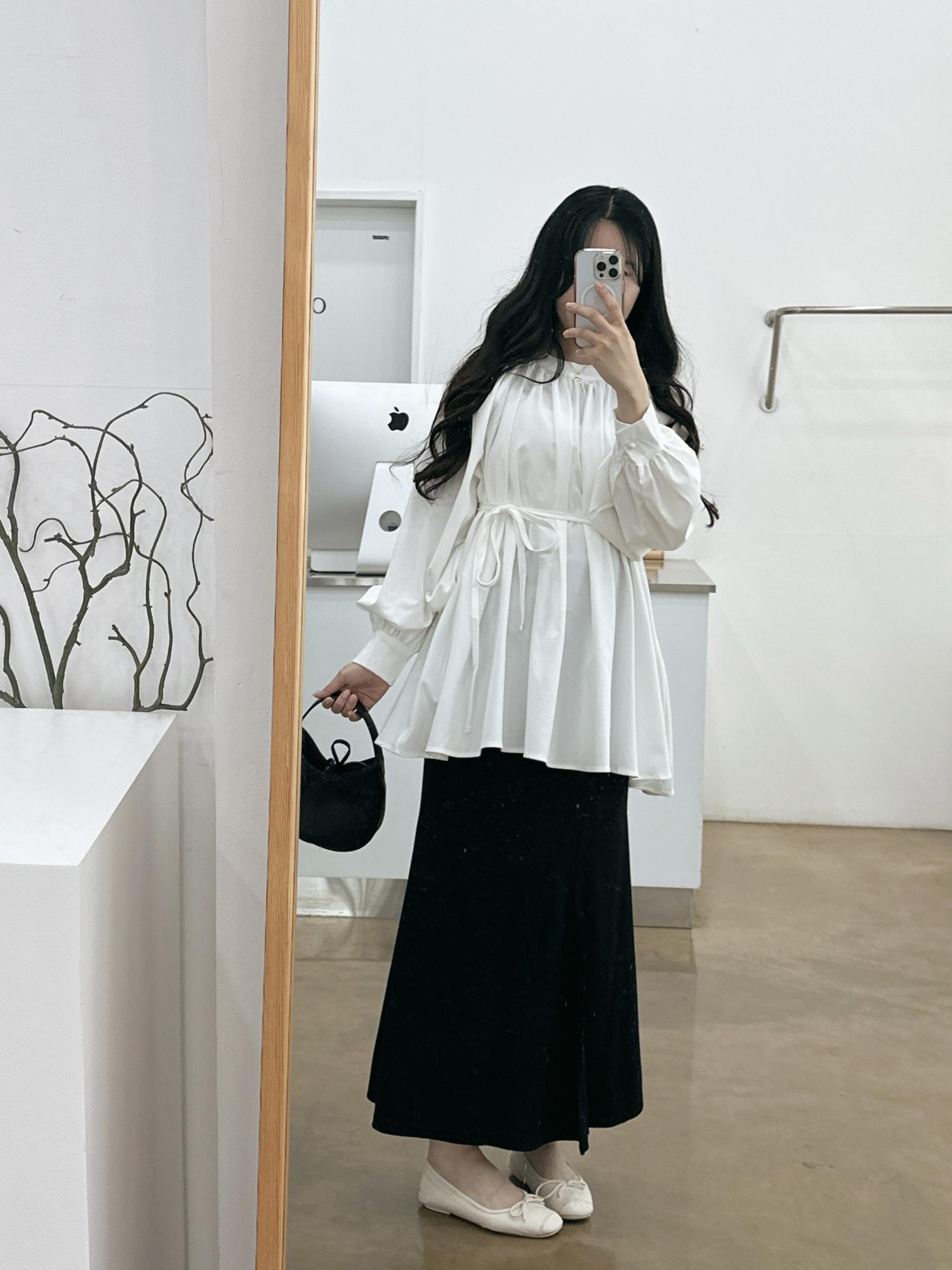 우아하면서 여성스럽게 입기 좋은, 배.힙덮기장의 플레어핏 풍성한 블라우스에요 끈묶어주시면 정말 세상날씬한예쁜핏 완성입니다:)
