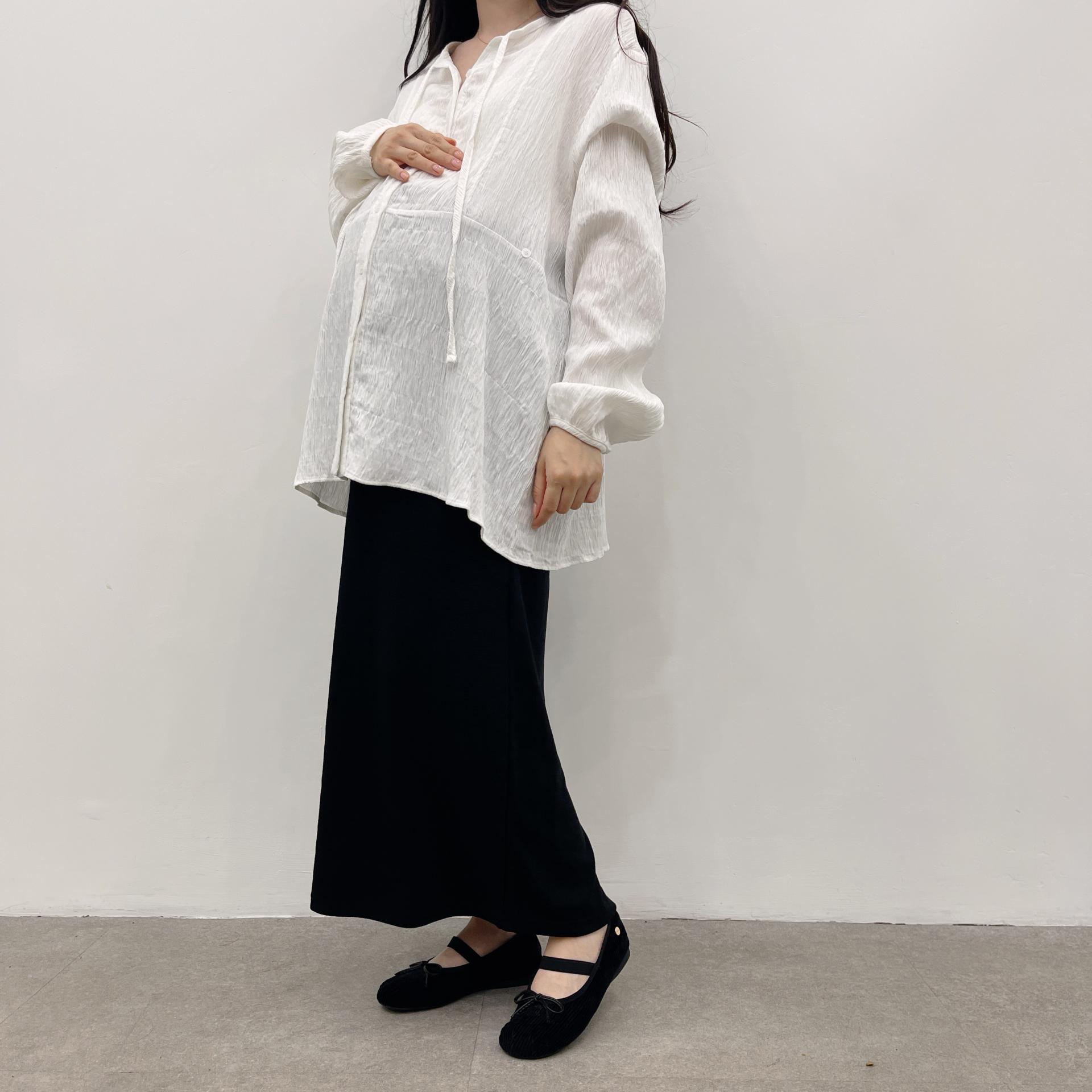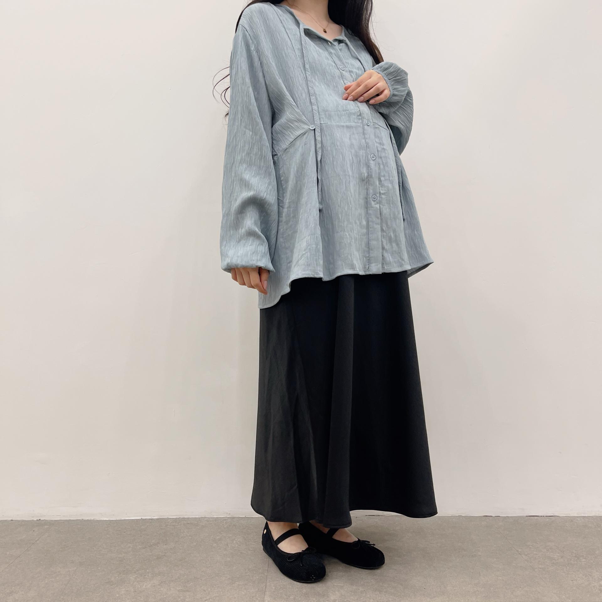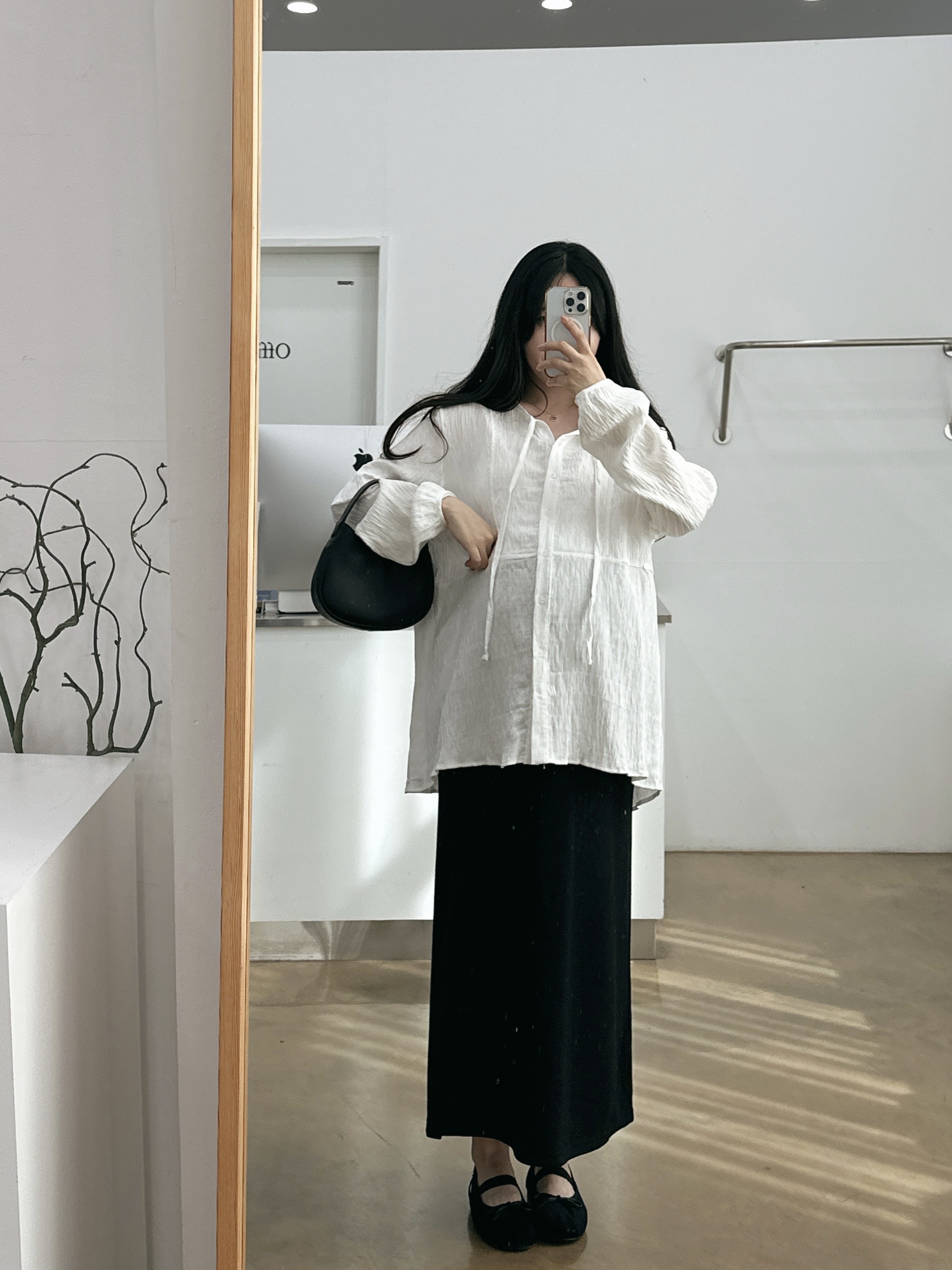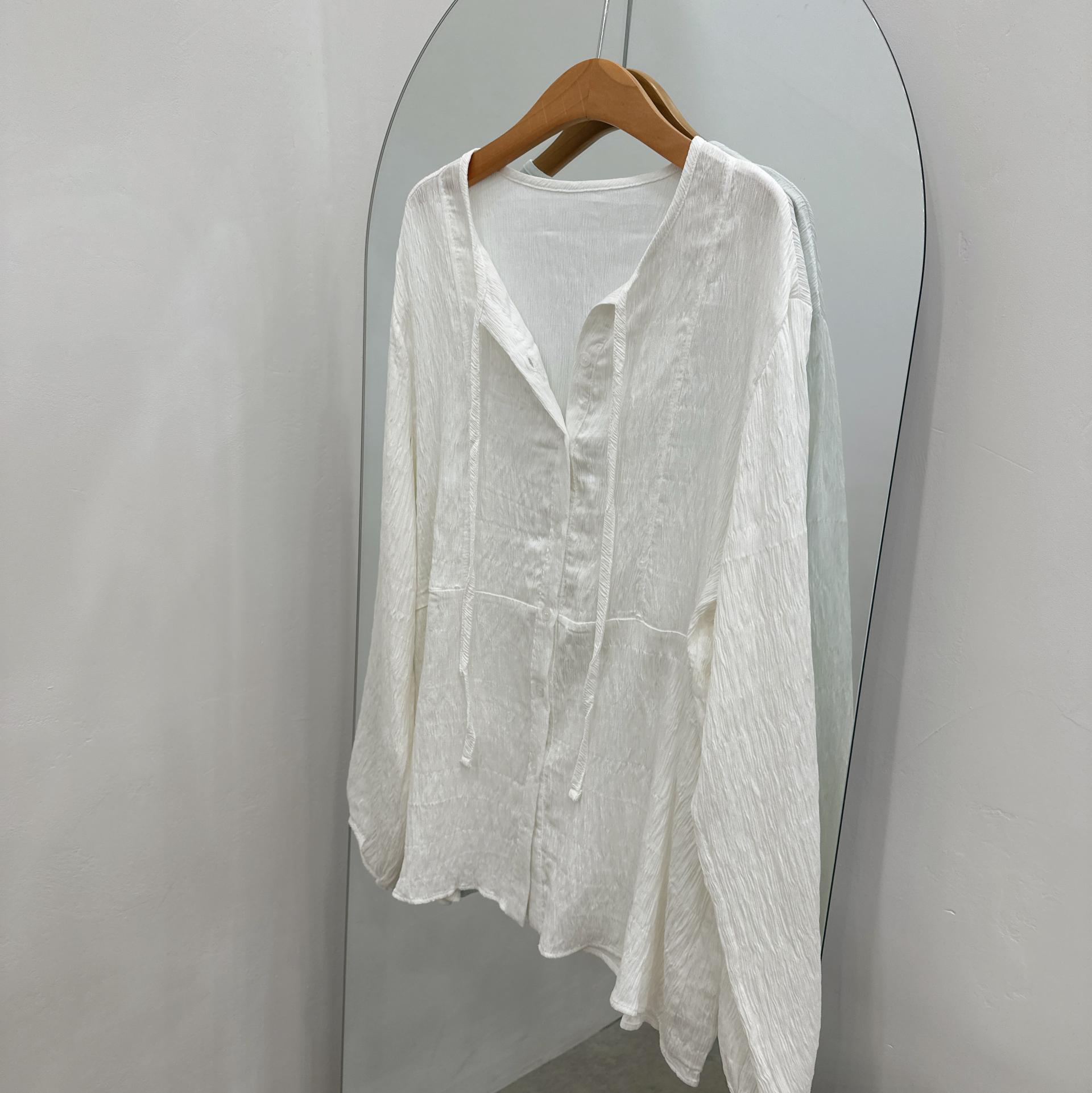 사이즈 좋은 링클주름원단의 배/힙덮기장의 블라우스입니다
