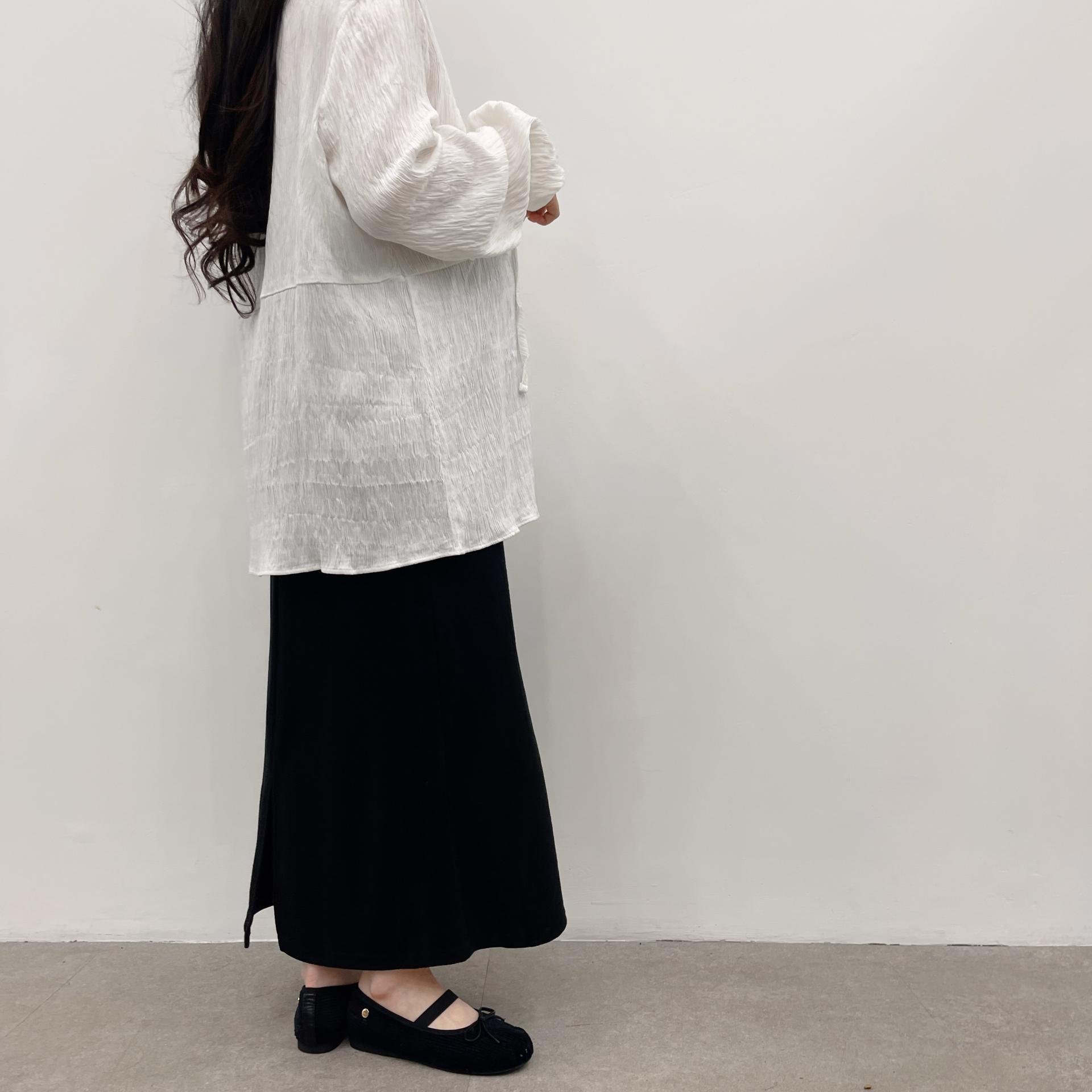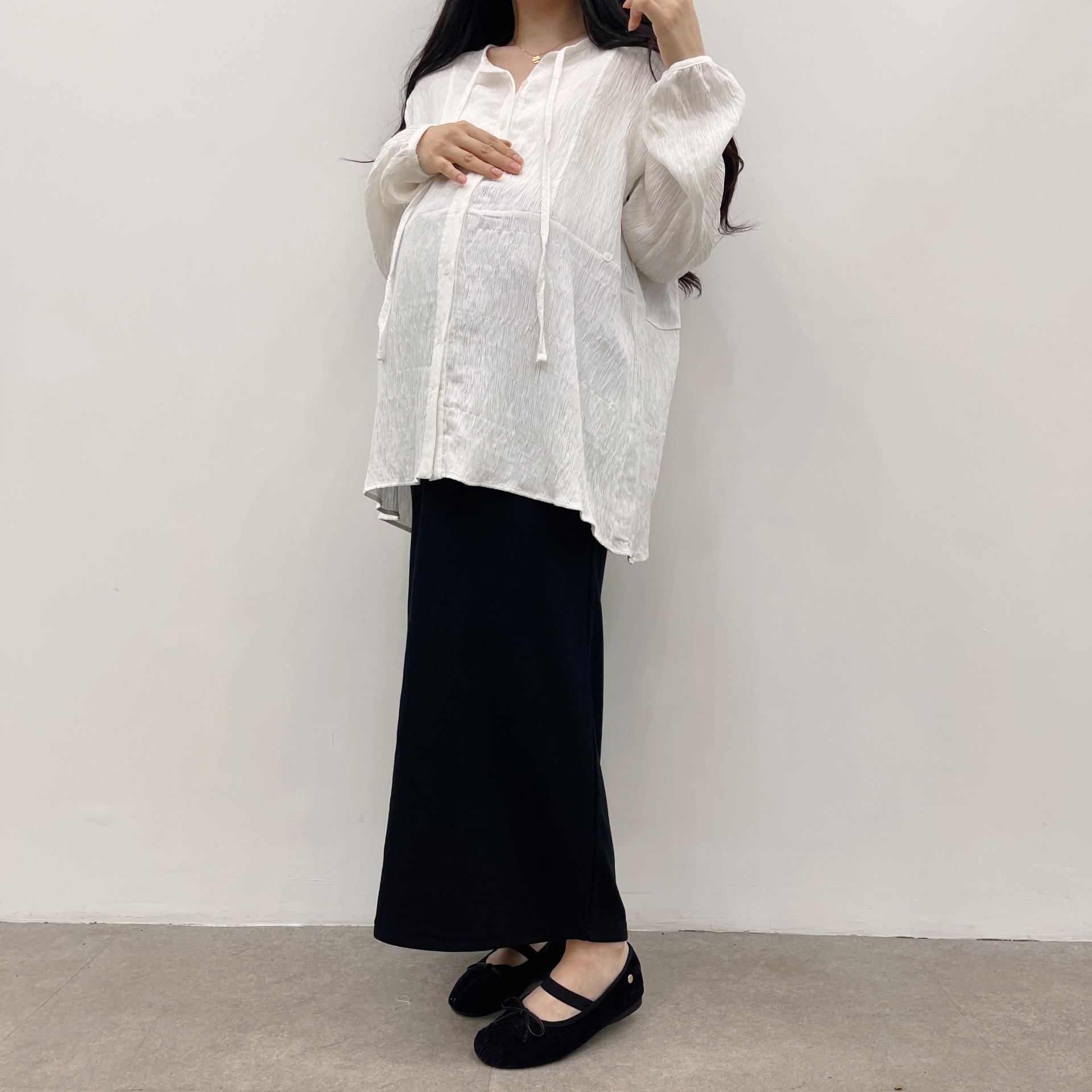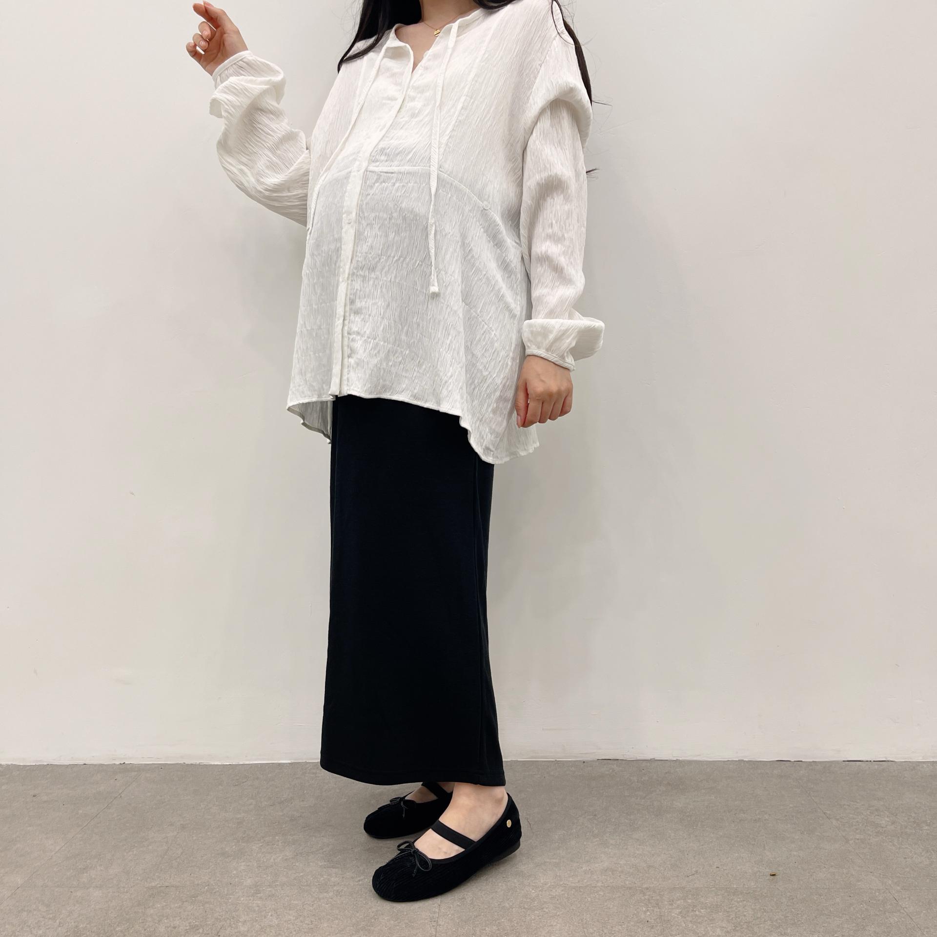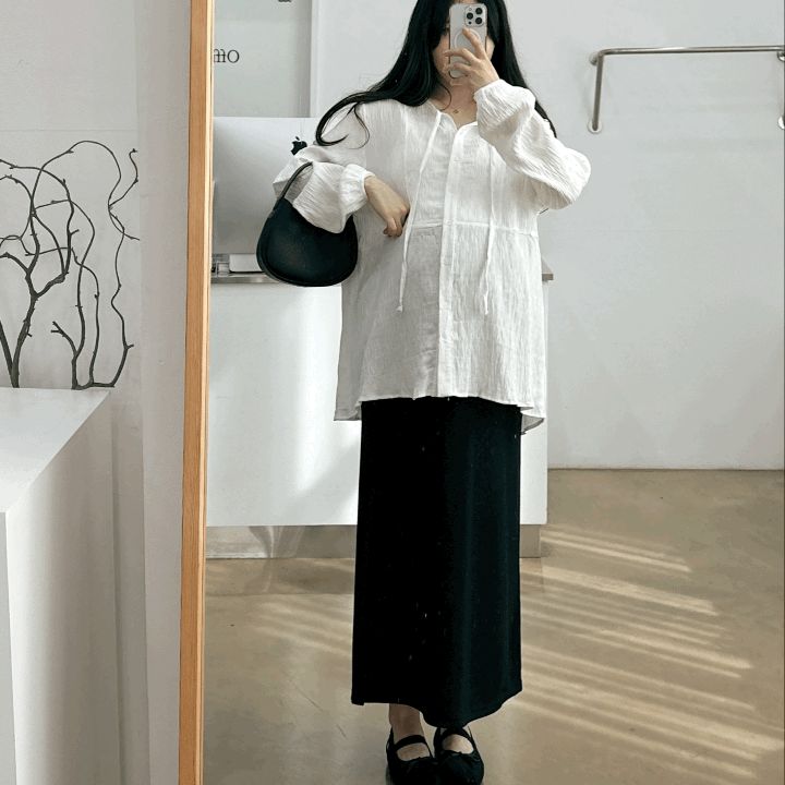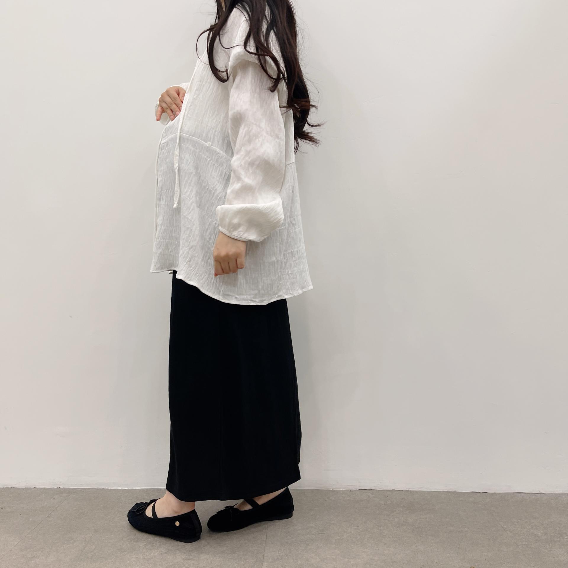 사이즈 좋은 링클주름원단의 배/힙덮기장의 블라우스입니다