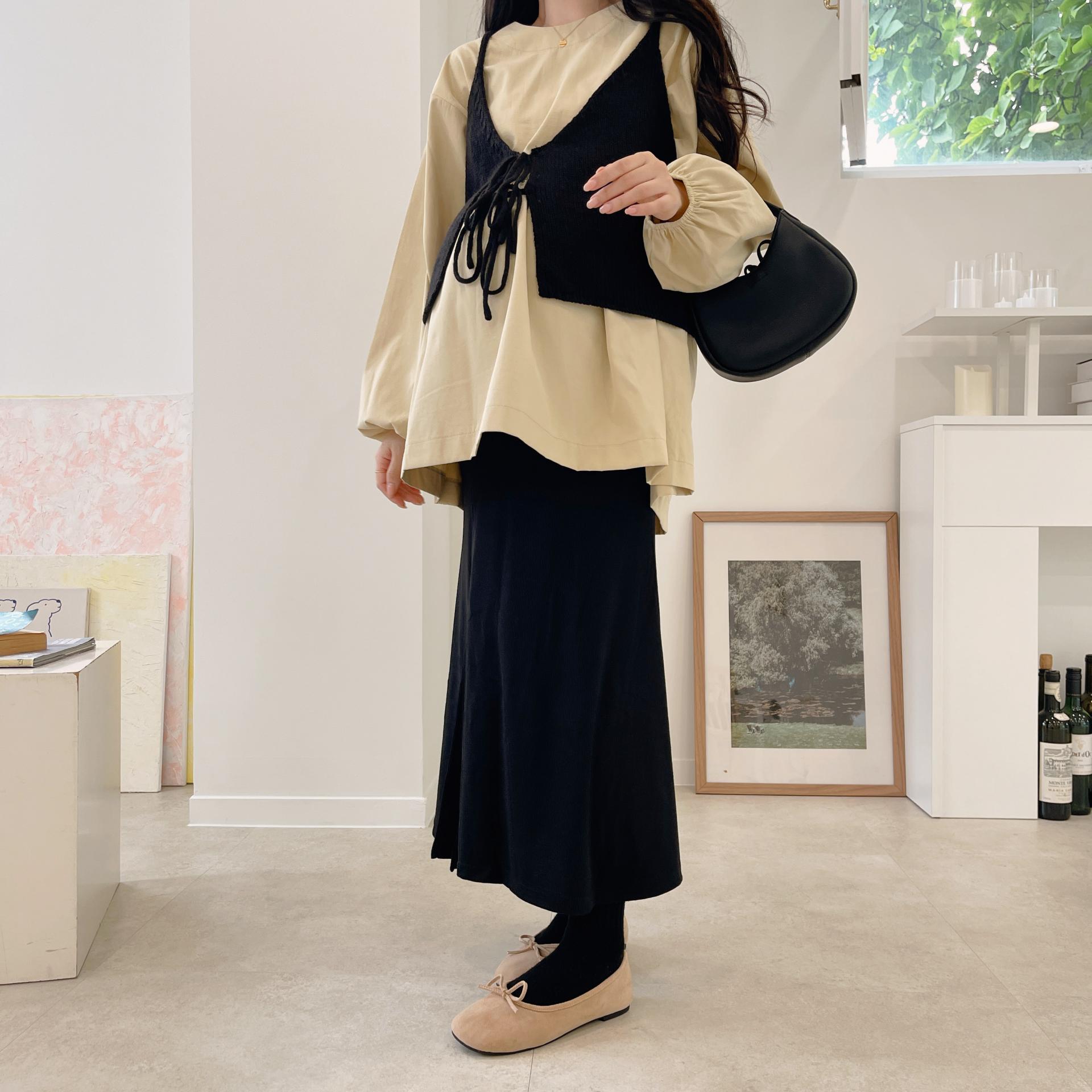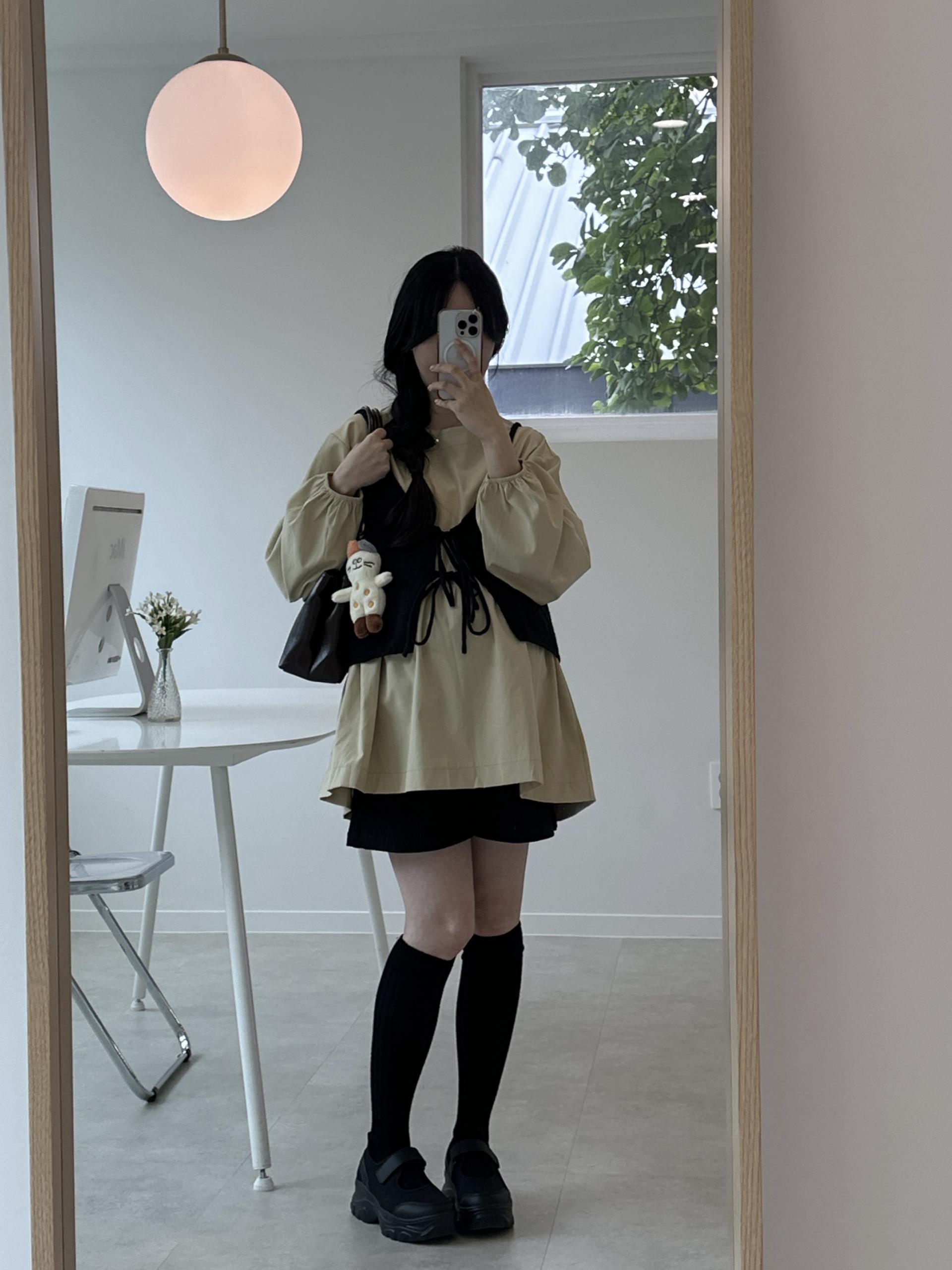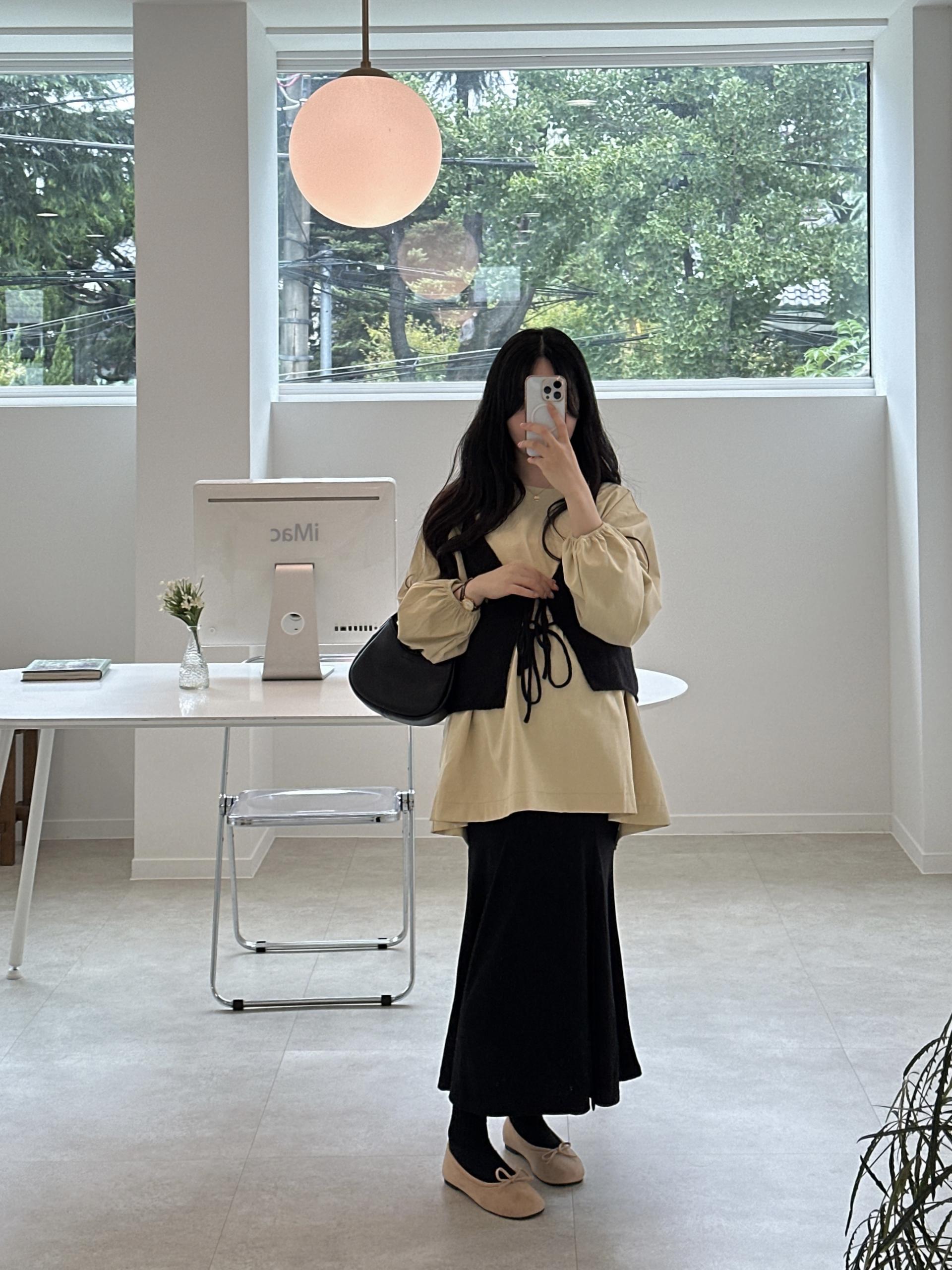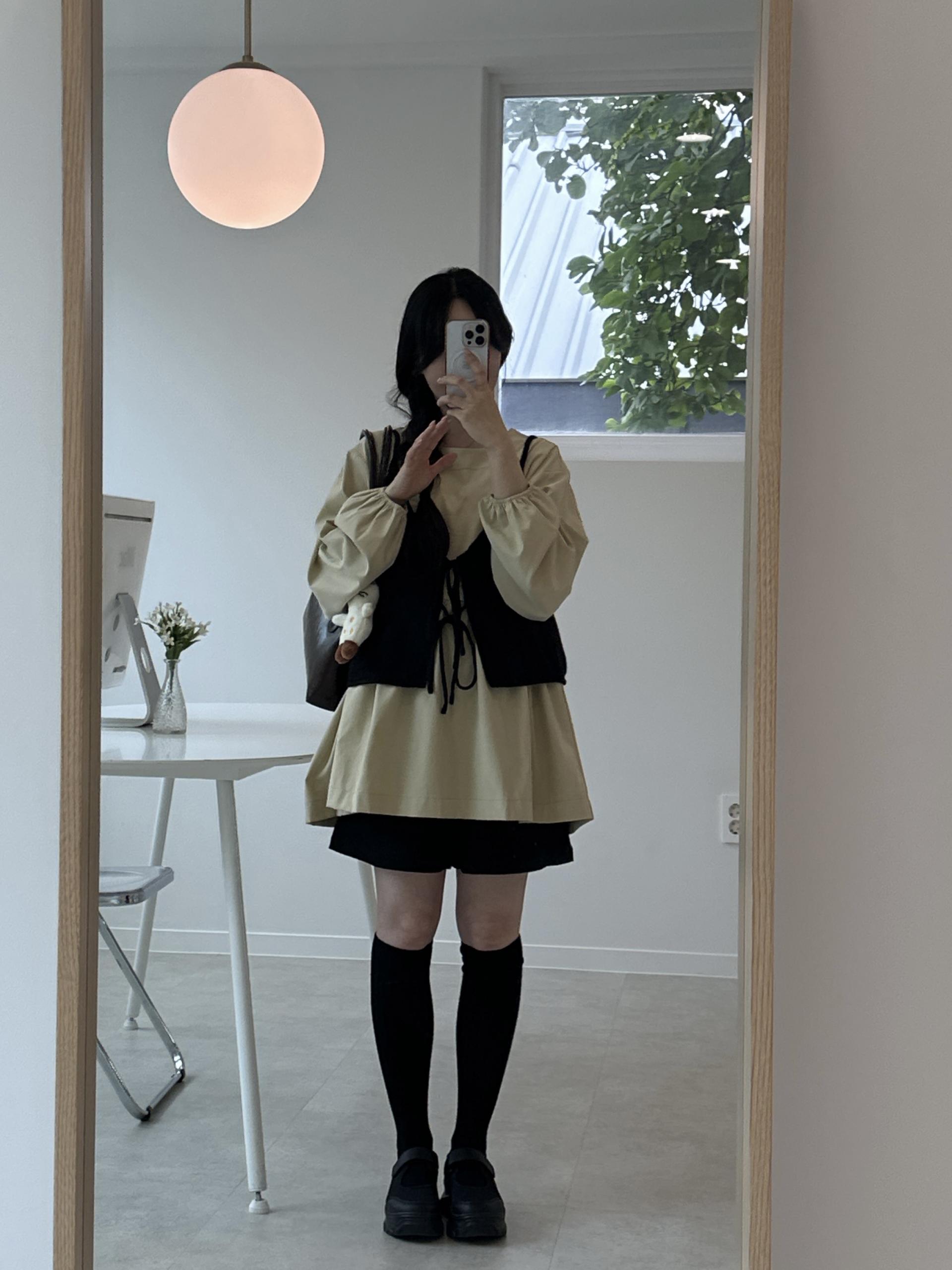 랜드블라우스(베이지) + 덴리본니트뷔스티에(블랙)