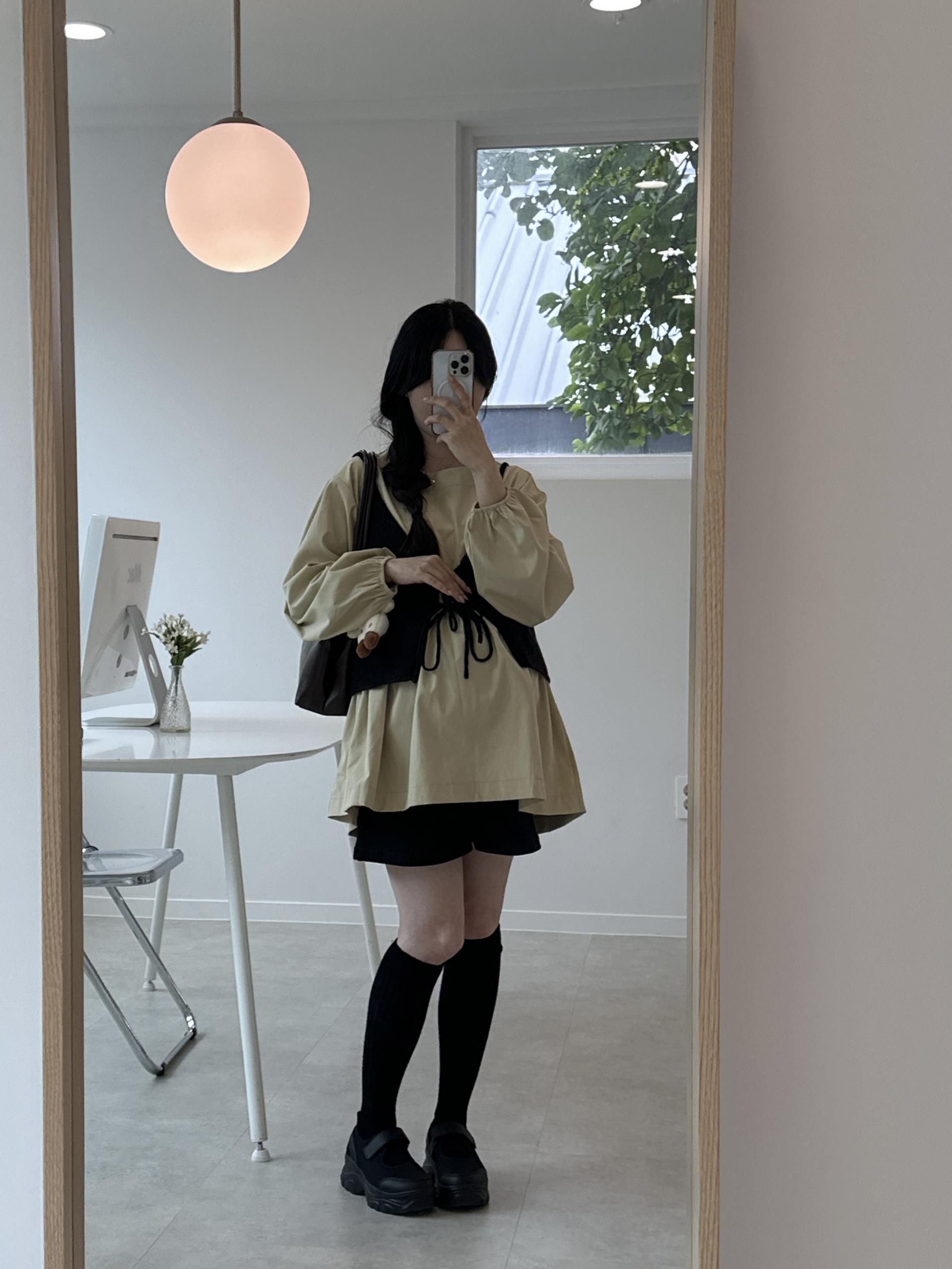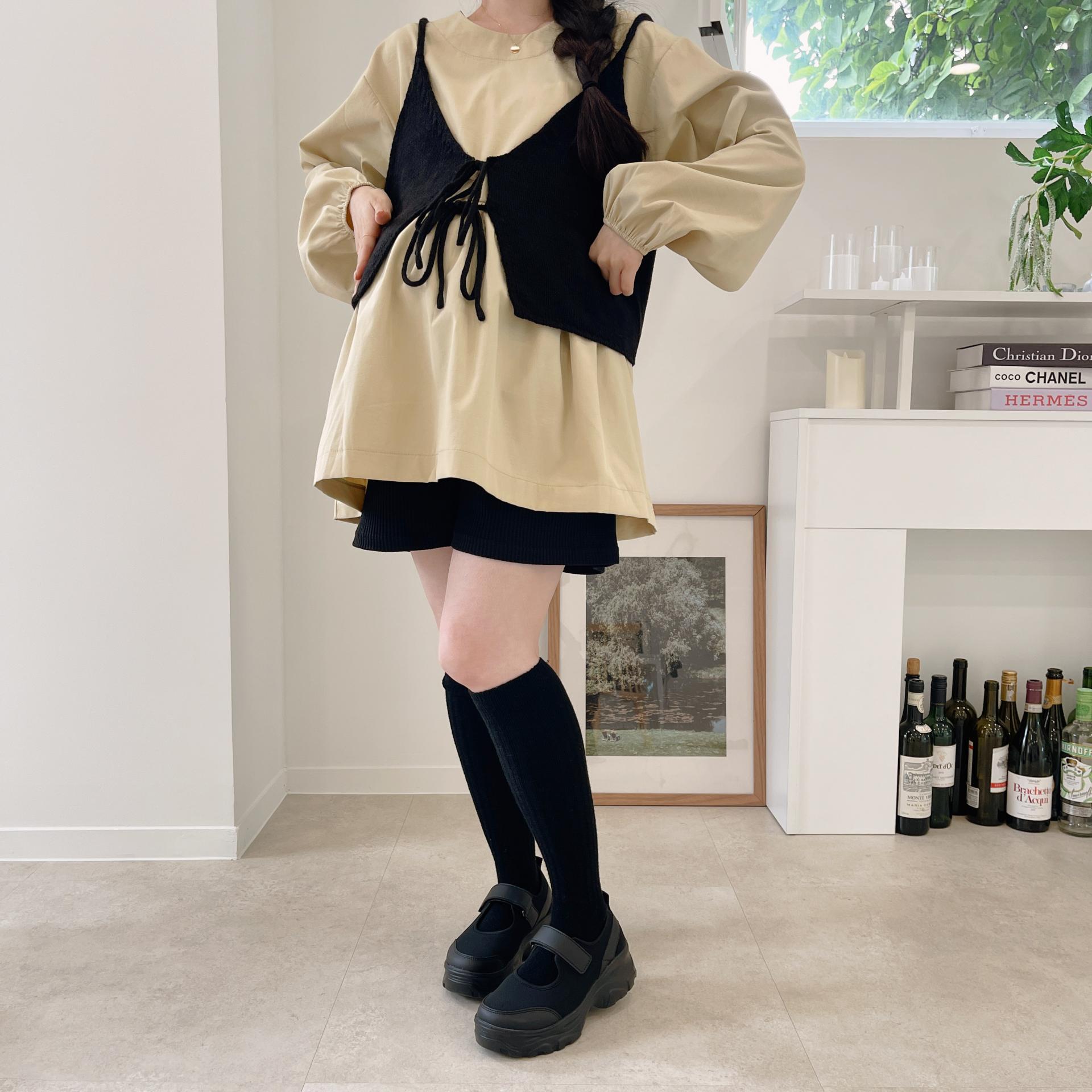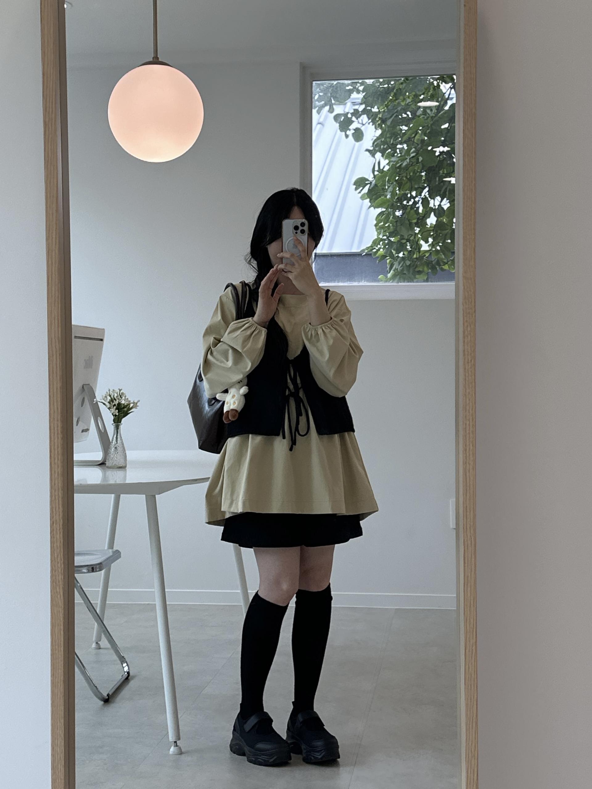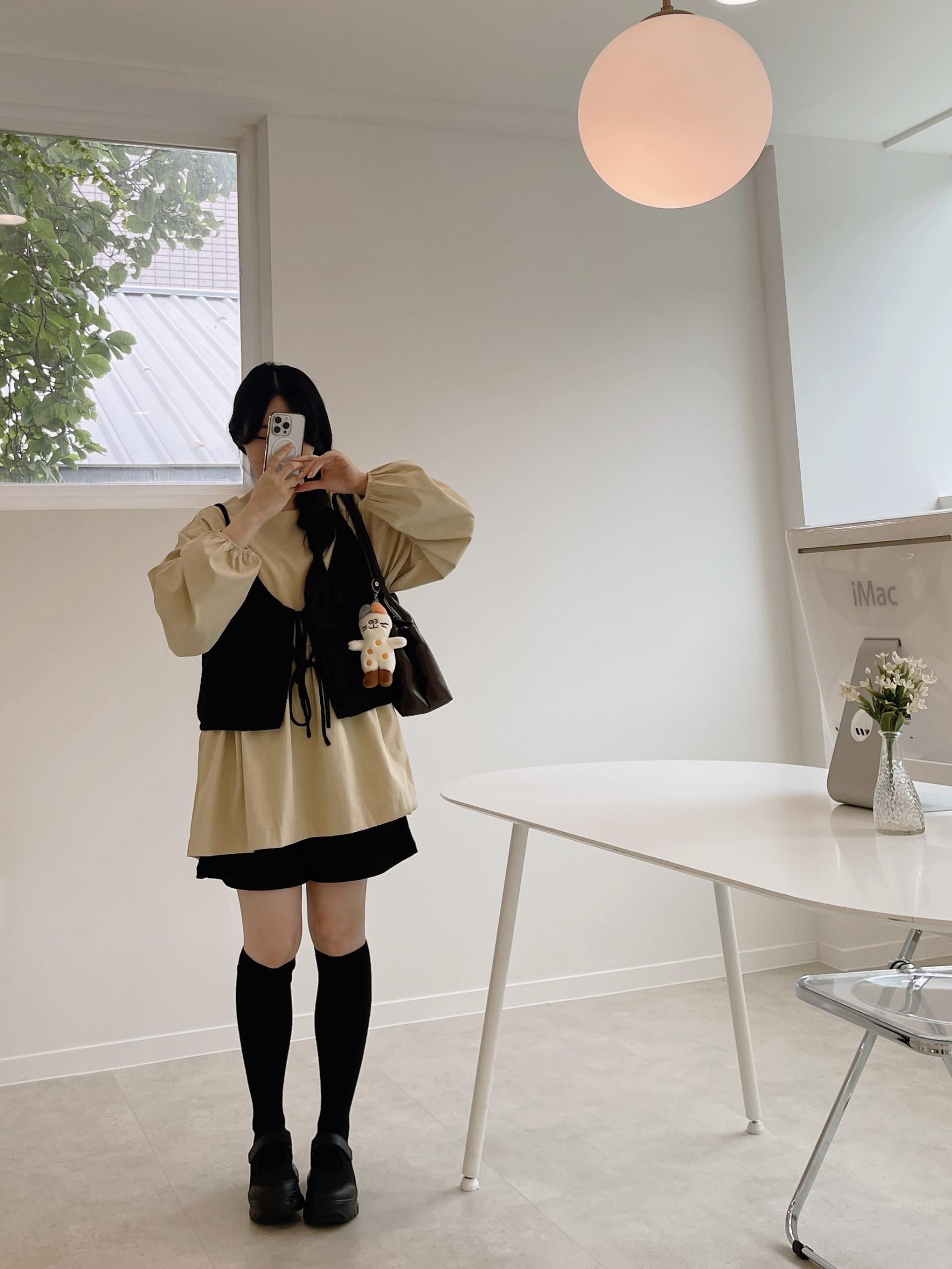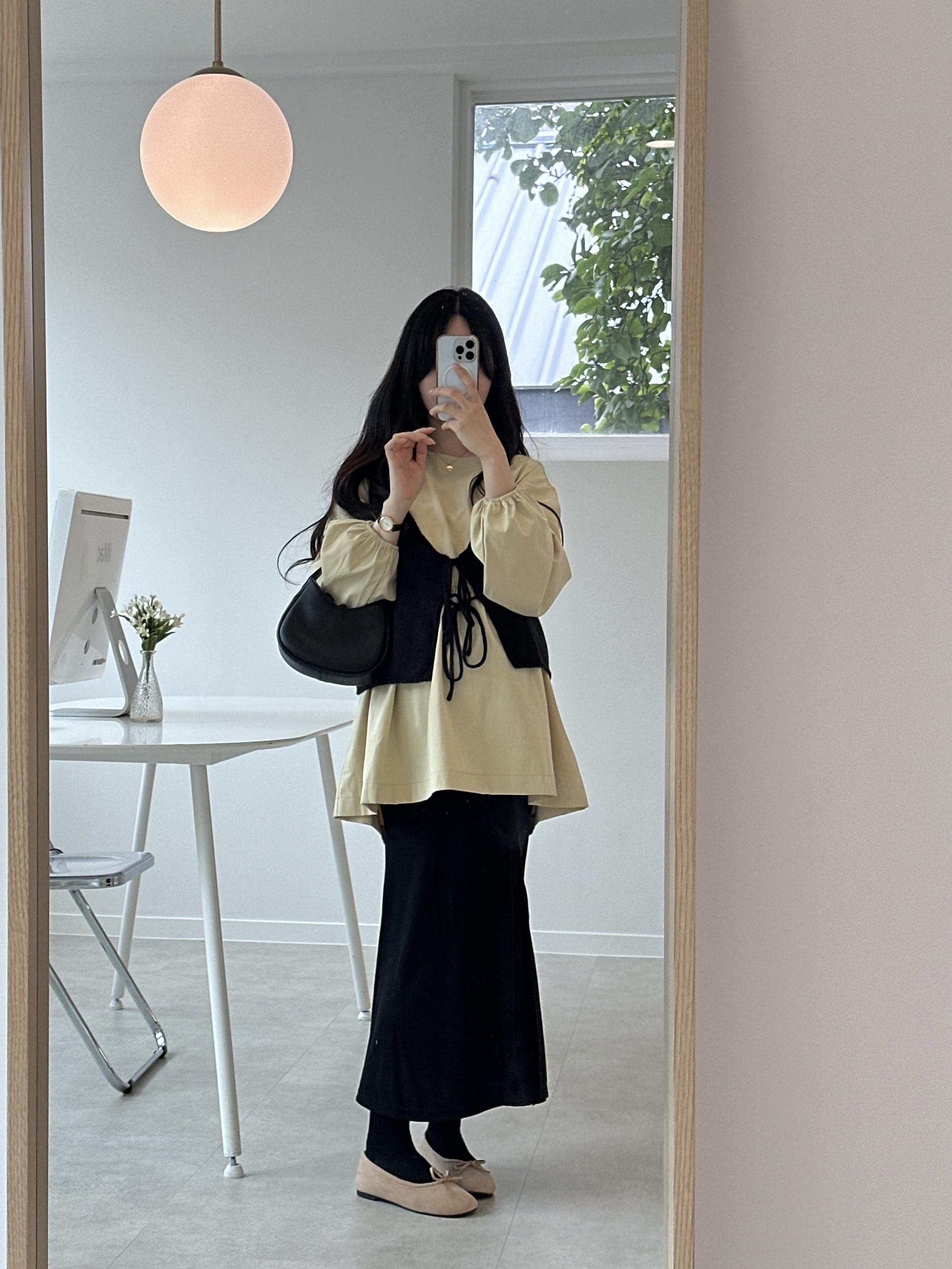 랜드블라우스(베이지) + 덴리본니트뷔스티에(블랙)
