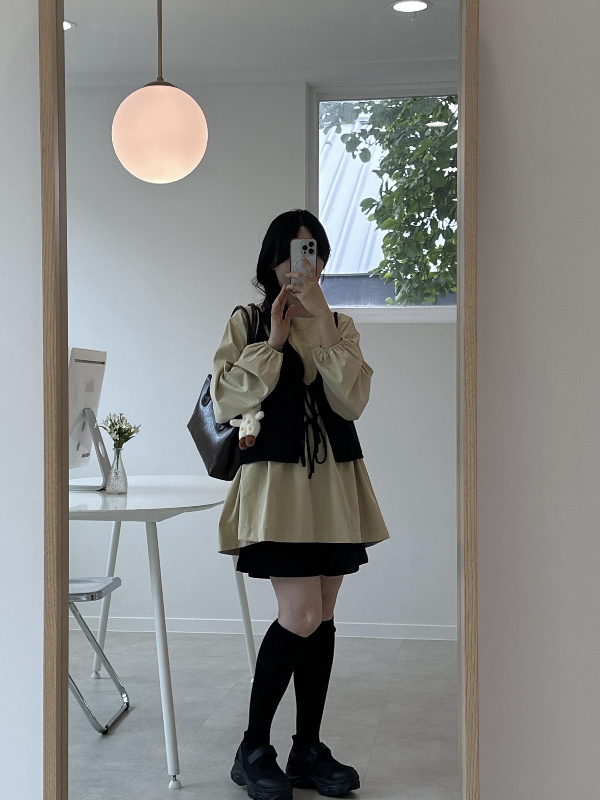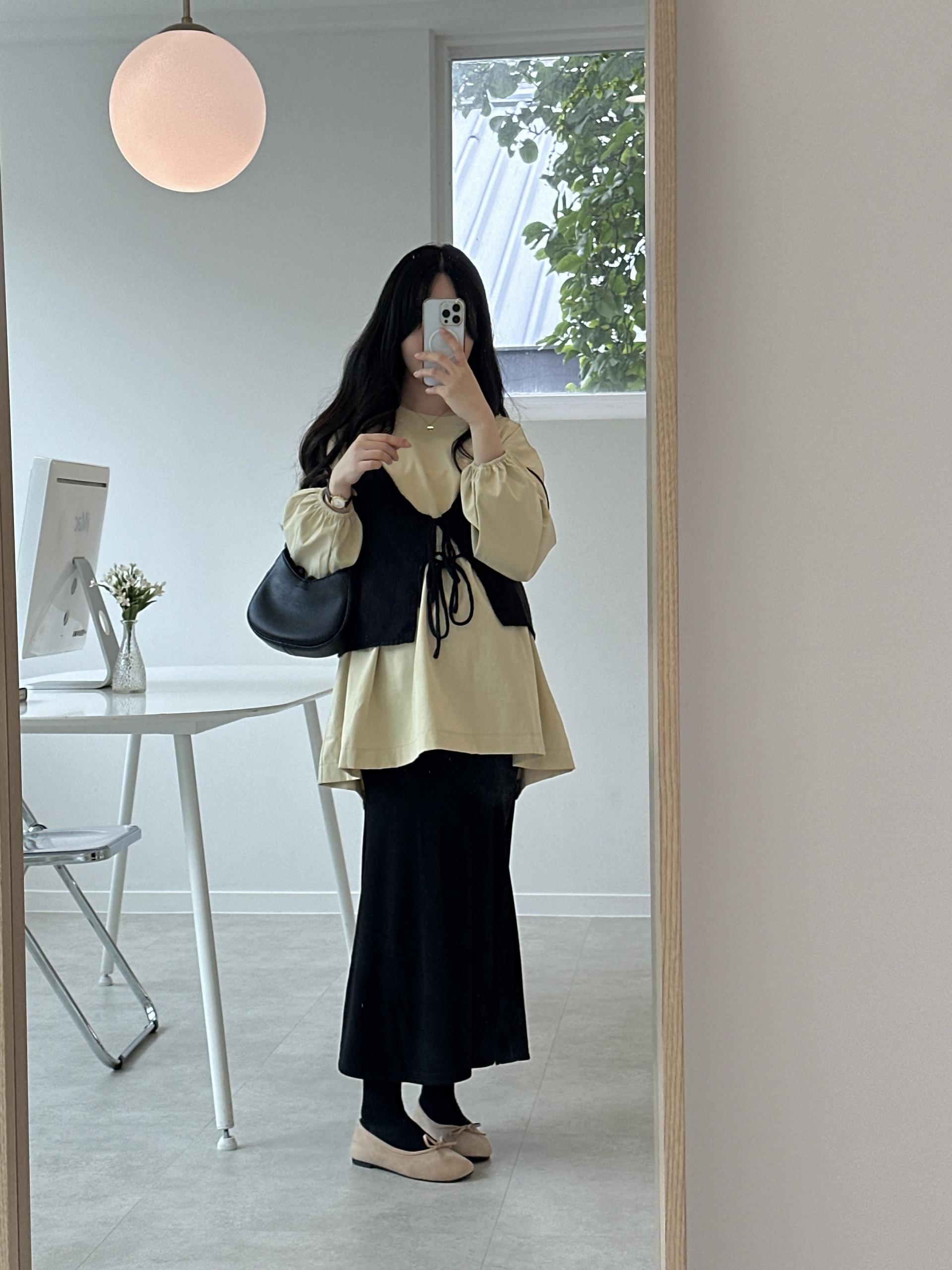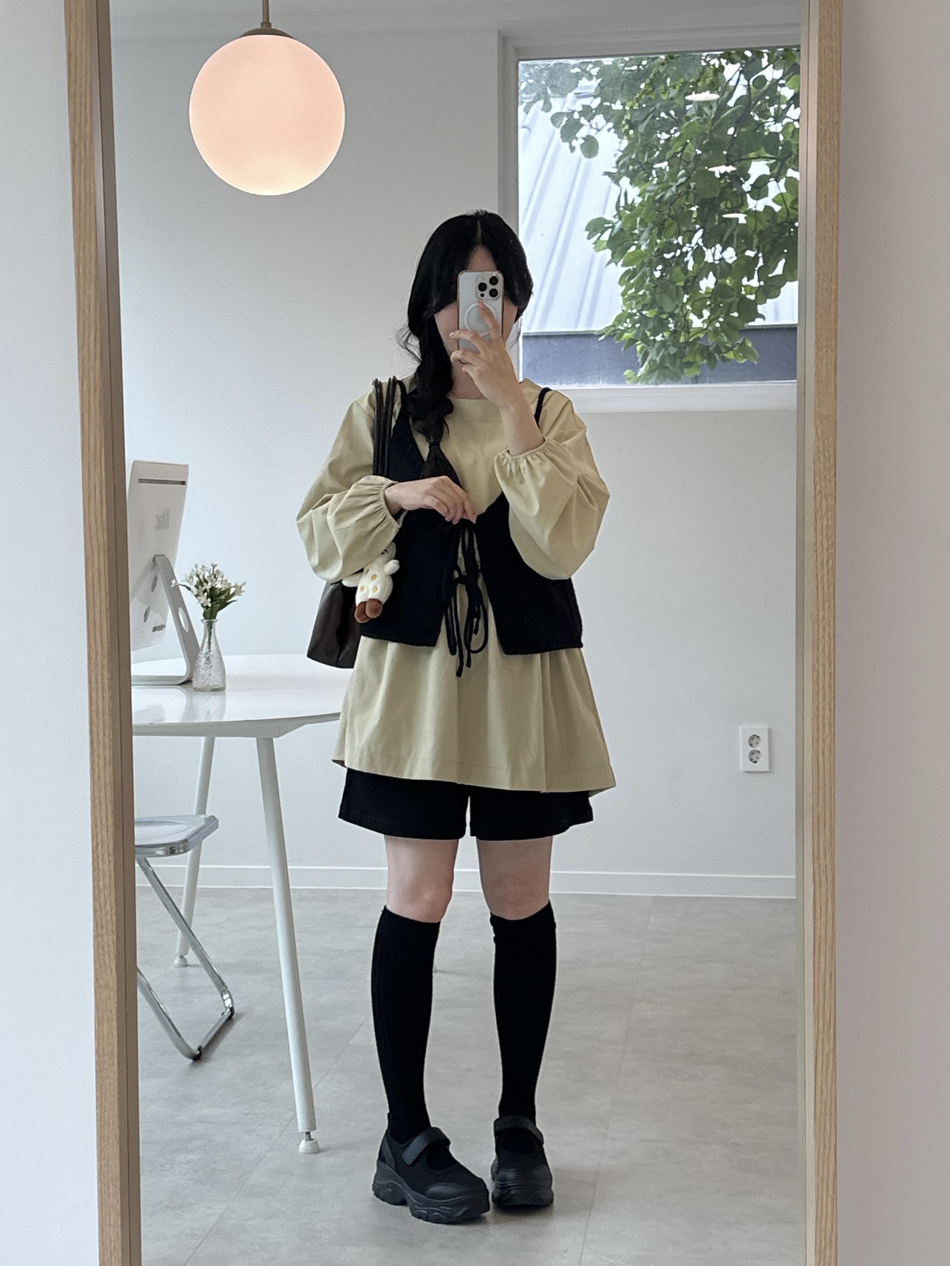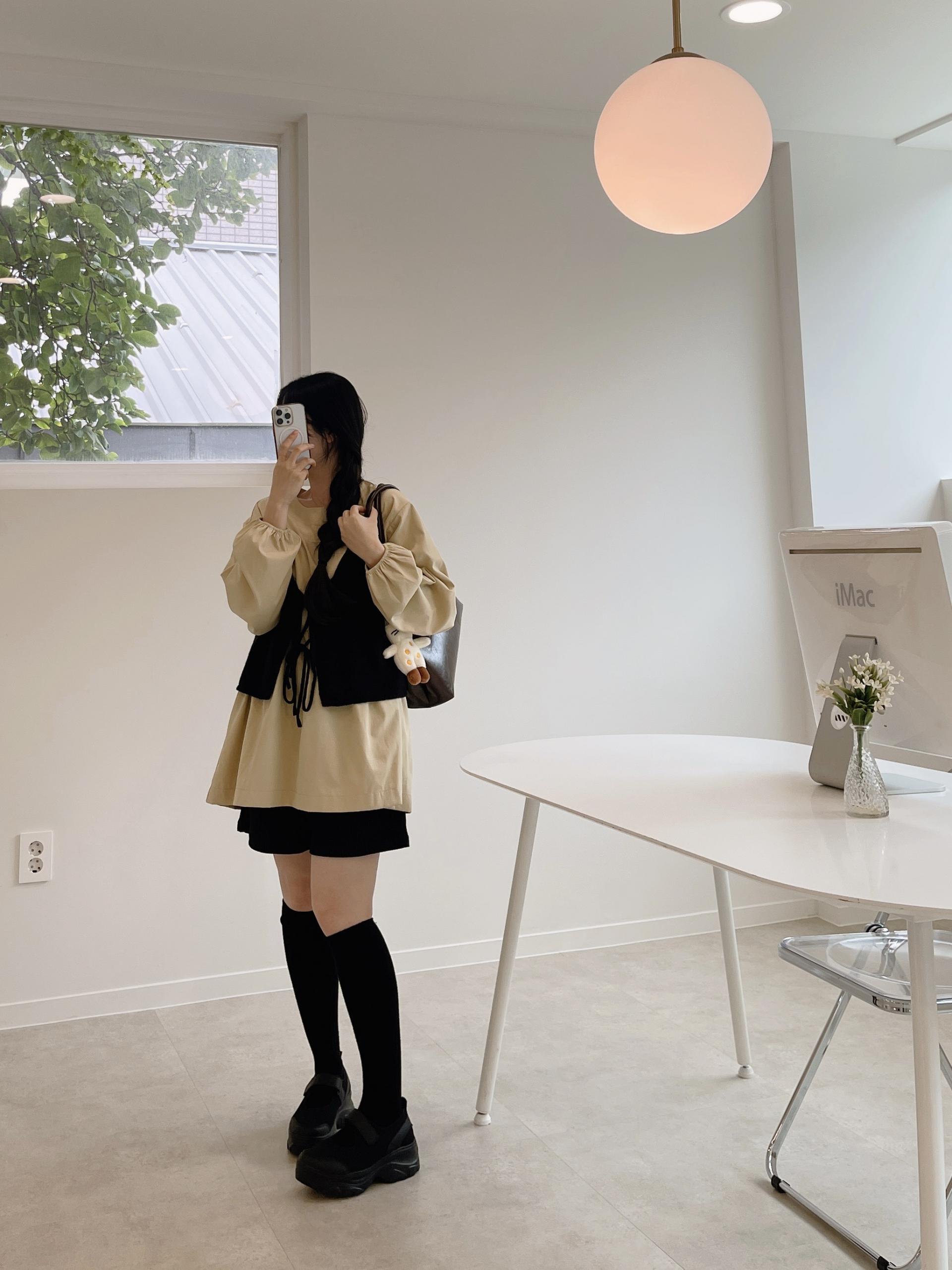 랜드블라우스(베이지) + 덴리본니트뷔스티에(블랙)