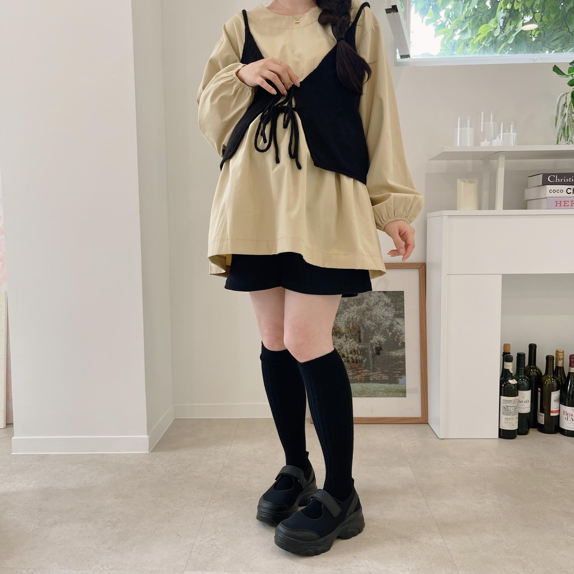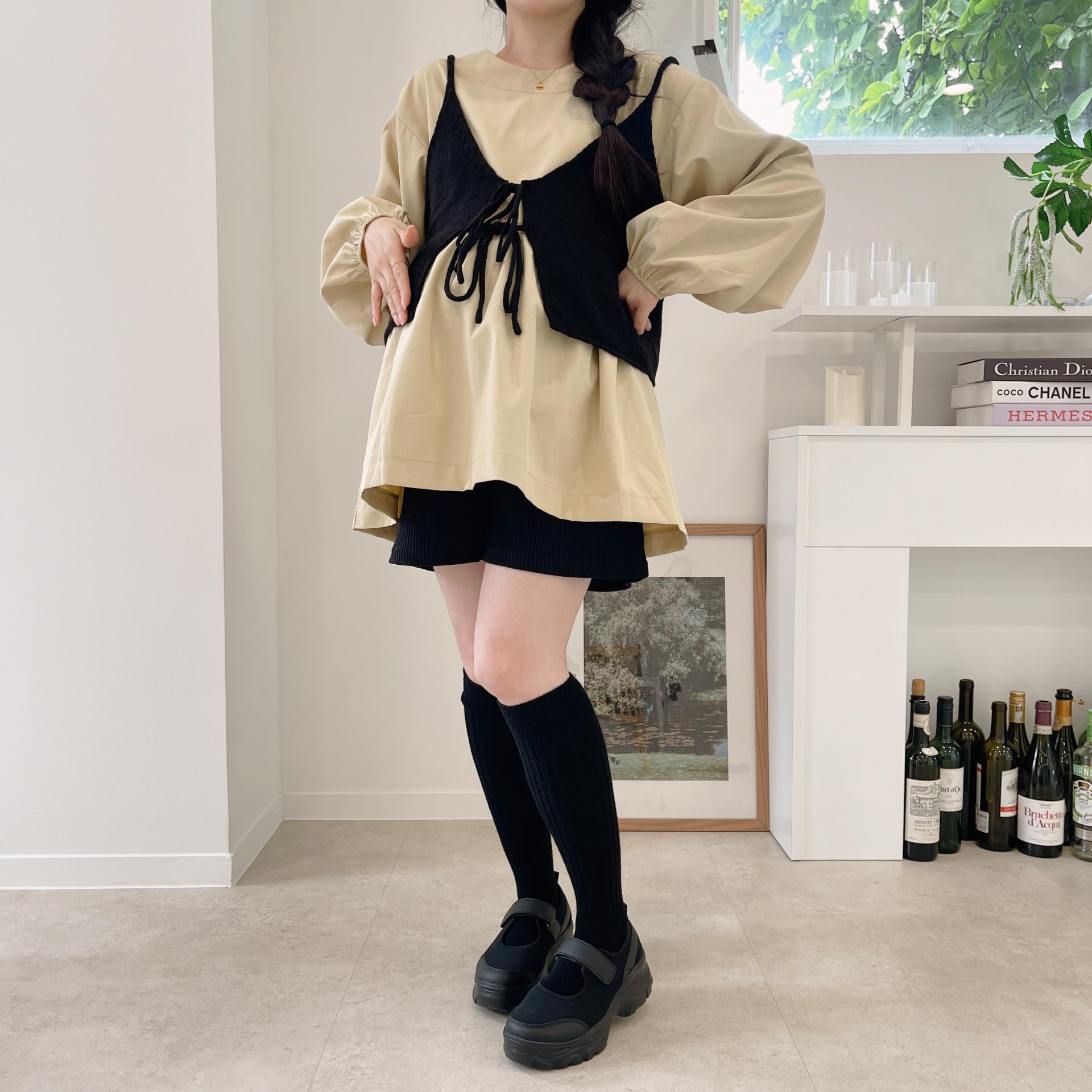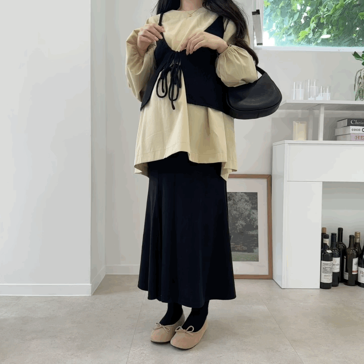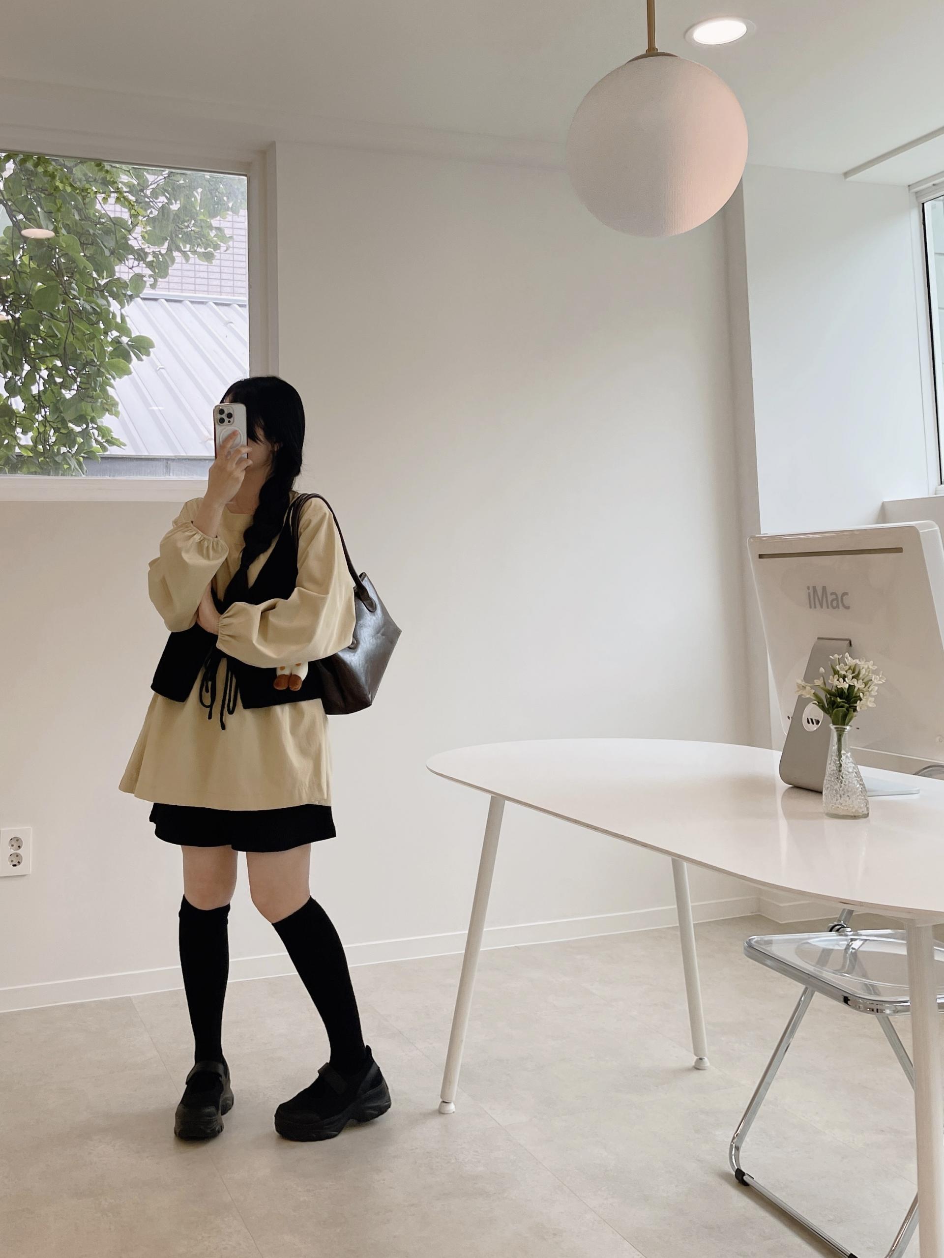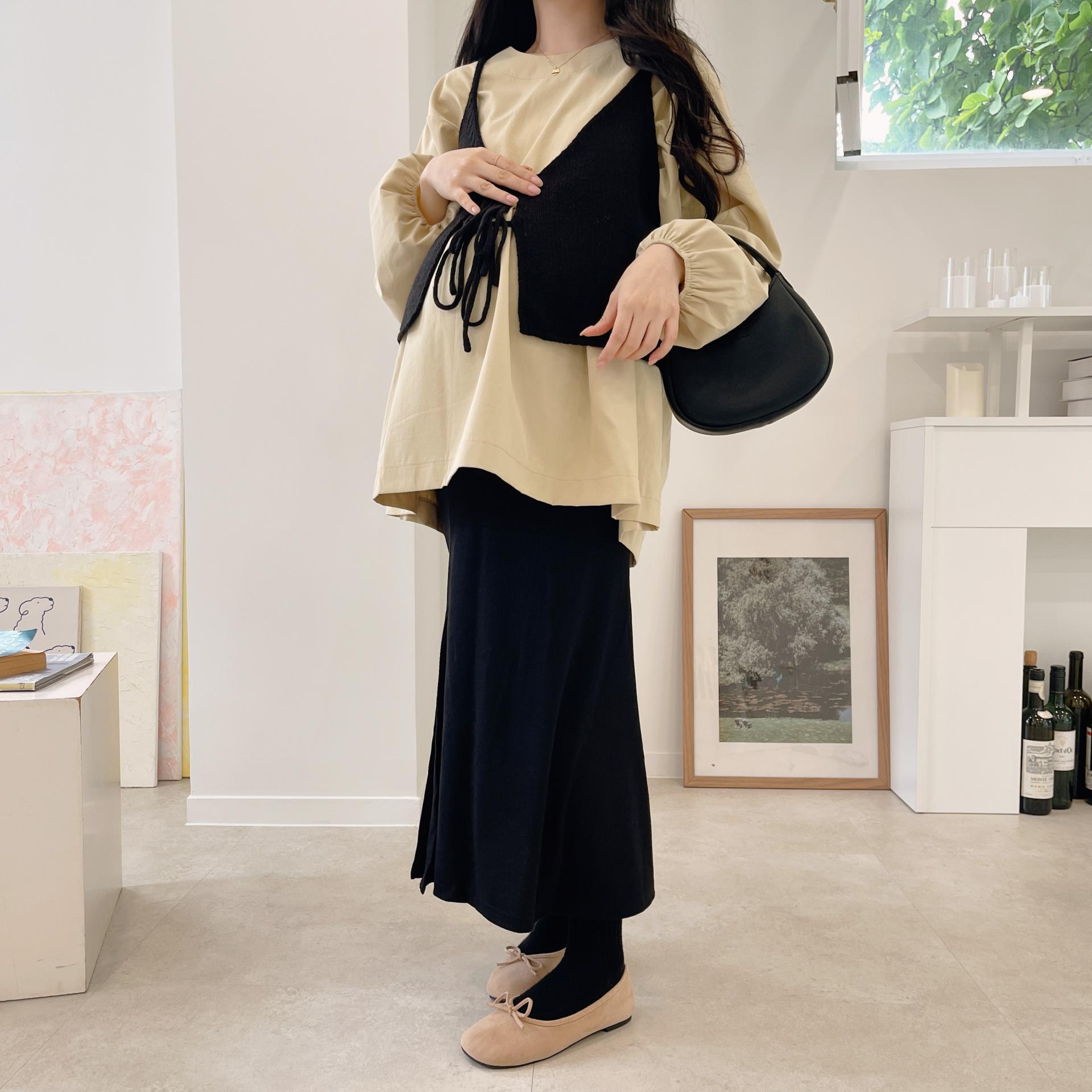 랜드블라우스(베이지) + 덴리본니트뷔스티에(블랙)