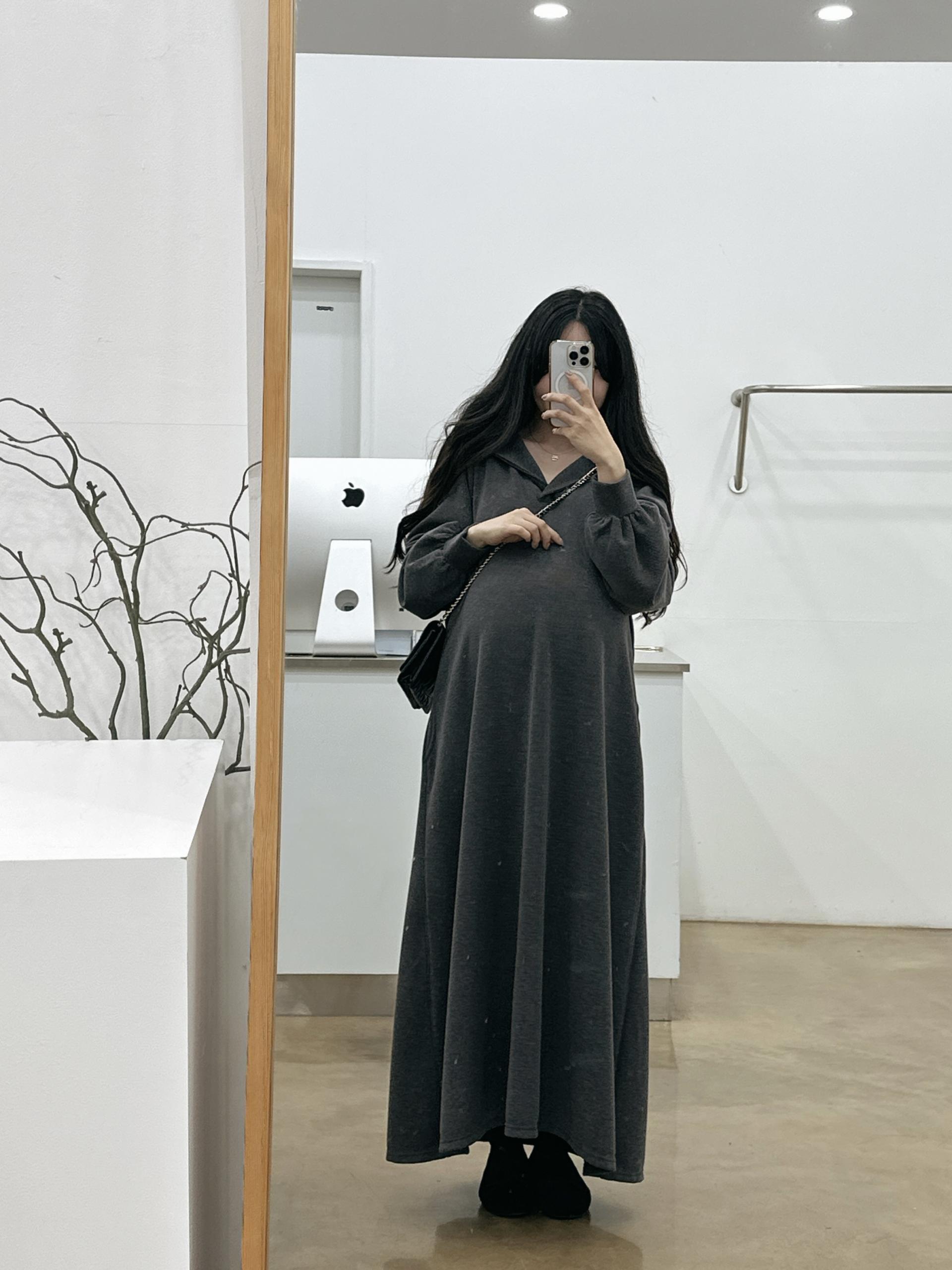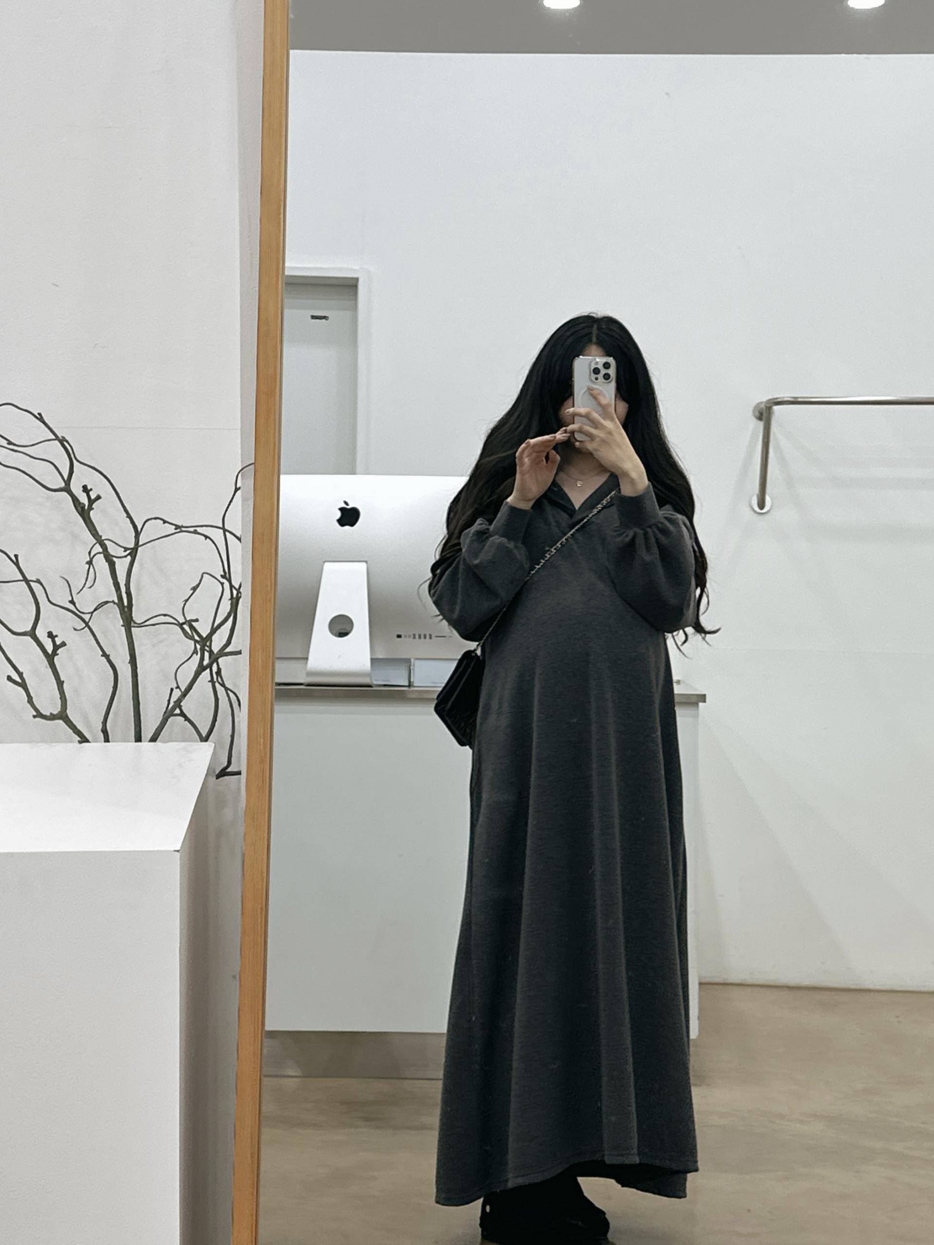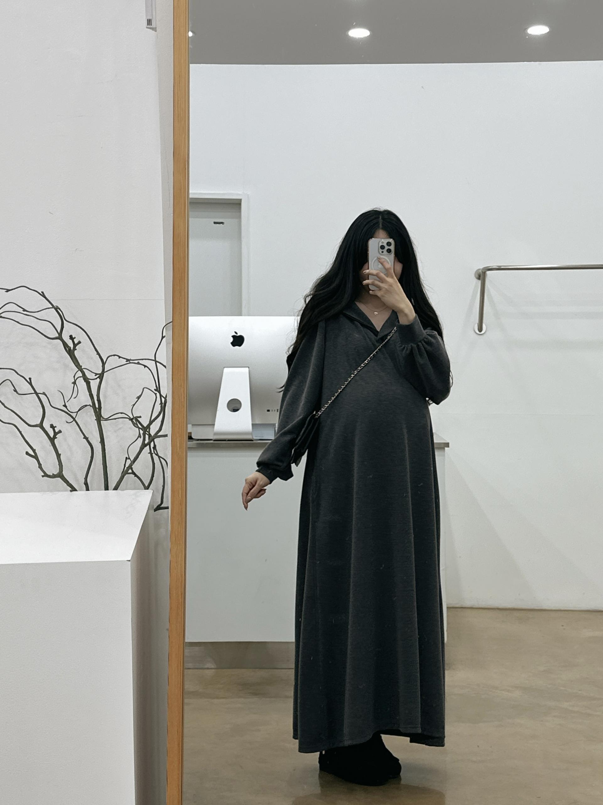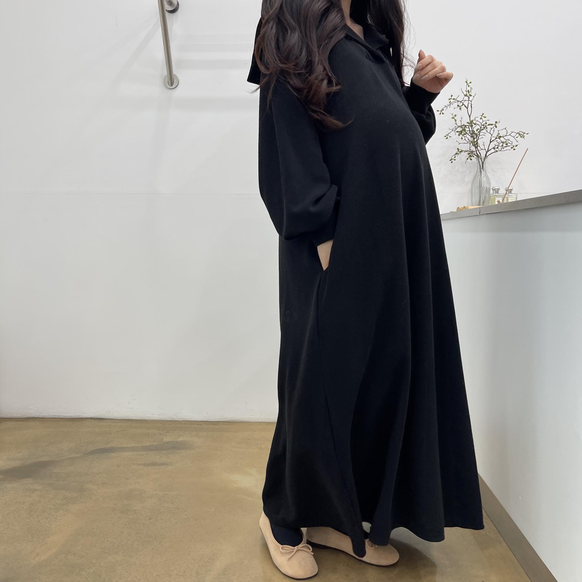 맥시한 롱 기장감에 세일러카라로 여성스럽게, v넥라인으로 목선도 예뻐보이는