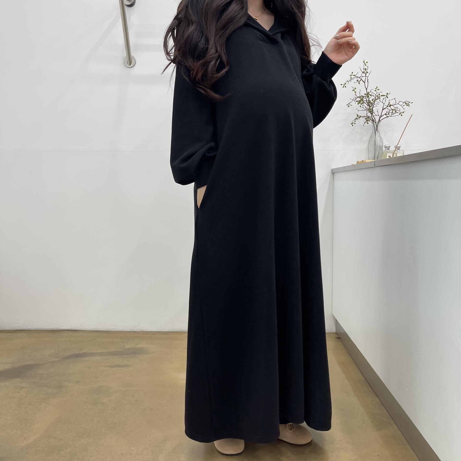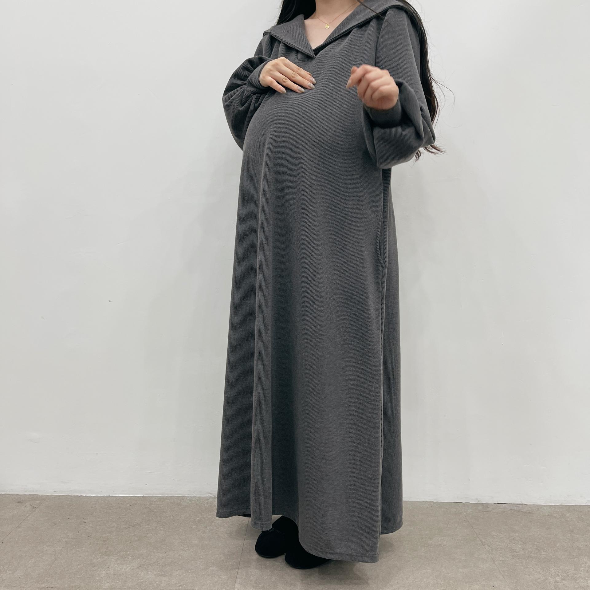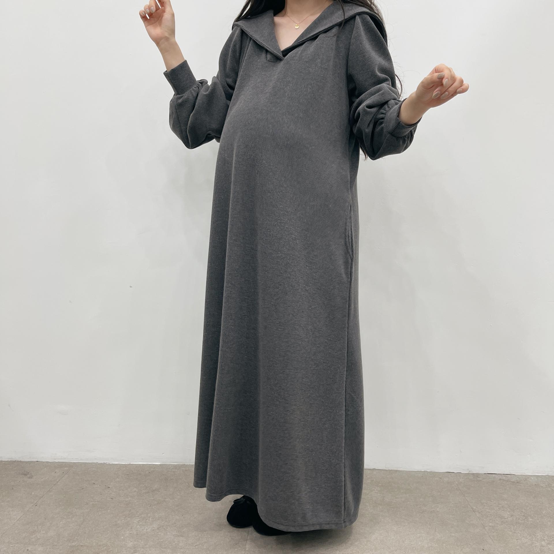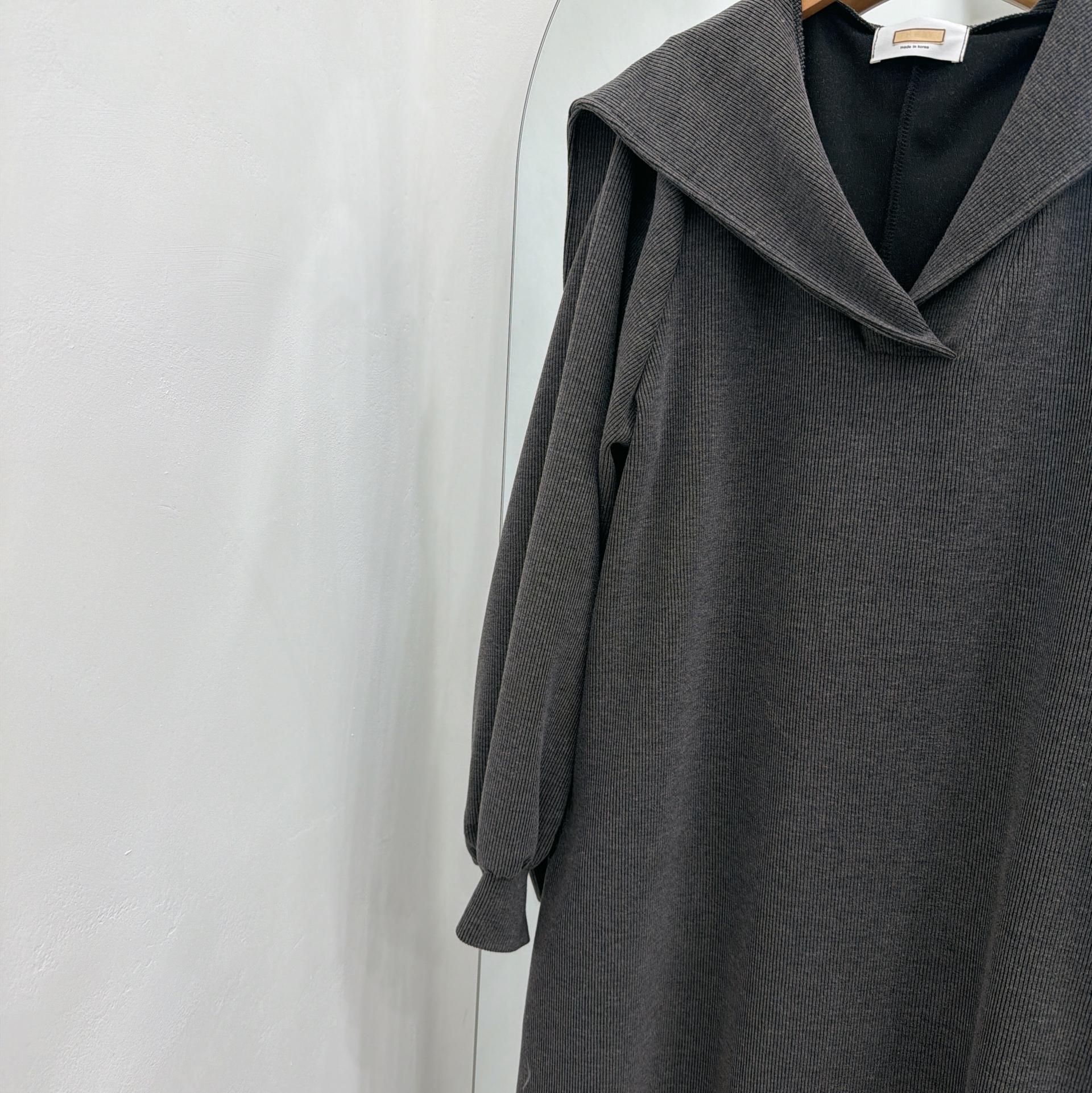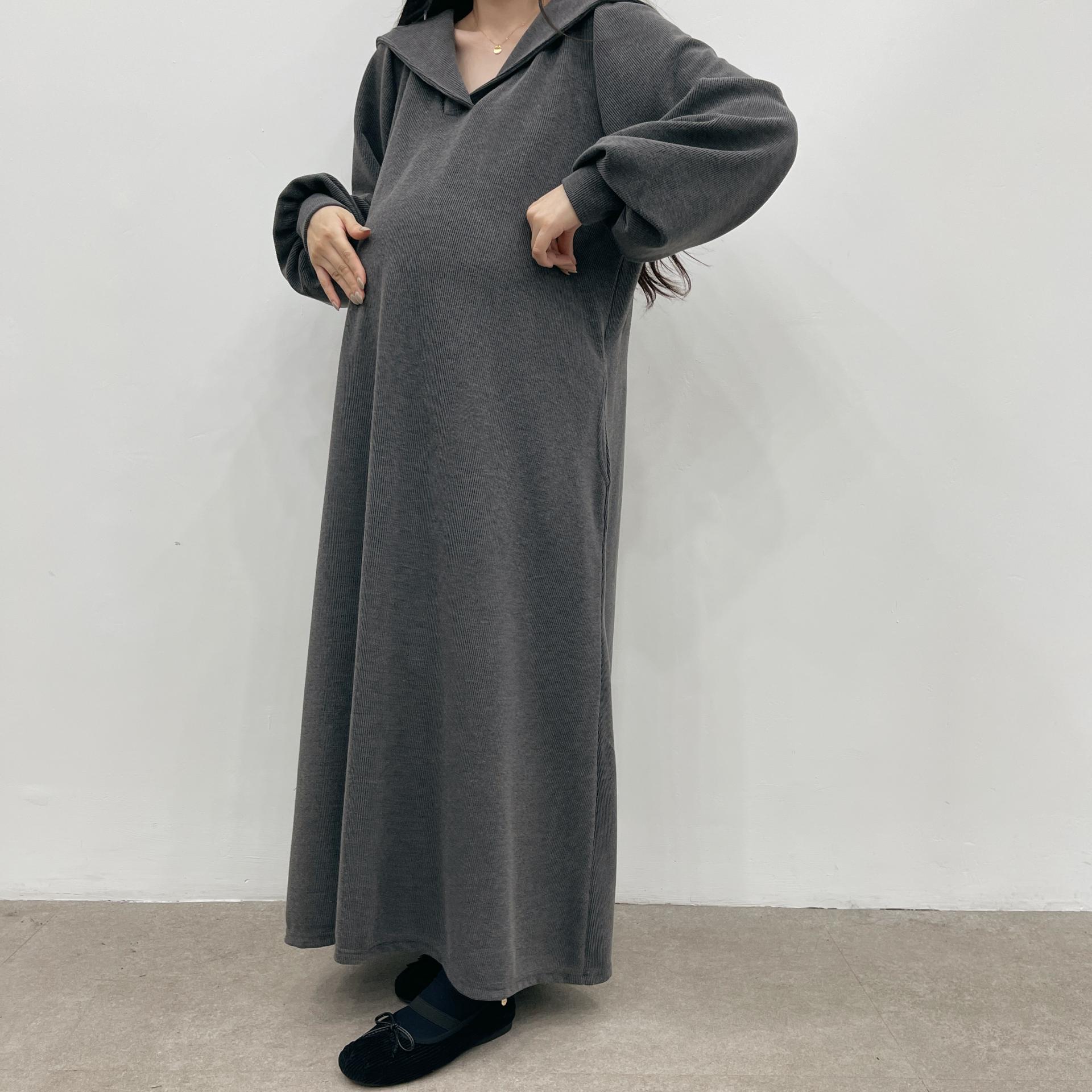 맥시한 롱 기장감에 세일러카라로 여성스럽게, v넥라인으로 목선도 예뻐보이는