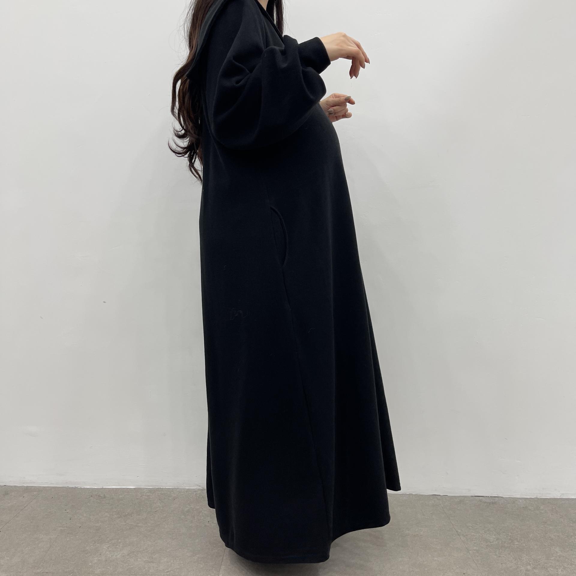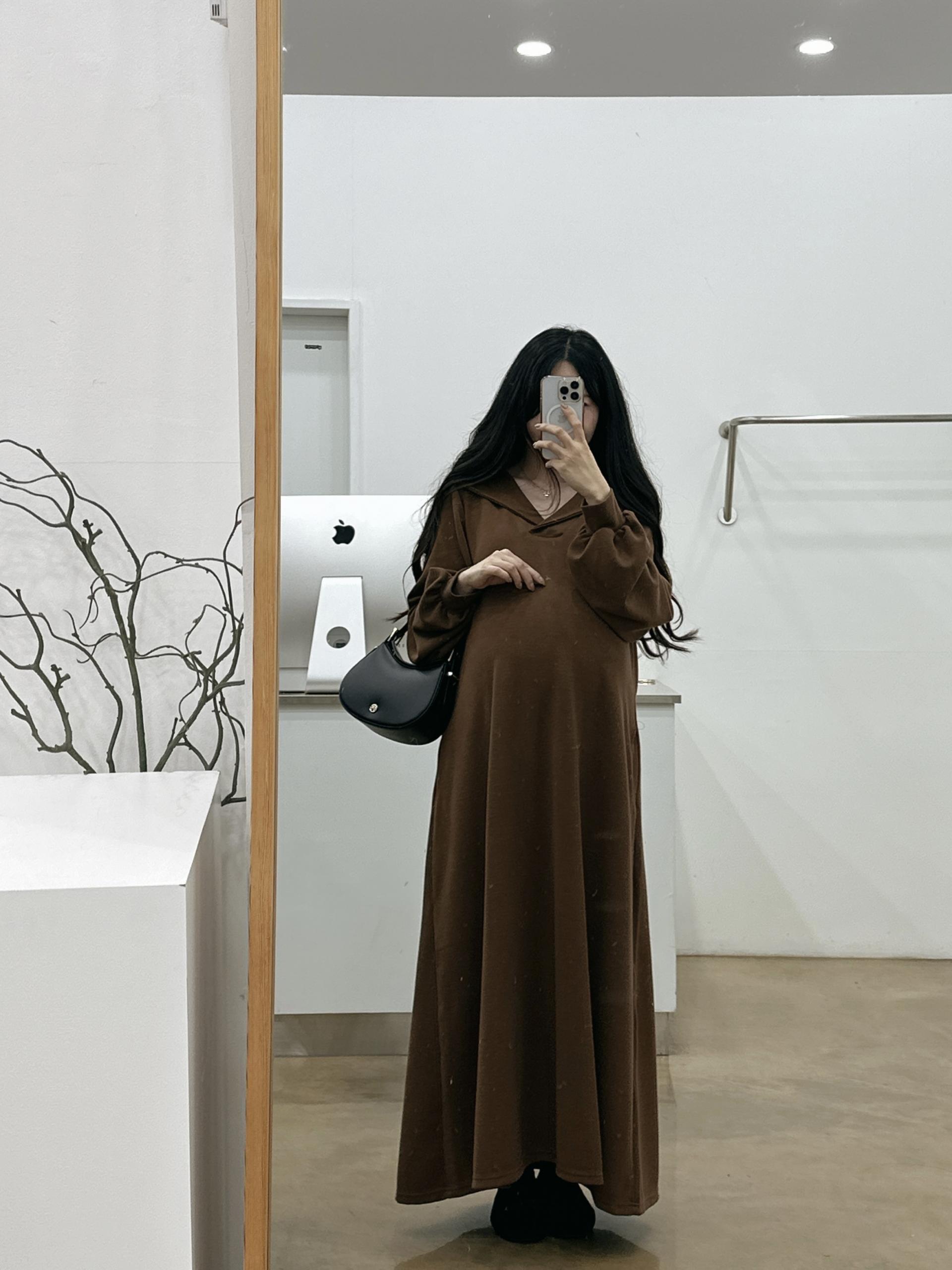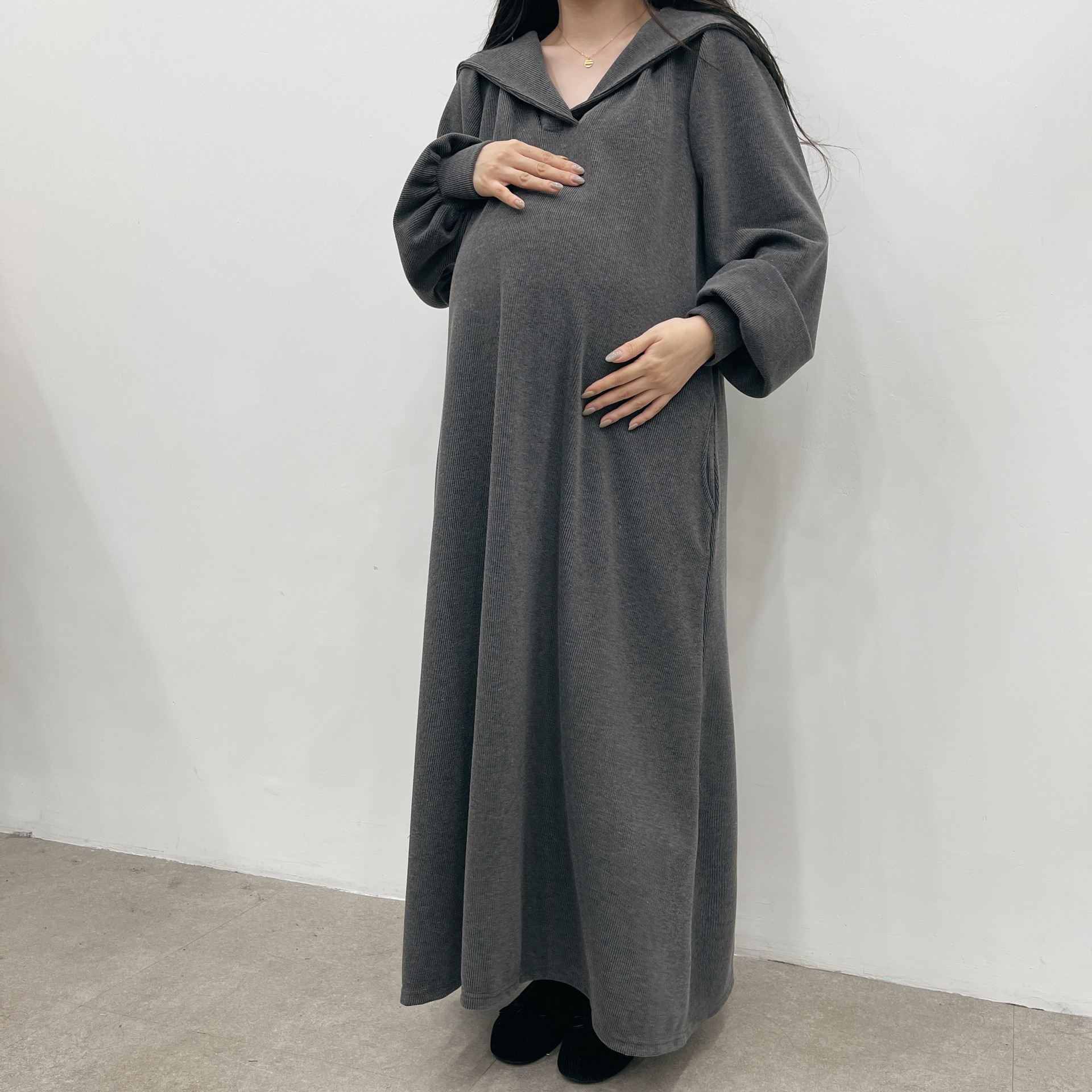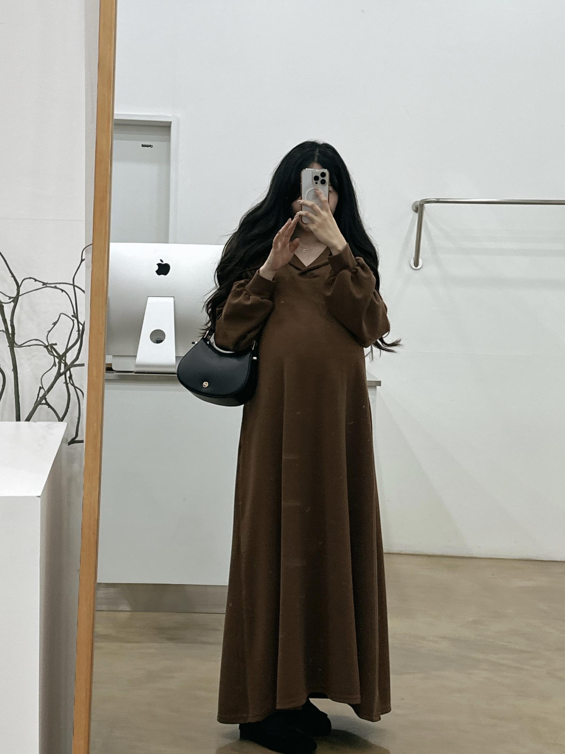 맥시한 롱 기장감에 세일러카라로 여성스럽게, v넥라인으로 목선도 예뻐보이는