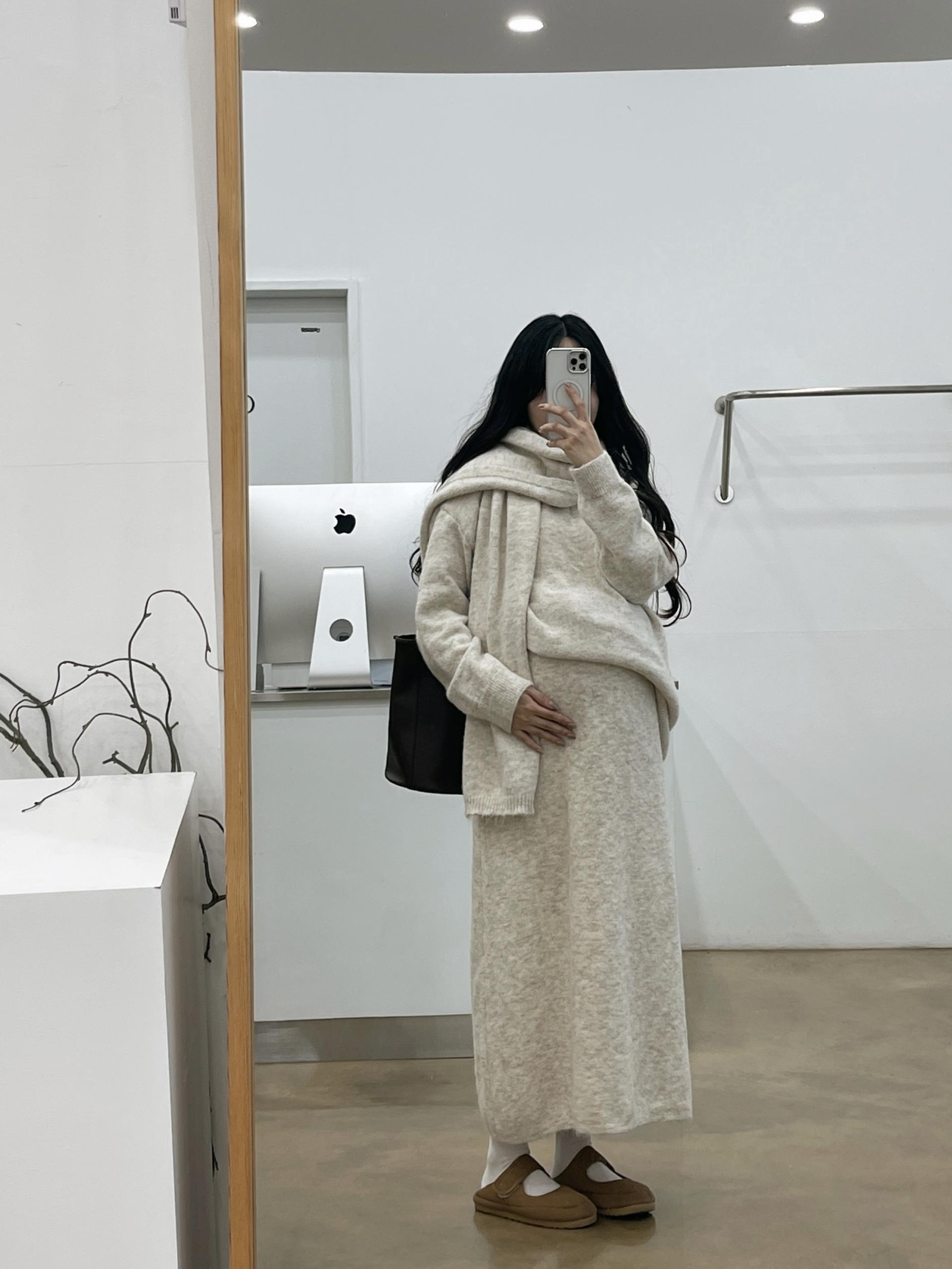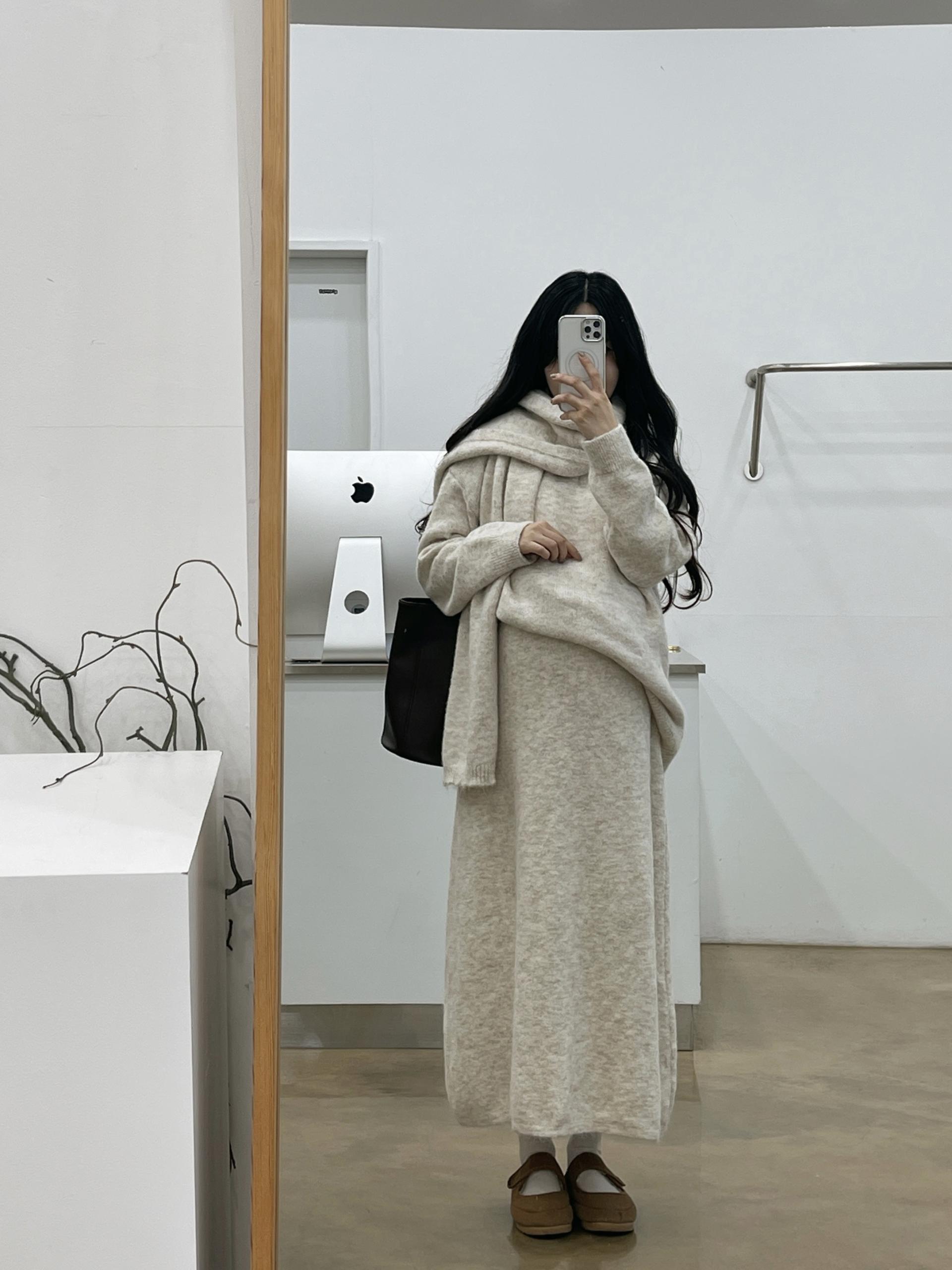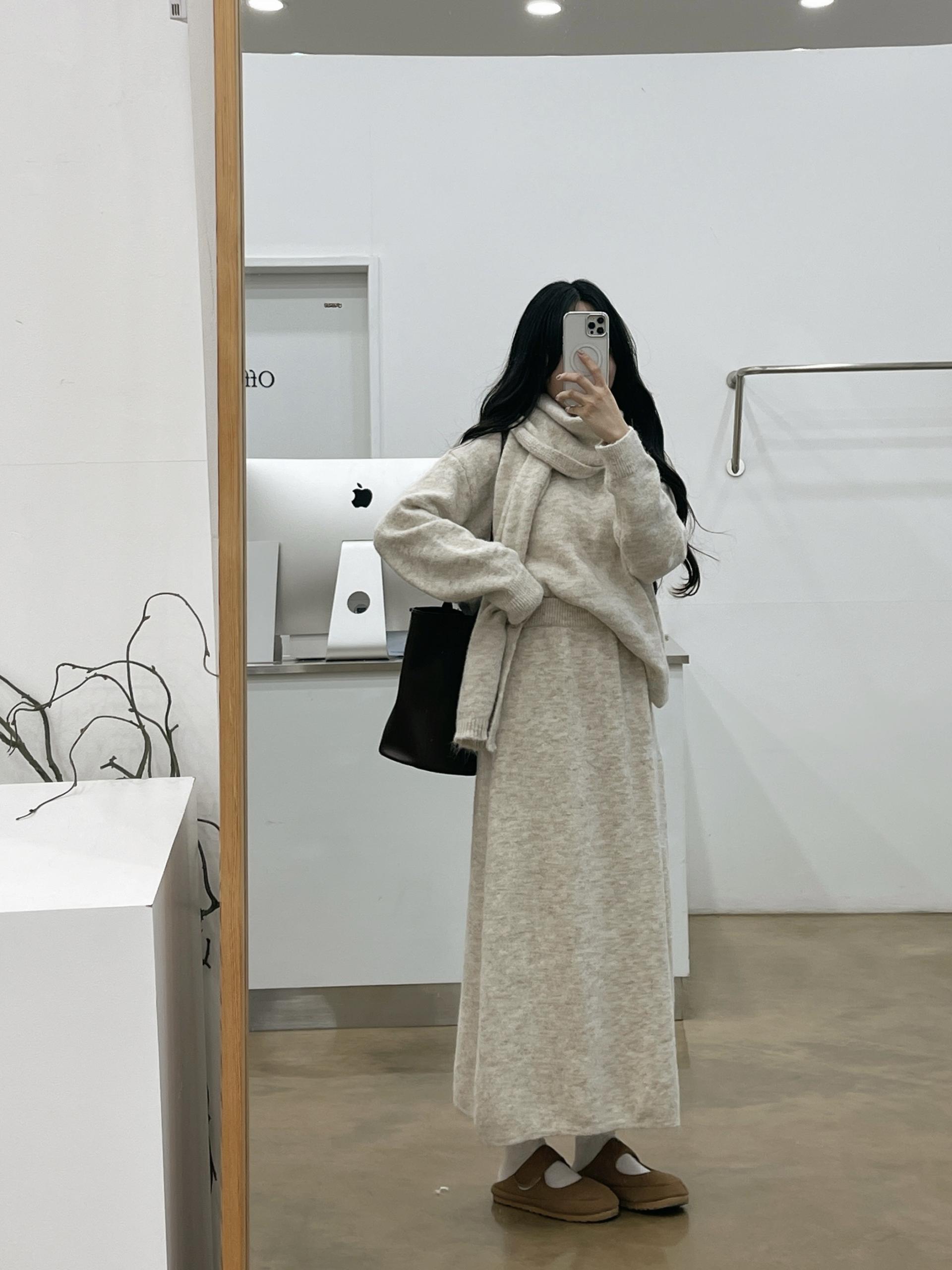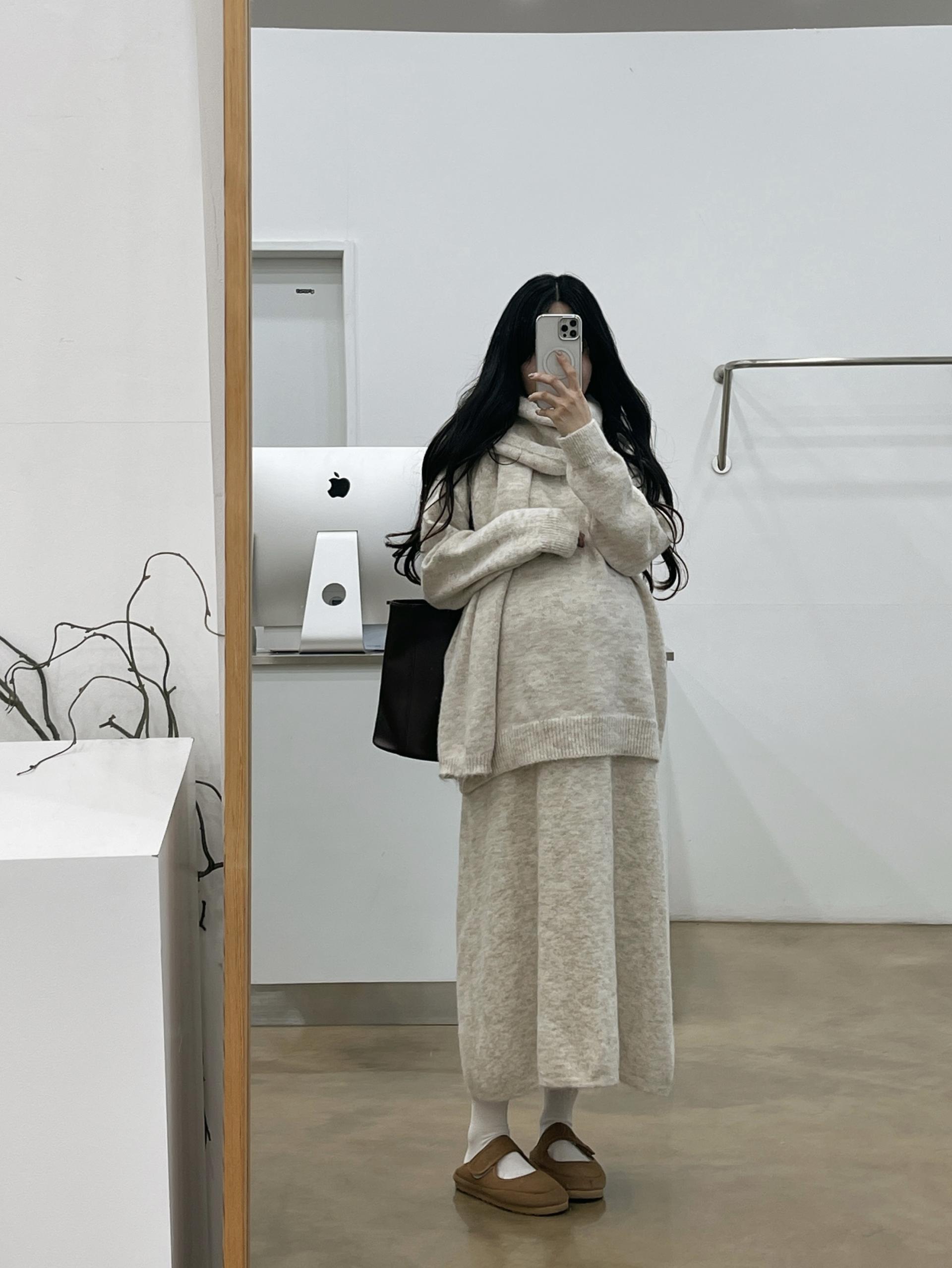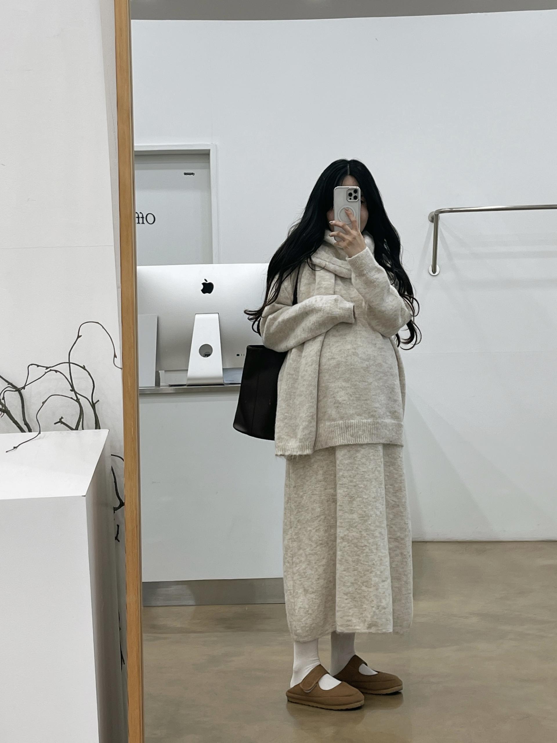 힙.배덮기장의 V넥니트와 스커트 그리고 머플러가 세트입니다