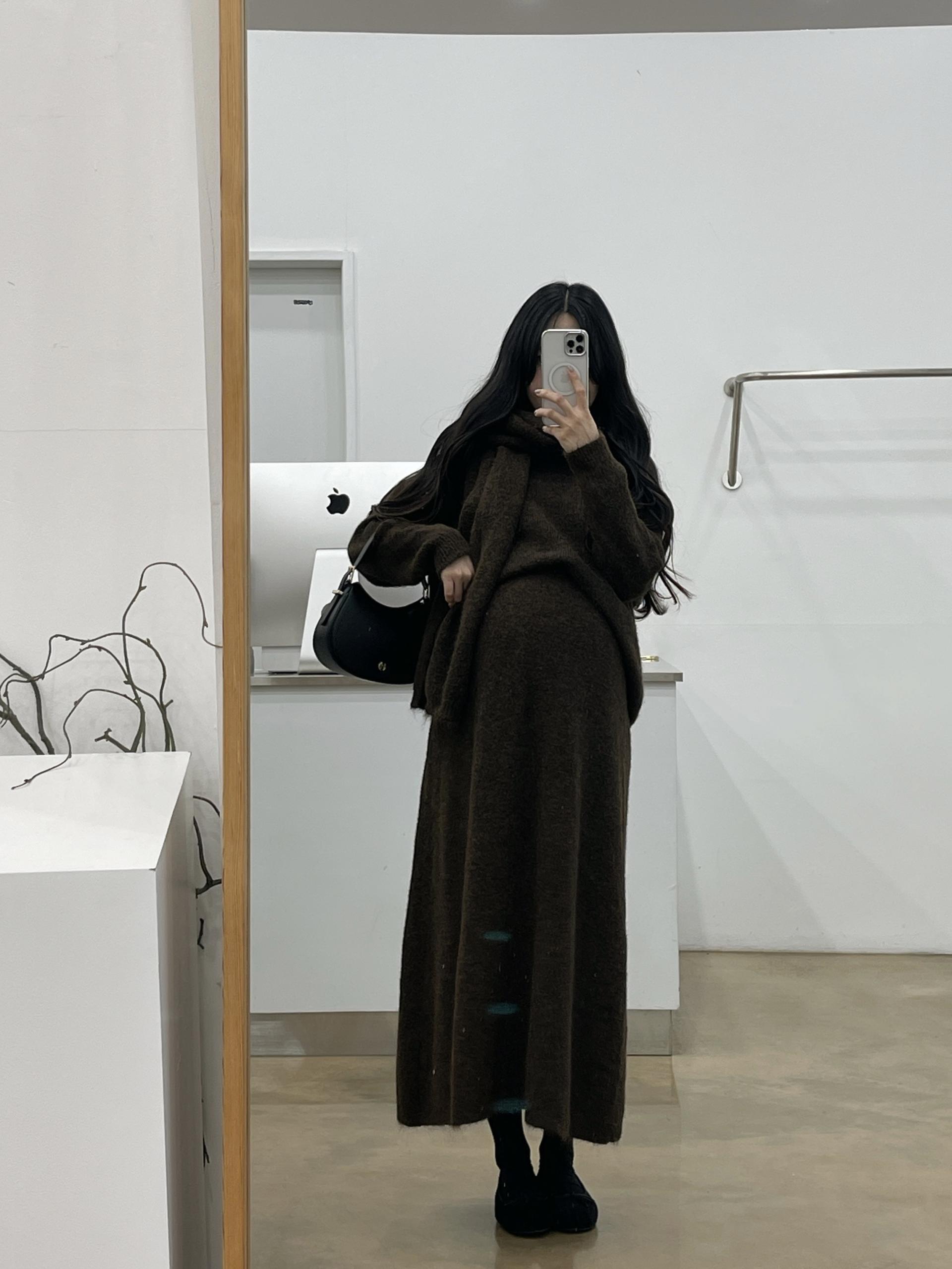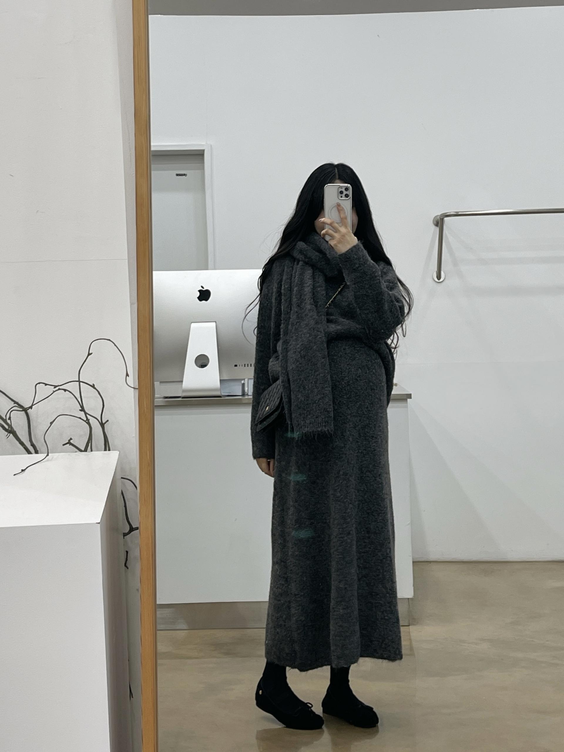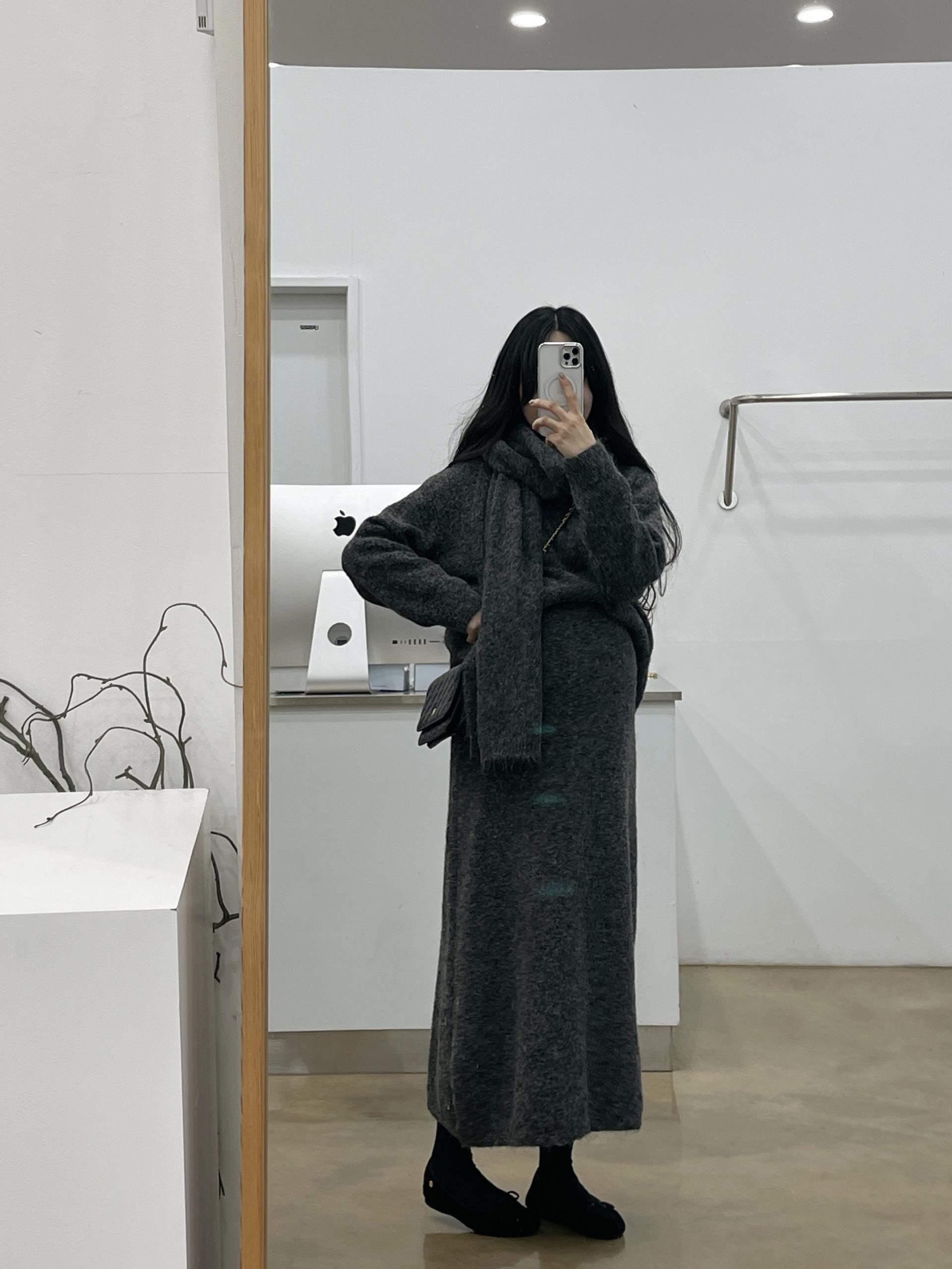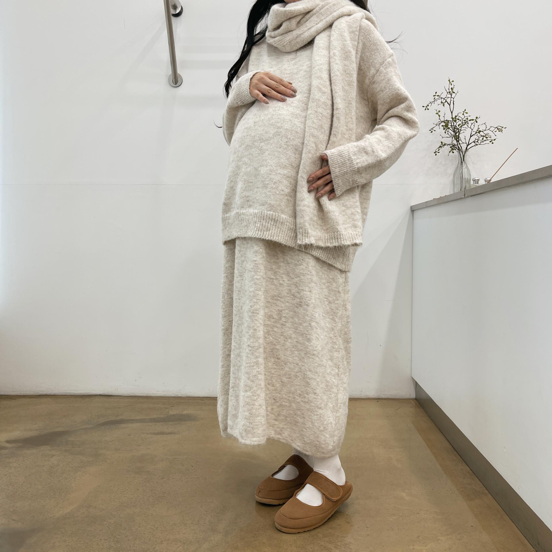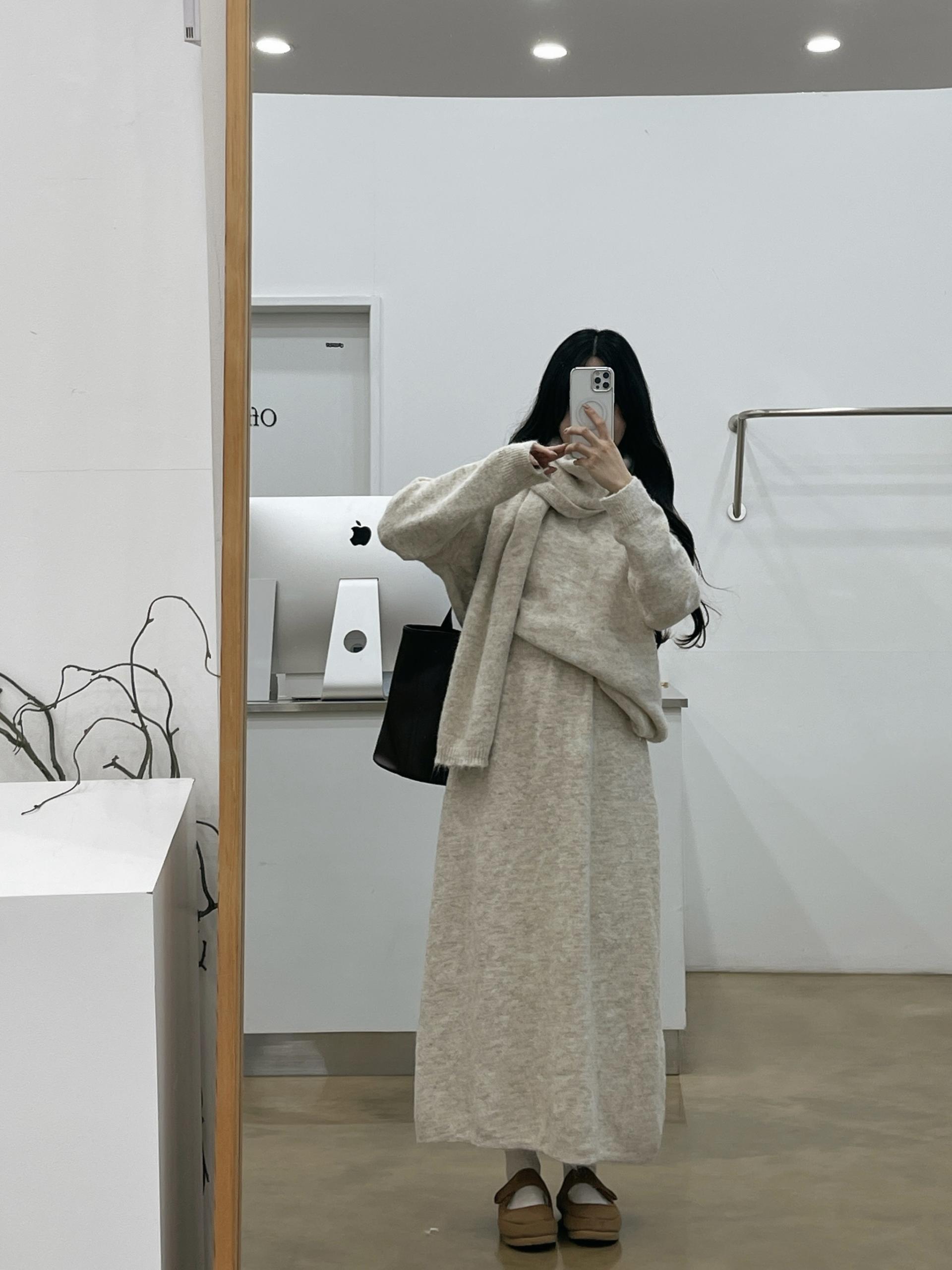 힙.배덮기장의 V넥니트와 스커트 그리고 머플러가 세트입니다