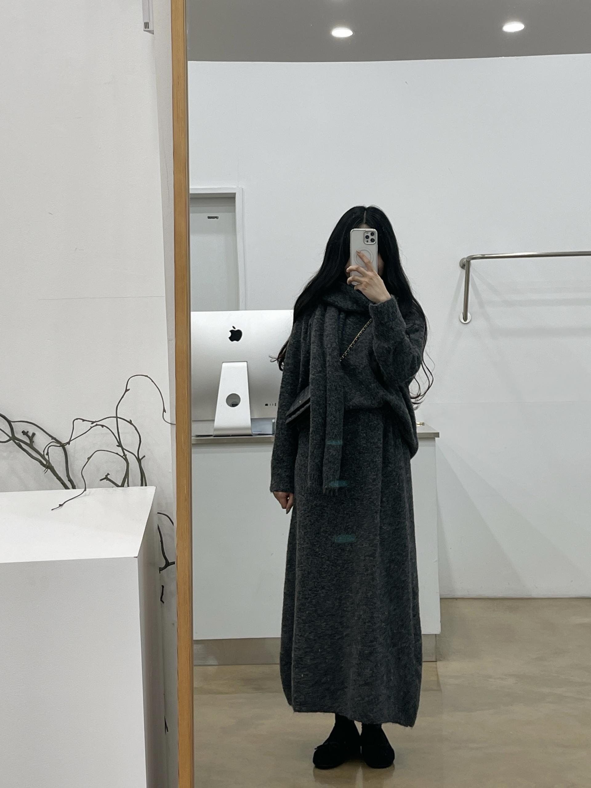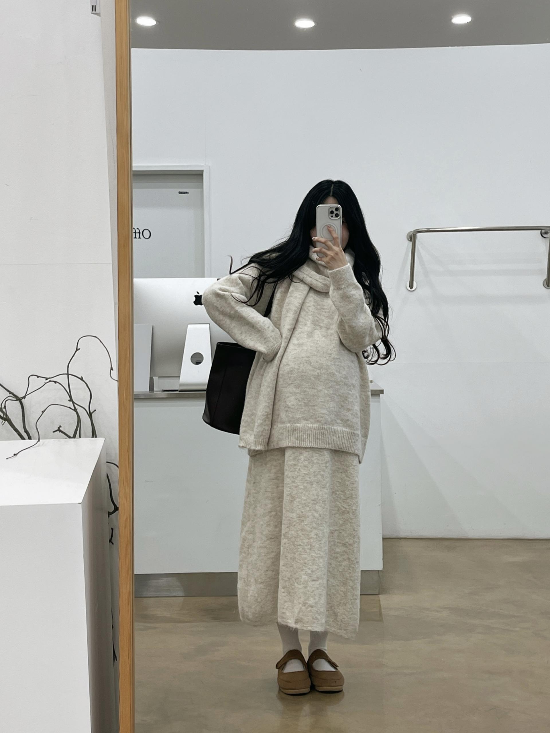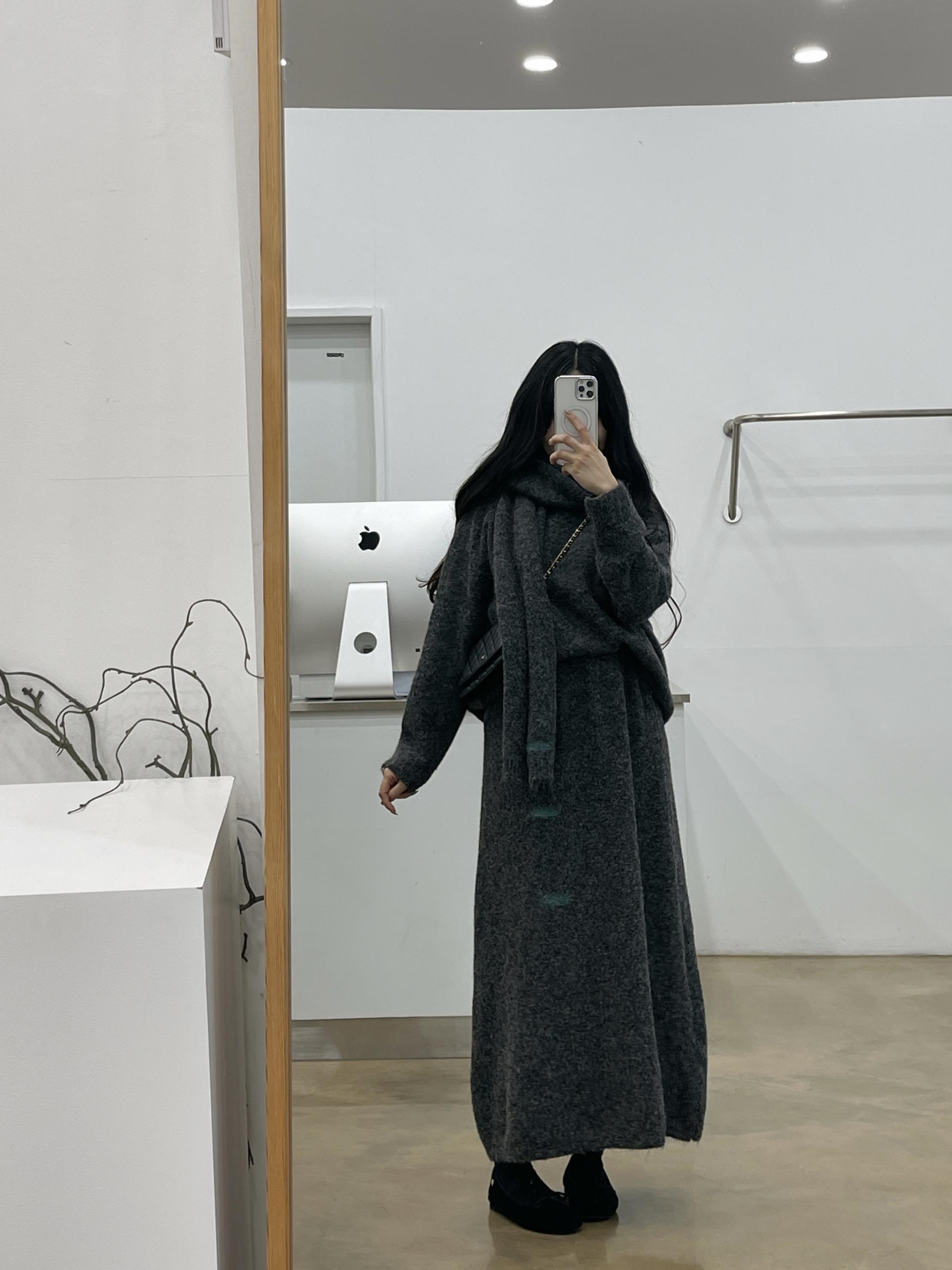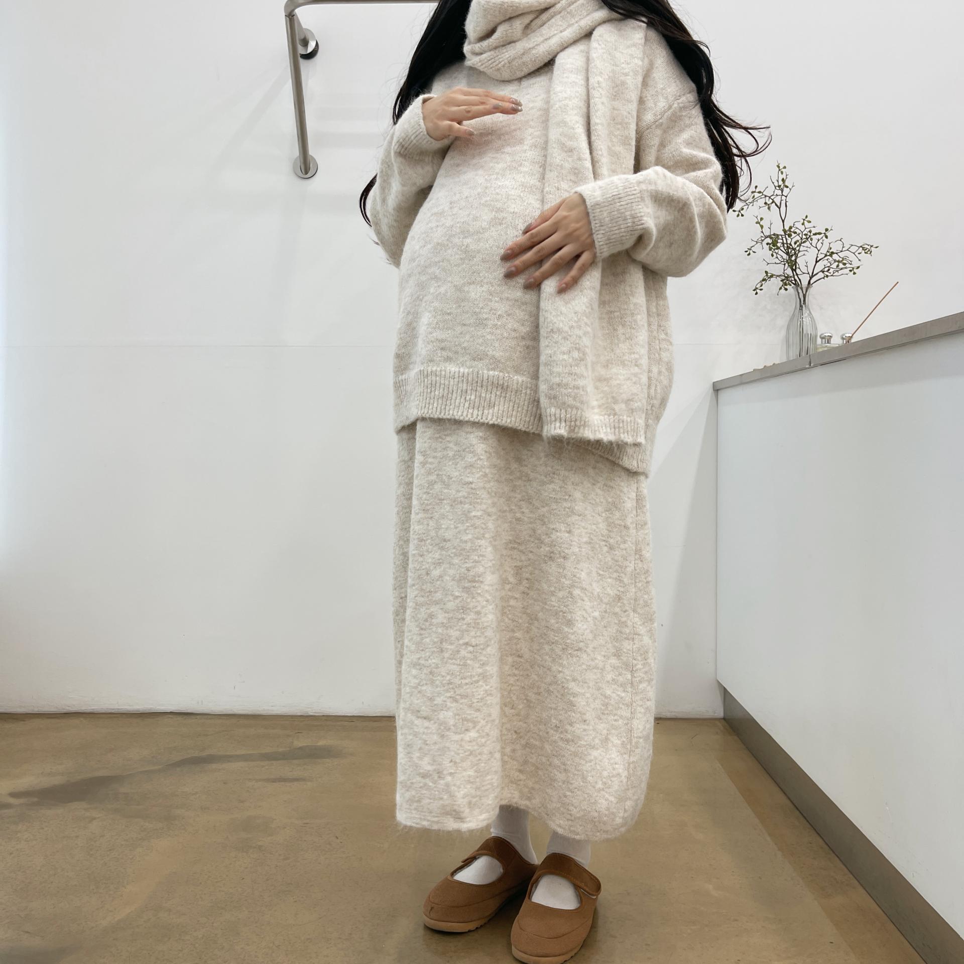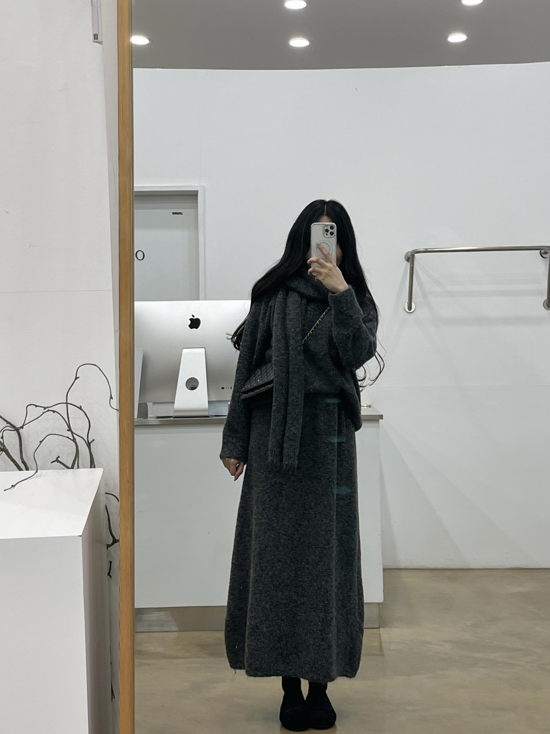 힙.배덮기장의 V넥니트와 스커트 그리고 머플러가 세트입니다