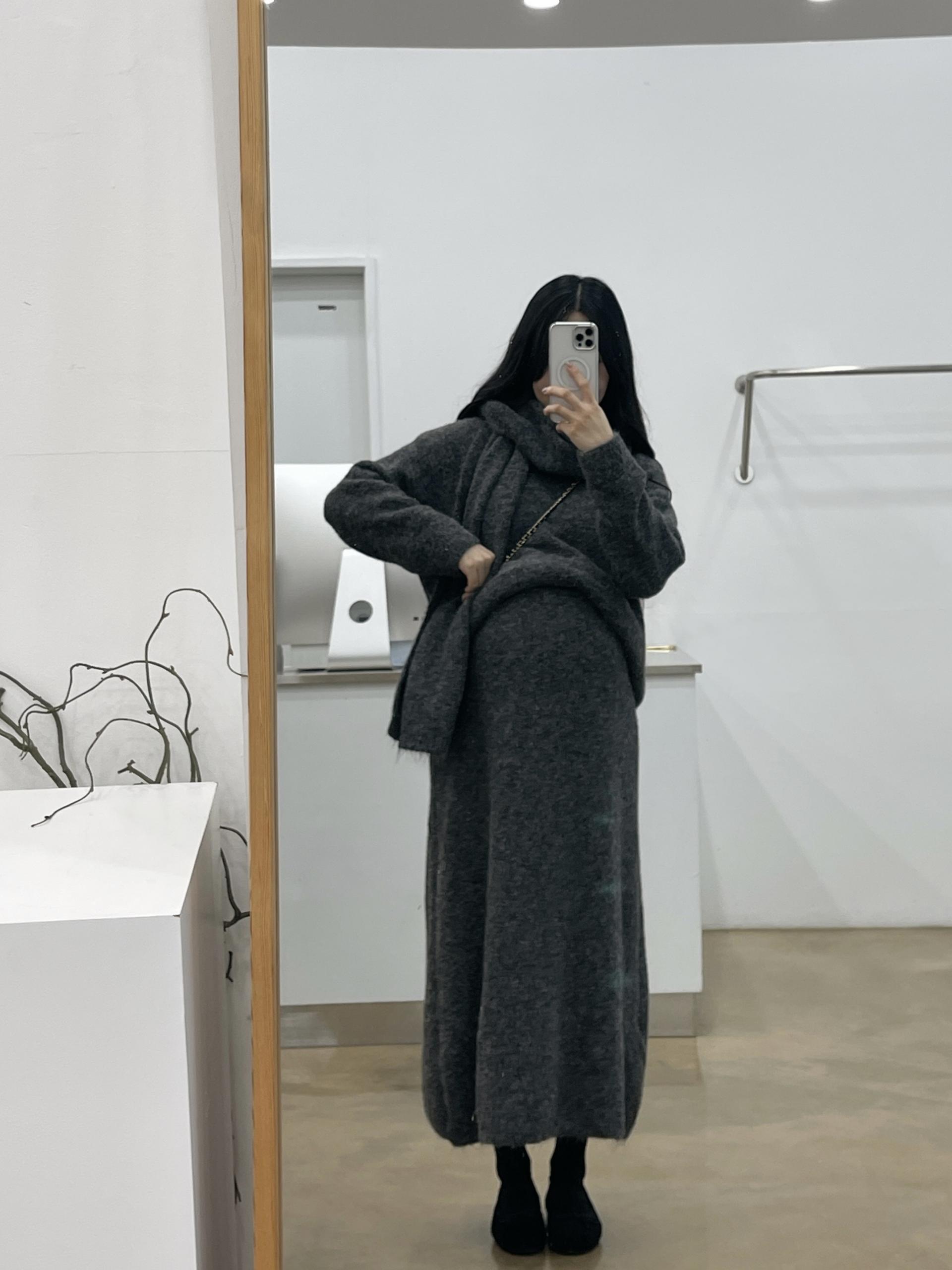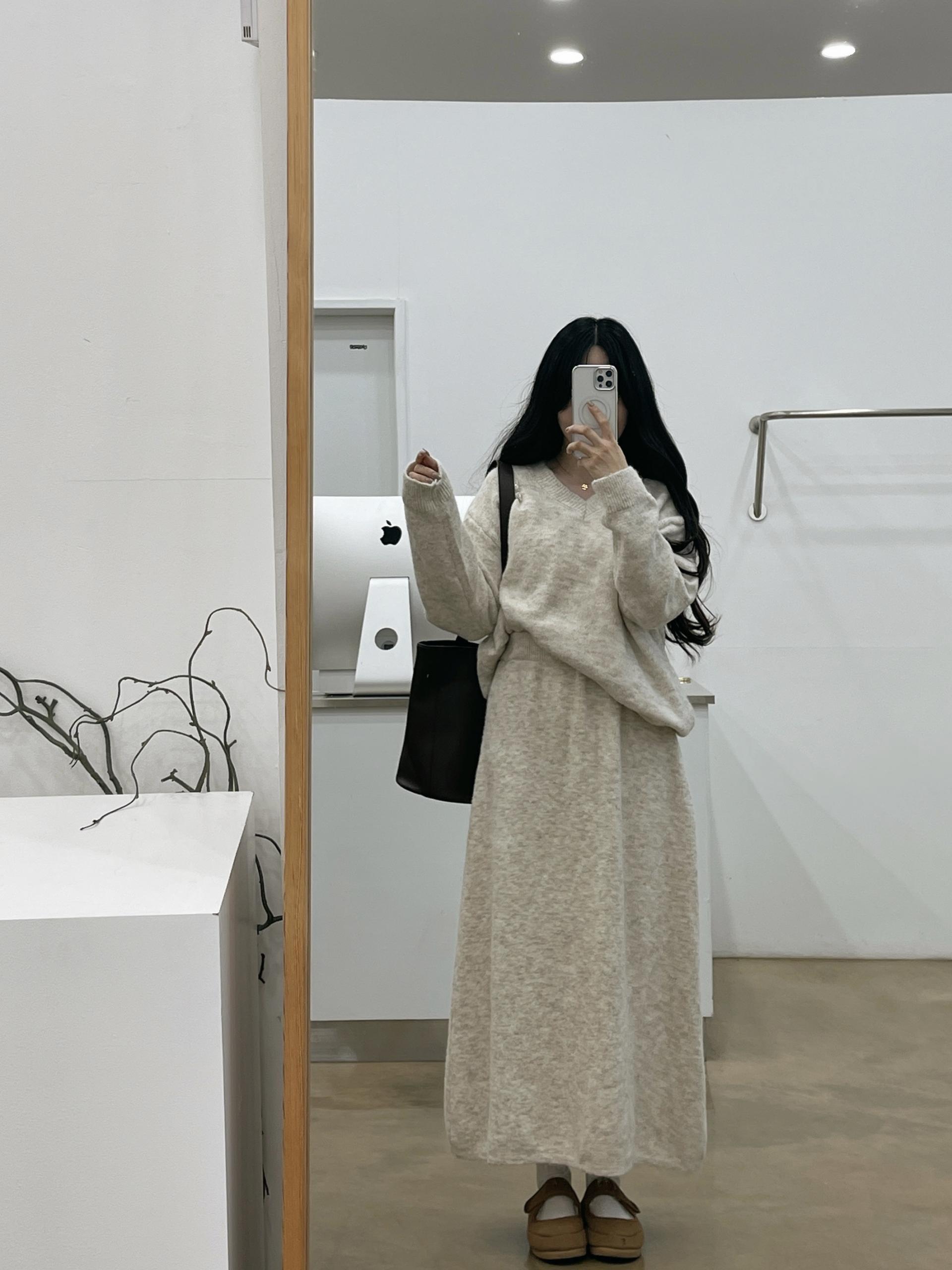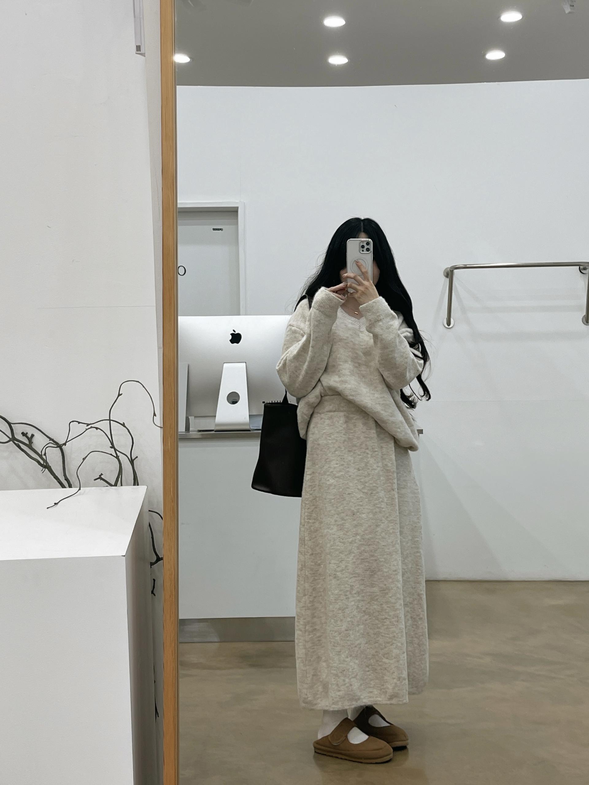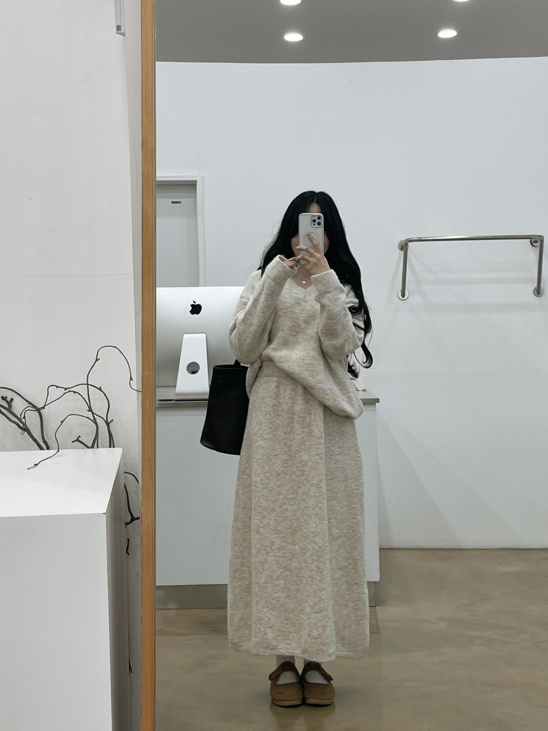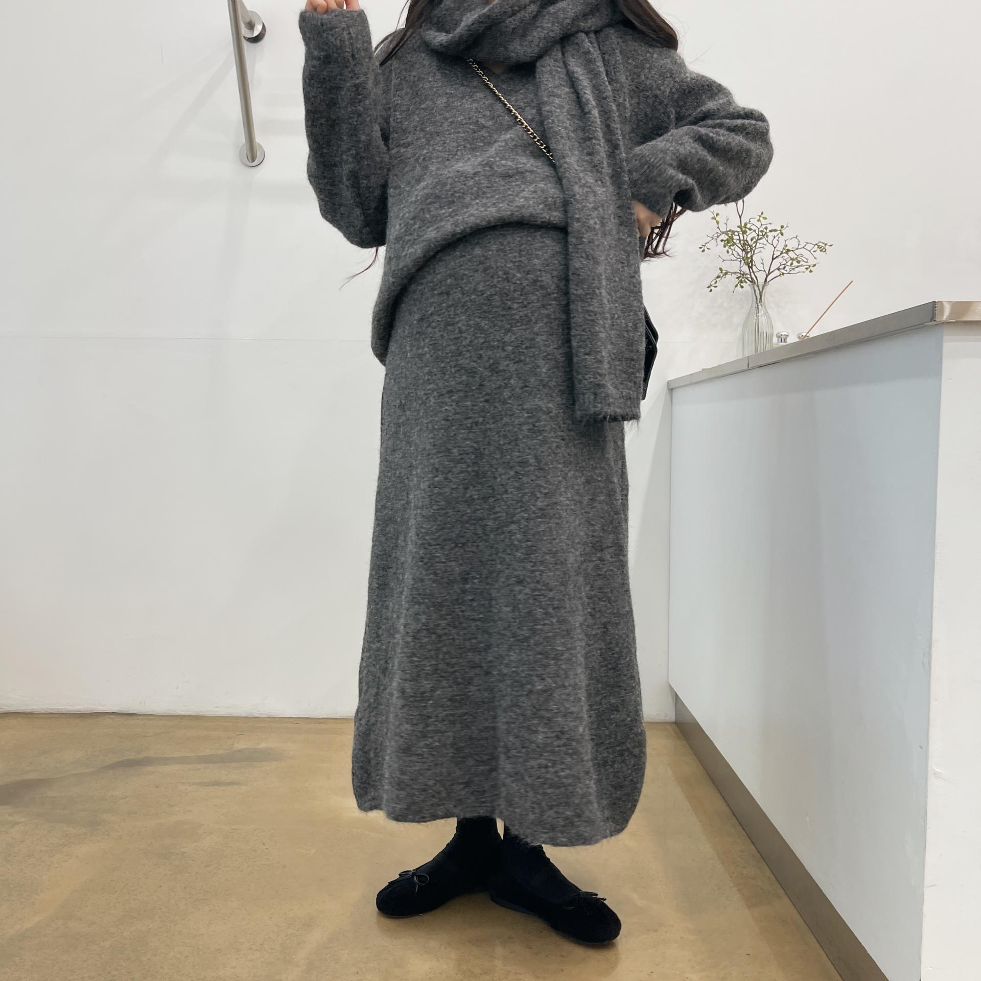 힙.배덮기장의 V넥니트와 스커트 그리고 머플러가 세트입니다