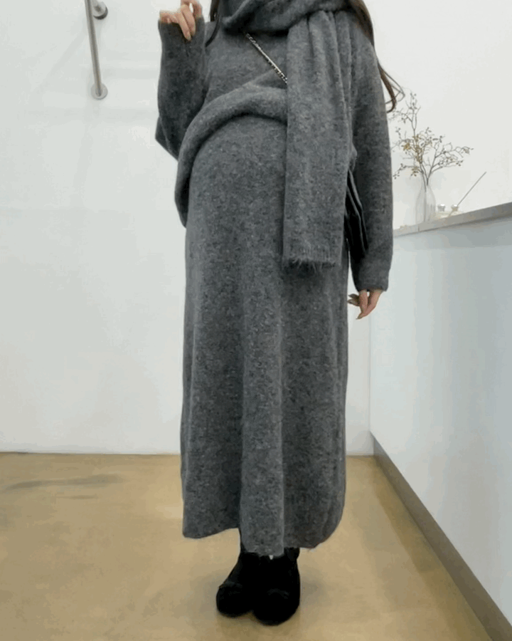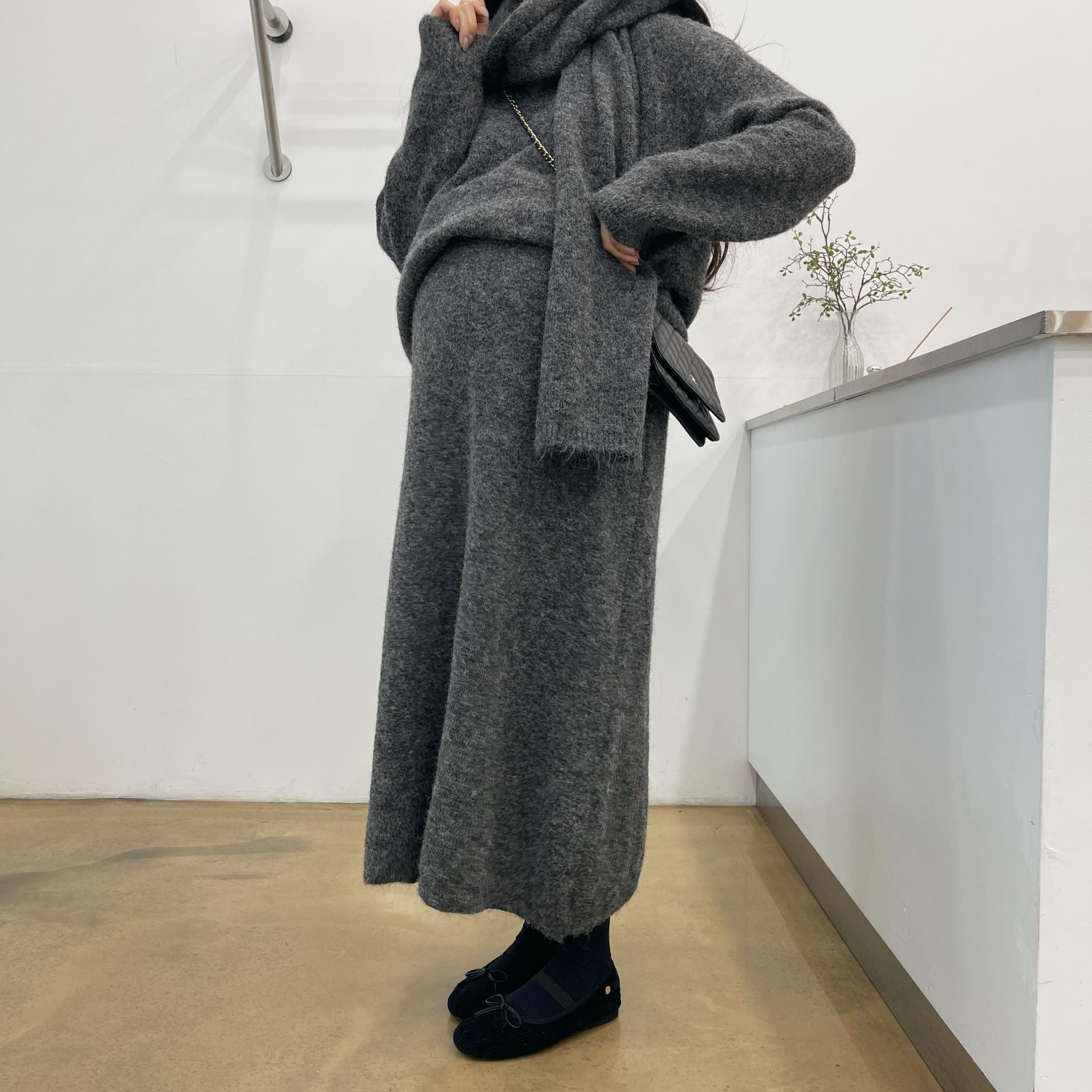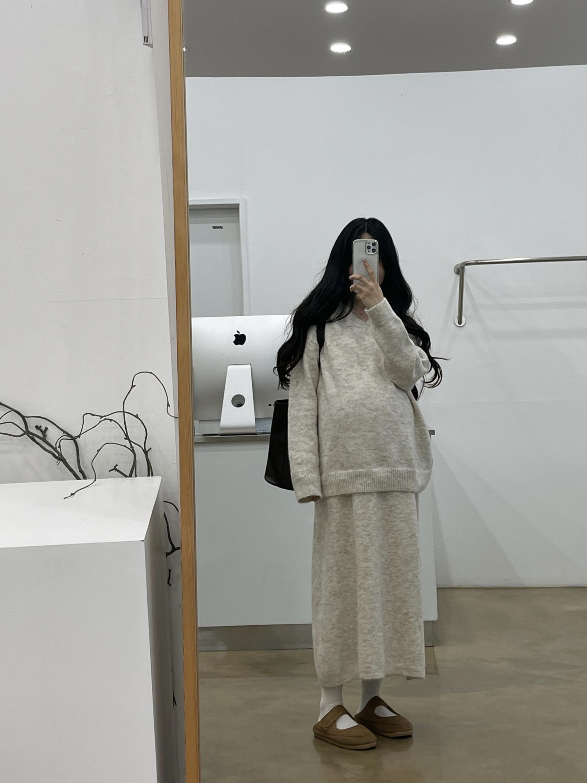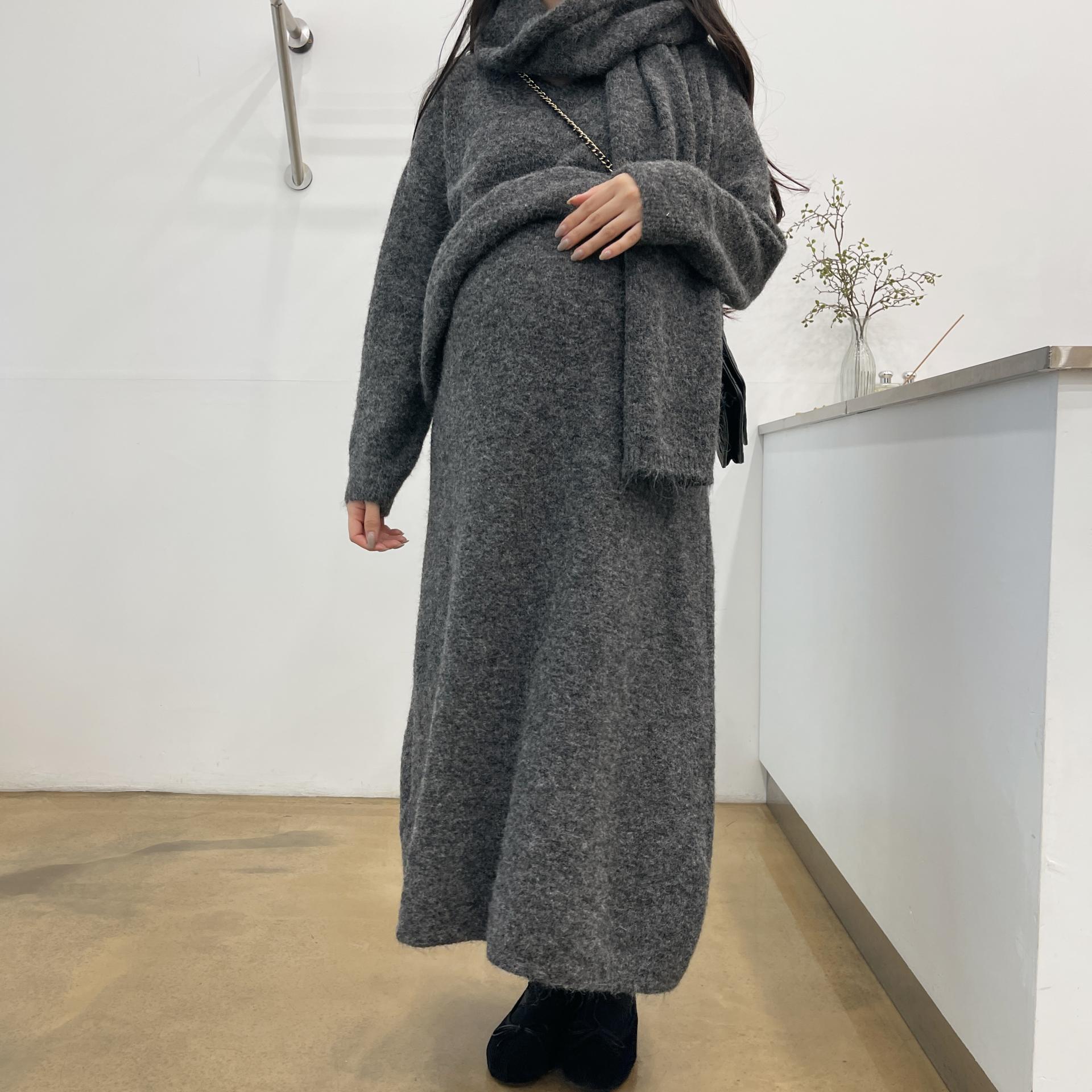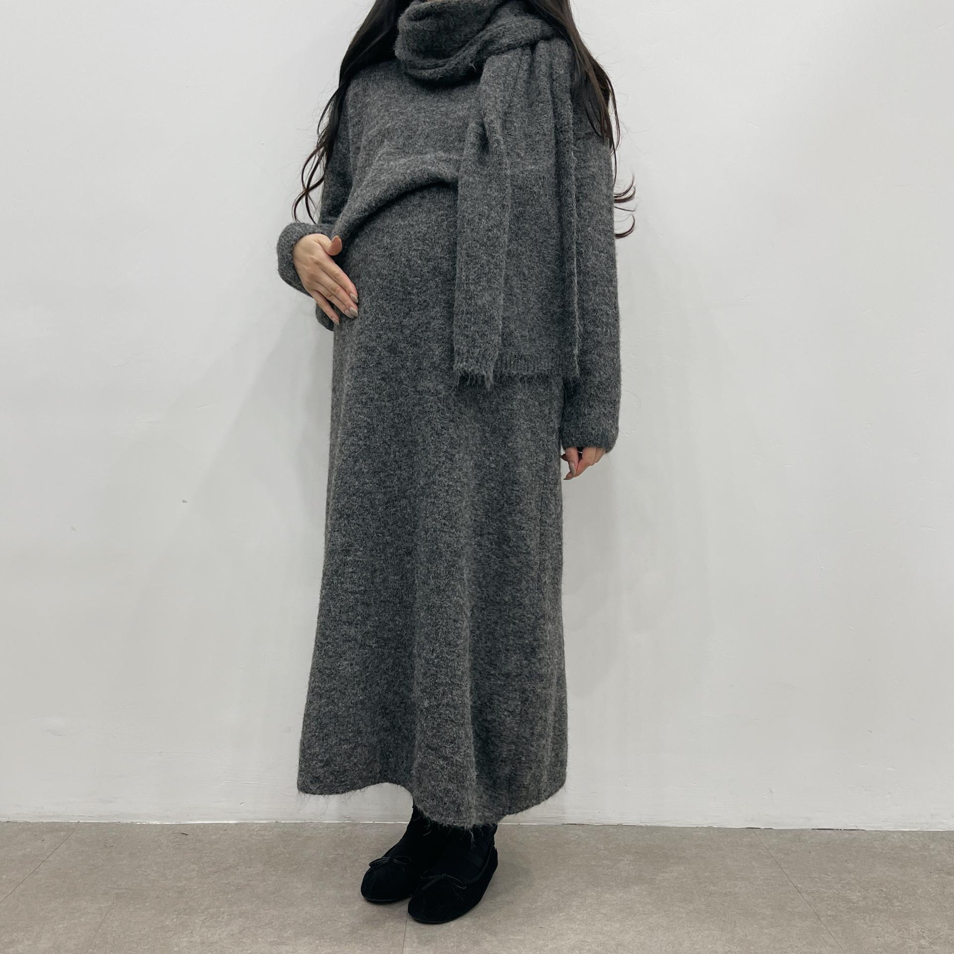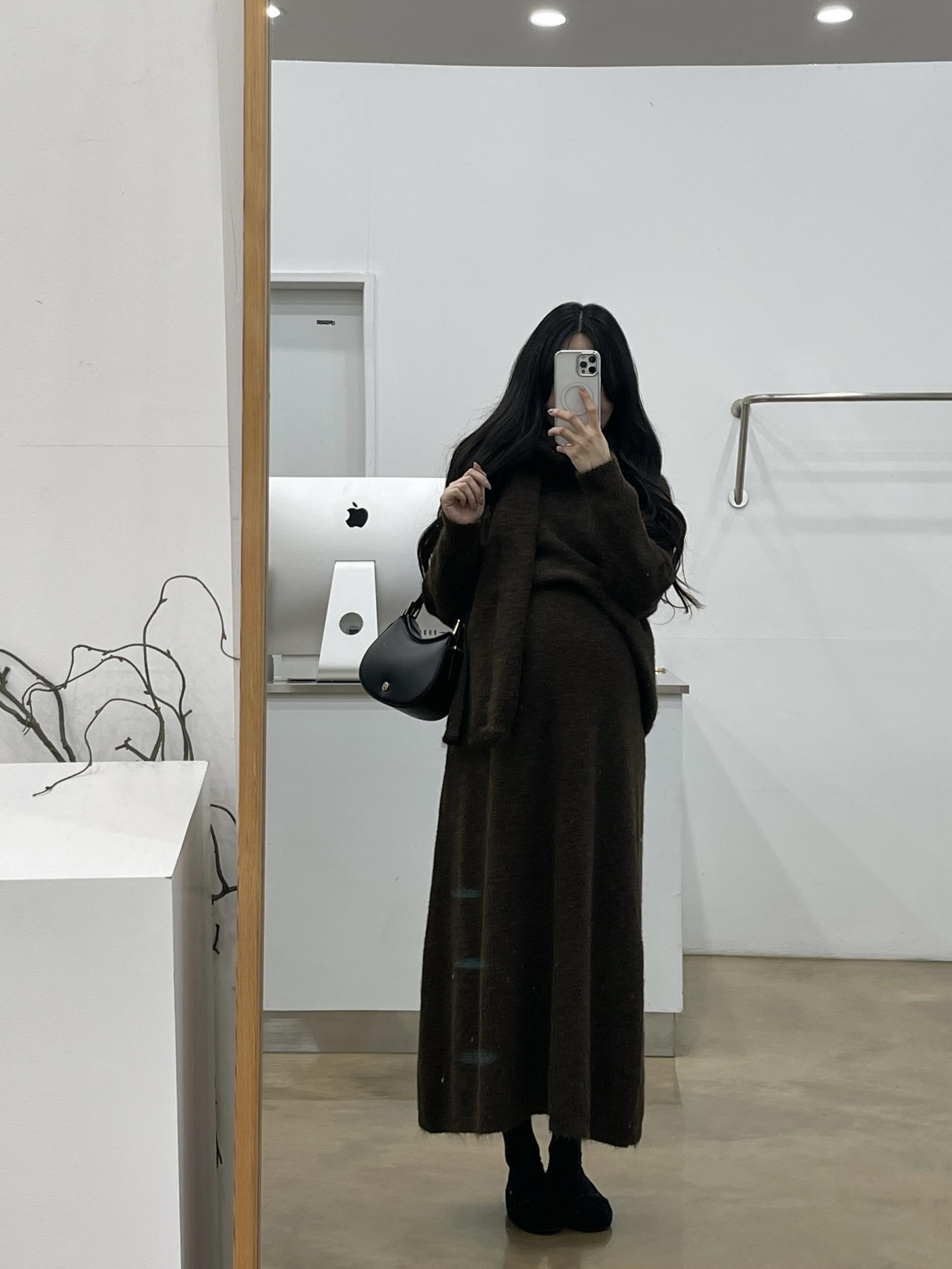 힙.배덮기장의 V넥니트와 스커트 그리고 머플러가 세트입니다