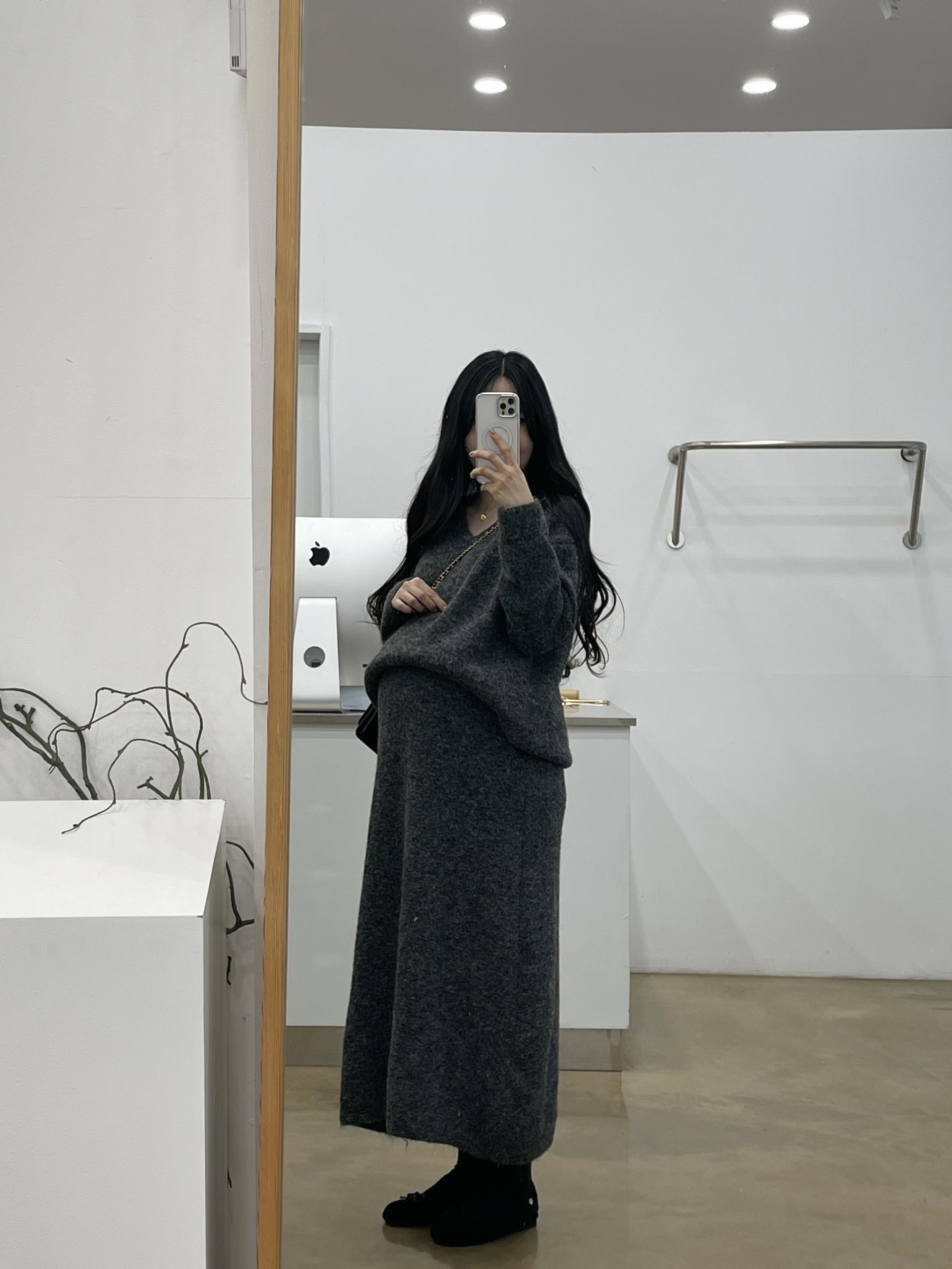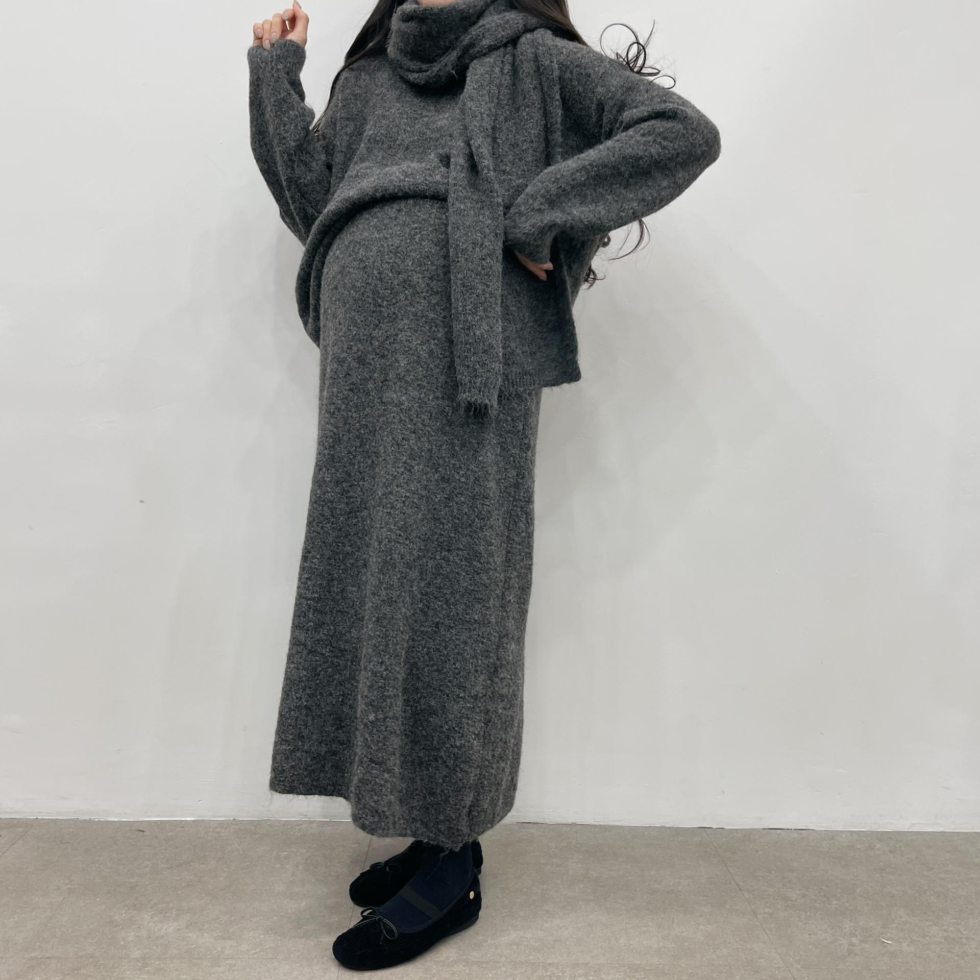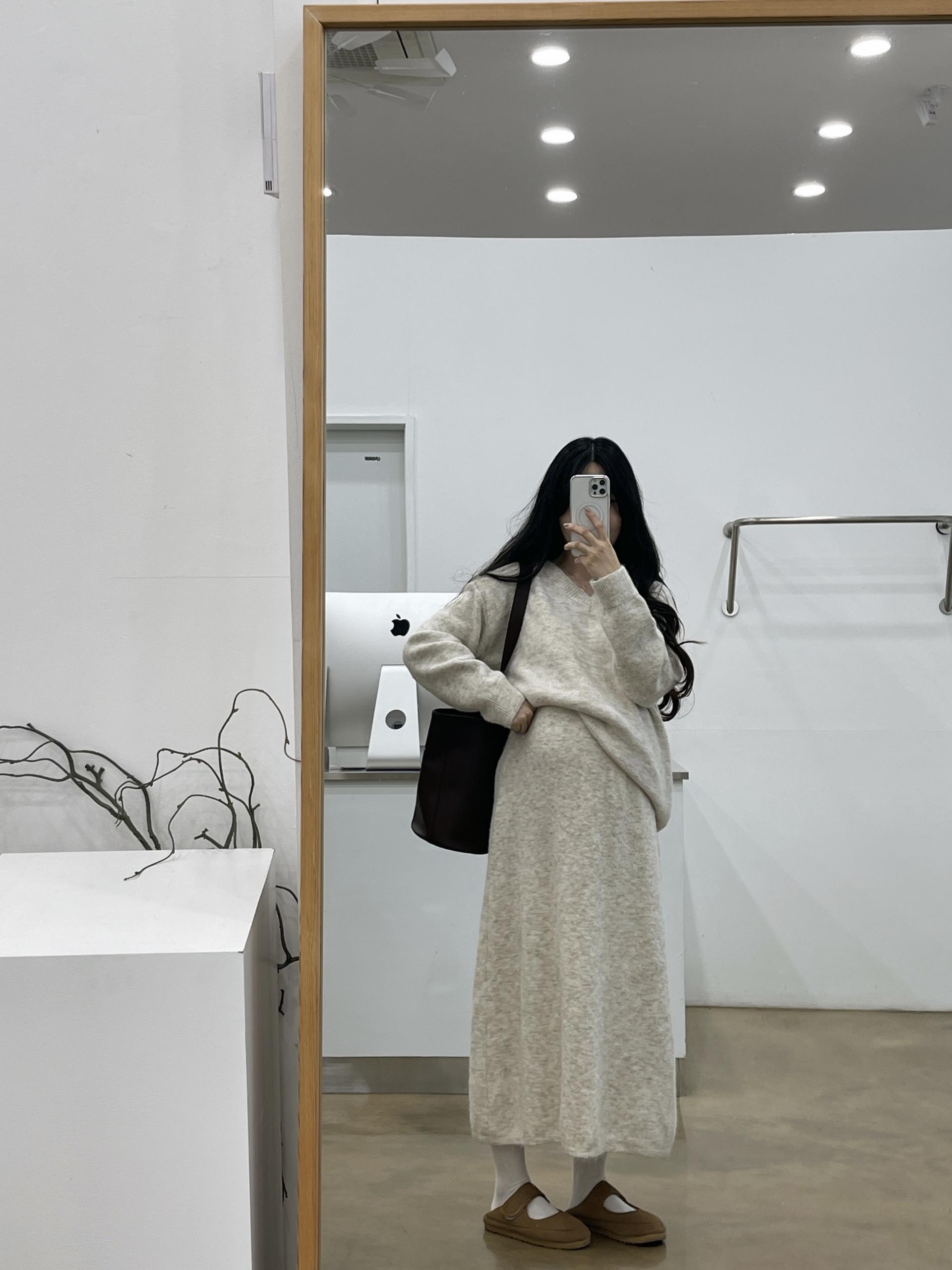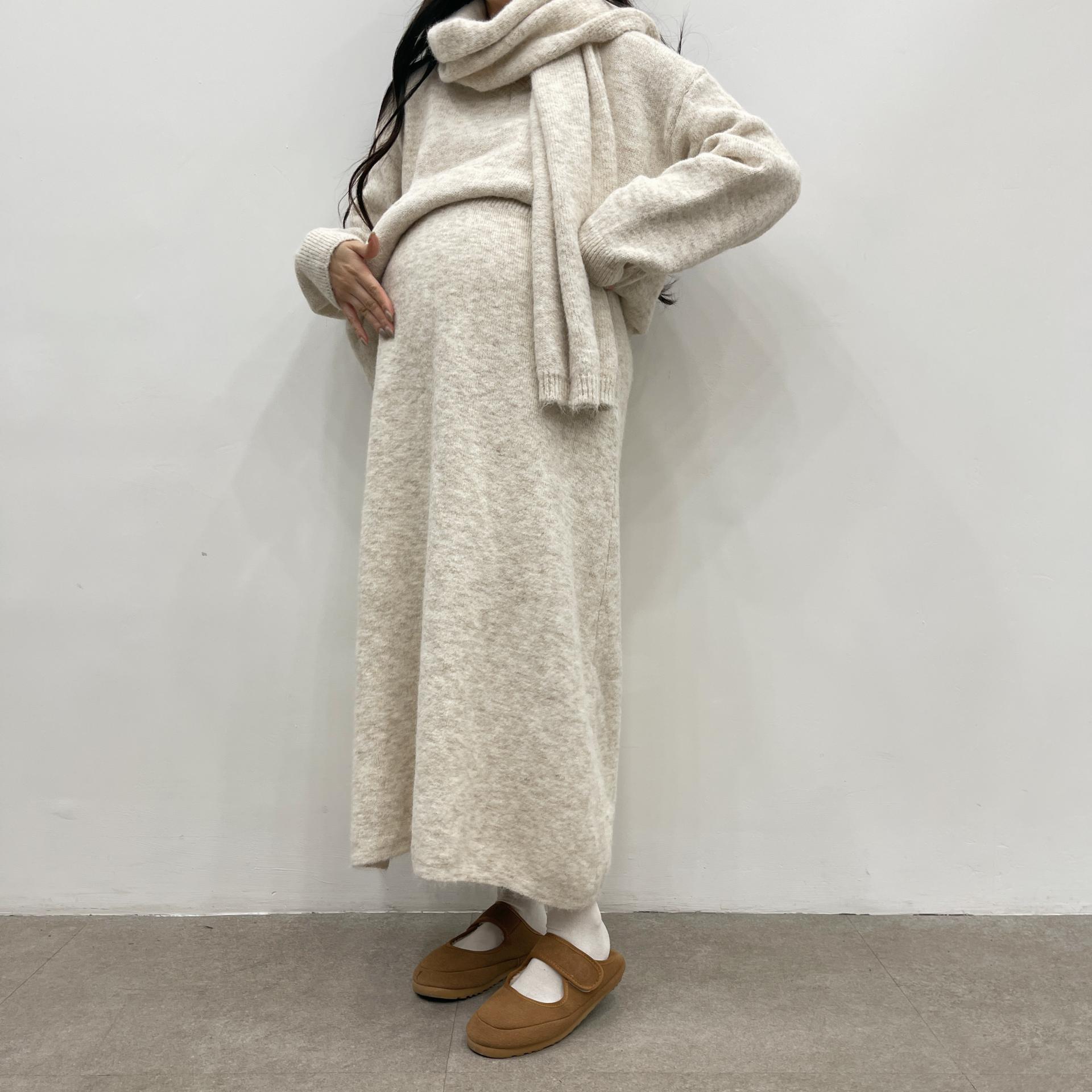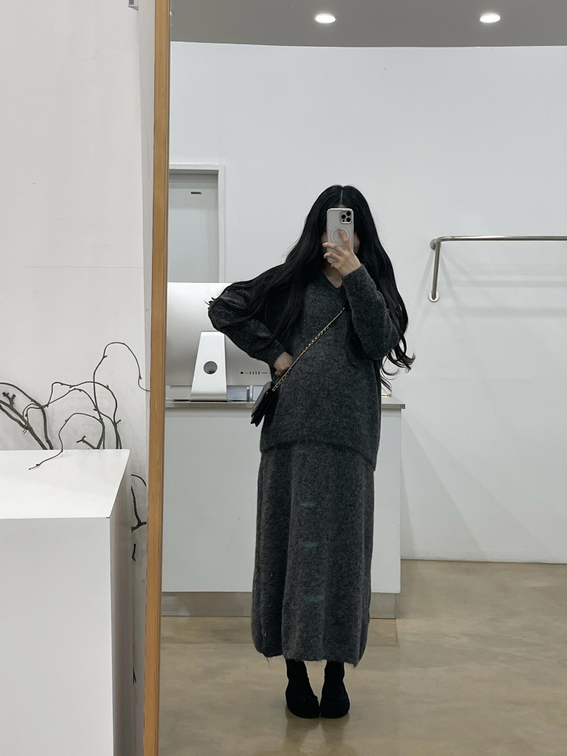 힙.배덮기장의 V넥니트와 스커트 그리고 머플러가 세트입니다