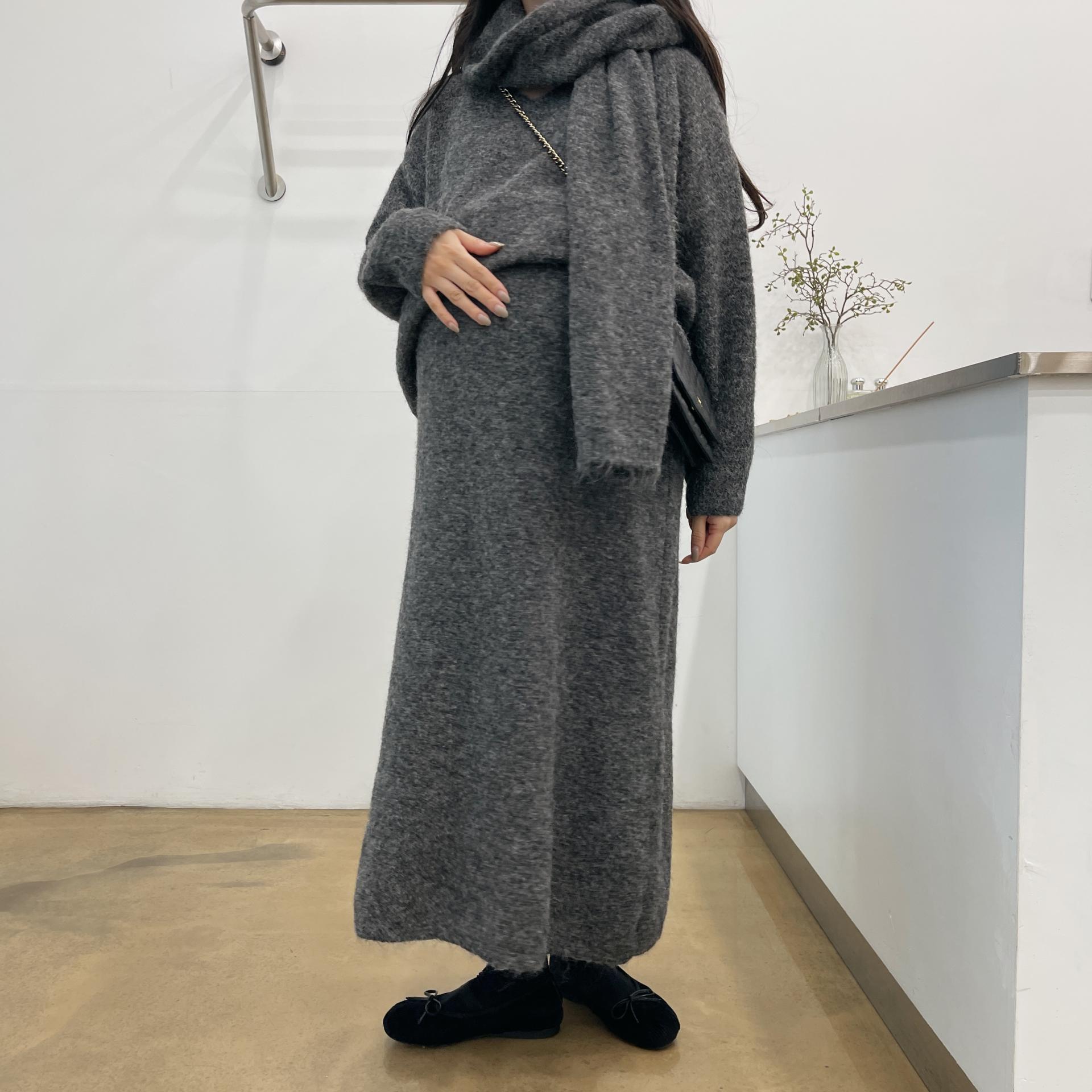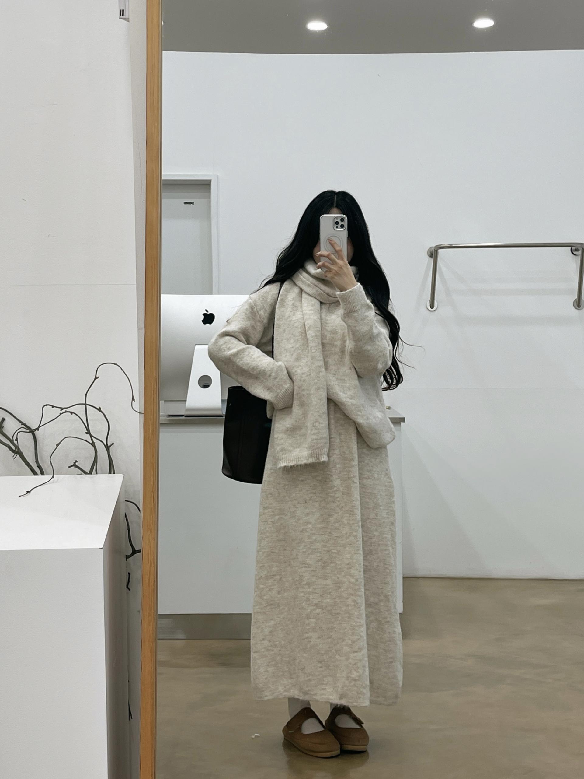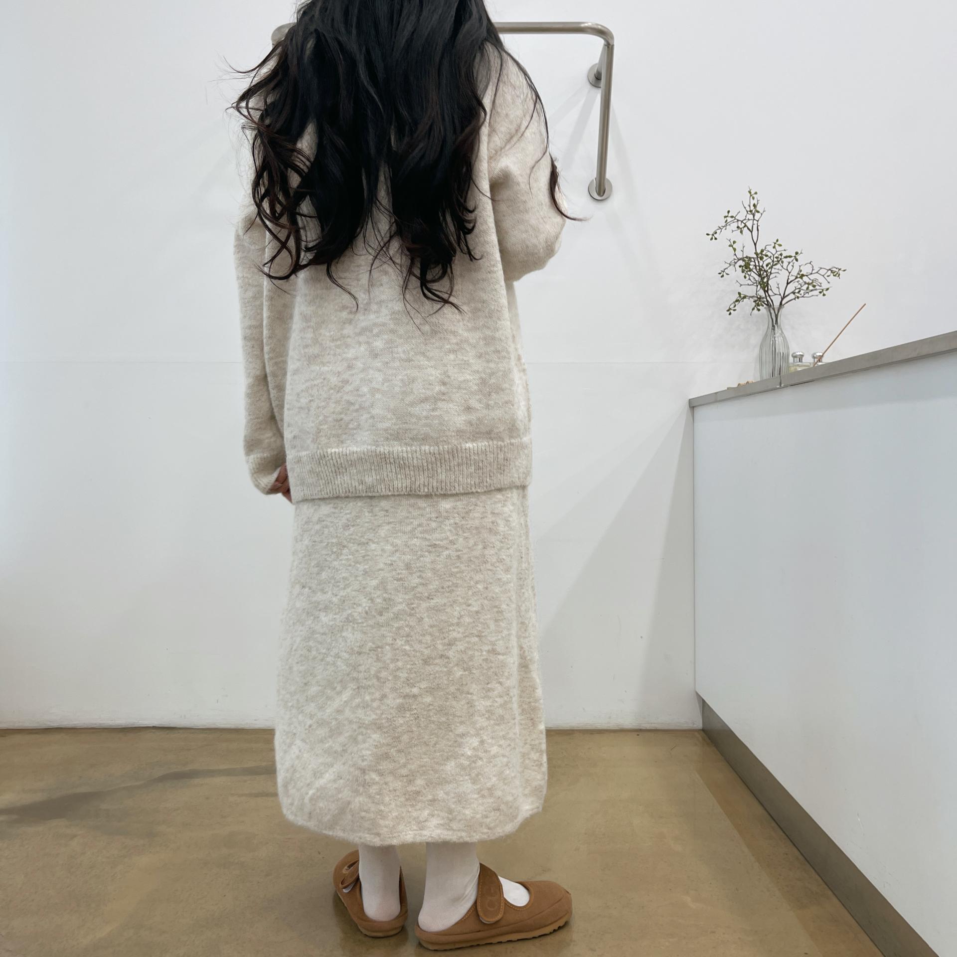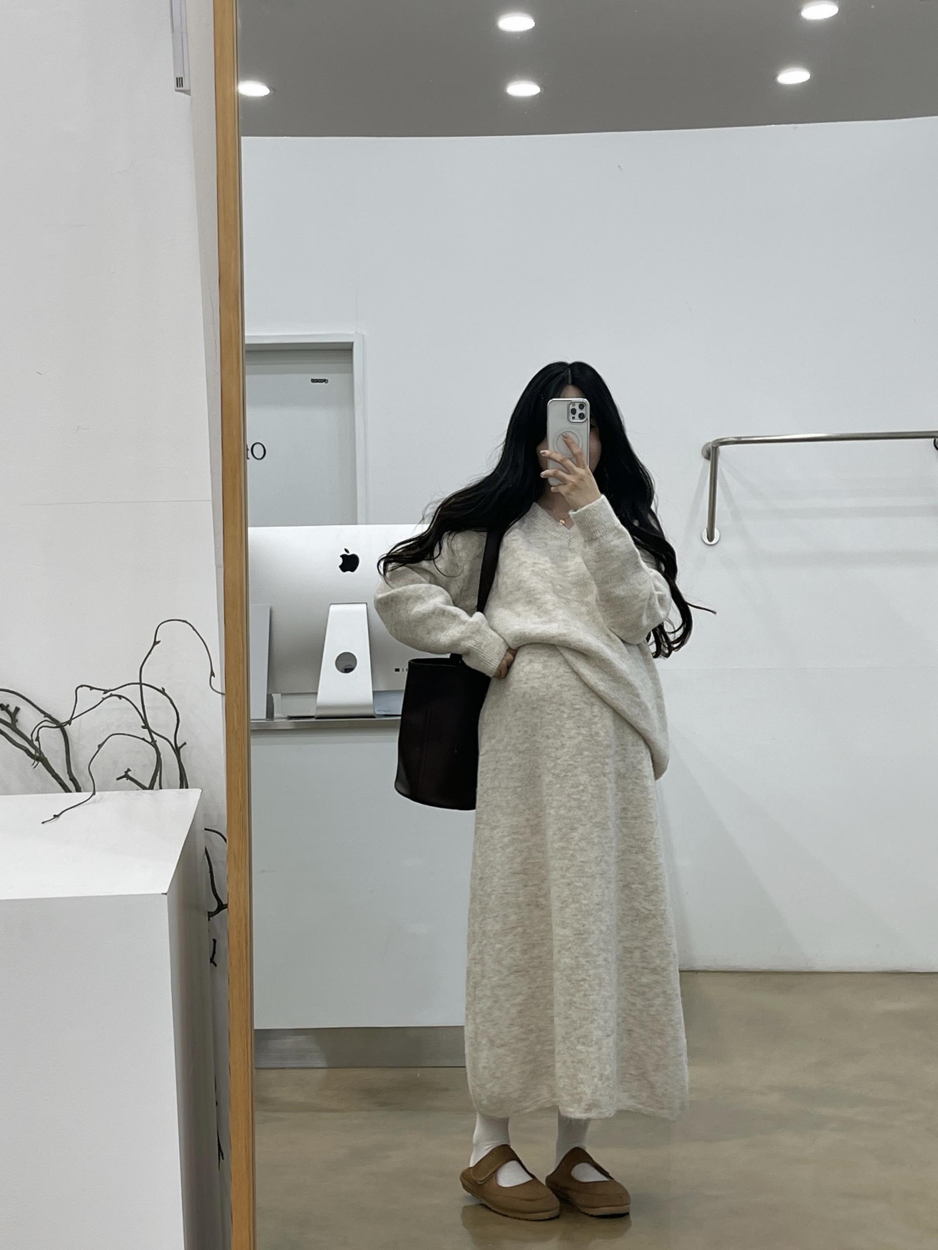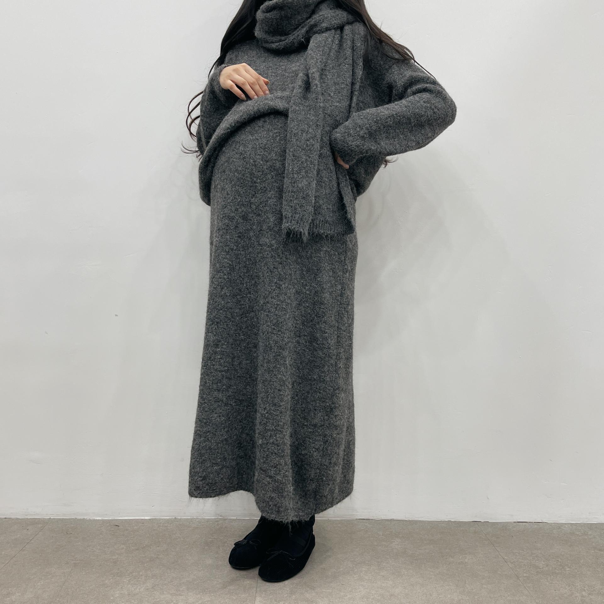 힙.배덮기장의 V넥니트와 스커트 그리고 머플러가 세트입니다