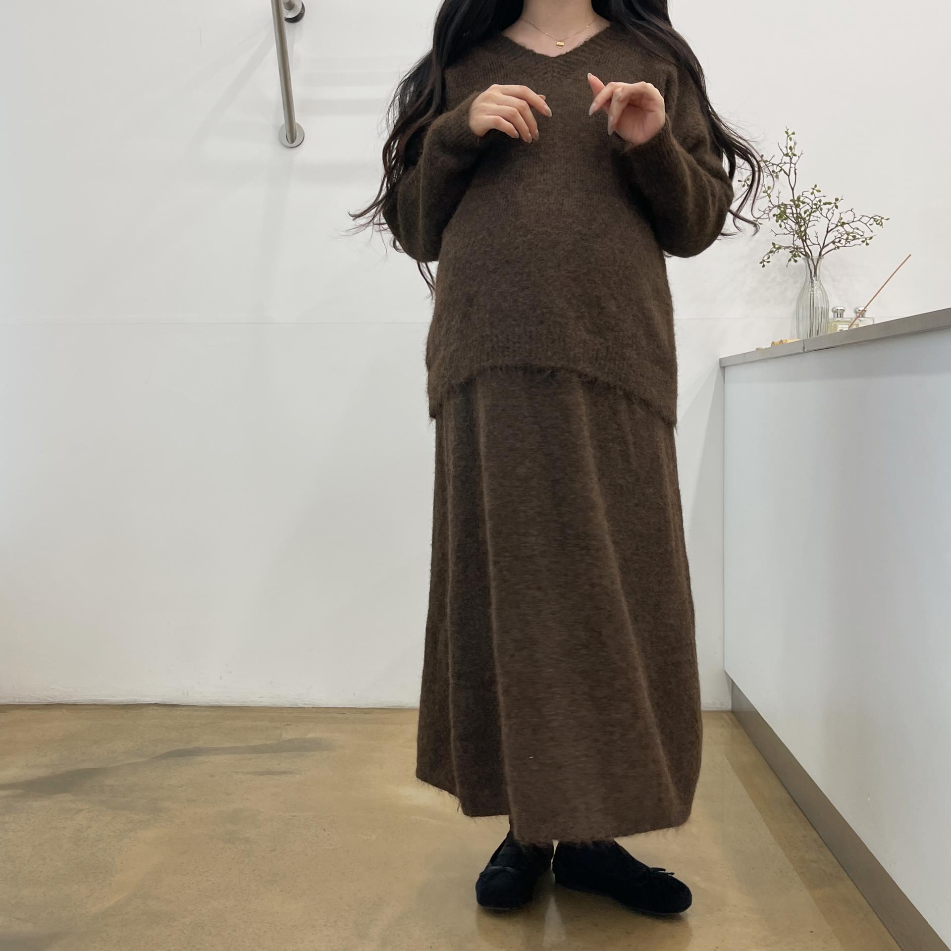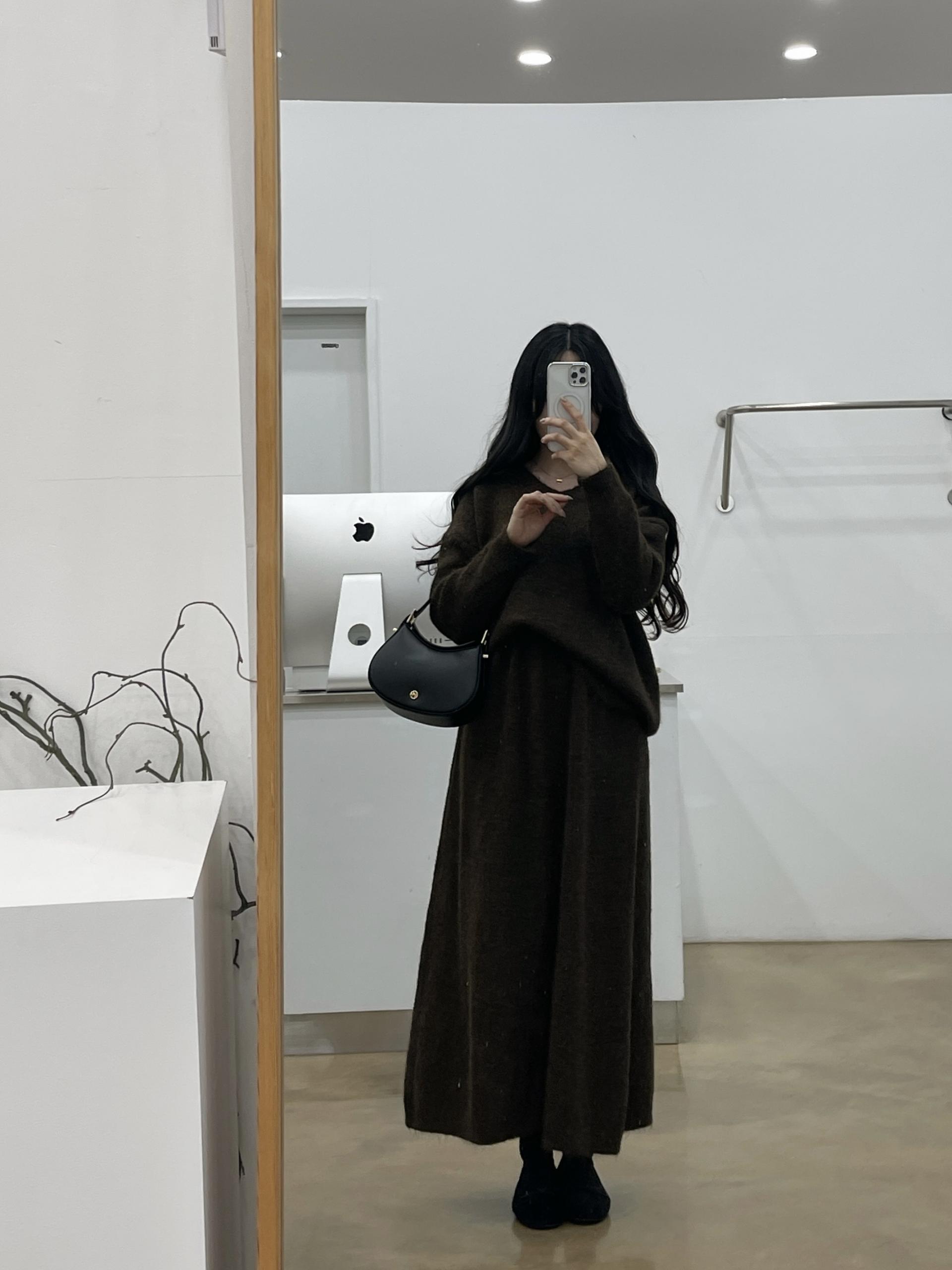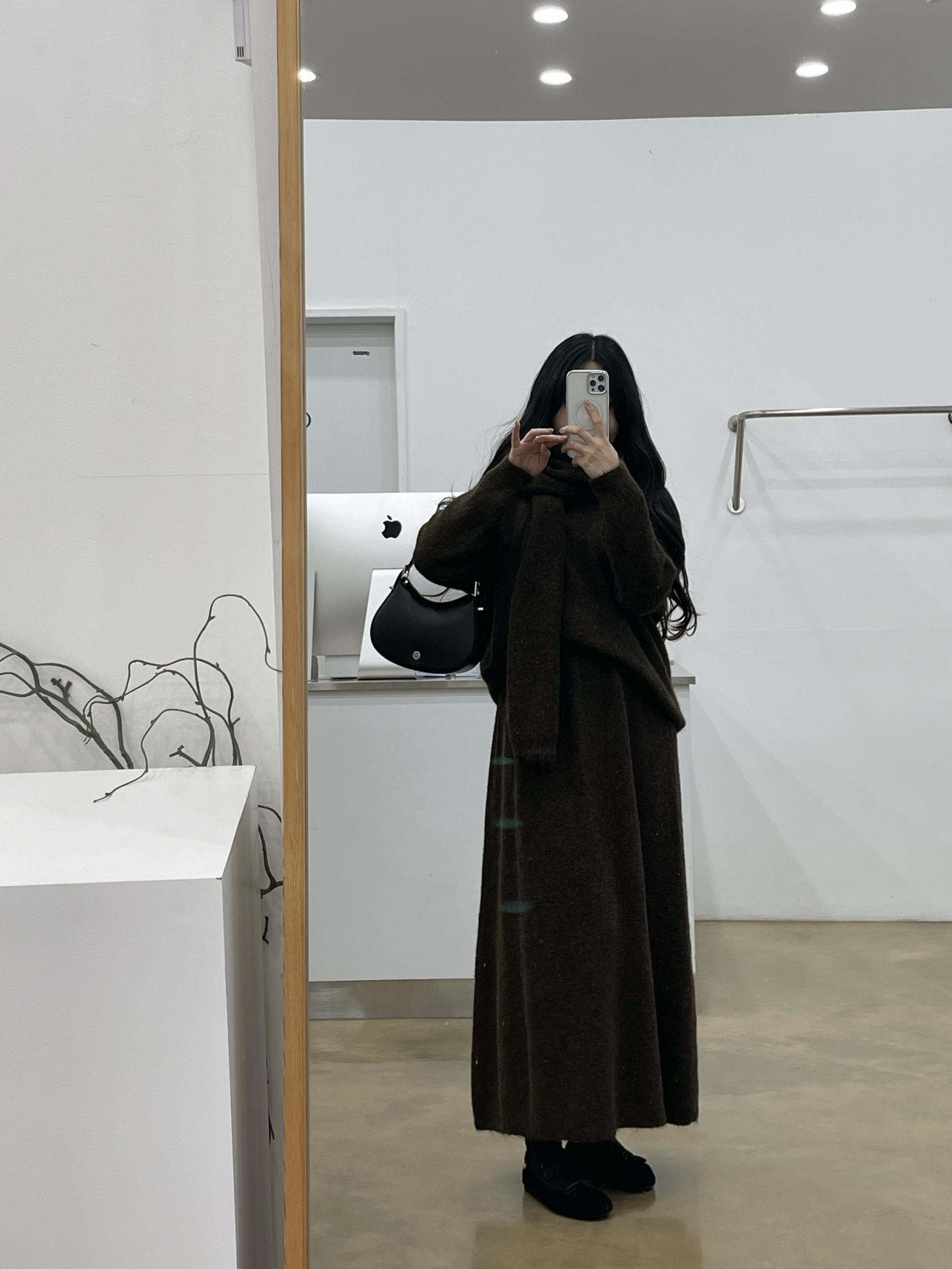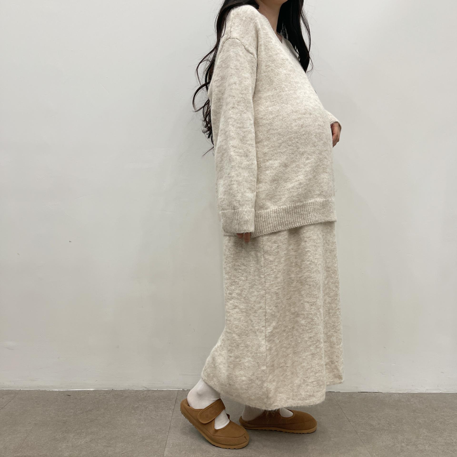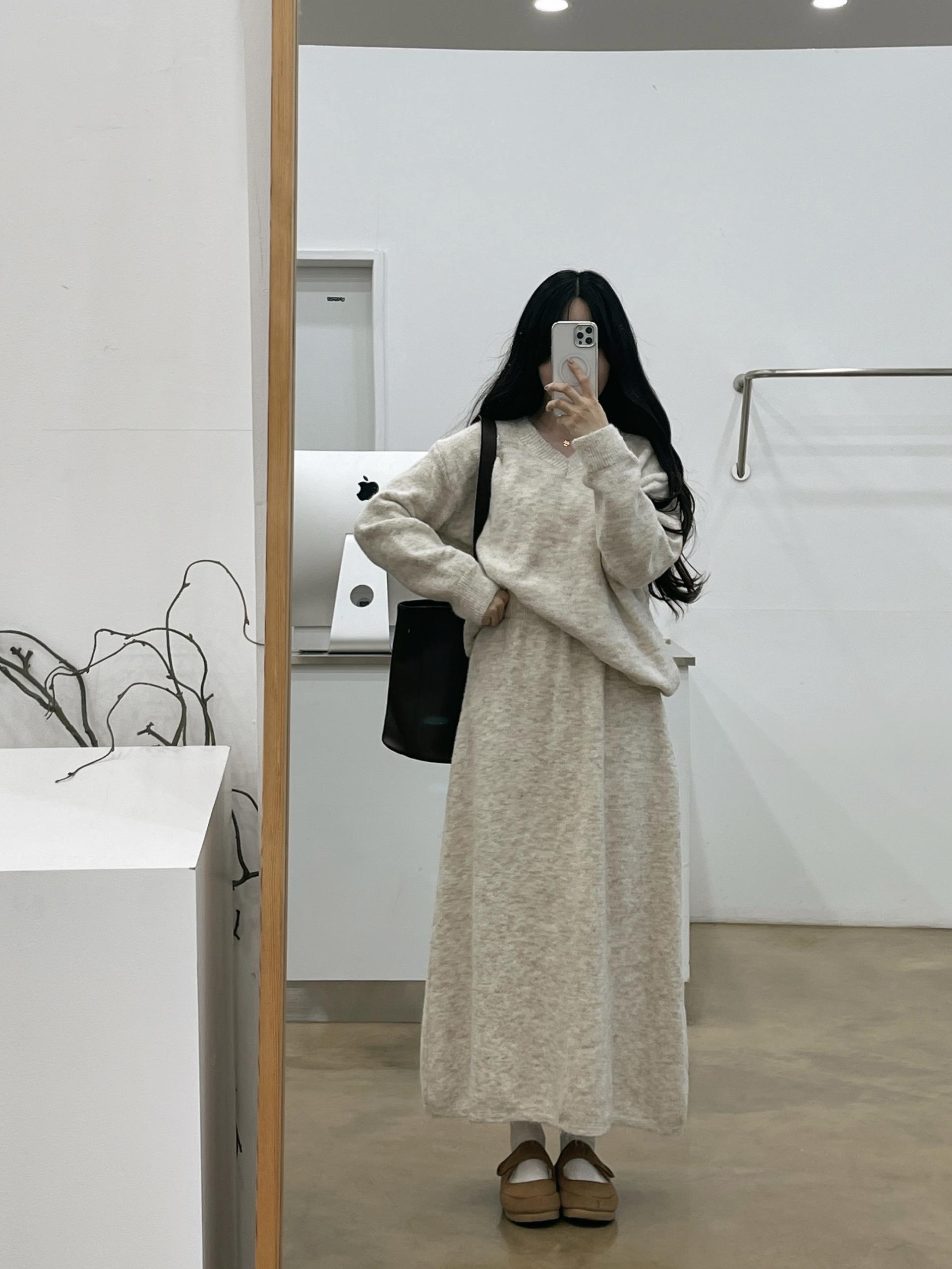 힙.배덮기장의 V넥니트와 스커트 그리고 머플러가 세트입니다