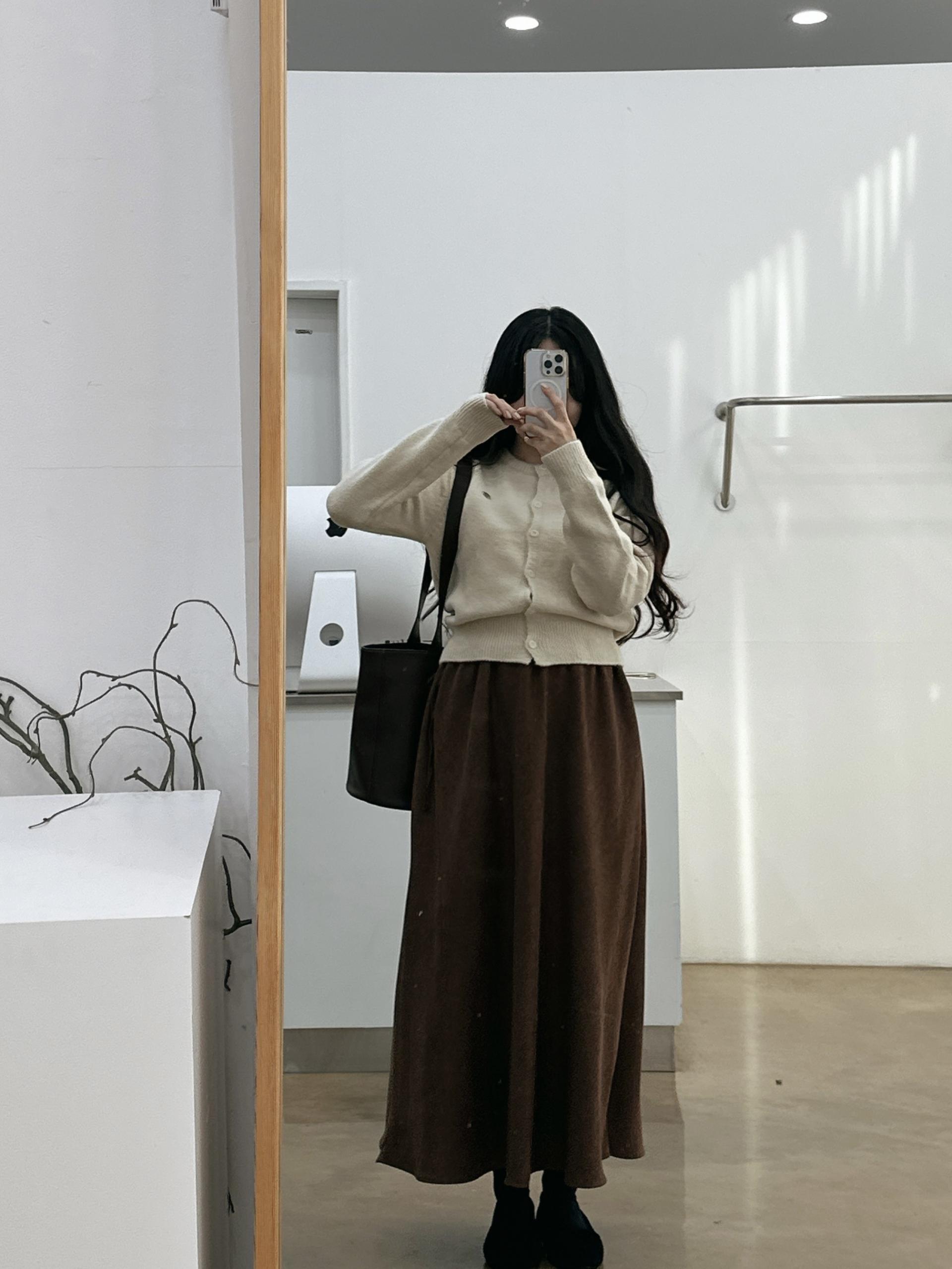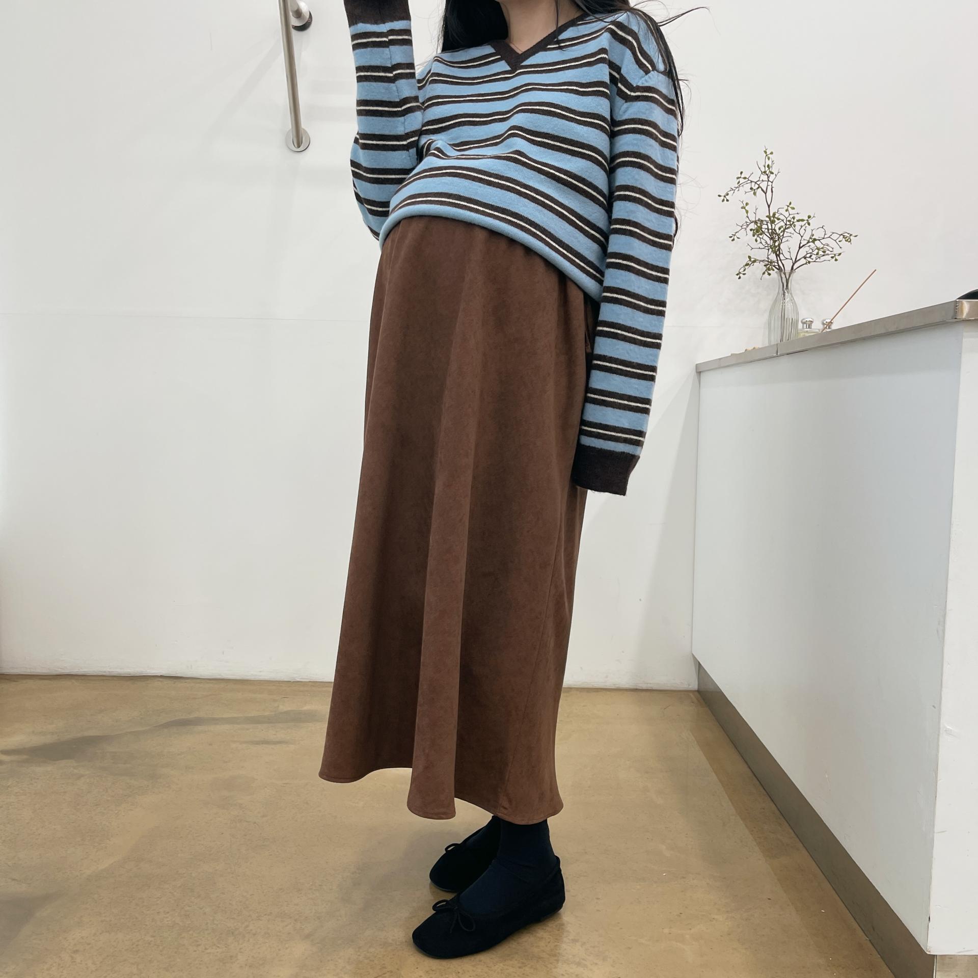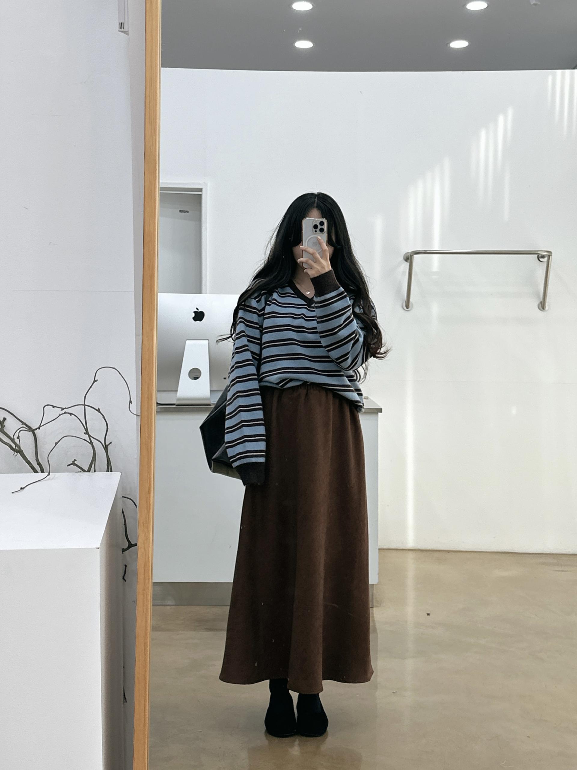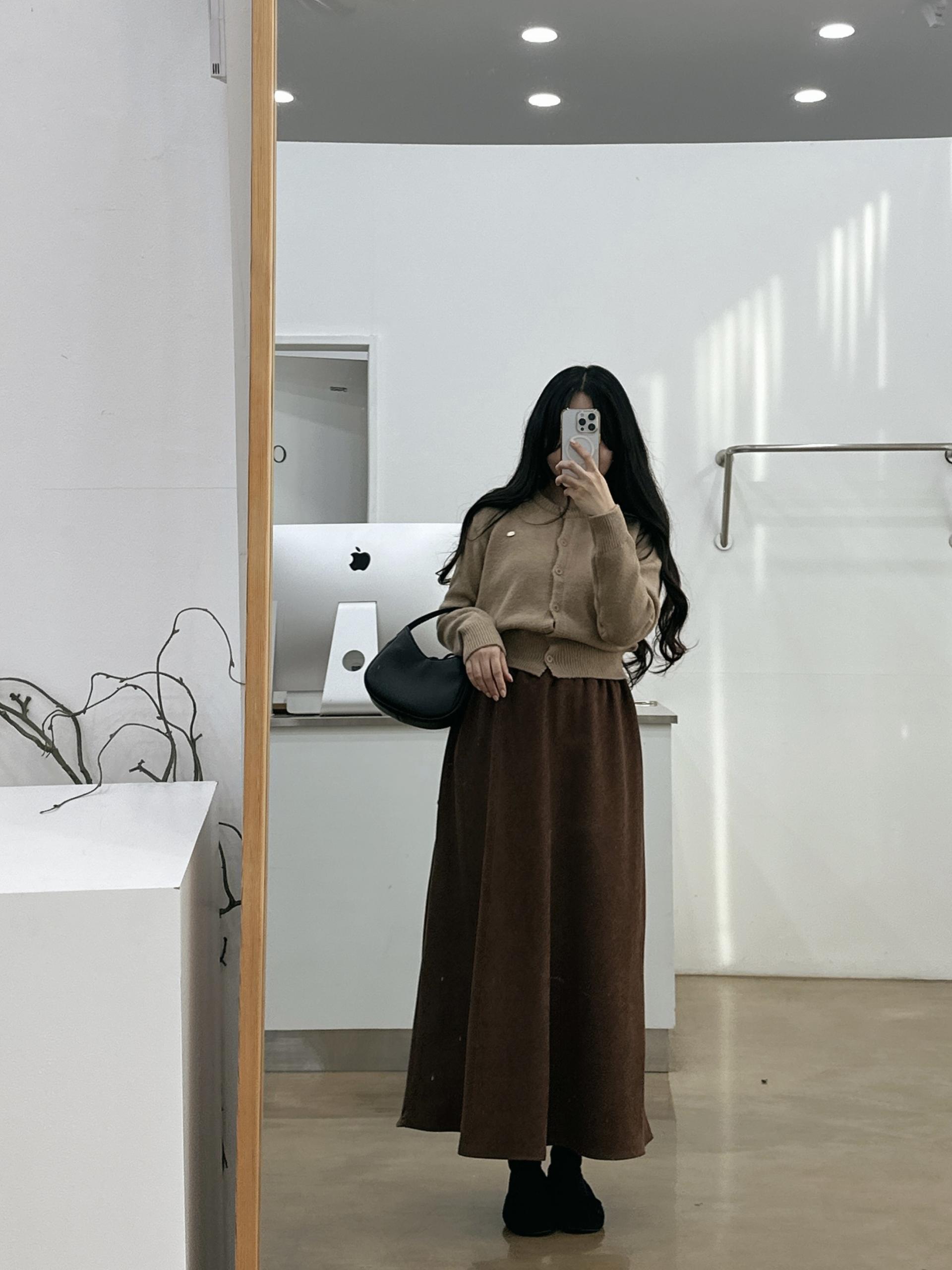 겨울버전으로 소개해드리는 , 허리스트링으로 사이즈구애없이 입는, 스웨이드소재의 스커트에요