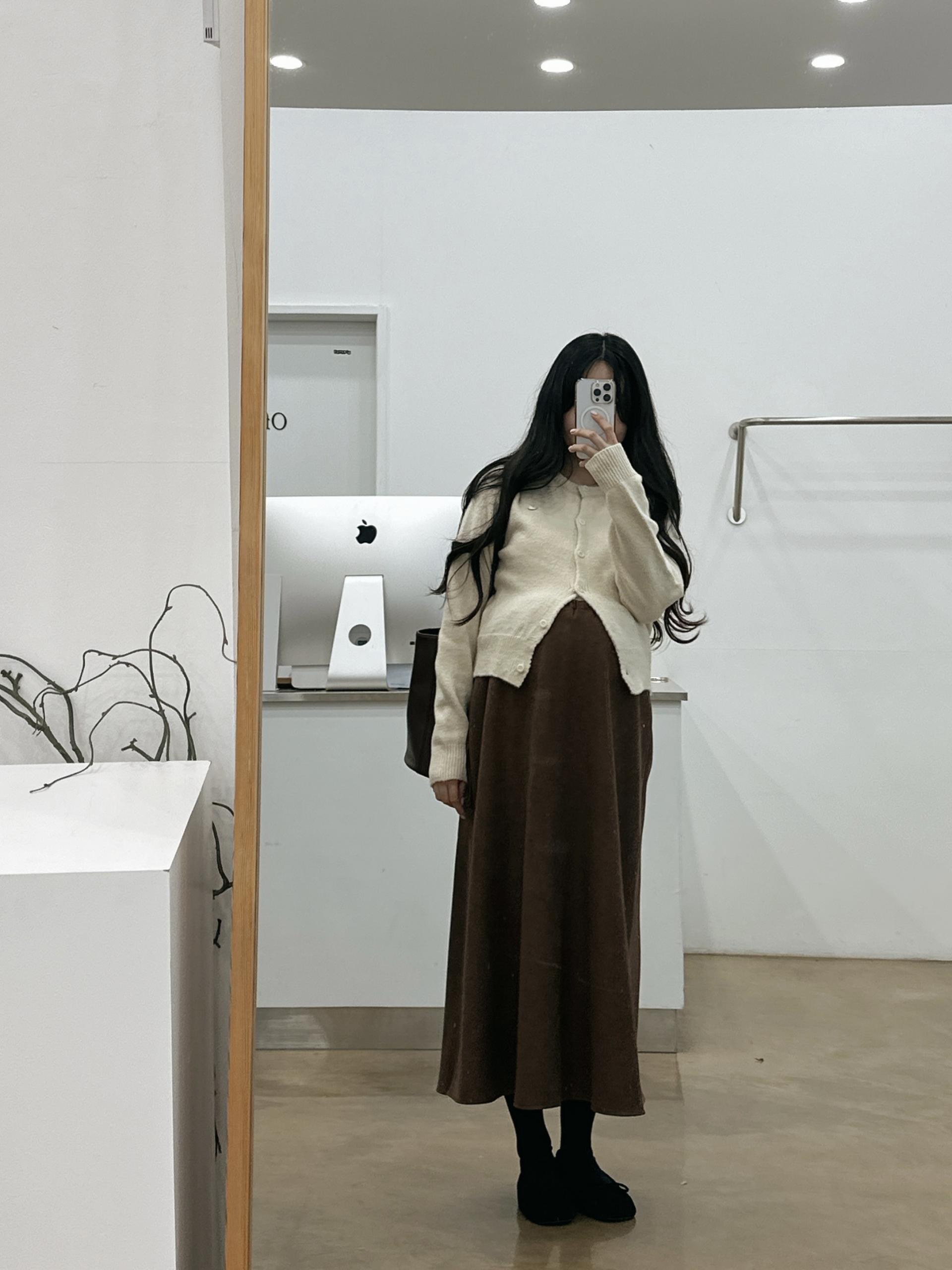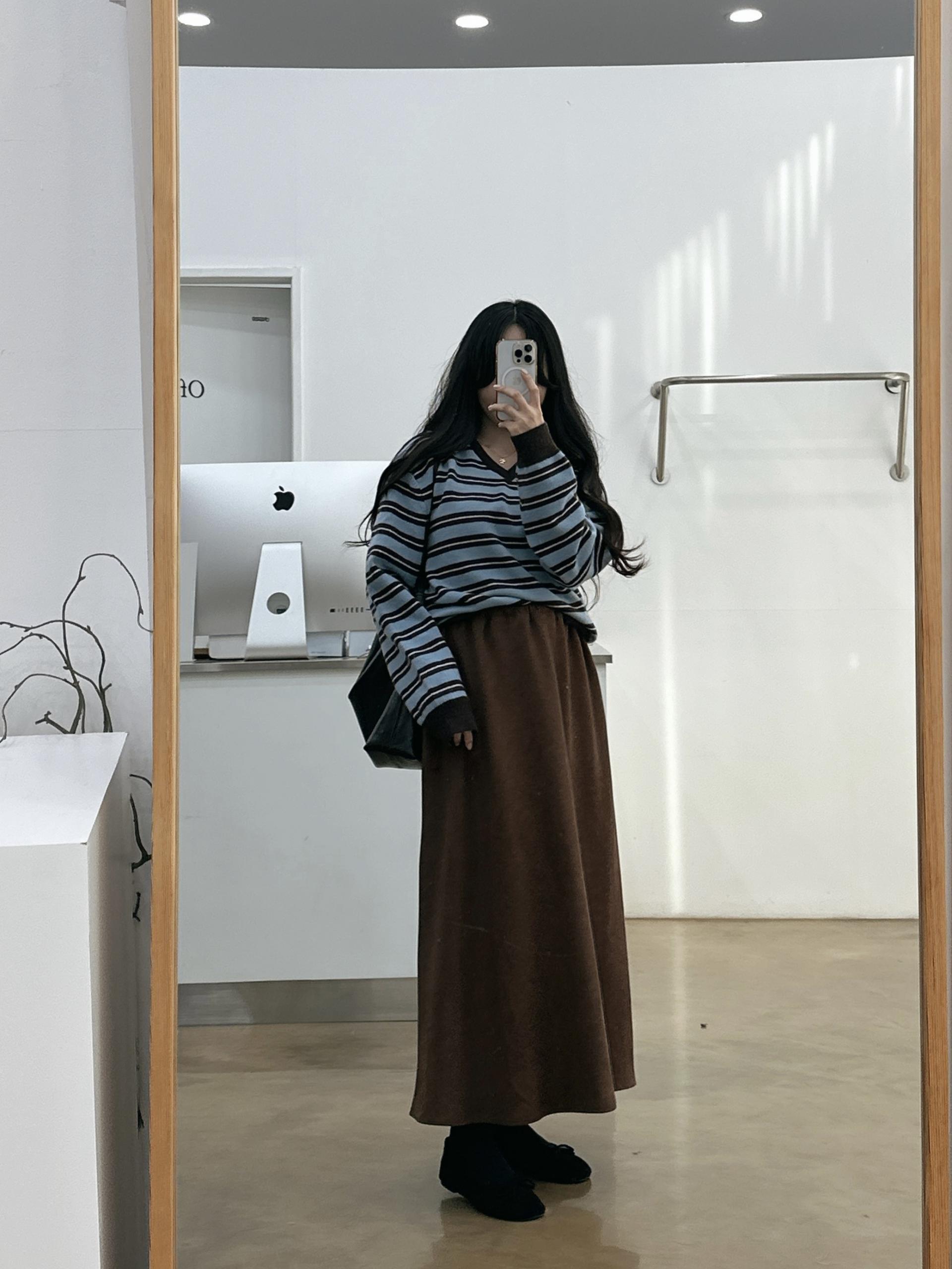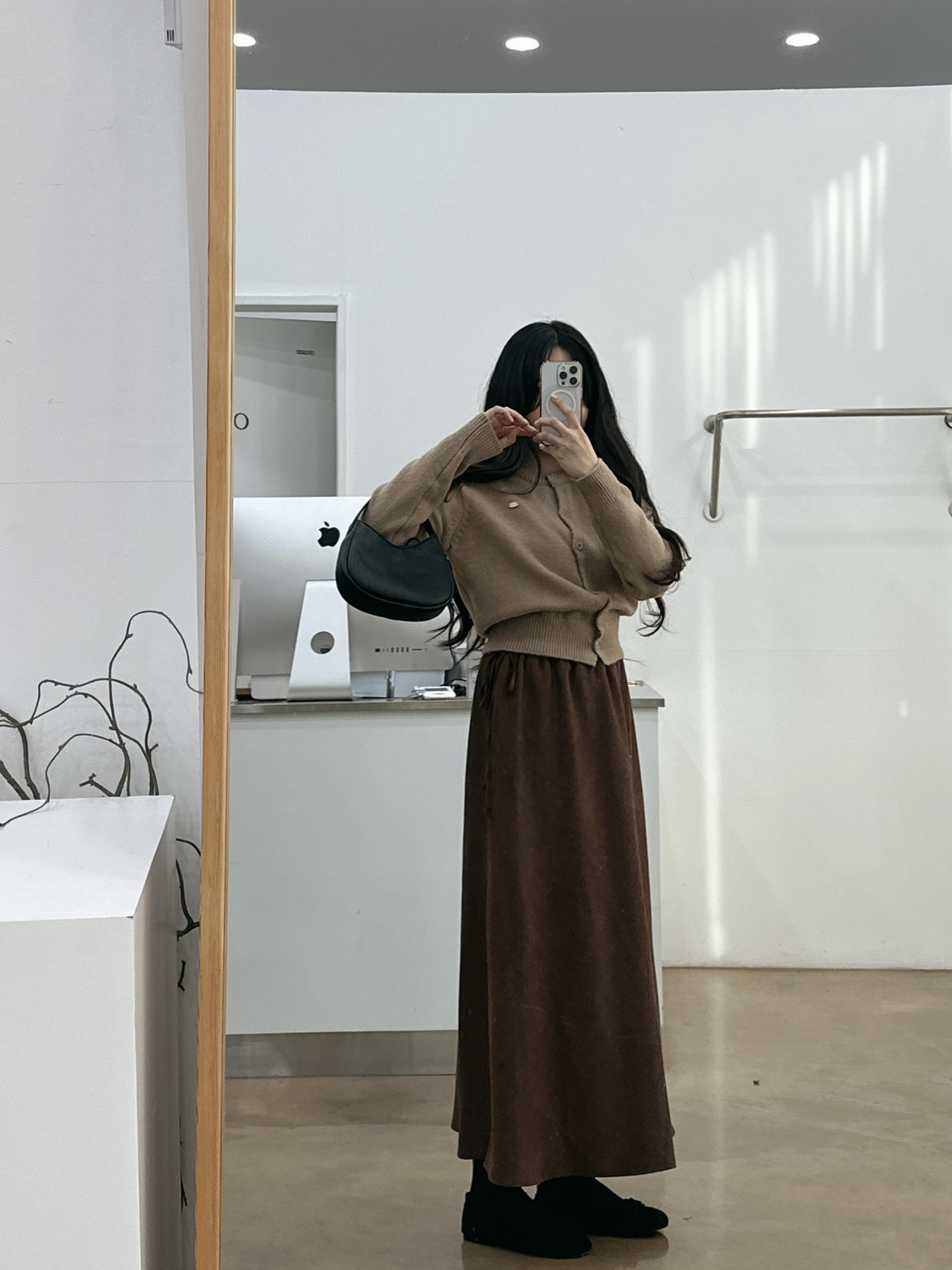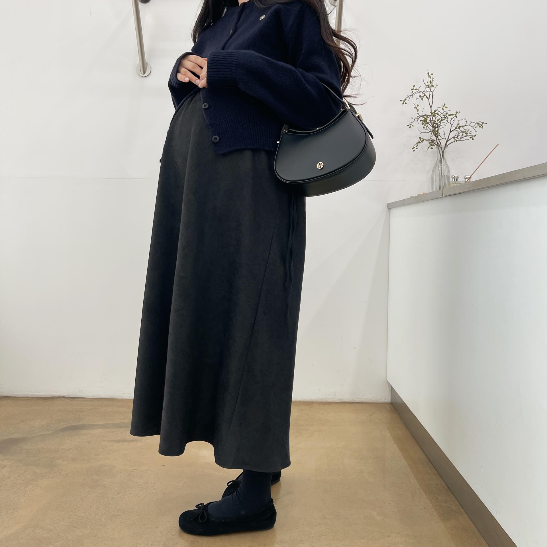 겨울버전으로 소개해드리는 , 허리스트링으로 사이즈구애없이 입는, 스웨이드소재의 스커트에요