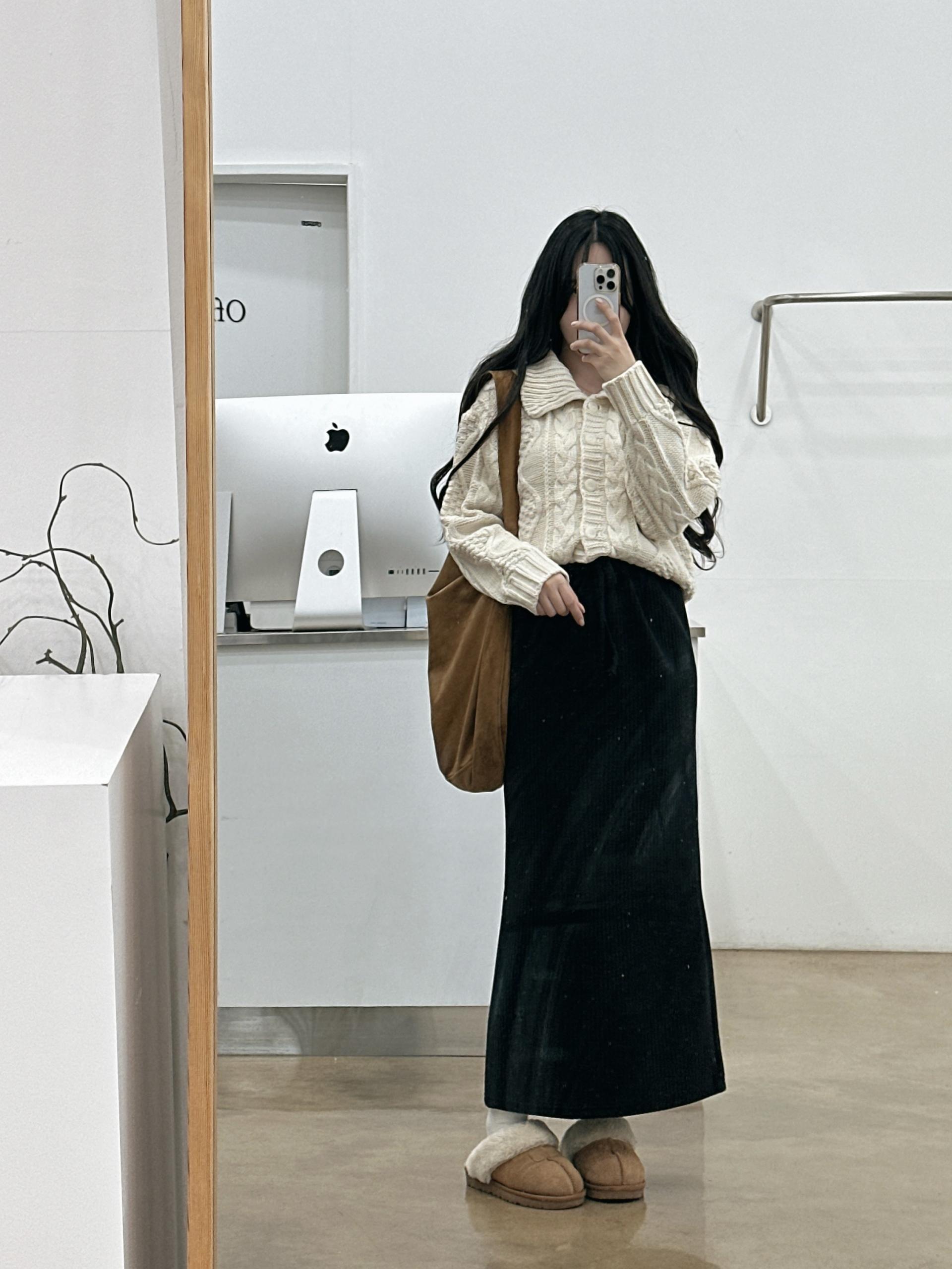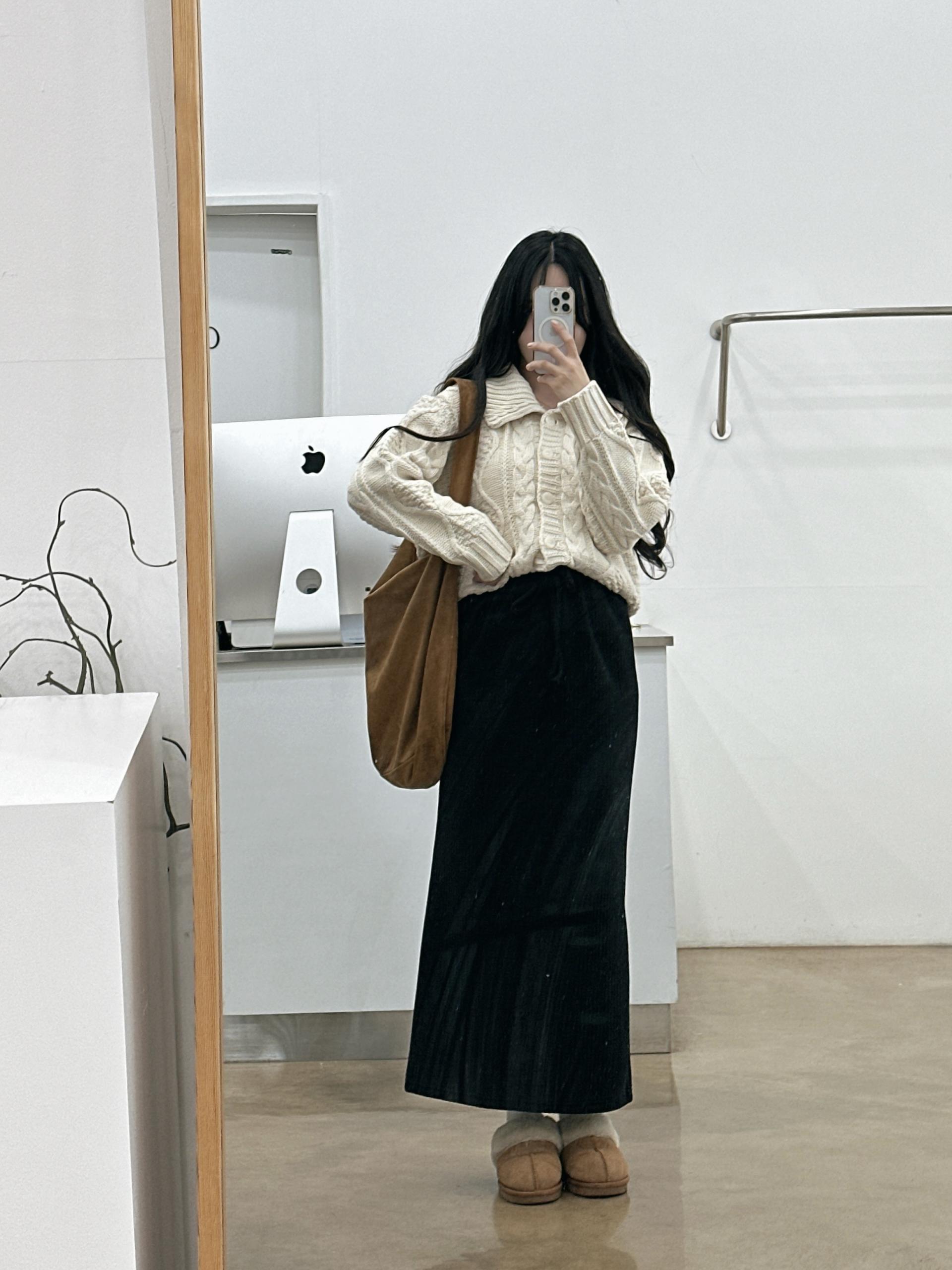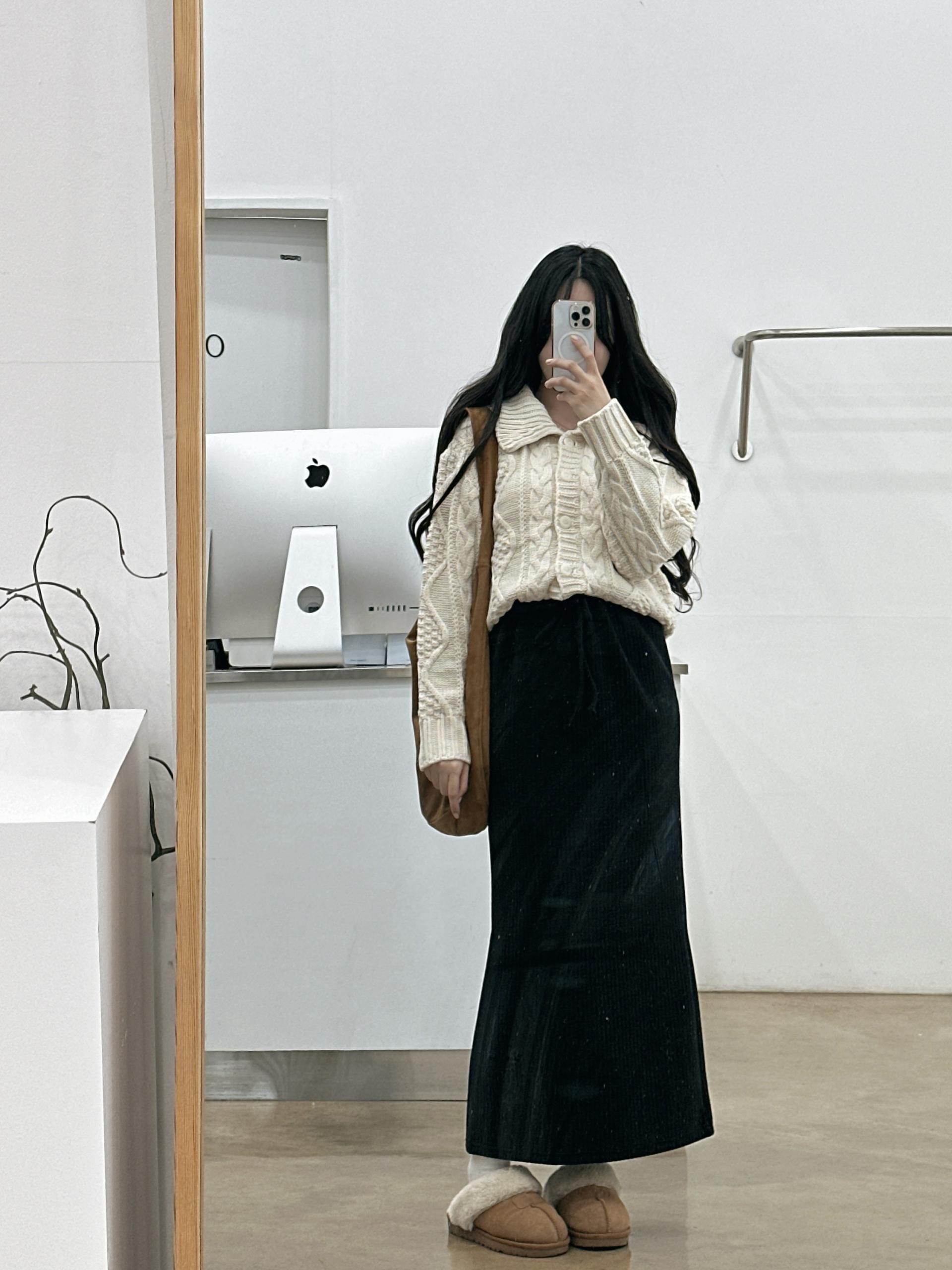 파우더리스커트(블랙)+카라꽈배기니트가디건(크림)