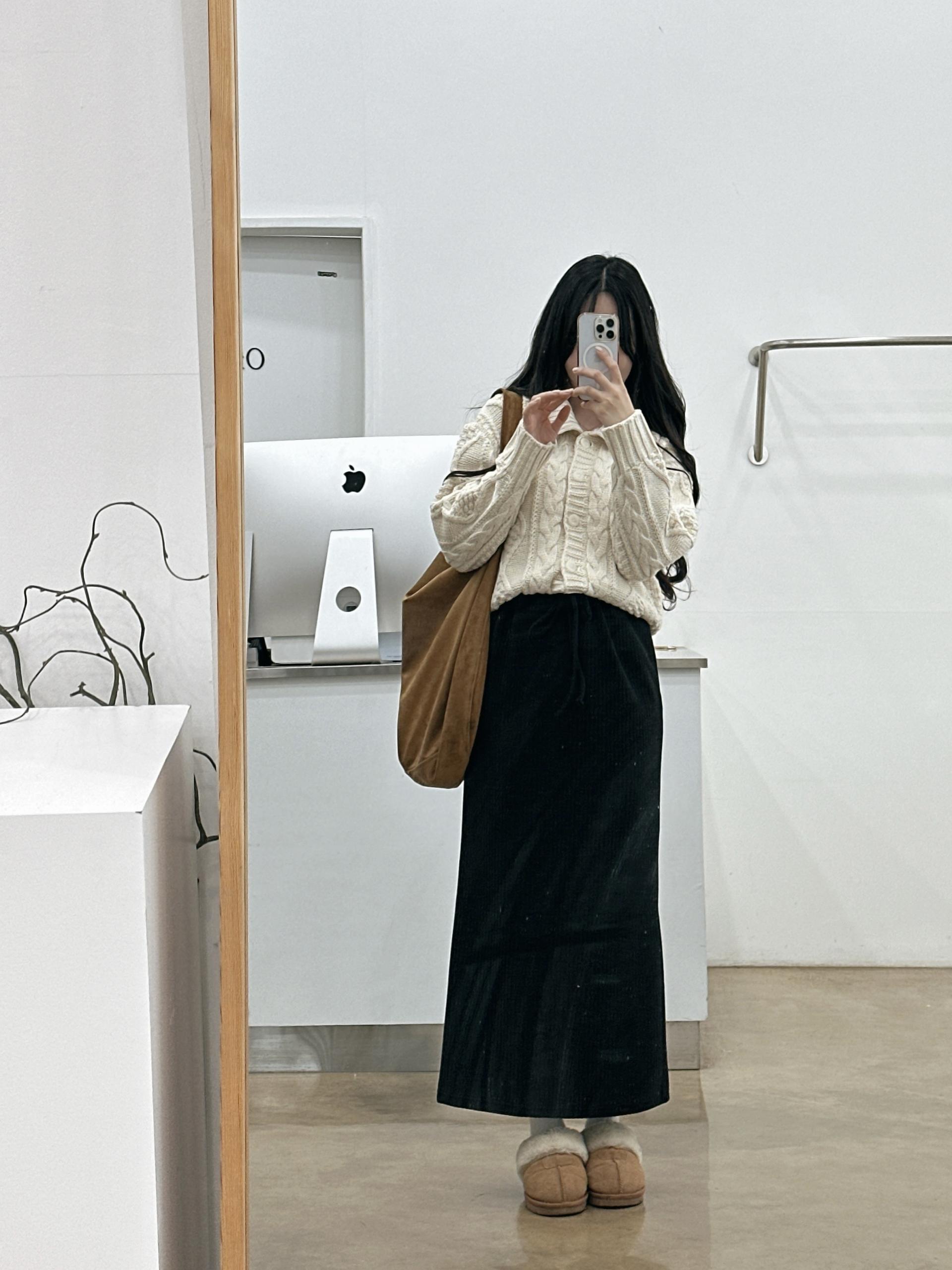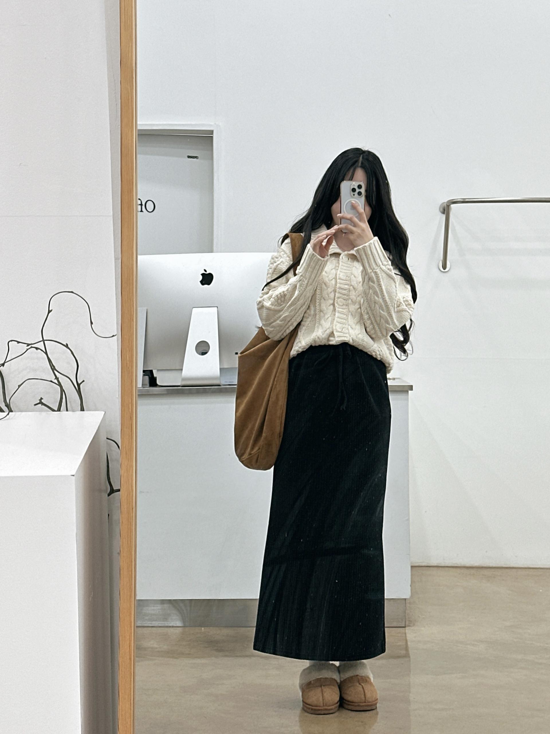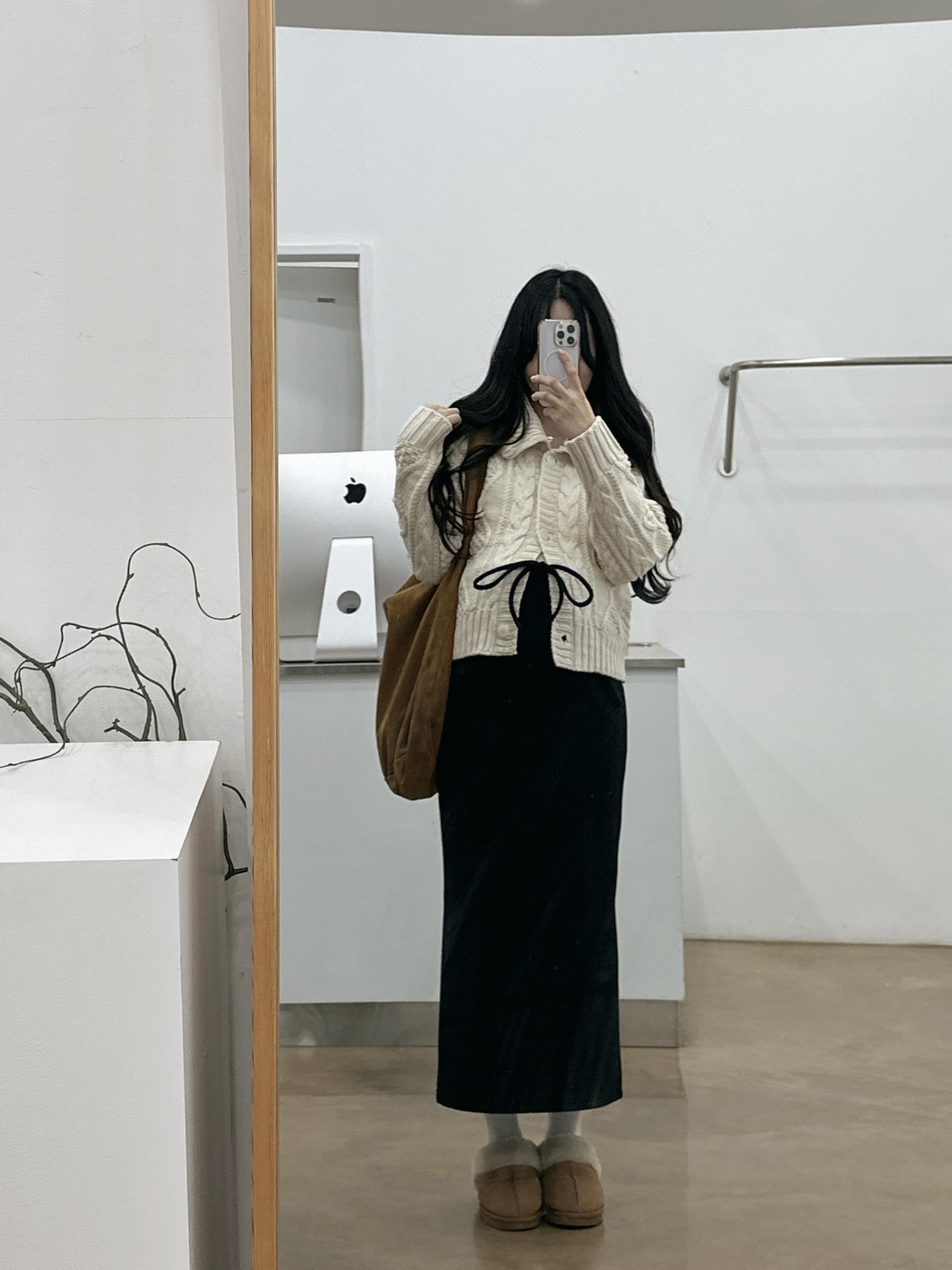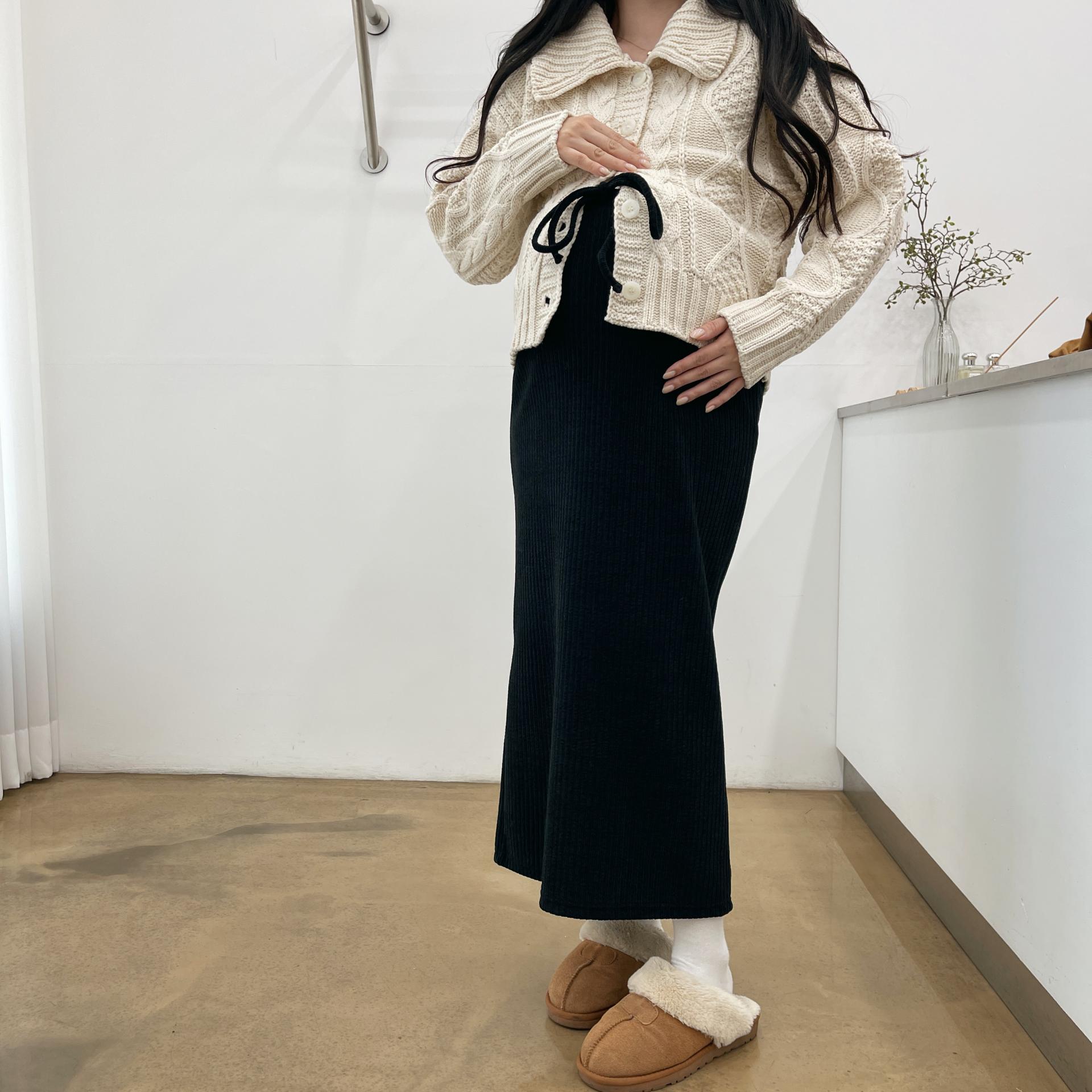 파우더리스커트(블랙)+카라꽈배기니트가디건(크림)