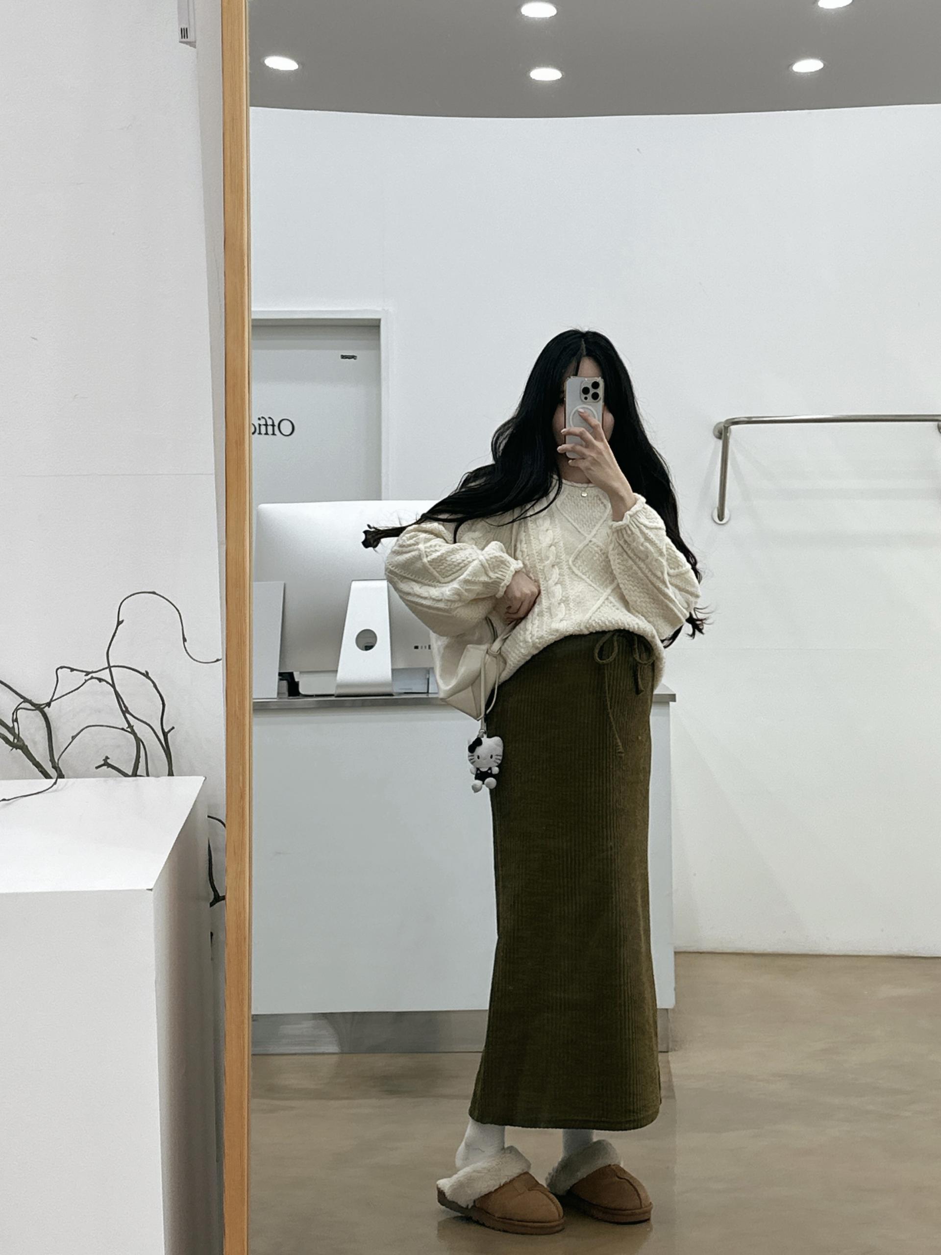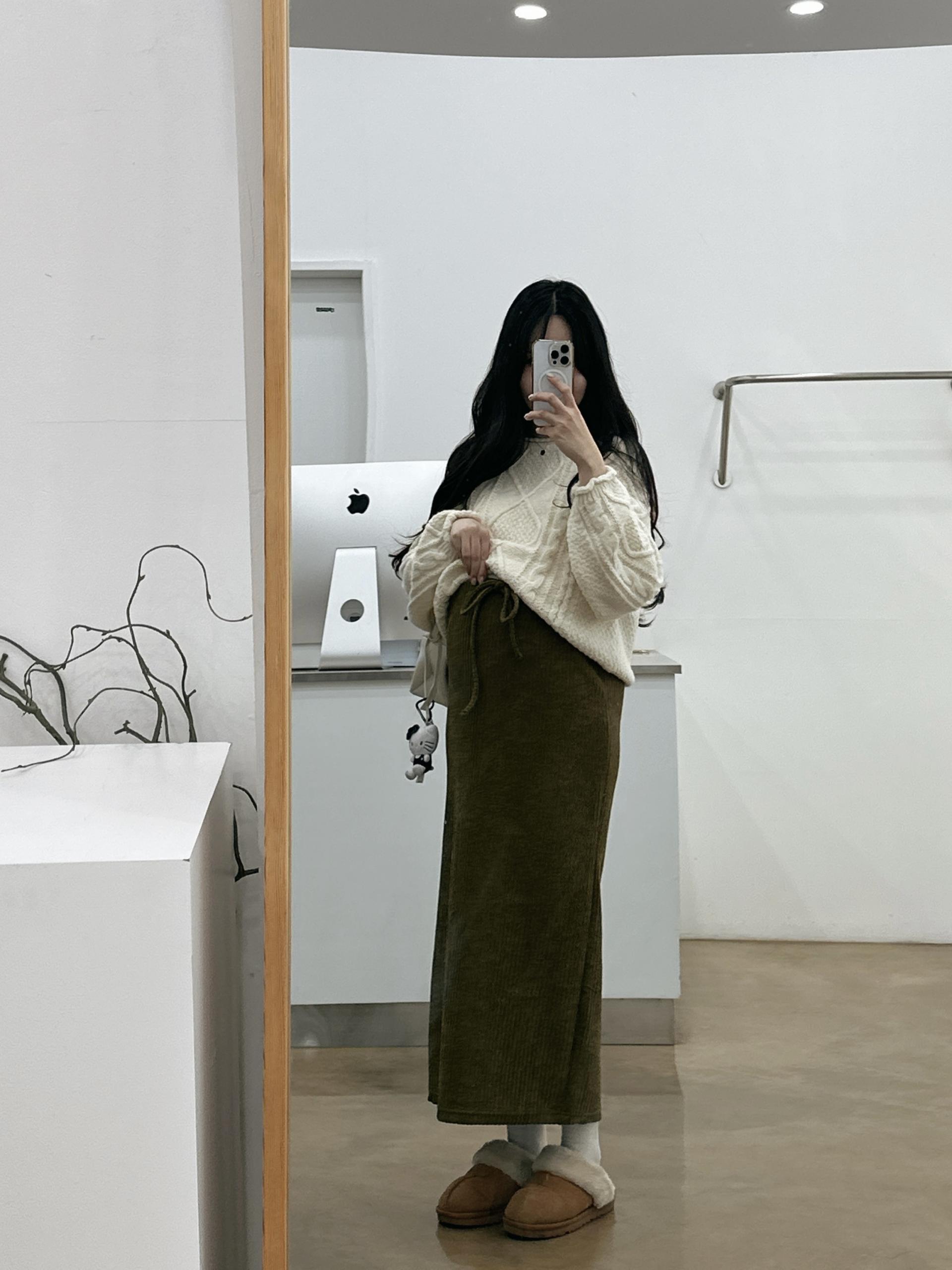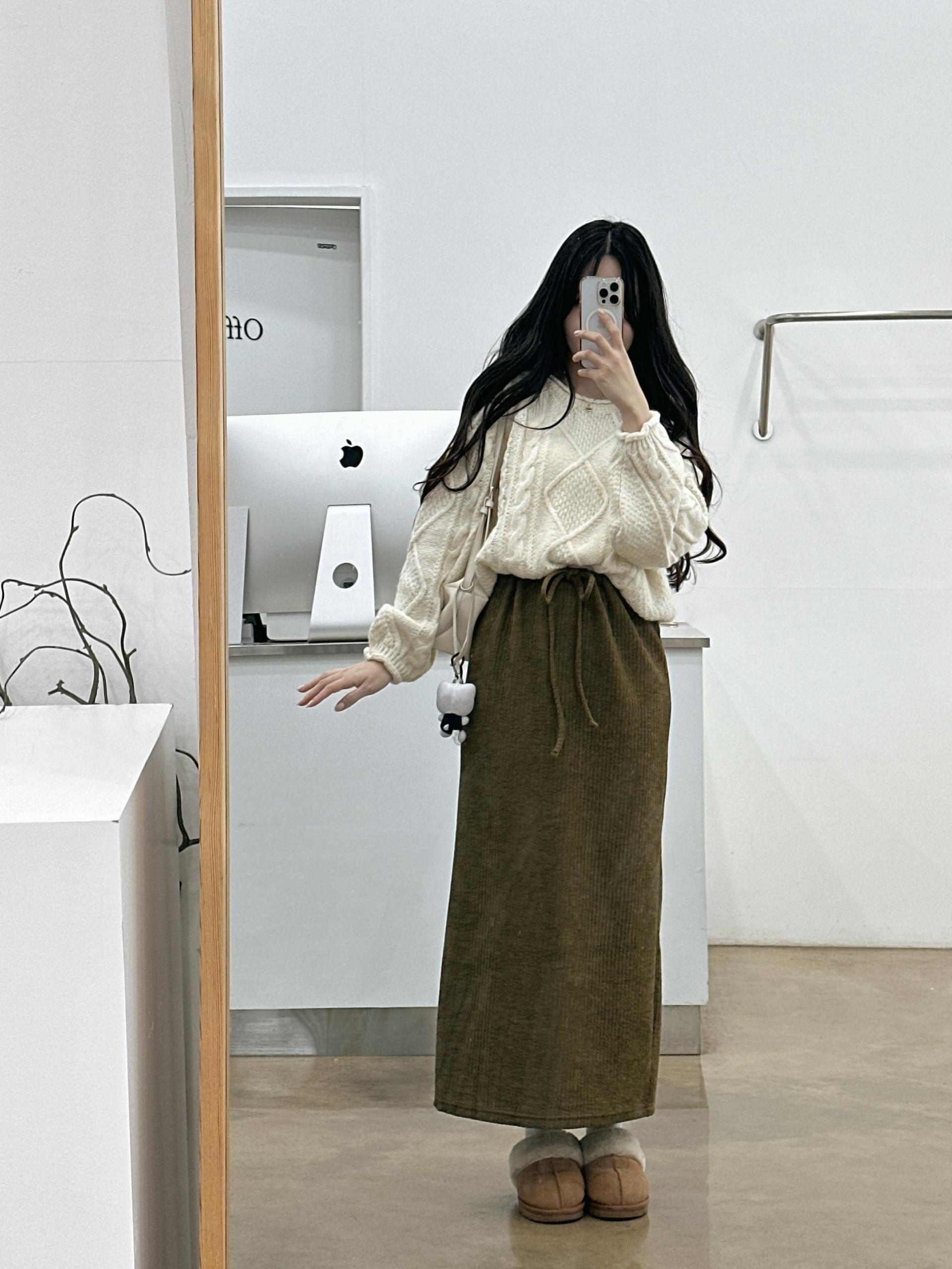 파우더리스커트(올리브)+로빈블리니트(크림)